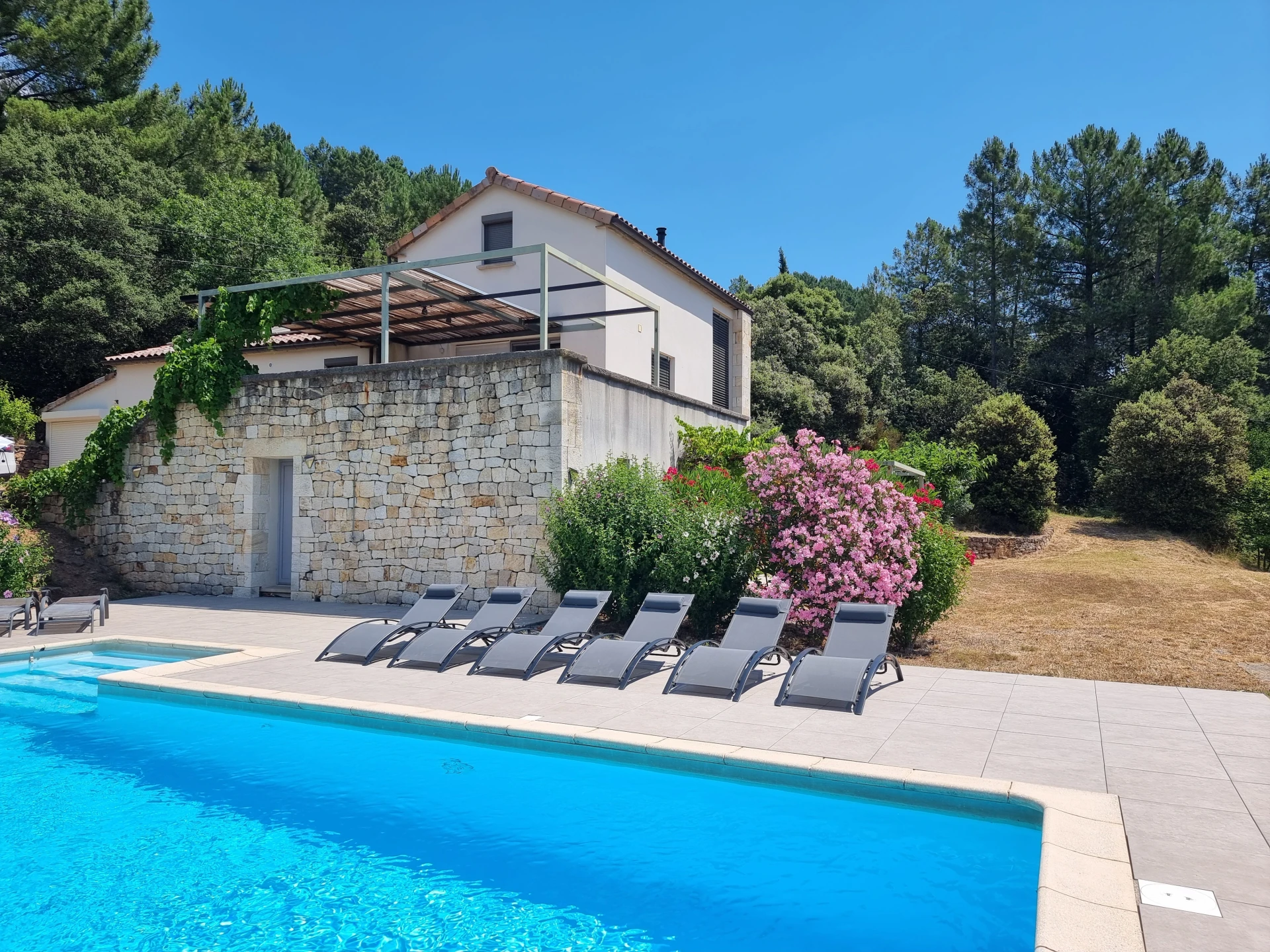 Der Außenbereich der Villa bietet ein ebenso großartiges Erlebnis: mit einem großen privaten Pool (11x4,5m, Tiefe 1,1 - 1,9m, geöffnet vom 15.06. bis 15.09.), einer Poolterrasse mit Sonnenschutz, einer Außendusche, einem Bouleplatz und allen notwendigen Gartenmöbeln!