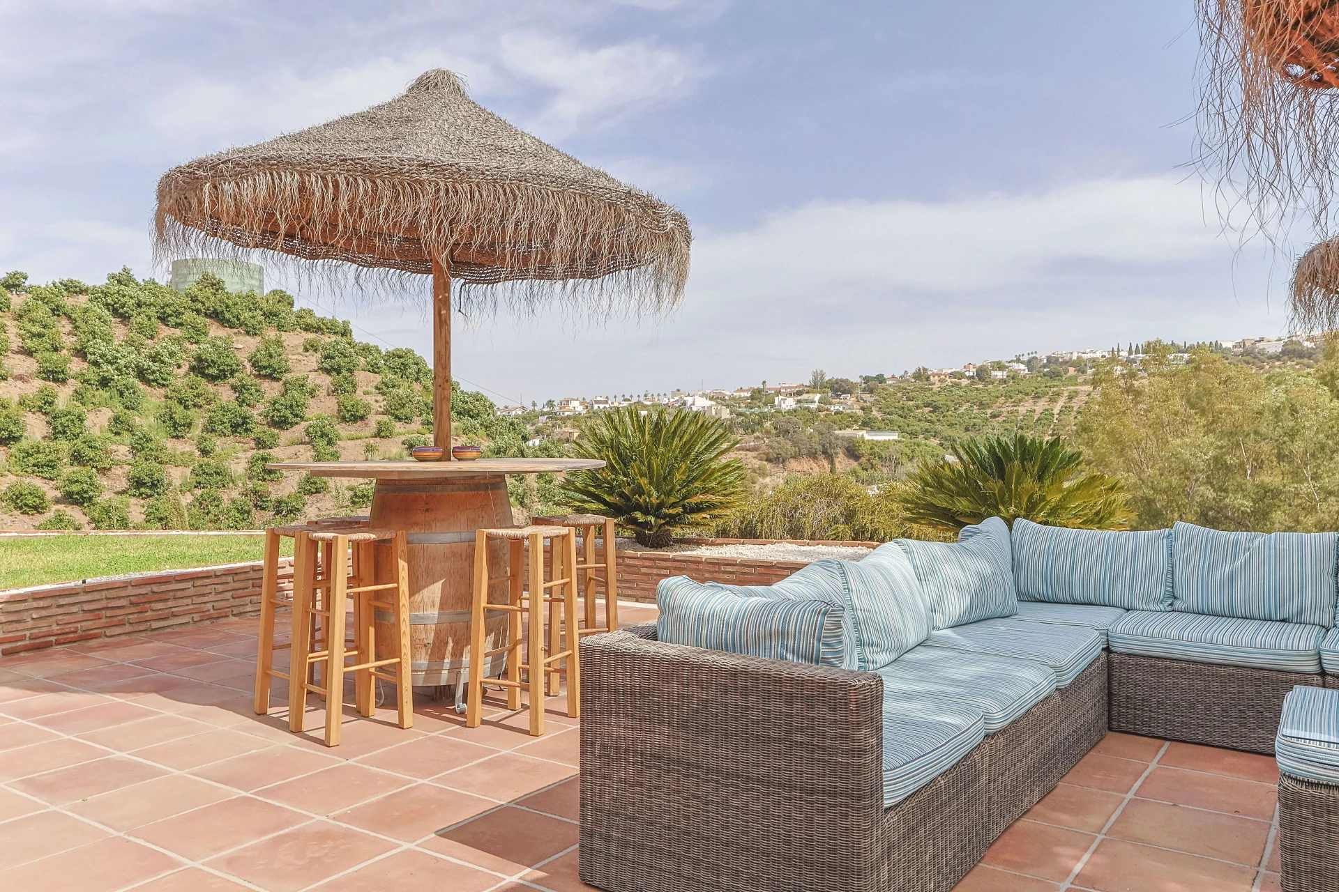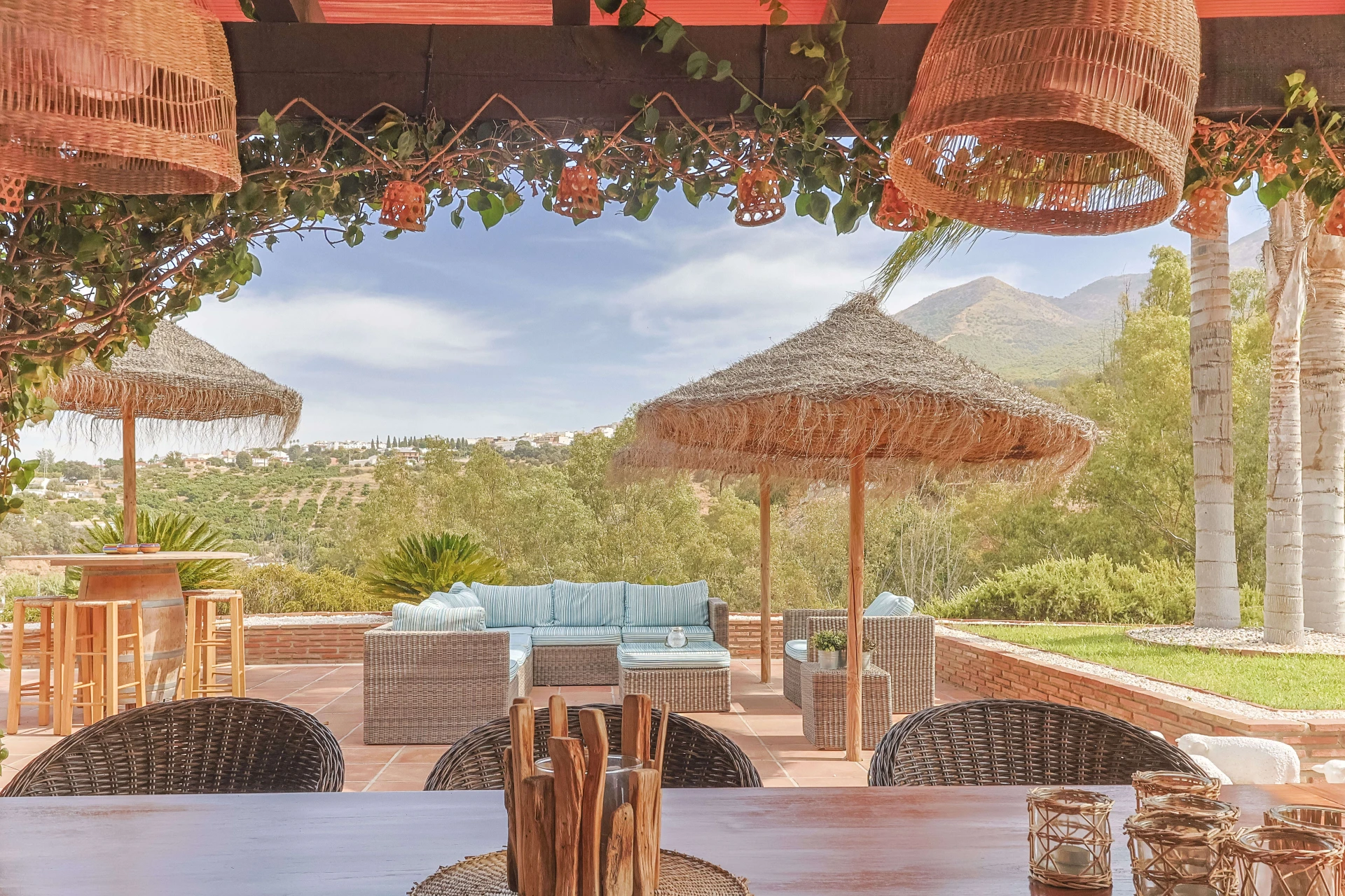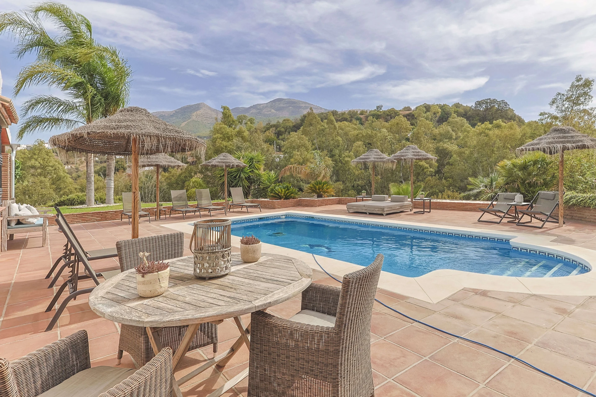 Wunderschöne Terrassen mit bequemen Gartenmöbeln und einem großen privaten Pool (4x13 m) erwarten Sie für einen unvergesslichen Aufenthalt. Der große Esstisch im Freien bietet Platz für die ganze Familie für ein köstliches Abendessen oder ein Barbecue auf dem Gasgrill. Dieses Ferienhaus ist ein echtes spanisches Casa mit angenehmer und komfortabler Ausstattung. Die abendliche Beleuchtung macht das Ganze besonders feëerisch.