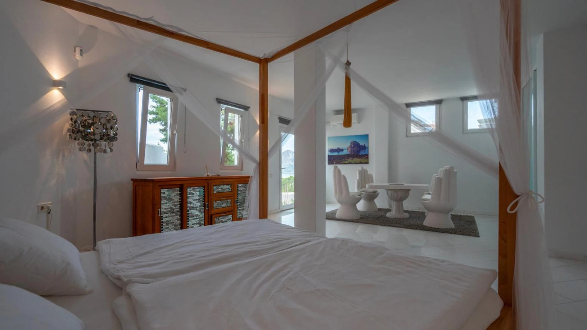 Inside, the villa exudes elegance and comfort. The living room is equipped with a Hi-Fi system and international satellite TV, perfect for relaxing evenings. The dining room flows seamlessly into a fully equipped American kitchen, complete with a dishwasher and washing machine for extra comort. The highlight is the large terrace with an outdoor lounge, where you can enjoy the stunning sea views.