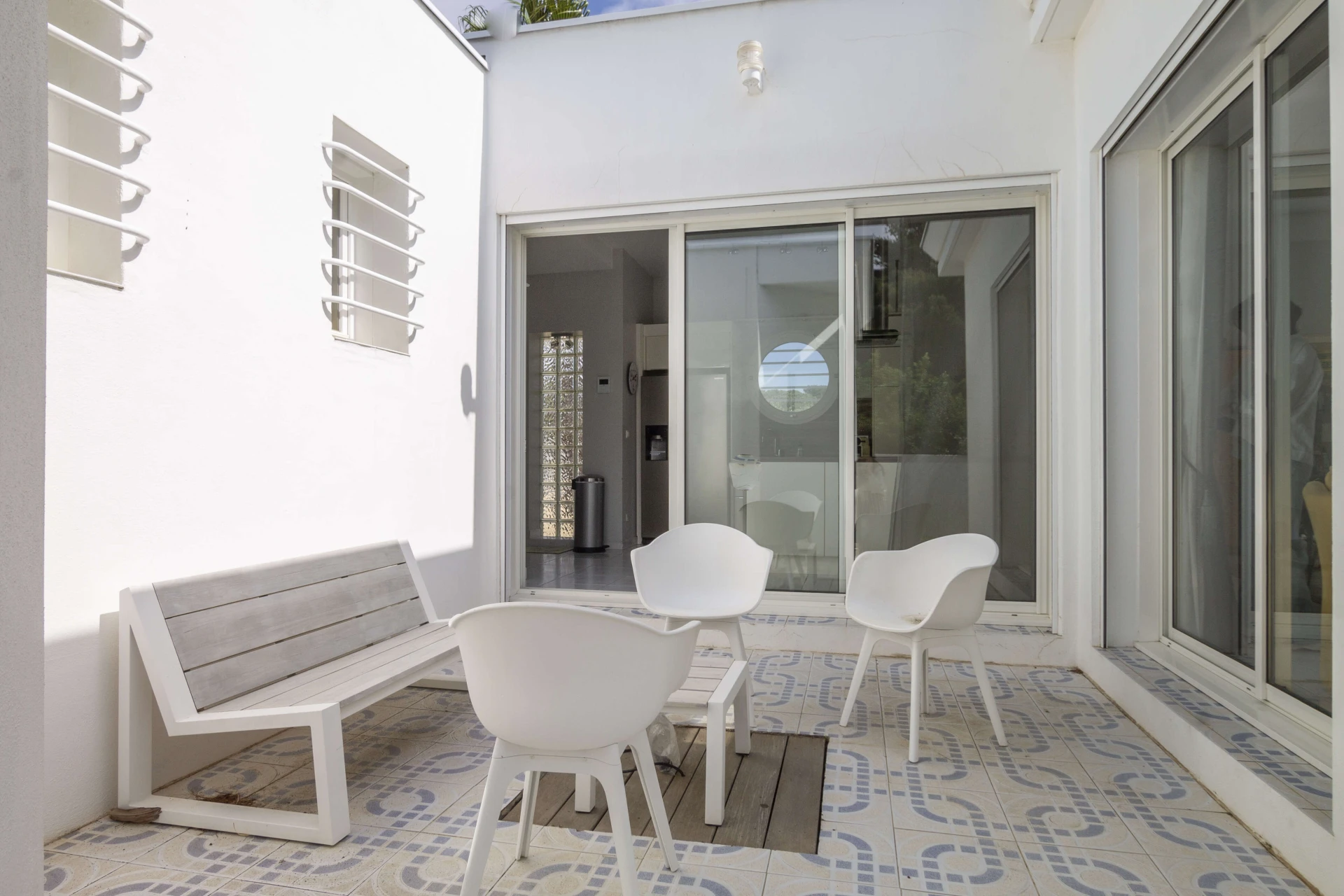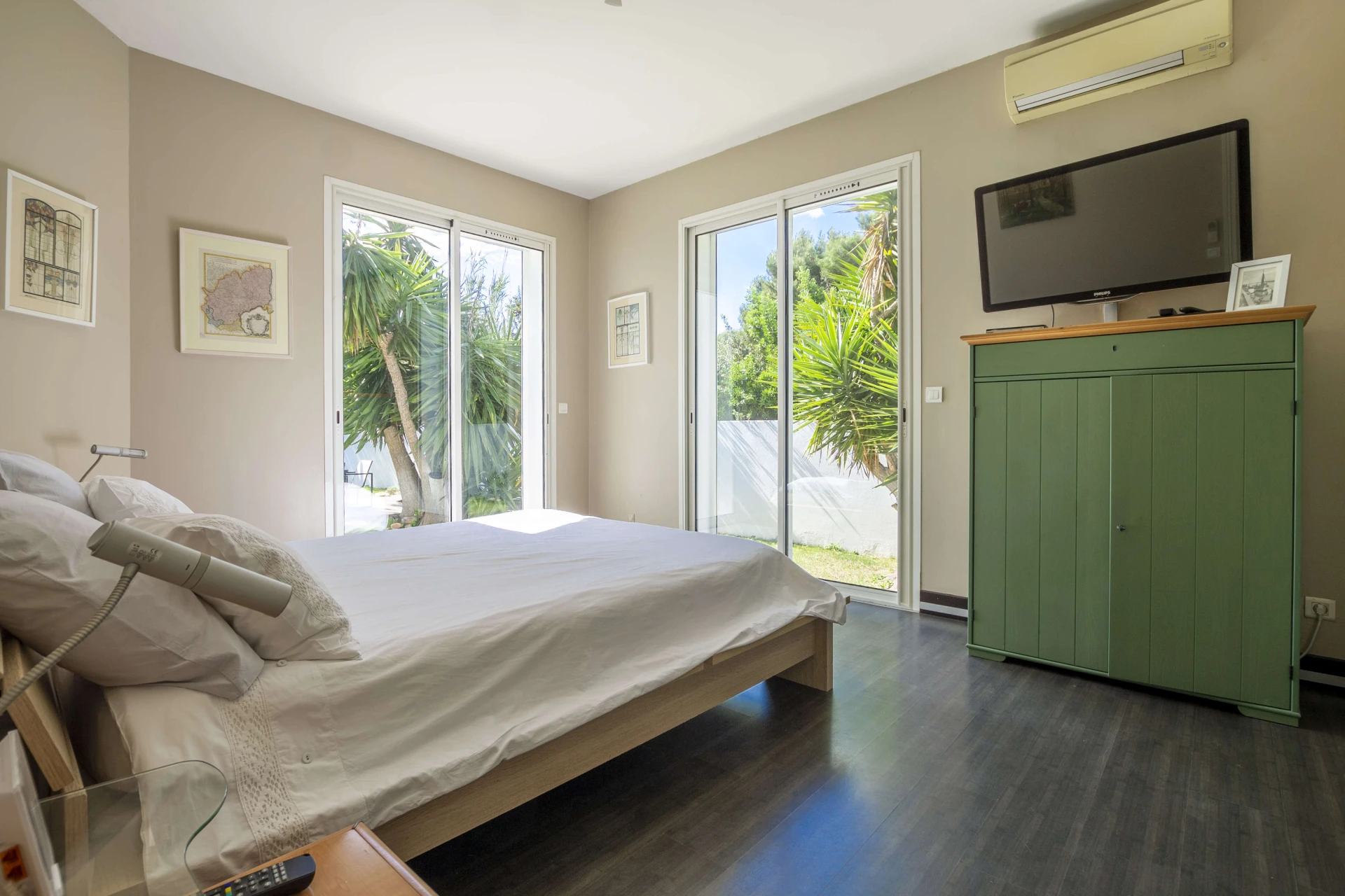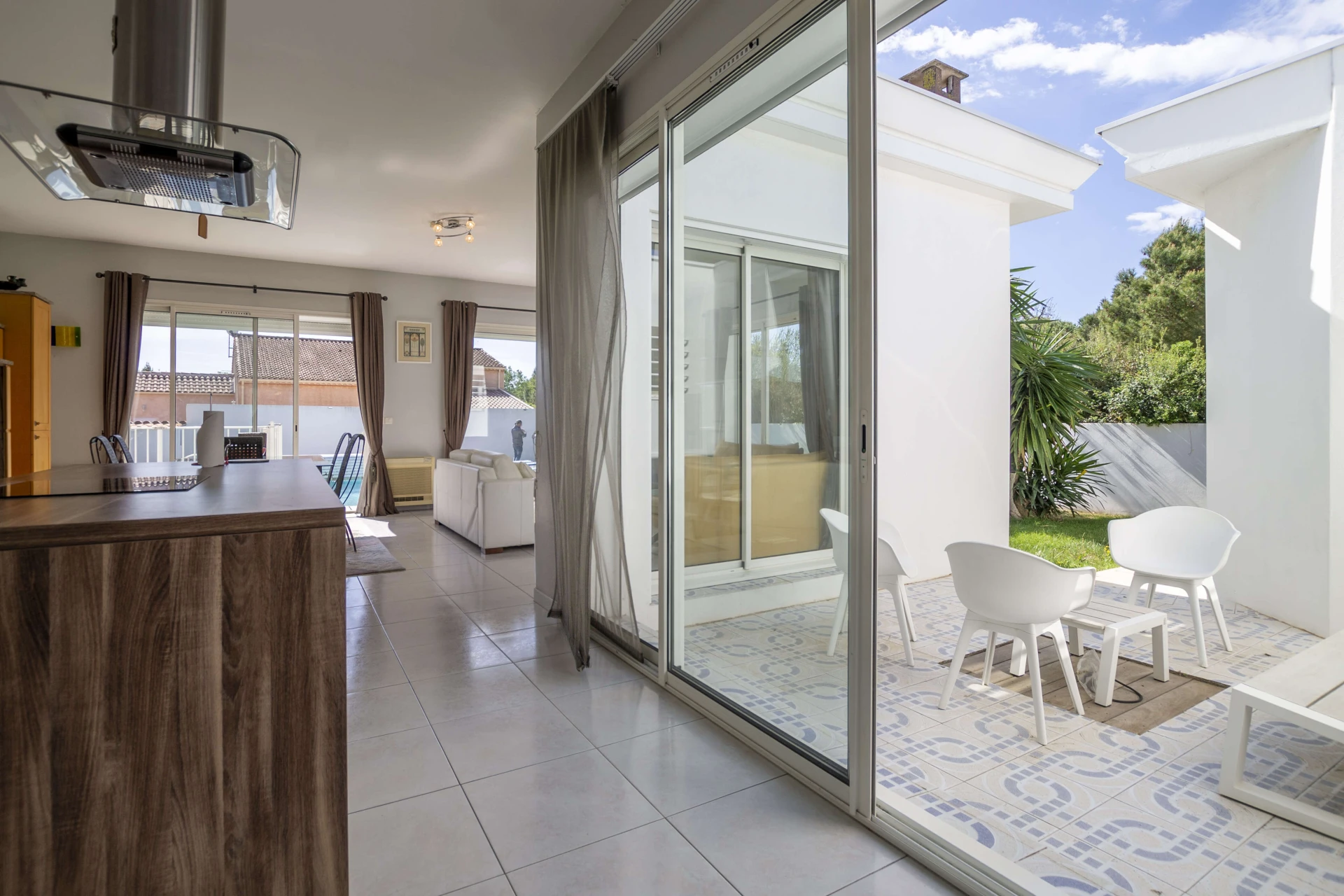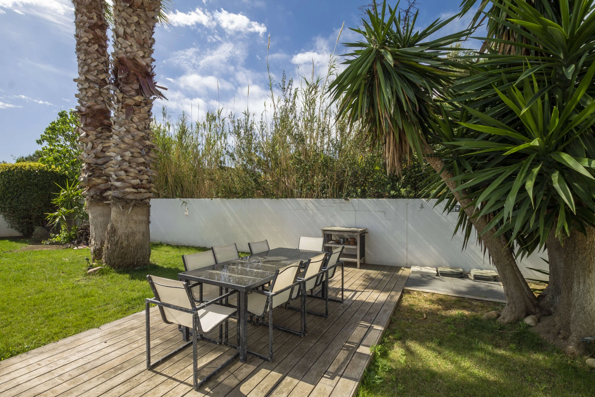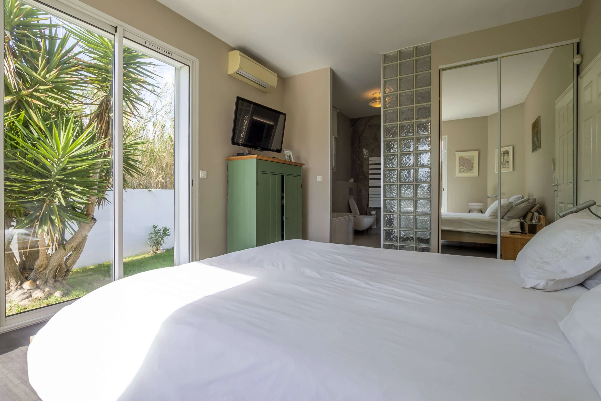 From the living area you overlook the garden and the private swimming pool (11mx6m and 2m deep). The pool is heated from May to October. Upon request, the pool can be heated outside of these periods. The pool can be closed with a shutter, making it extra safe for the little ones. Around the pool there are plenty of deckchairs for sunbathing. If you prefer shade, the palm trees provide the necessary refreshment.