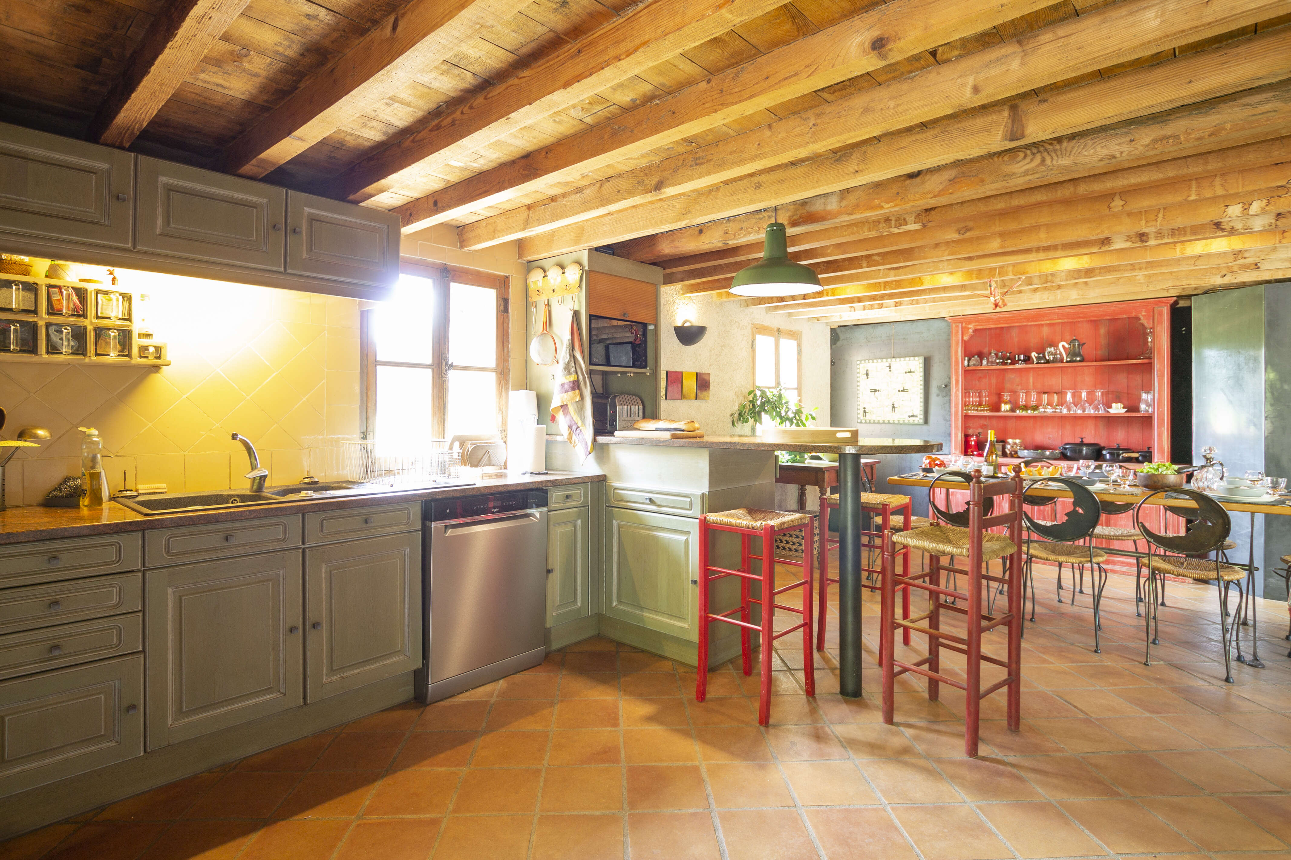 Die offene Küche von Mas Ronquet bietet alle Annehmlichkeiten, um eine schöne Mahlzeit zu kochen. Das stilvolle Ess- und Wohnzimmer ist sehr geräumig und warm und gemütlich. Im Erdgeschoss befinden sich 2 Schlafzimmer mit eigenem Bad. Dadurch ist das Haus auch für Menschen mit eingeschränkter Mobilität leicht zugänglich. Im Bürobereich gibt es ein zusätzliches Schlafsofa (2p). Im ersten Stock gibt es 2 weitere Schlafzimmer, eines mit einer schönen Sonnenterrasse und 1 Badezimmer. Es gibt keine Klimaanlage im Haus, aber in jedem Zimmer stehen Dyson-Ventilatoren zur Verfügung.