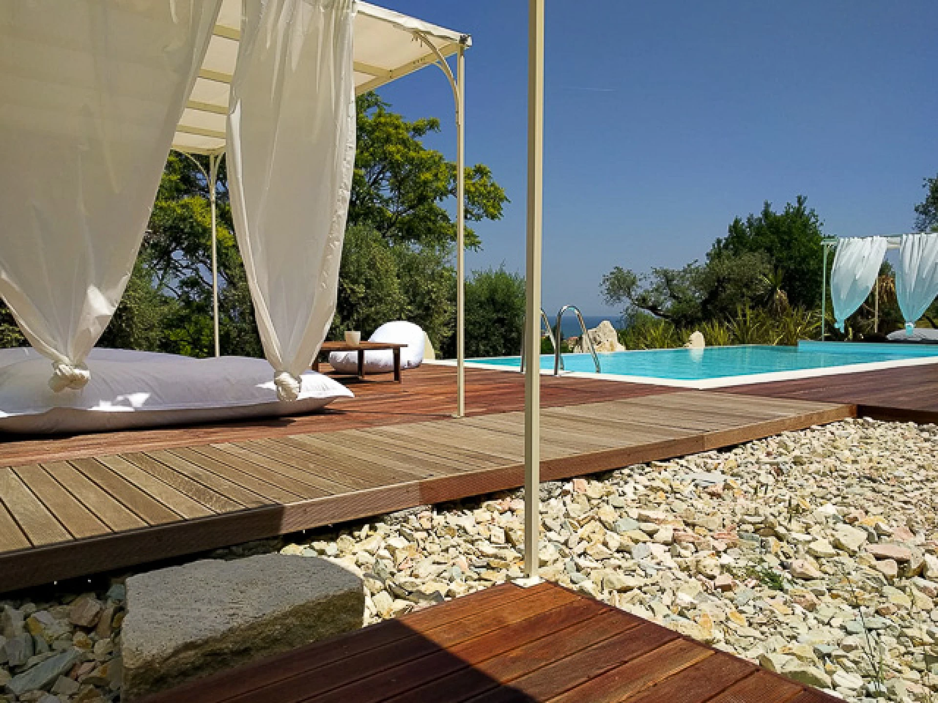 Casa Luce is a beautifully renovated holiday home in Italy with a private swimming pool, Cupra Marittima, Le Marche. The holiday home for 16 people is rented in its entirety and consists of four very luxurious apartments. These all have their own private terrace and a private infinity pool. Each apartment has a private terrace with luxurious sunbeds and a pergola for the necessary shade.