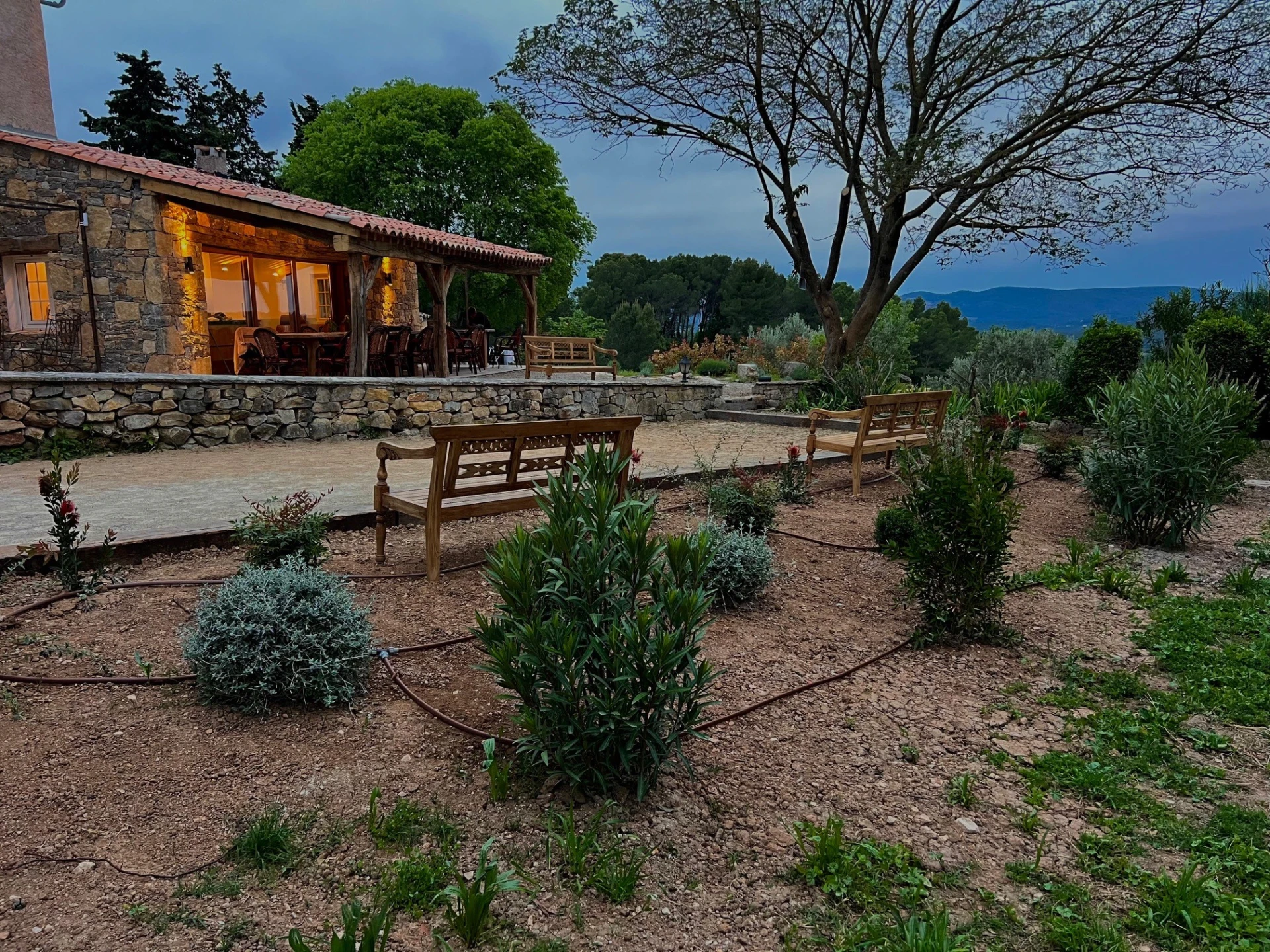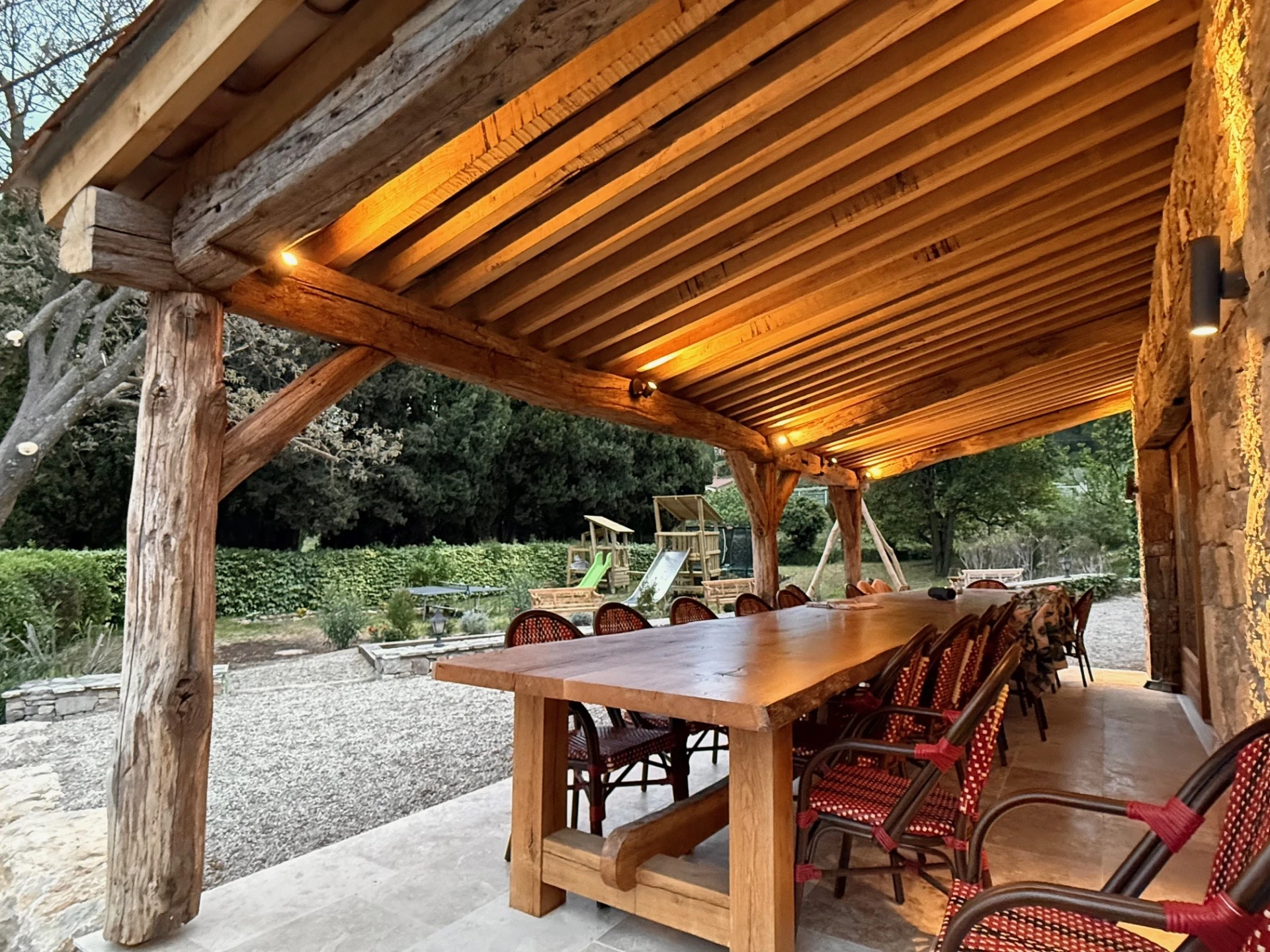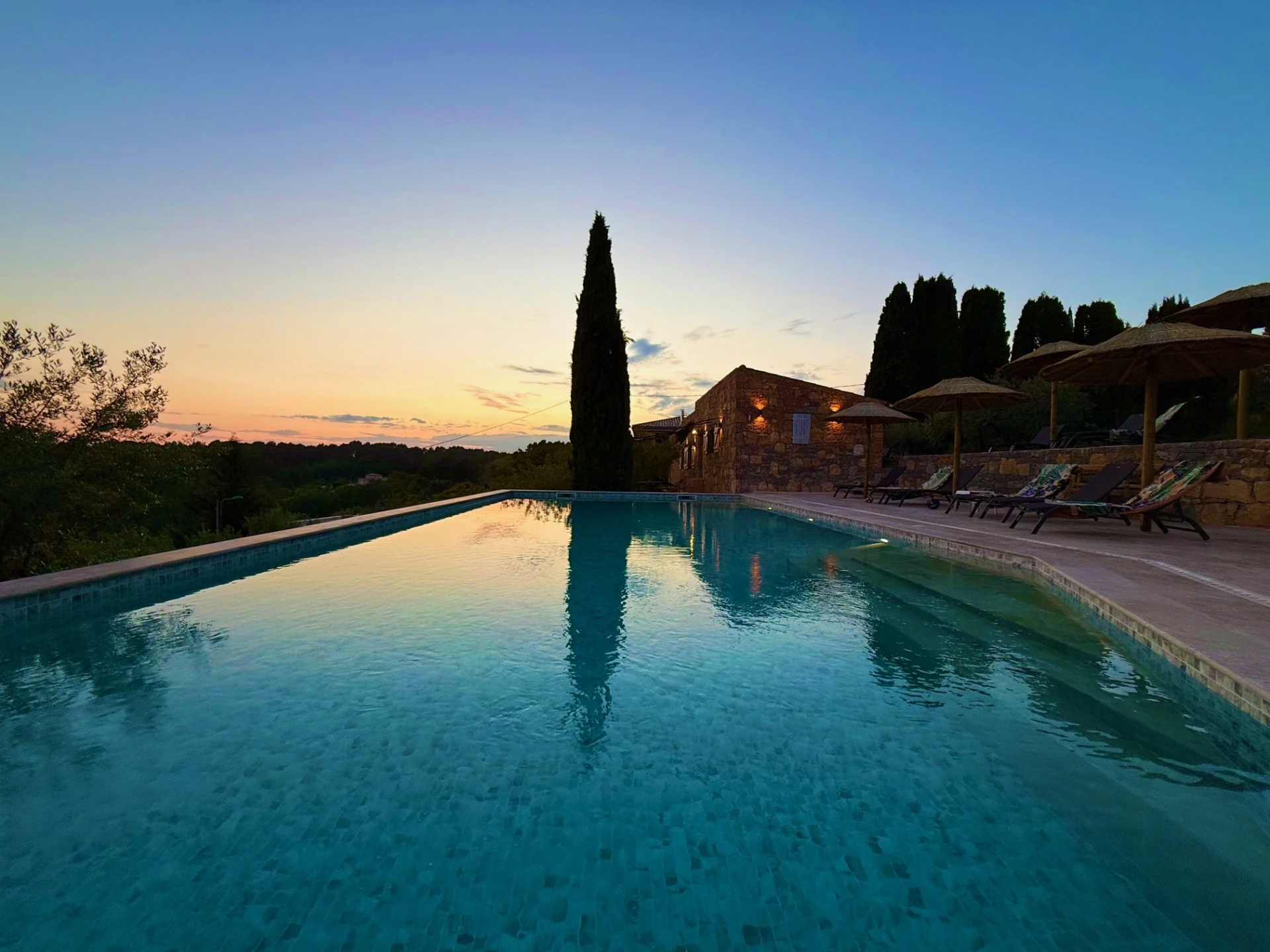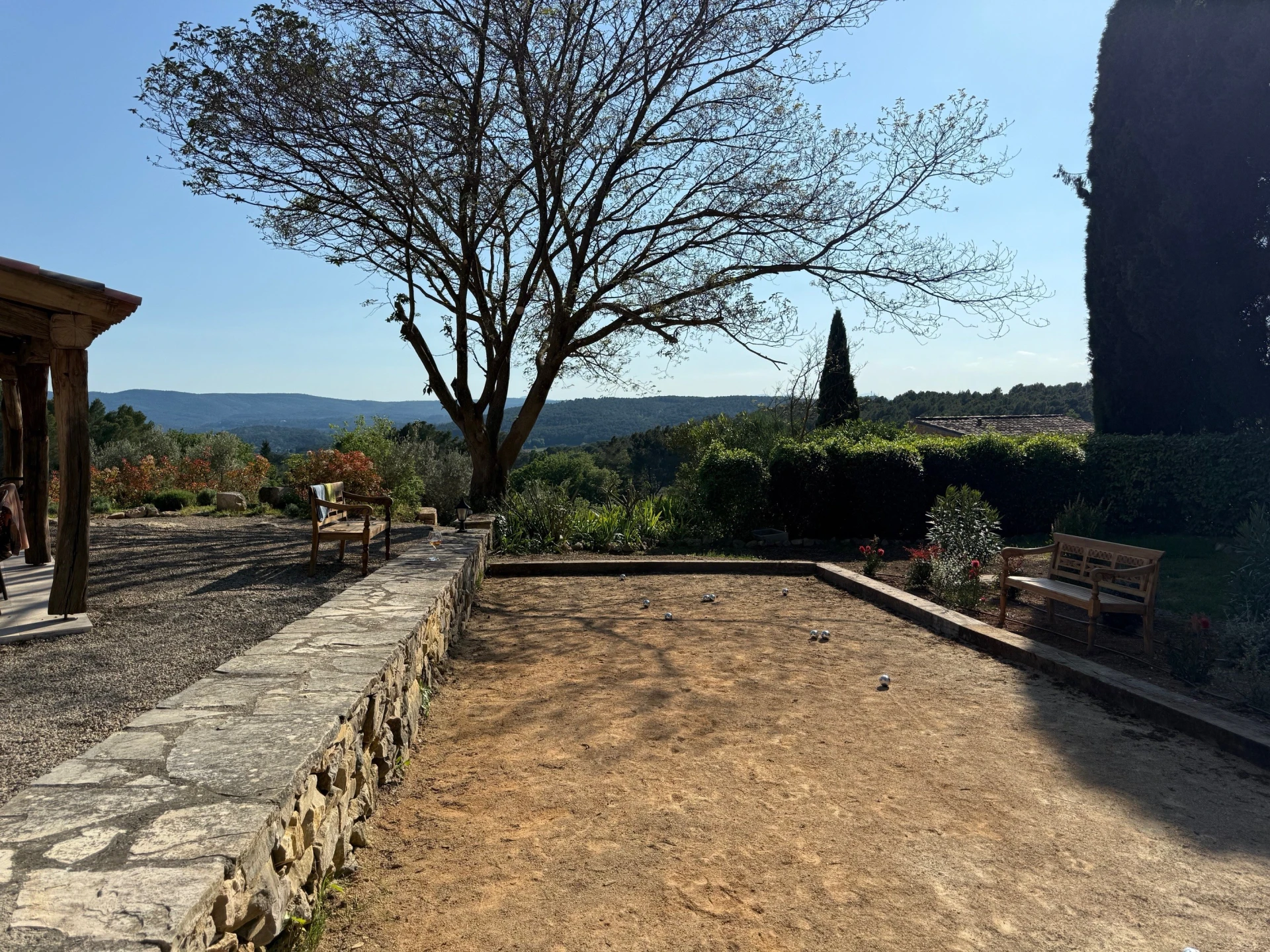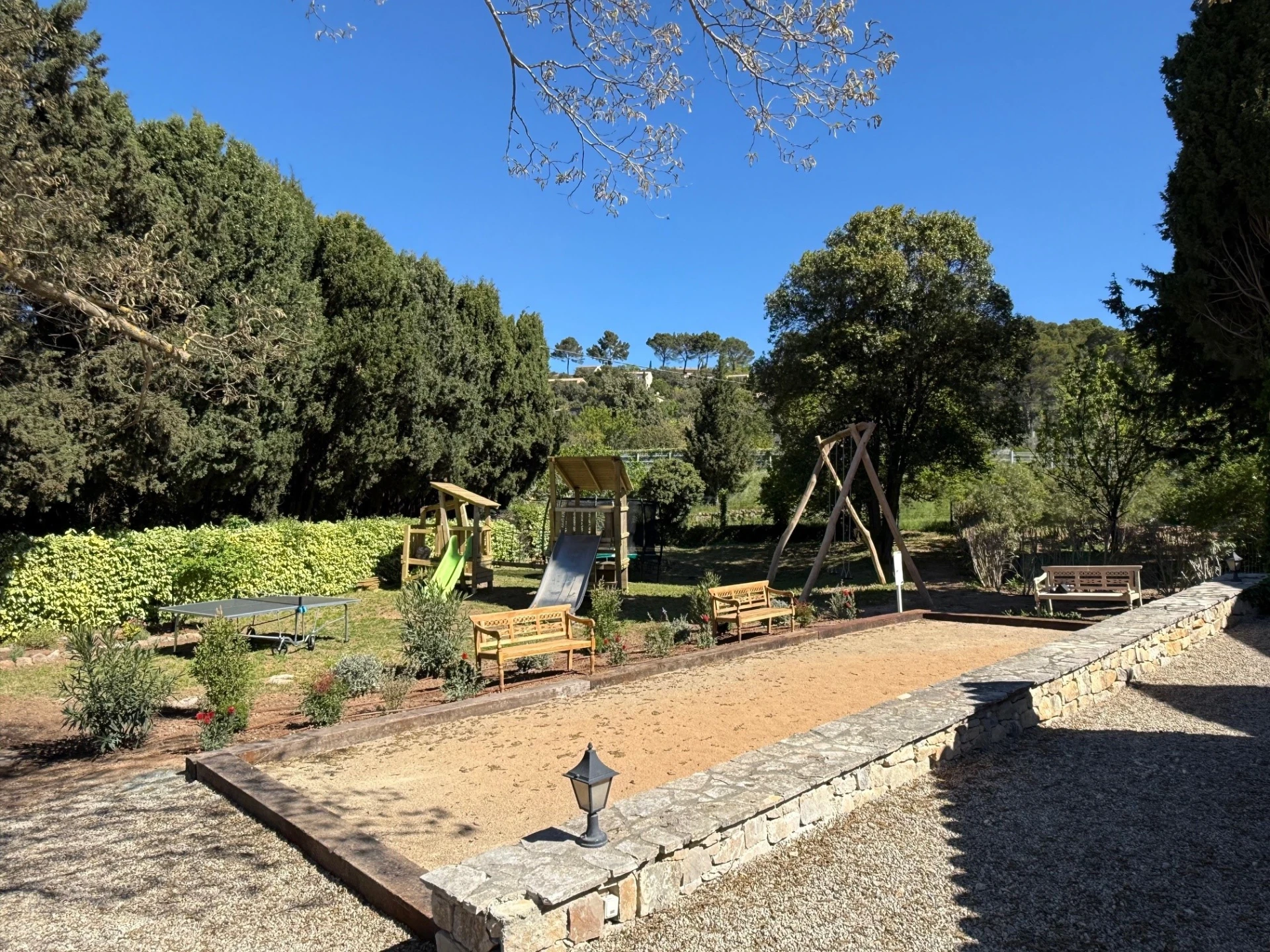 Das weitläufige 4.000 m² große Grundstück umfasst einen großen privaten Pool (6x13m), der beheizt werden kann, einen schönen Garten mit einem Olivenhain, ein Boulefeld, einen Kinderspielplatz (Trampolin, Schaukeln, Rutsche) und eine Tischtennisplatte.