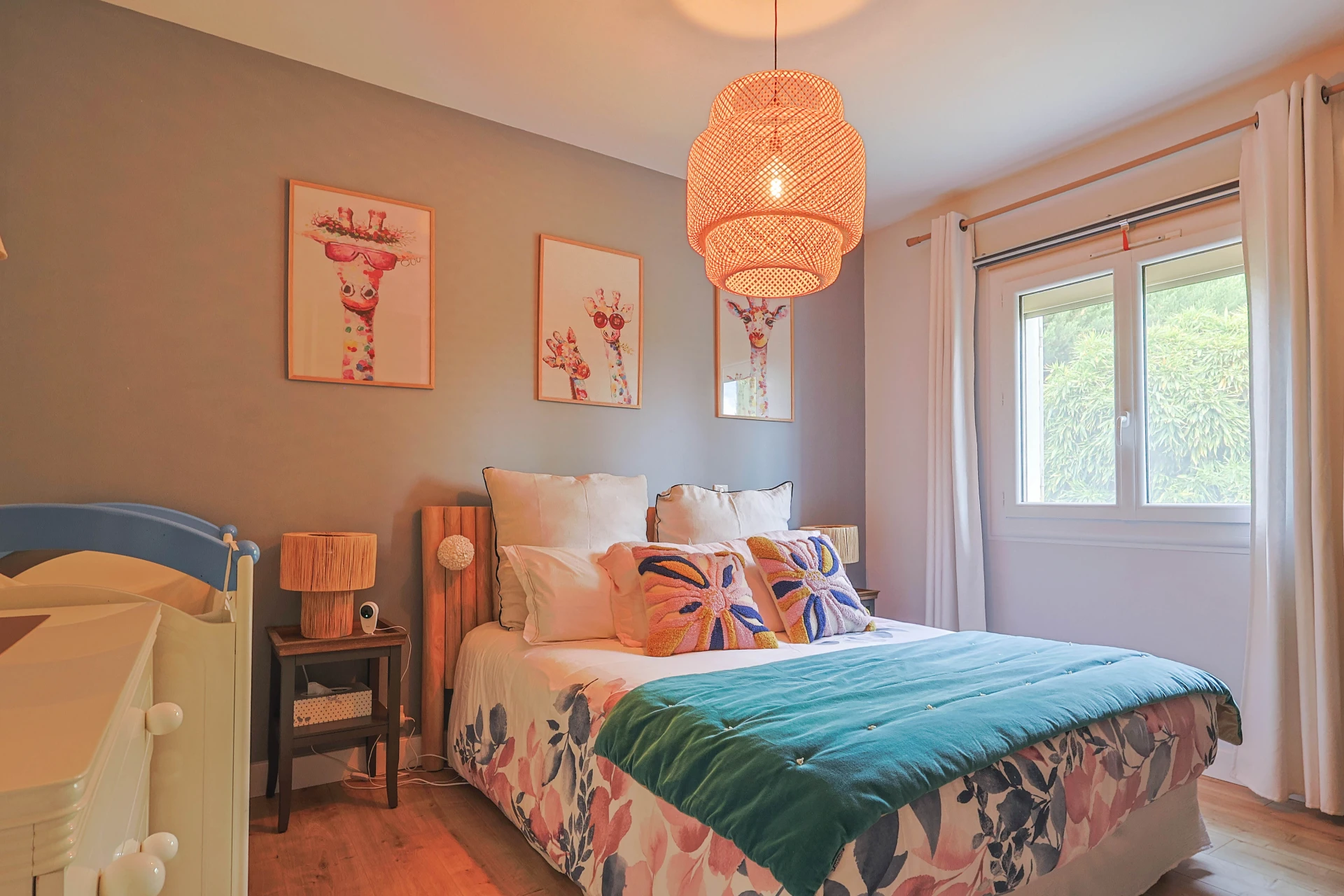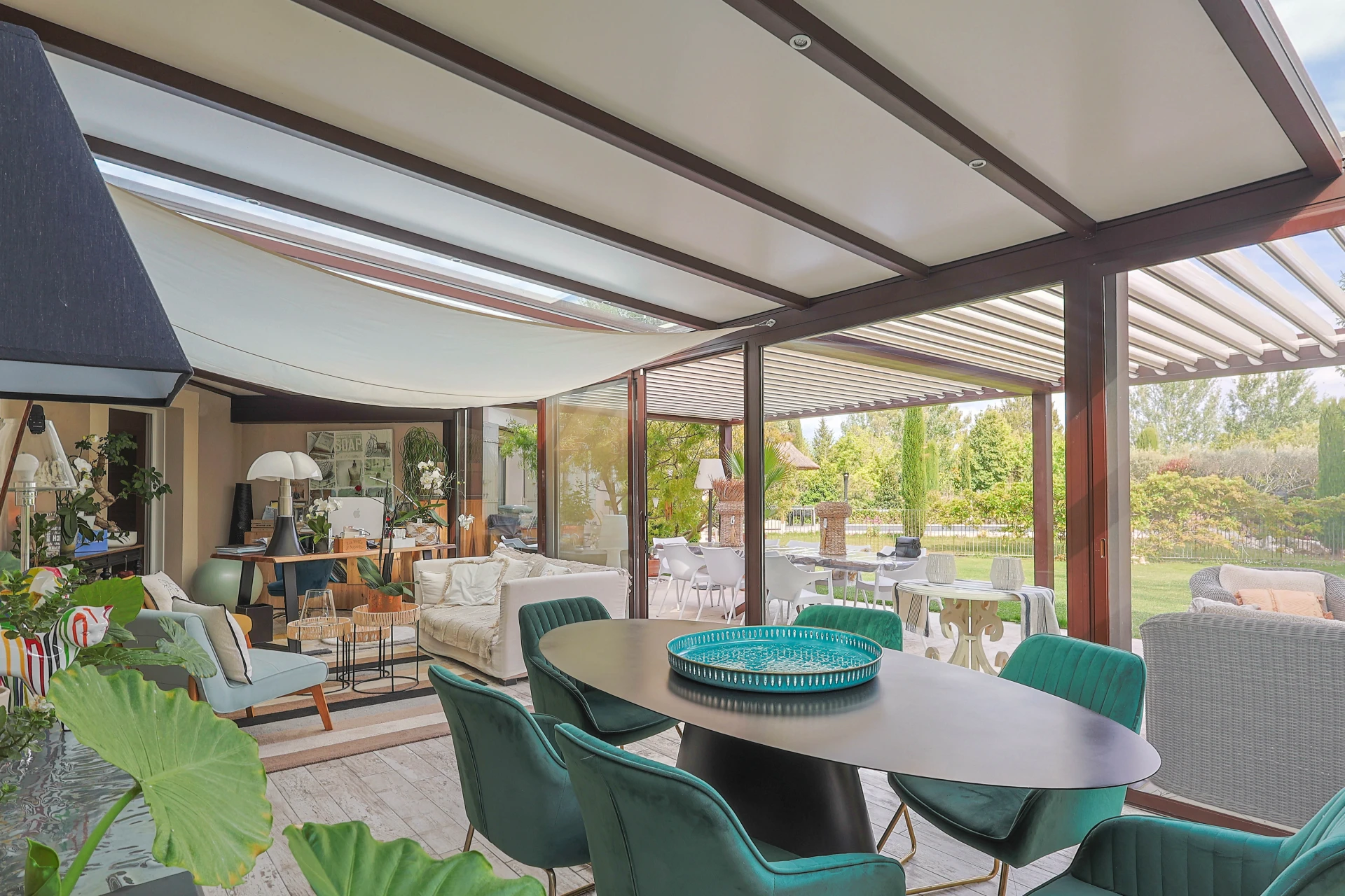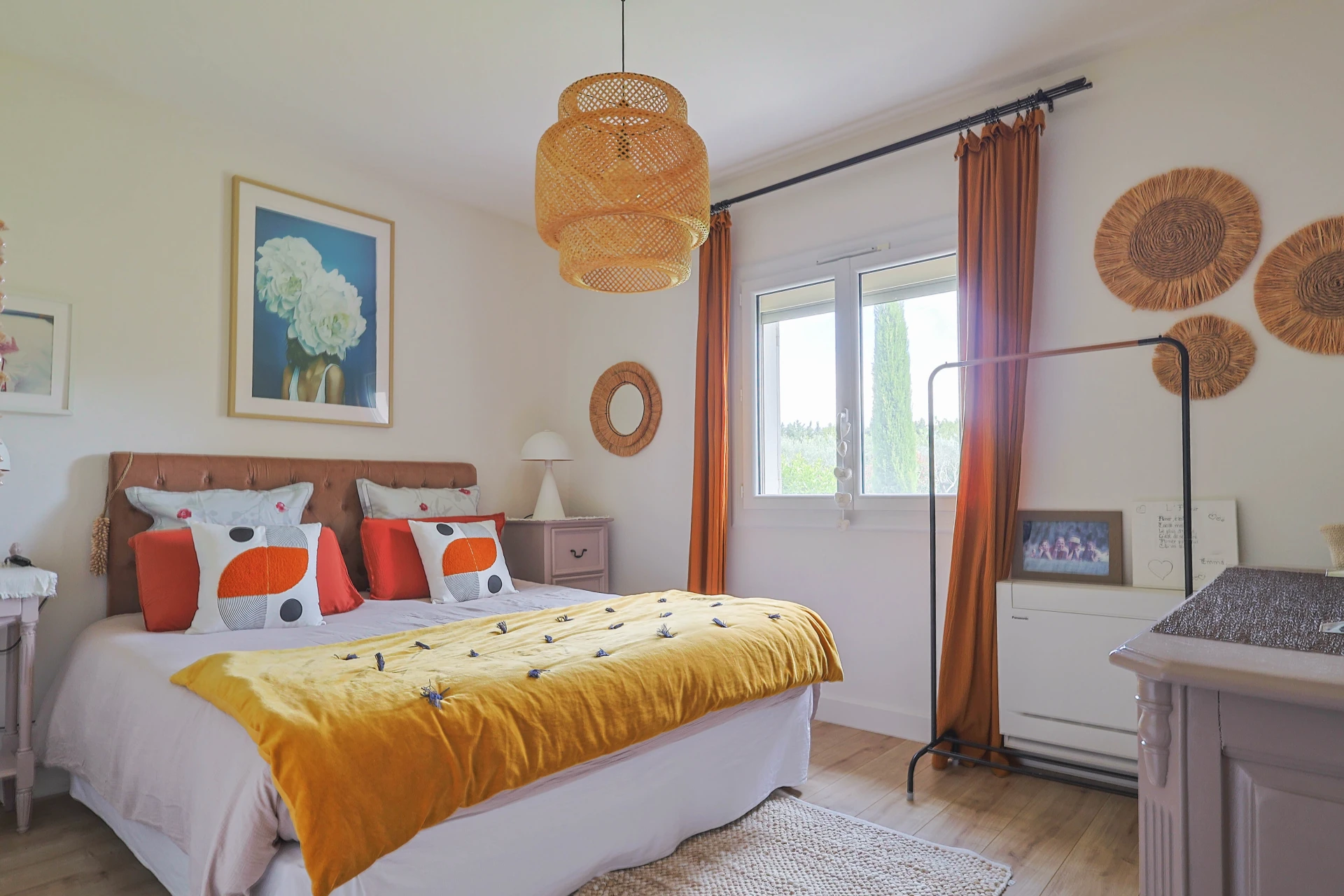 Das vollklimatisierte Ferienhaus in der Provence verfügt über drei Schlafzimmer mit je einem großen Bett und einem Fernseher sowie zwei Badezimmer. In einem der Zimmer kann optional ein Babybett aufgestellt werden. Die Einrichtung ist warm und gemütlich, mit viel Licht durch große Fenster und stilvolle Möbel. Das Ferienhaus verfügt außerdem über eine moderne, voll ausgestattete Küche, eine klimatisierte Veranda und eine bioklimatische Pergola mit vielen Gartenmöbeln und einem tollen Blick auf den Garten und den Pool.