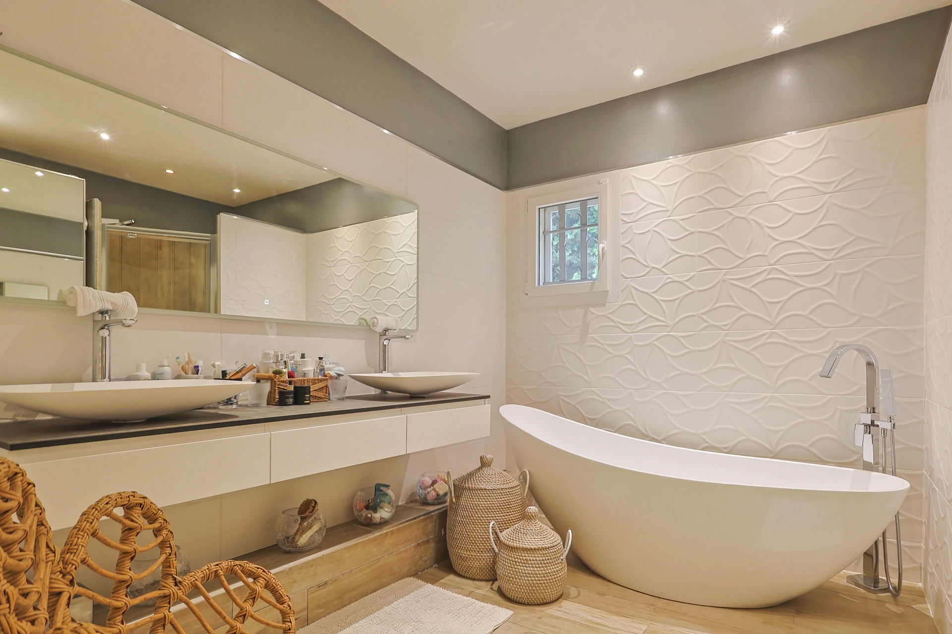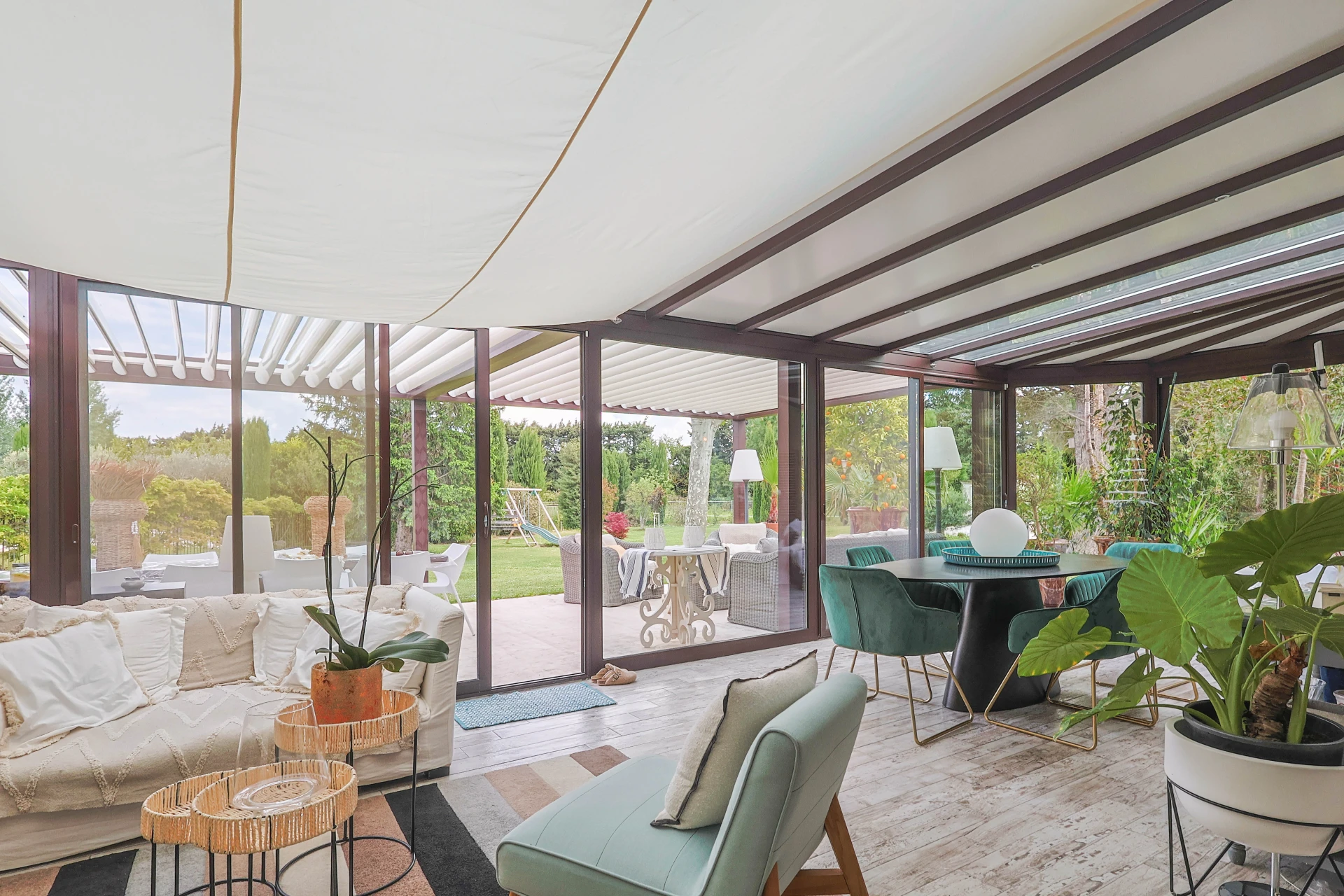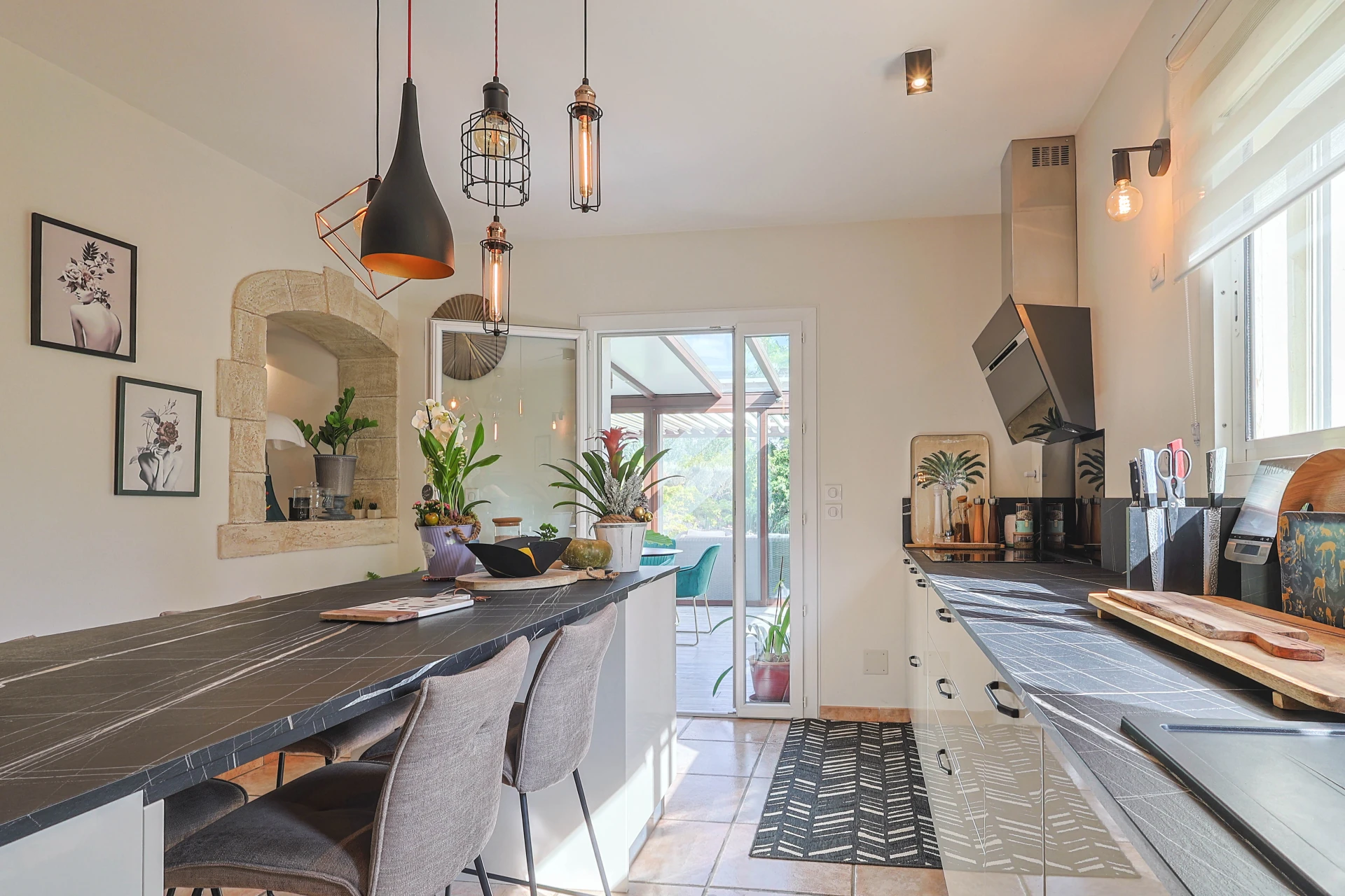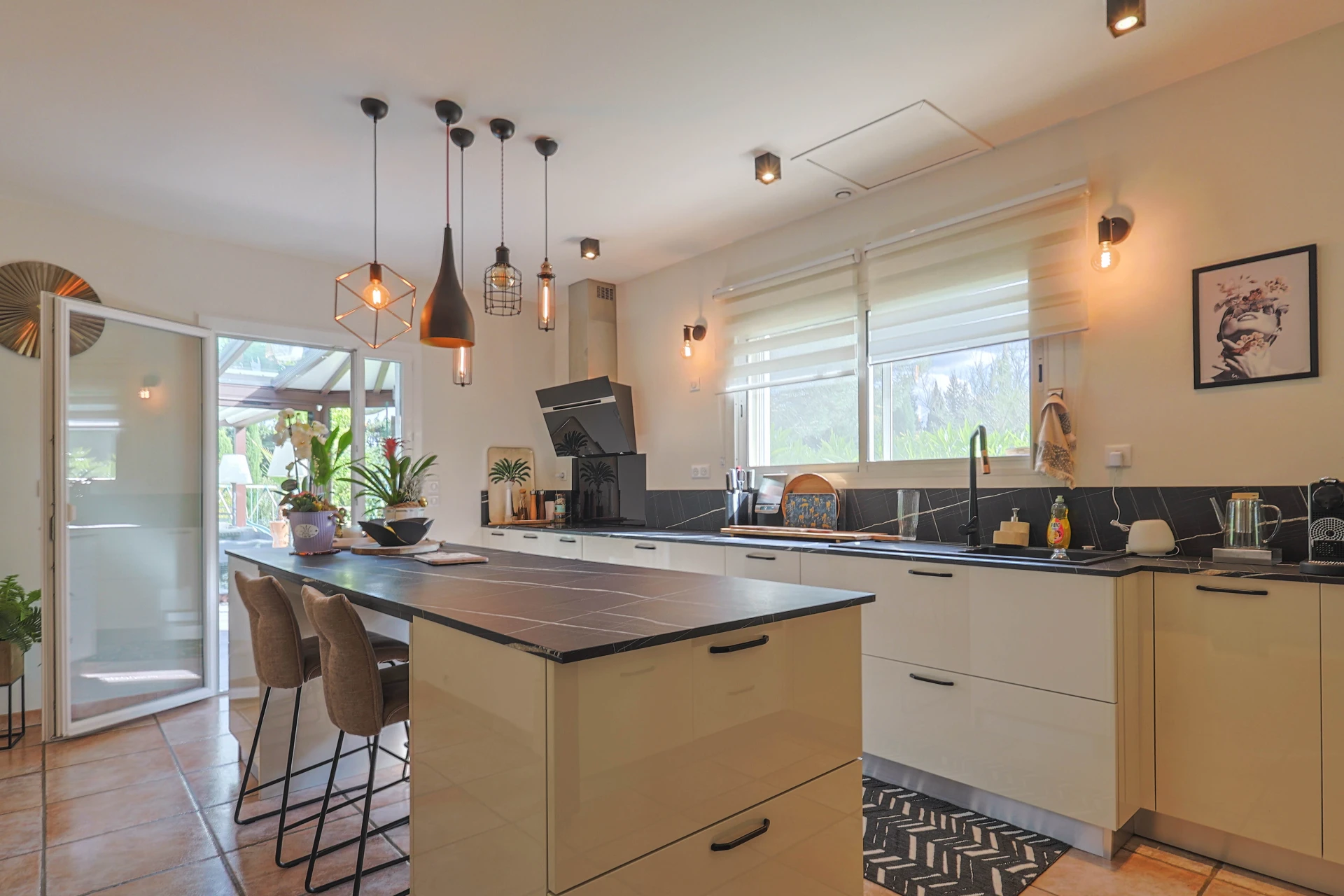 Das vollklimatisierte Ferienhaus in der Provence verfügt über drei Schlafzimmer mit je einem großen Bett und einem Fernseher sowie zwei Badezimmer. In einem der Zimmer kann optional ein Babybett aufgestellt werden. Die Einrichtung ist warm und gemütlich, mit viel Licht durch große Fenster und stilvolle Möbel. Das Ferienhaus verfügt außerdem über eine moderne, voll ausgestattete Küche, eine klimatisierte Veranda und eine bioklimatische Pergola mit vielen Gartenmöbeln und einem tollen Blick auf den Garten und den Pool.