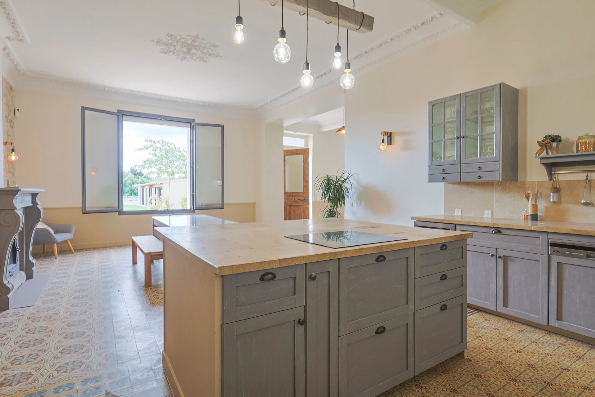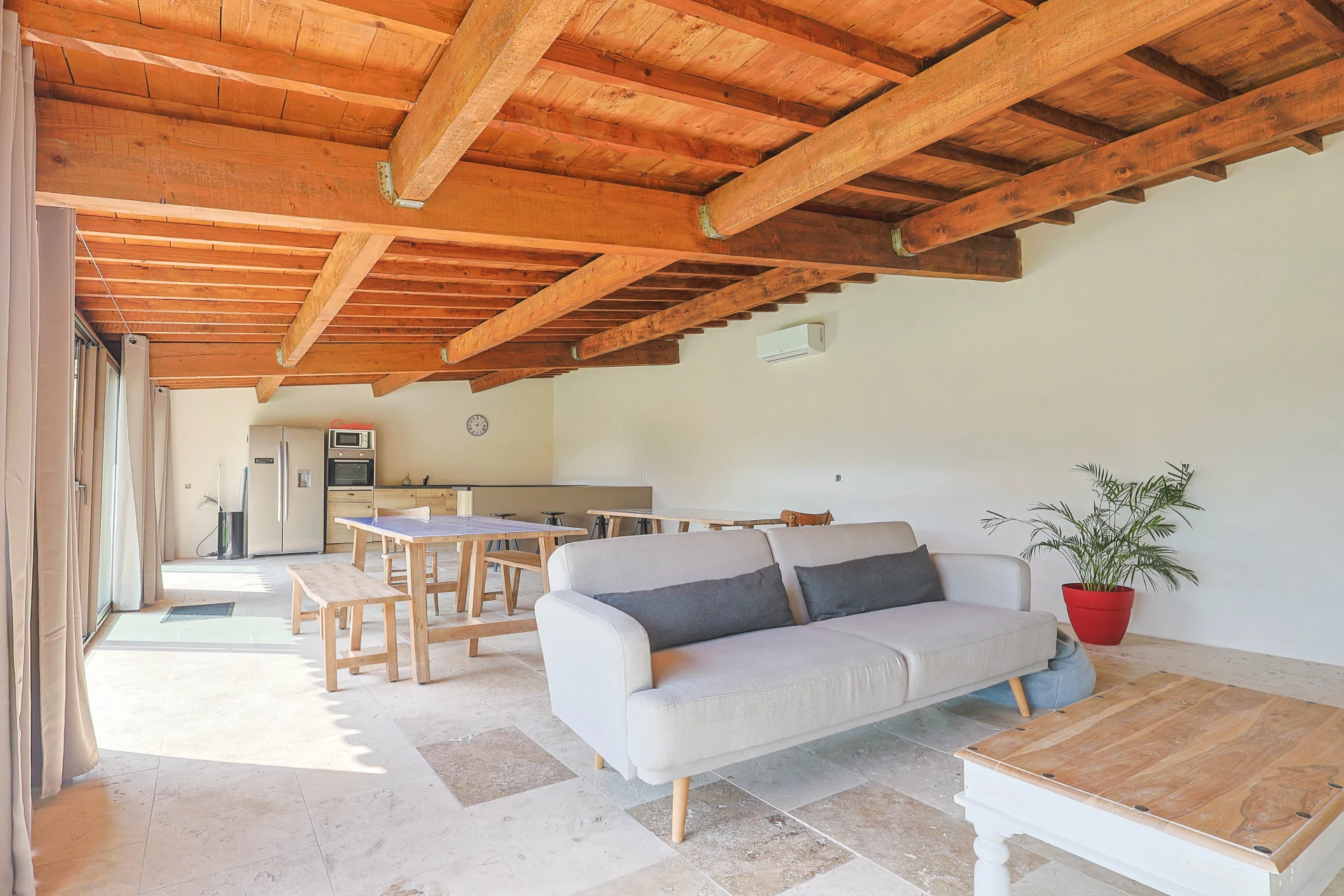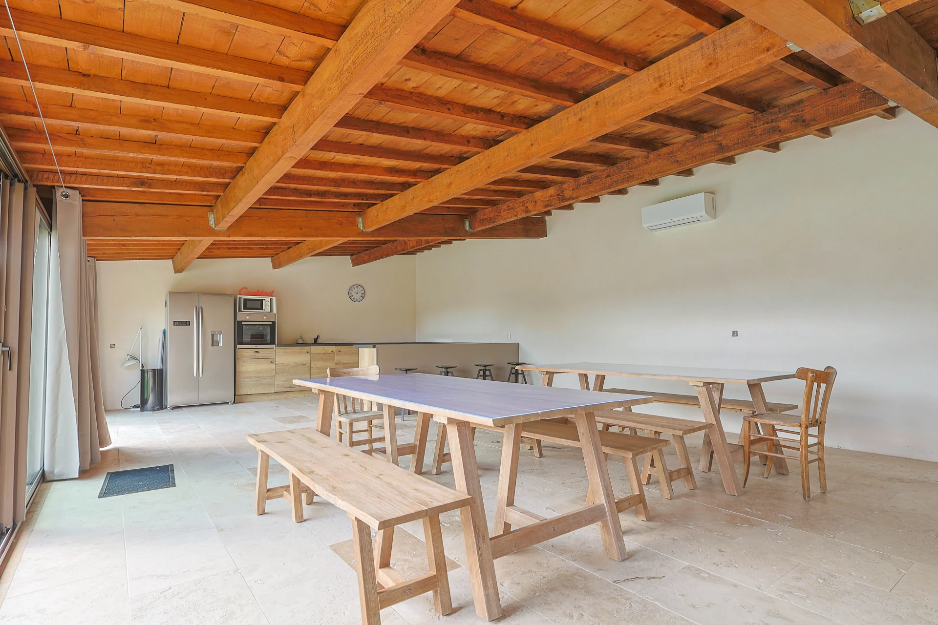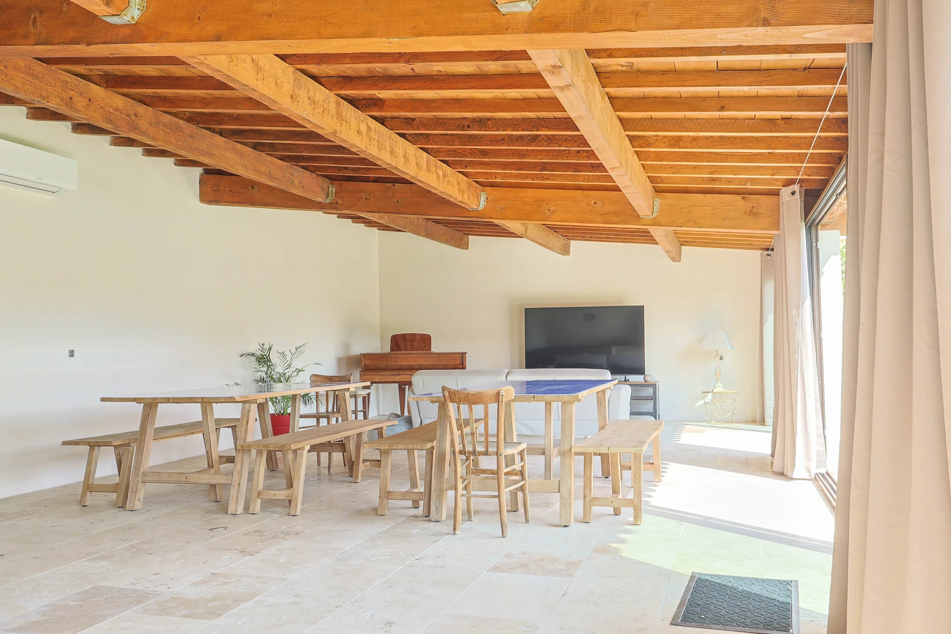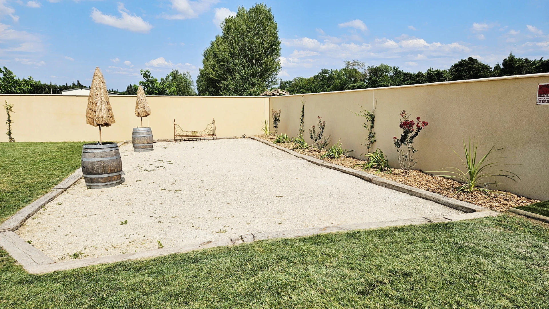 Ein echtes Highlight dieser Unterkunft ist das große Poolhaus – komplett ausgestattet mit einer zweiten Küche, einem Essbereich, einer Sitzecke und sogar einem Fernseher. Der gesamte Bereich ist klimatisiert, sodass Sie ihn auch während der heißesten Tagesstunden angenehm nutzen können. Das Poolhaus führt direkt zum großen privaten Pool (10 x 5 m, Tiefe: 1,50 m), ausgestattet mit einem flachen Einstieg – ideal für kleine Kinder. Ein Boule-Platz steht Ihnen ebenfalls zur Verfügung – perfekt für gesellige Runden mit Familie oder Freunden.