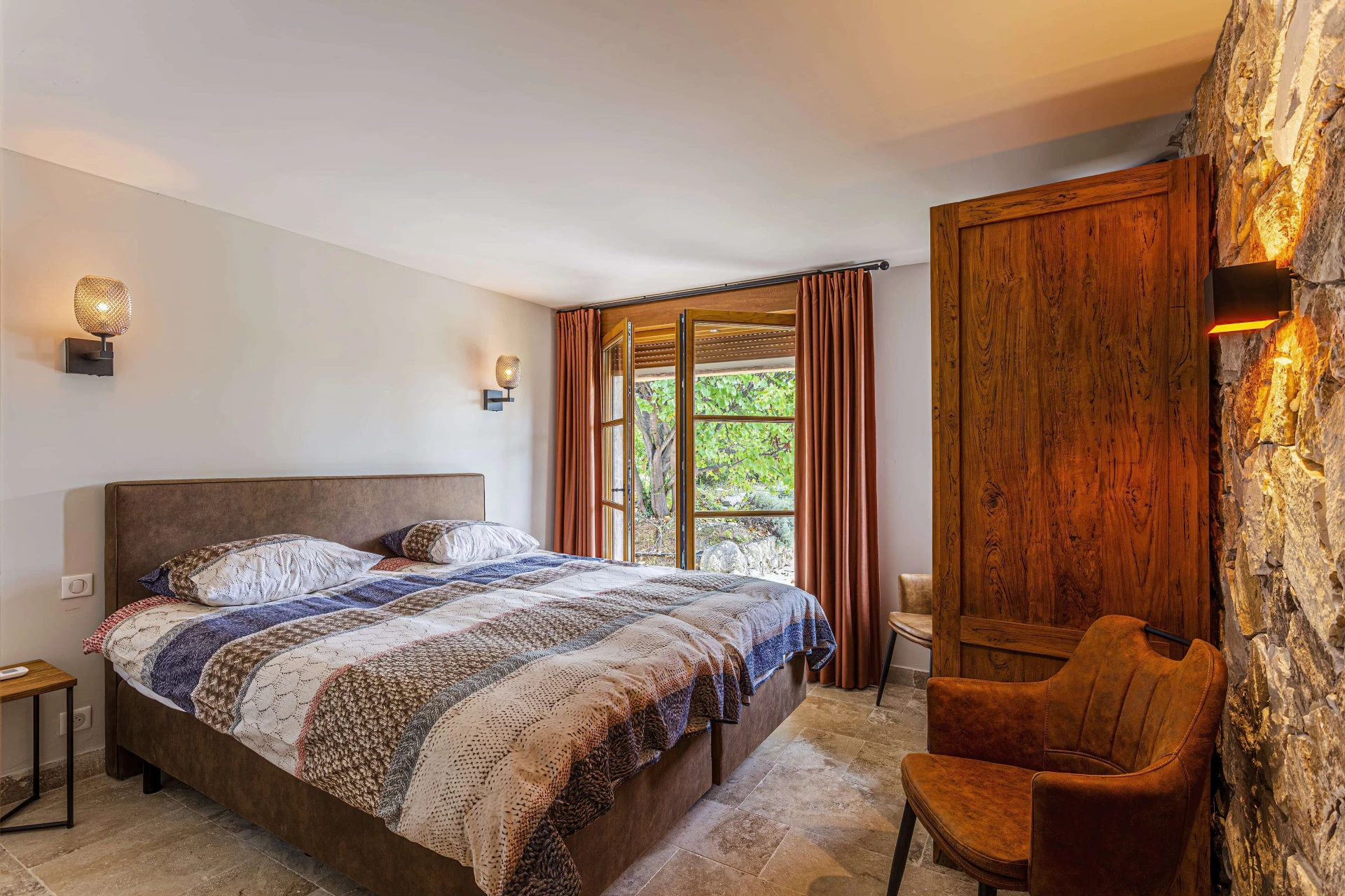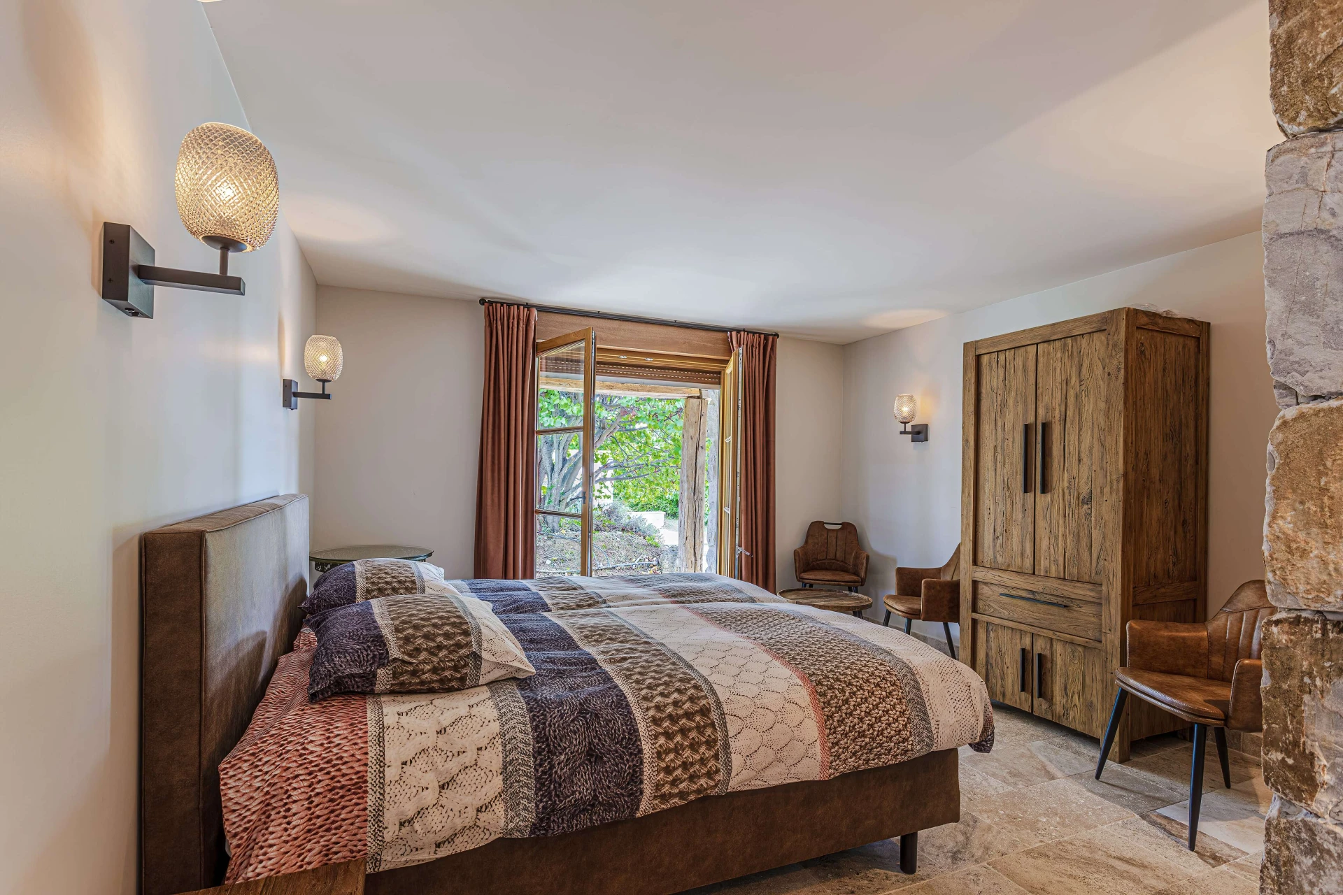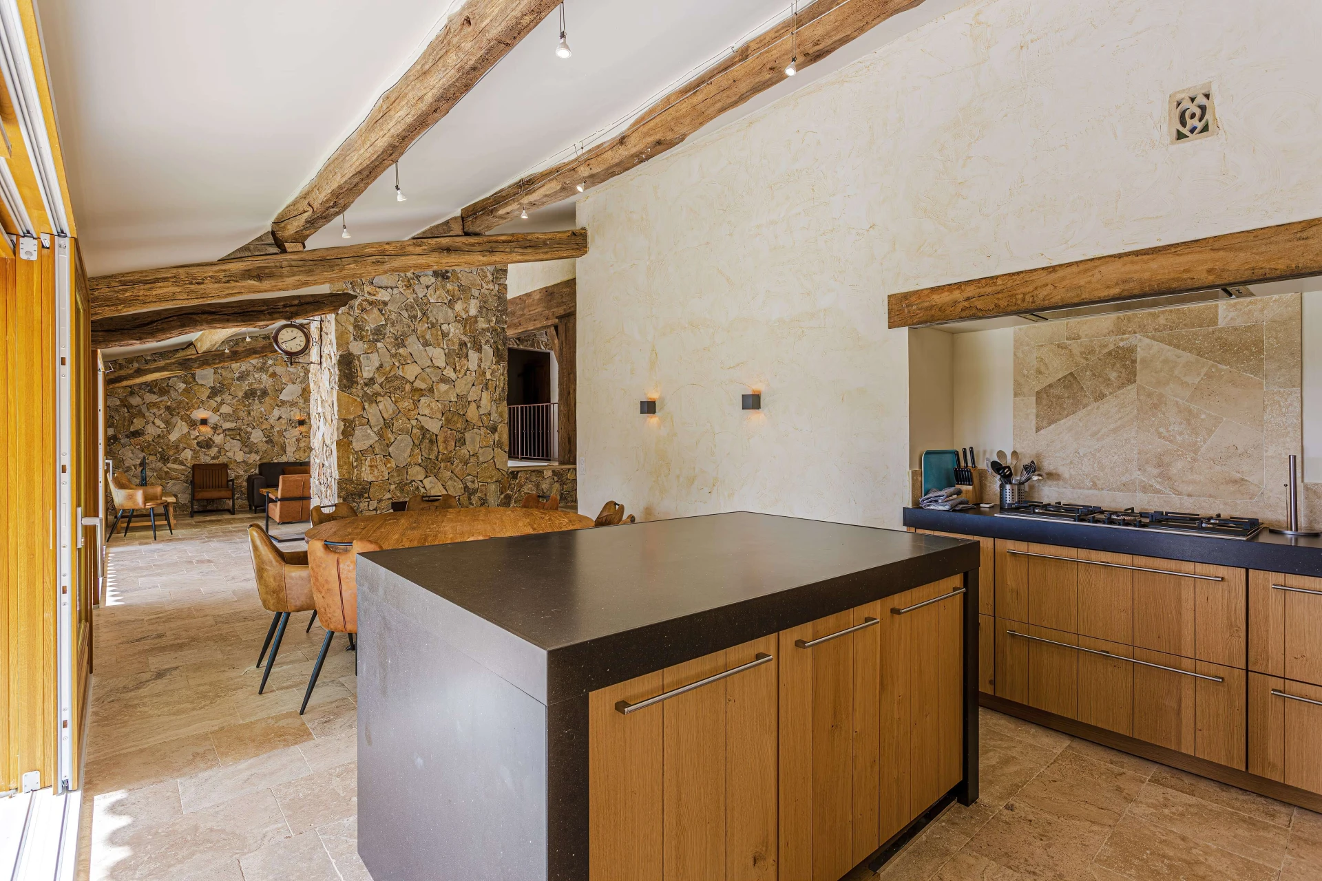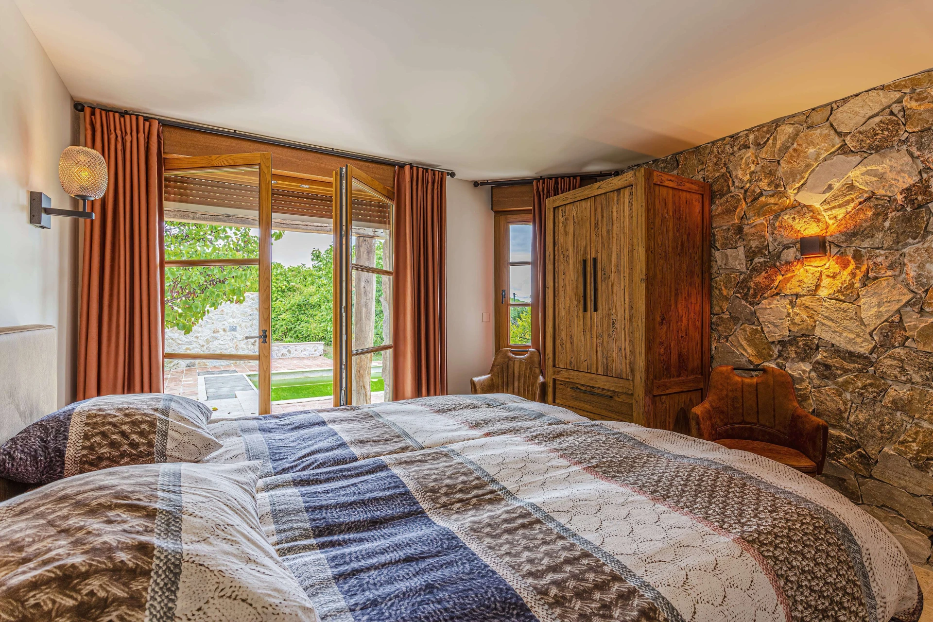 The interior has been modernly furnished while retaining authentic elements such as natural stone and beautiful wooden ceiling beams. The living room has an LCD television with Apple TV that gives access to YouTube, Netflix and all networks of all countries. At the open living room you will find the spacious dining room with kitchen. This is a beautiful space with large sliding doors to the covered terrace. There is a long wooden dining table and by extension you come to the modern equipped kitchen with gas stove with two dishwashers and two refrigerators.