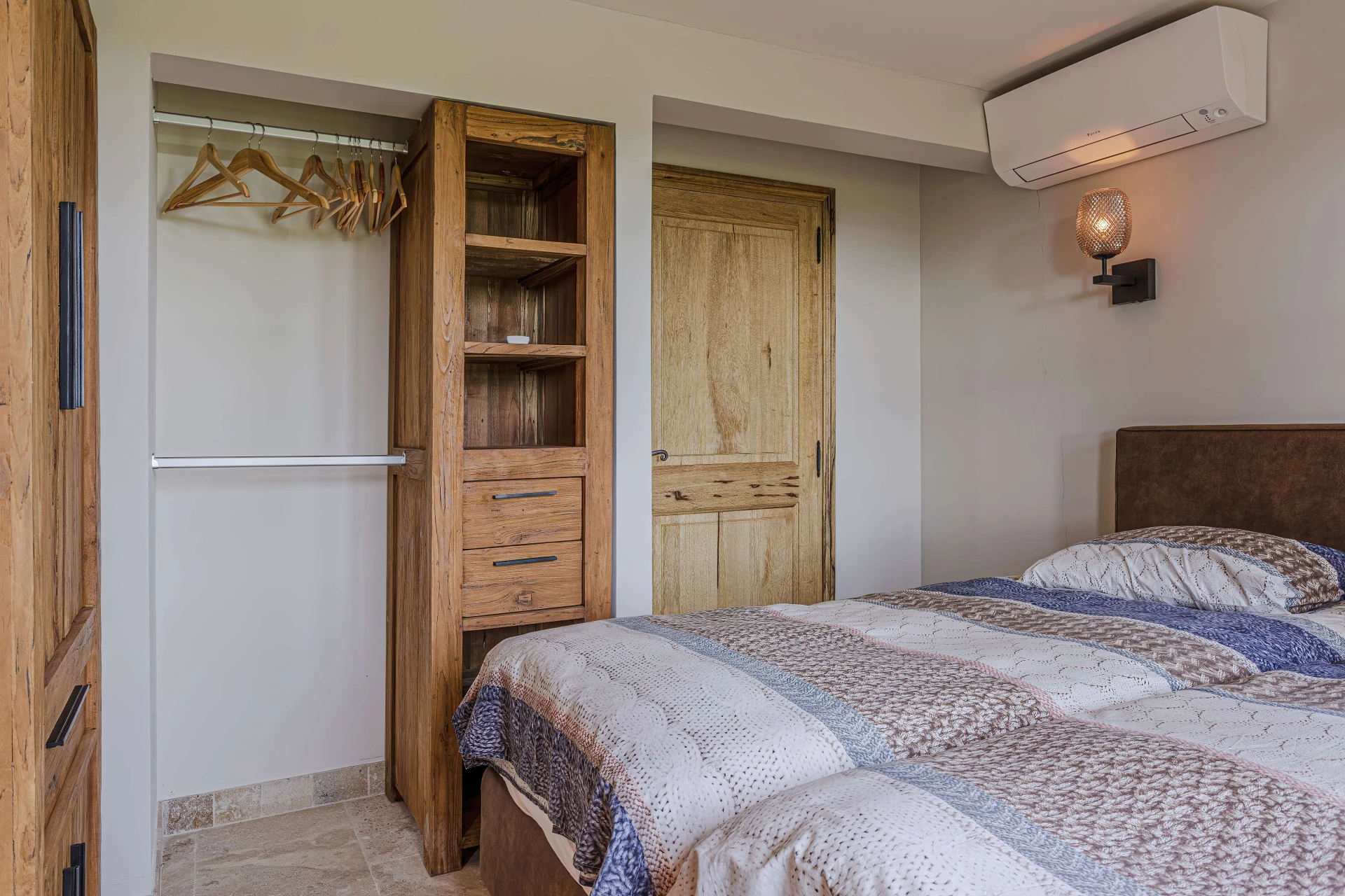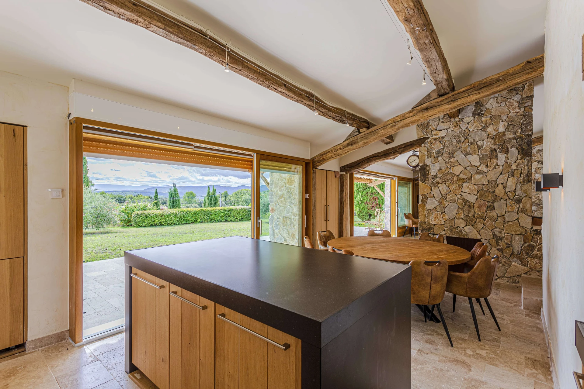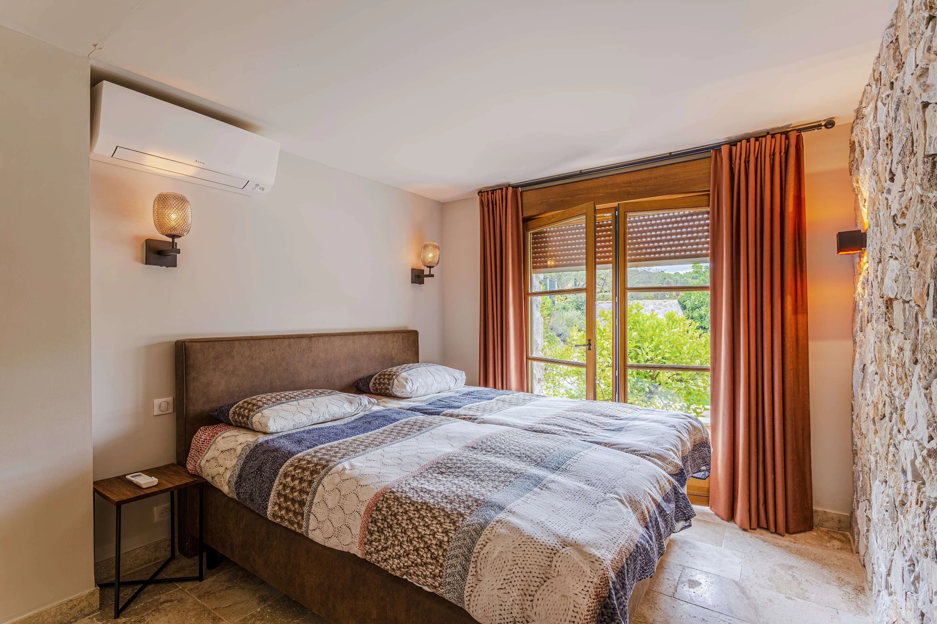 The interior has been modernly furnished while retaining authentic elements such as natural stone and beautiful wooden ceiling beams. The living room has an LCD television with Apple TV that gives access to YouTube, Netflix and all networks of all countries. At the open living room you will find the spacious dining room with kitchen. This is a beautiful space with large sliding doors to the covered terrace. There is a long wooden dining table and by extension you come to the modern equipped kitchen with gas stove with two dishwashers and two refrigerators.