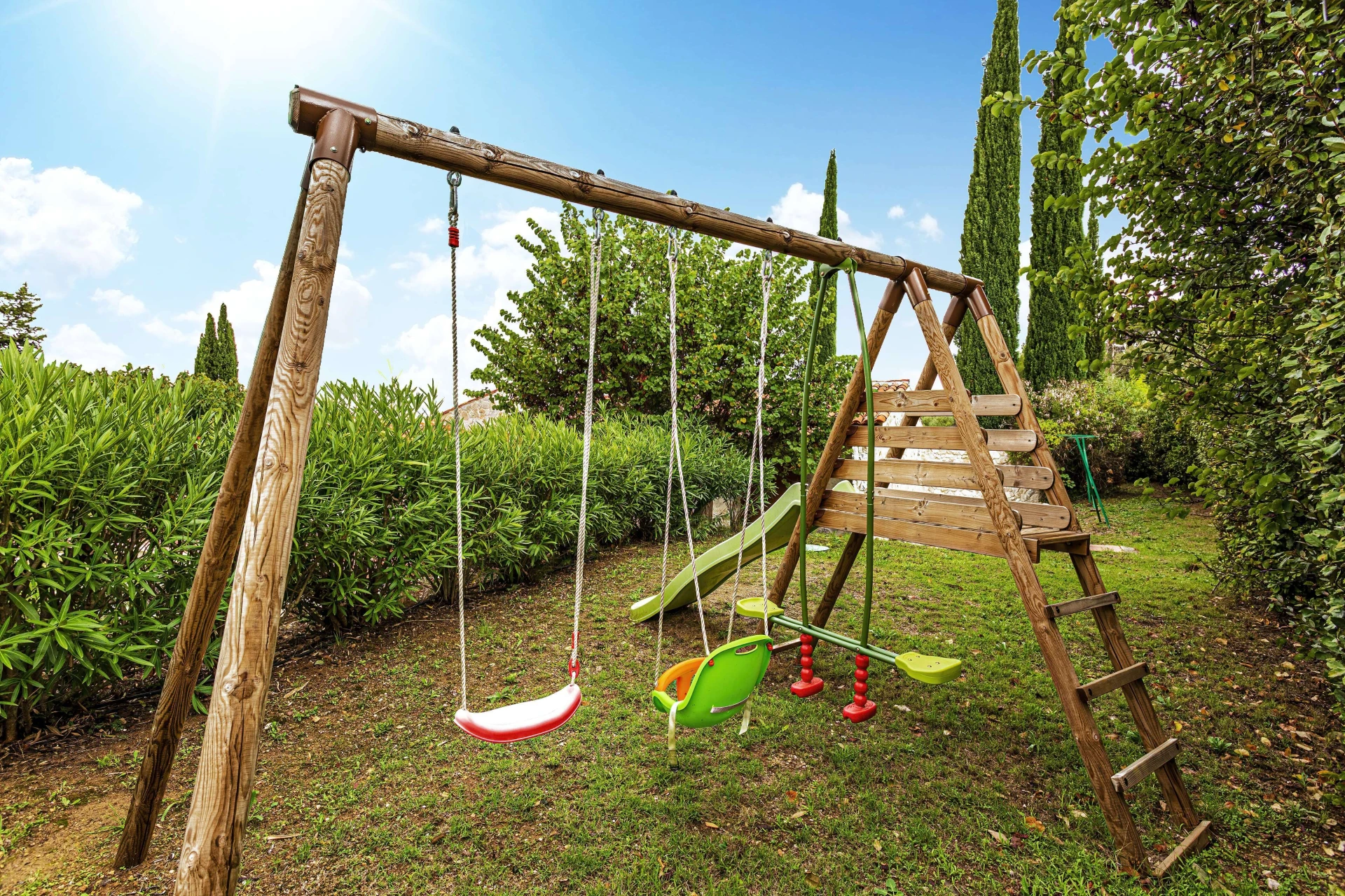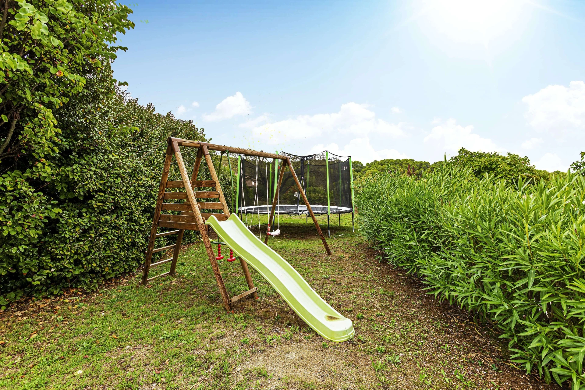 The spacious holiday home with swimming pool is situated on no less than 4000 m2 of enclosed garden (not hermetically sealed). From the garden and two large covered terraces you can enjoy a particularly beautiful view of the Massif des Maures. The large swimming pool (5x10m) has comfortable sun loungers and parasols and there is a covered terrace with a hammock to dream off. In July and August, the pool water has a wonderful temperature of its own. If desired, you can have the pool heated in the spring and autumn. In the garden there is a table tennis, a jeu de boules field, trampoline, sandpit, a slide and a beautiful lawn where the children can play.