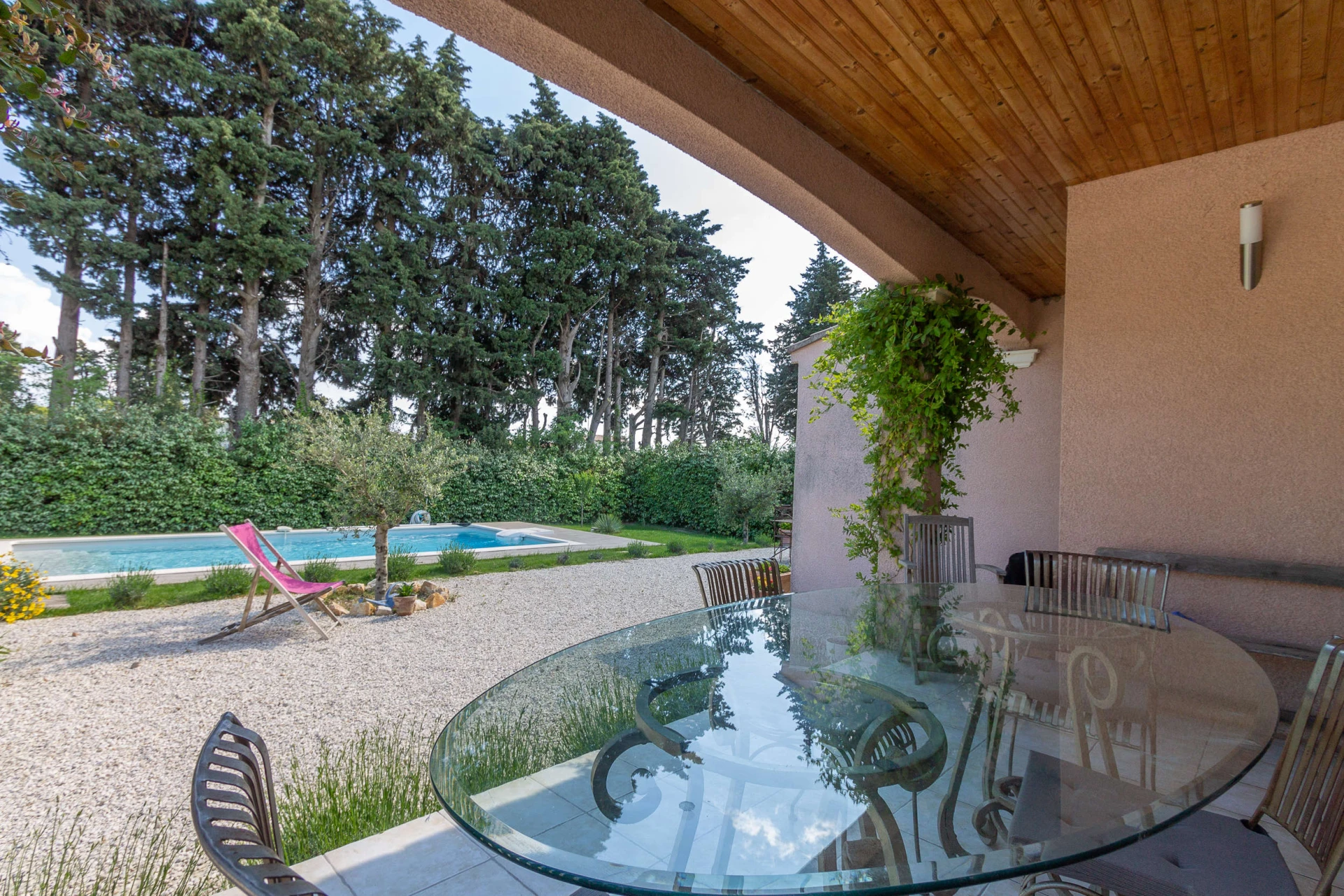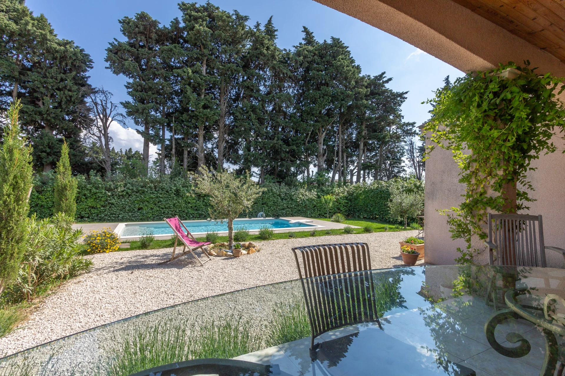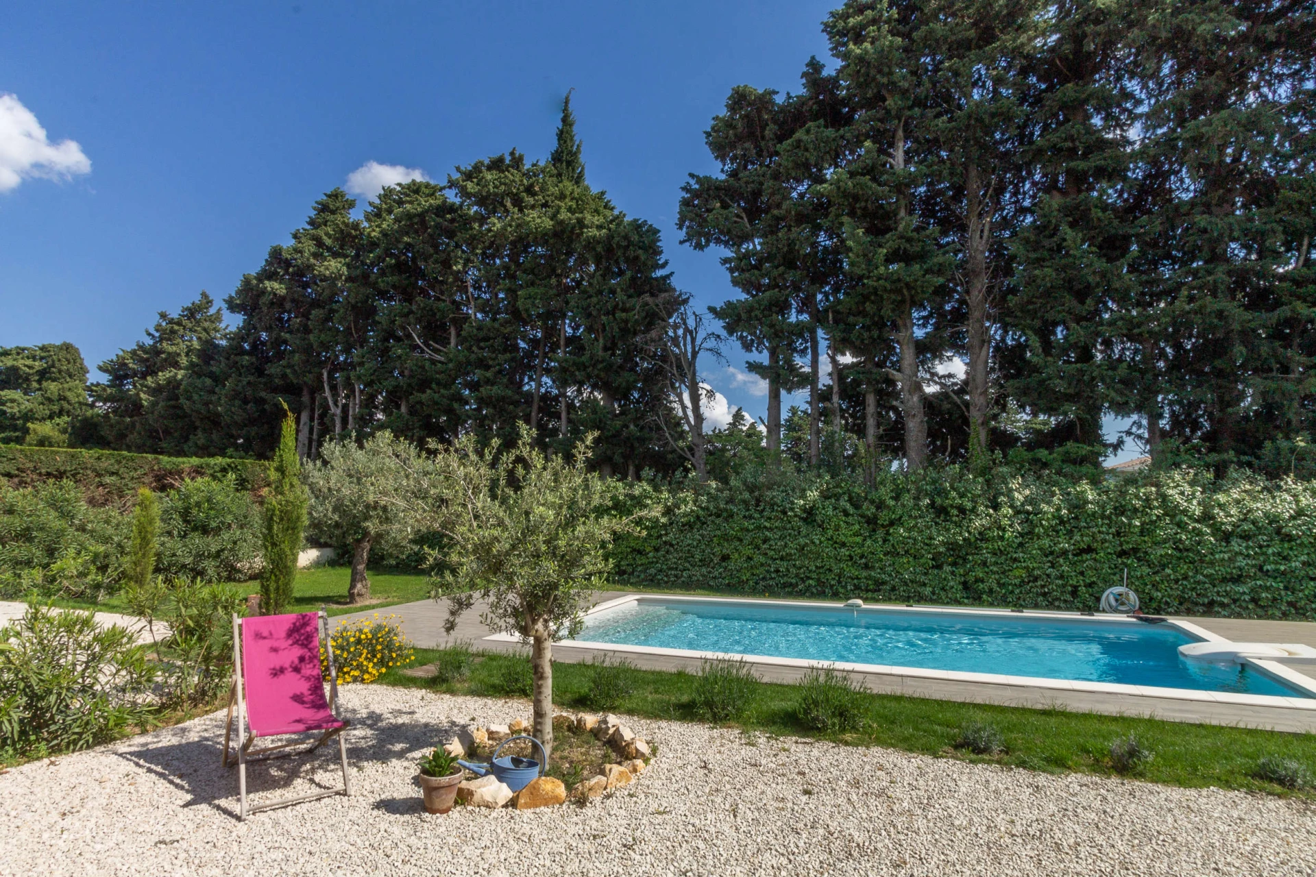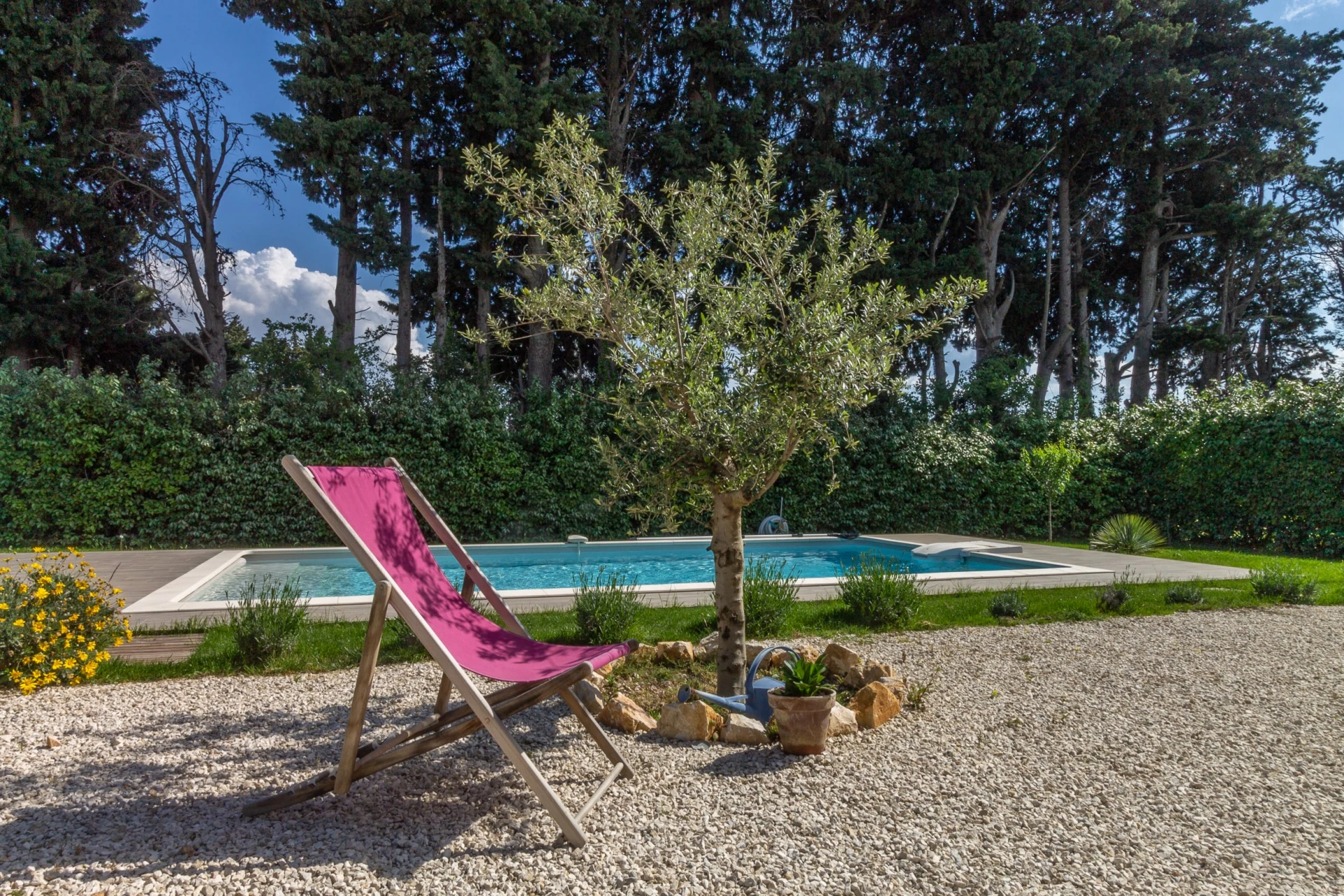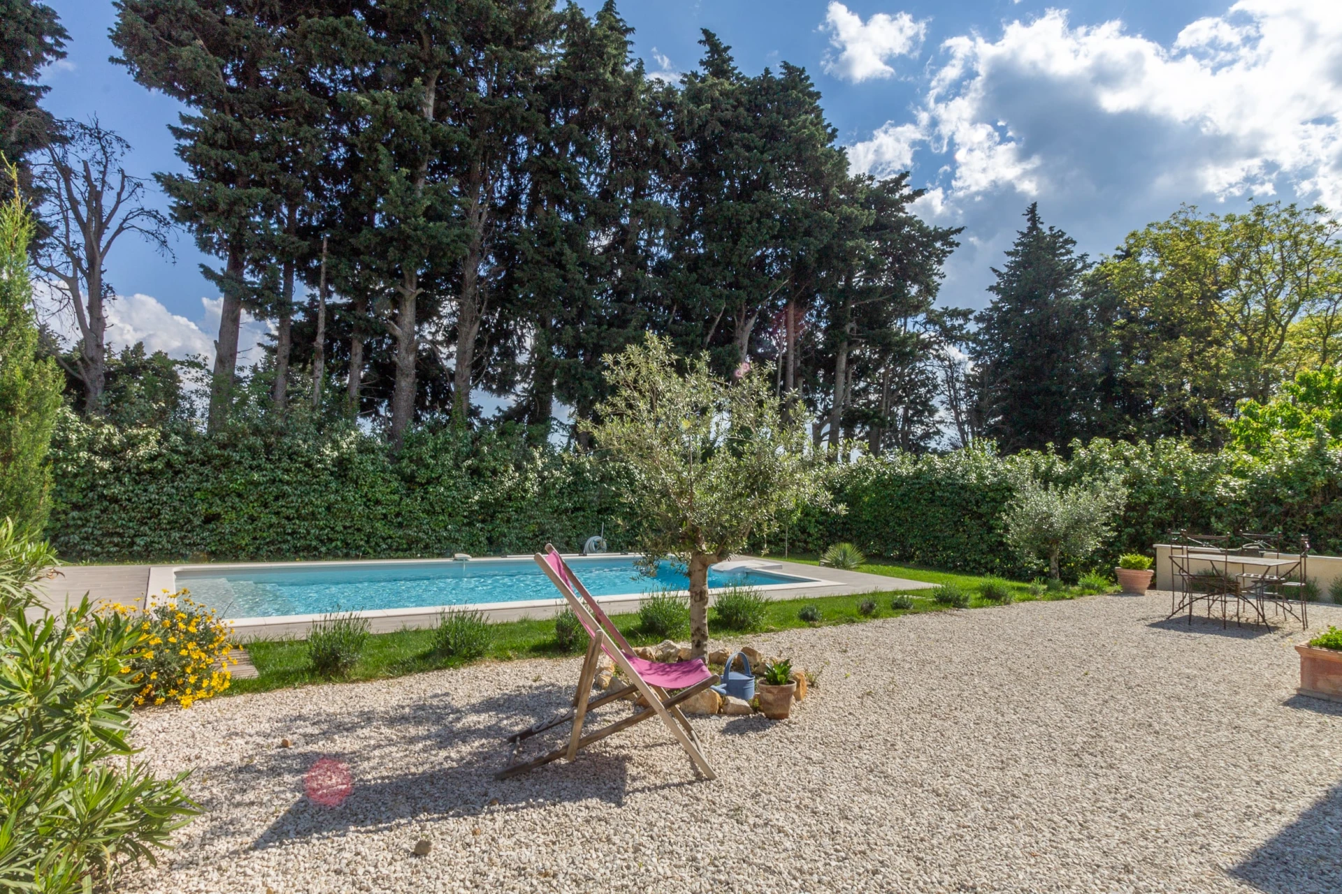 Der umliegende Garten ist sehr gepflegt und von den Terrassen aus haben Sie einen Blick auf den Garten und den zentral gelegenen privaten Swimmingpool (8x4m 1,5m tief).