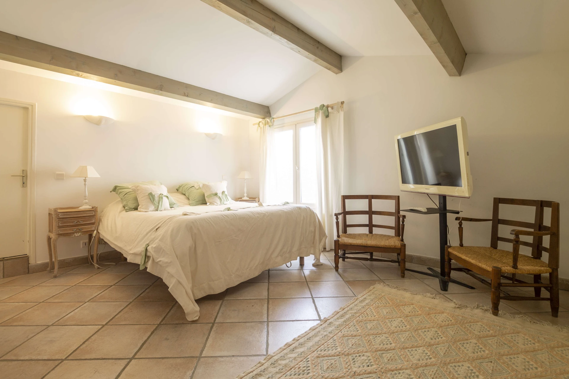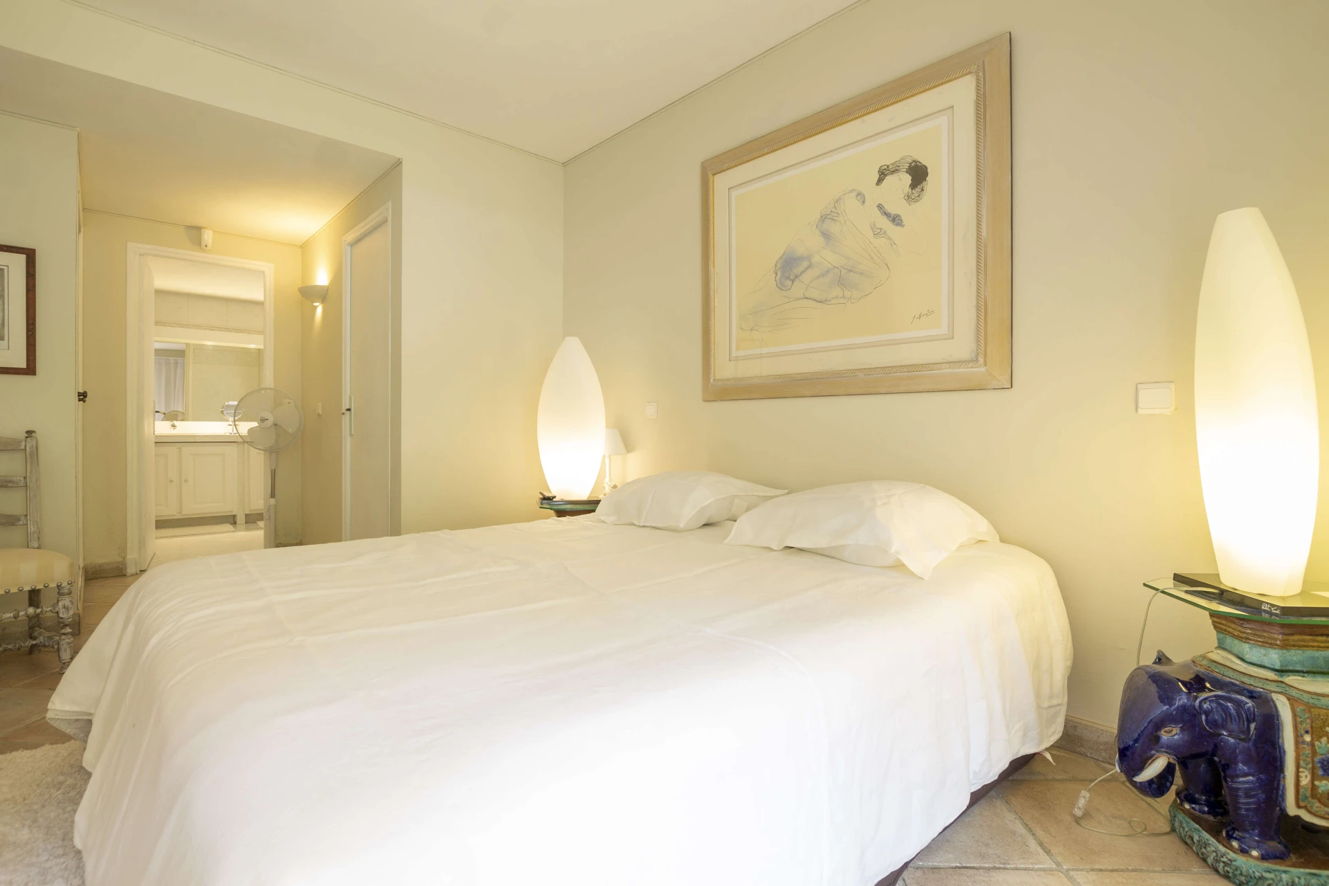 Im Erdgeschoss befinden sich die Küche, der Abstellraum, ein geräumiges Wohnzimmer mit Essbereich und 2 Schlafzimmer, jedes mit eigenem Bad und WC. Das Hauptschlafzimmer führt direkt auf die Terrasse und in den Garten. Im ersten Stock befindet sich das 3. Schlafzimmer mit Waschbecken und separatem WC. Alle Schlafzimmer verfügen über ein Doppelbett, Einbauschränke, Fliegengitter und einen Ventilator. Im Schlafzimmer unter dem Dach gibt es eine Klimaanlage.