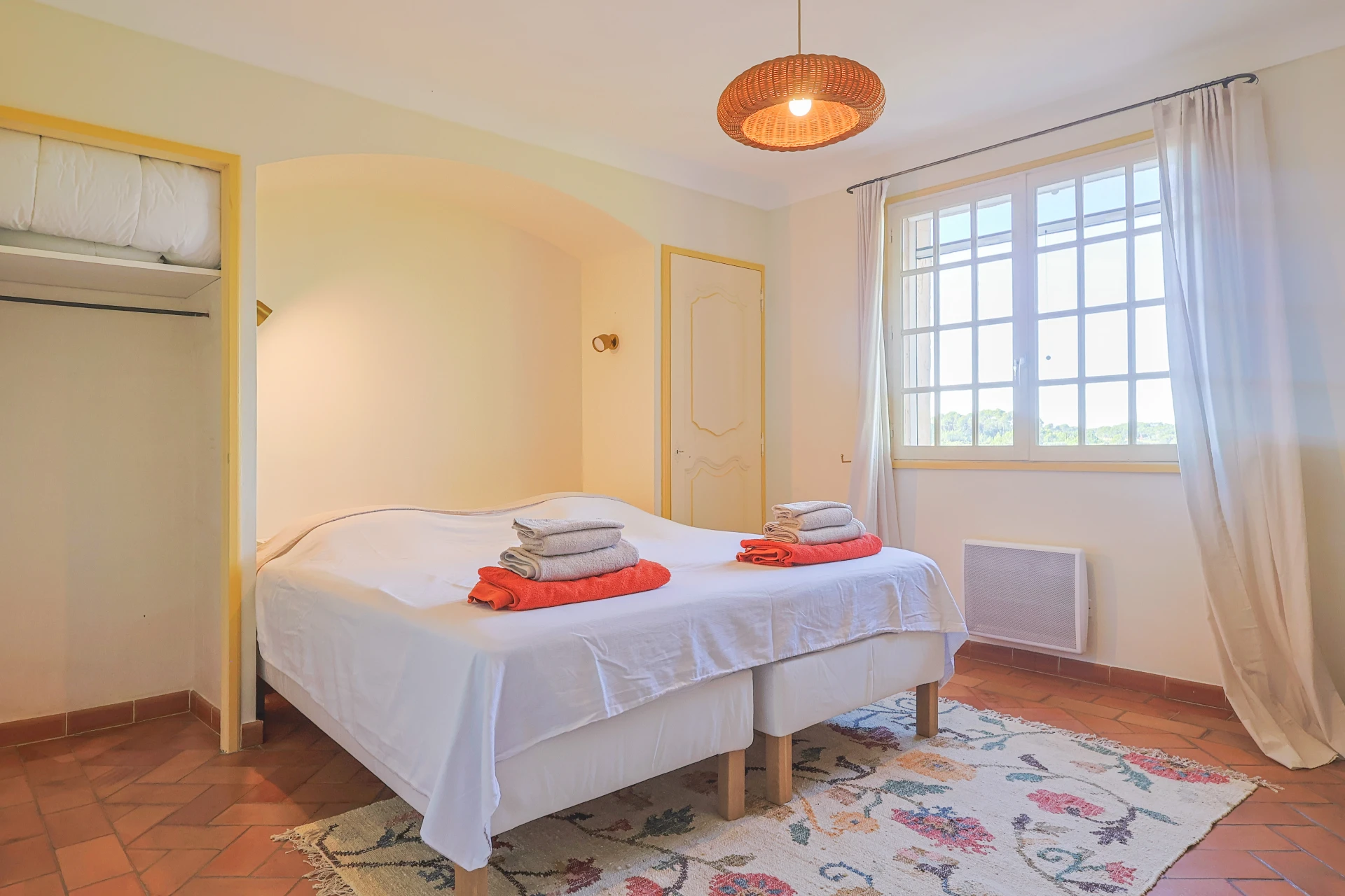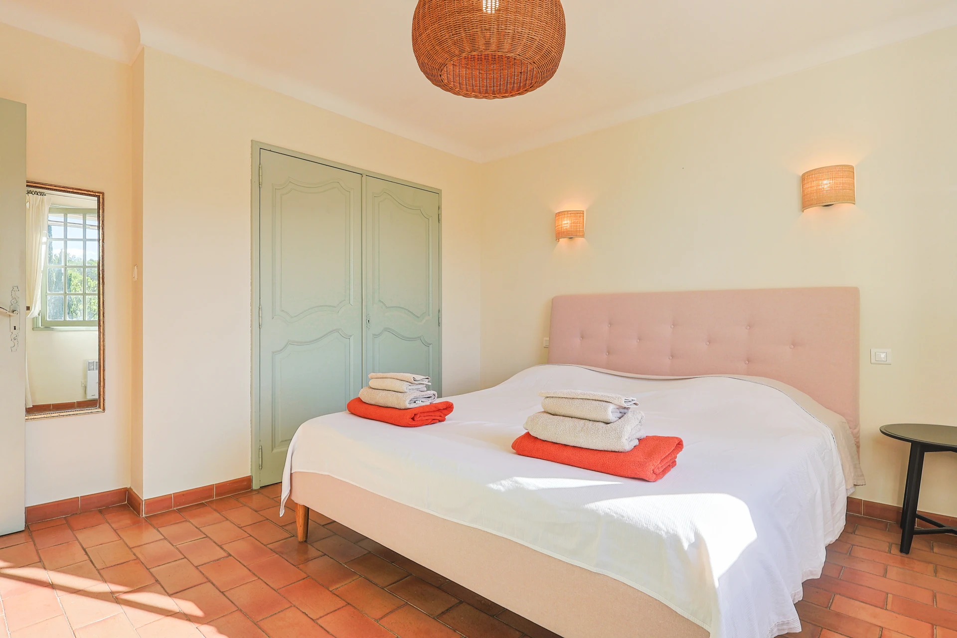 Im Obergeschoss befinden sich vier geräumige Schlafzimmer (12-17 m²), von denen zwei über ein eigenes Waschbecken verfügen. Jedes Zimmer bietet einen malerischen Blick auf die umliegende Landschaft. Außerdem finden Sie hier ein luxuriöses Badezimmer mit Doppelwaschbecken, Badewanne und Bidet, ein zweites Badezimmer mit Dusche und eine separate Toilette.