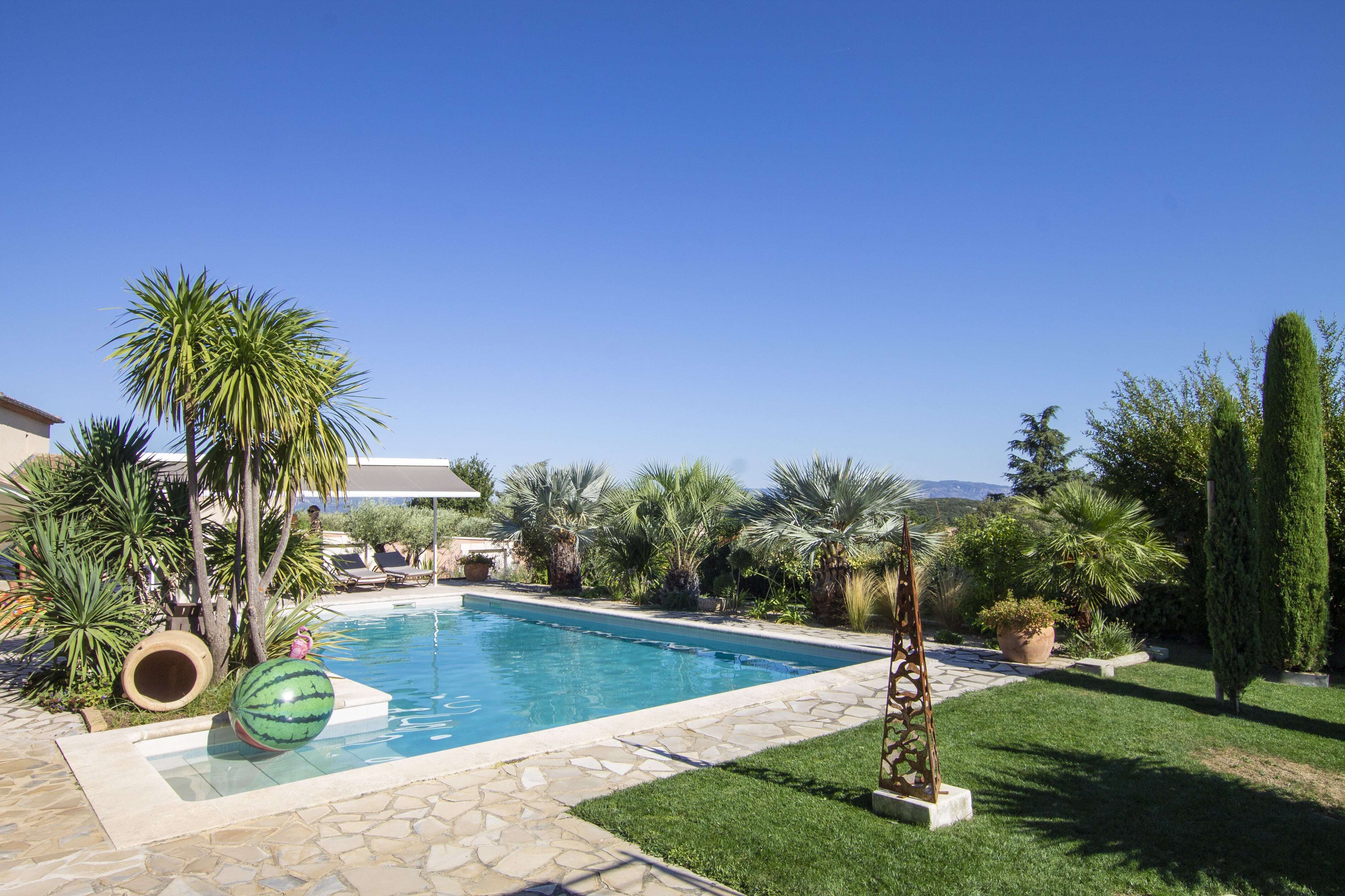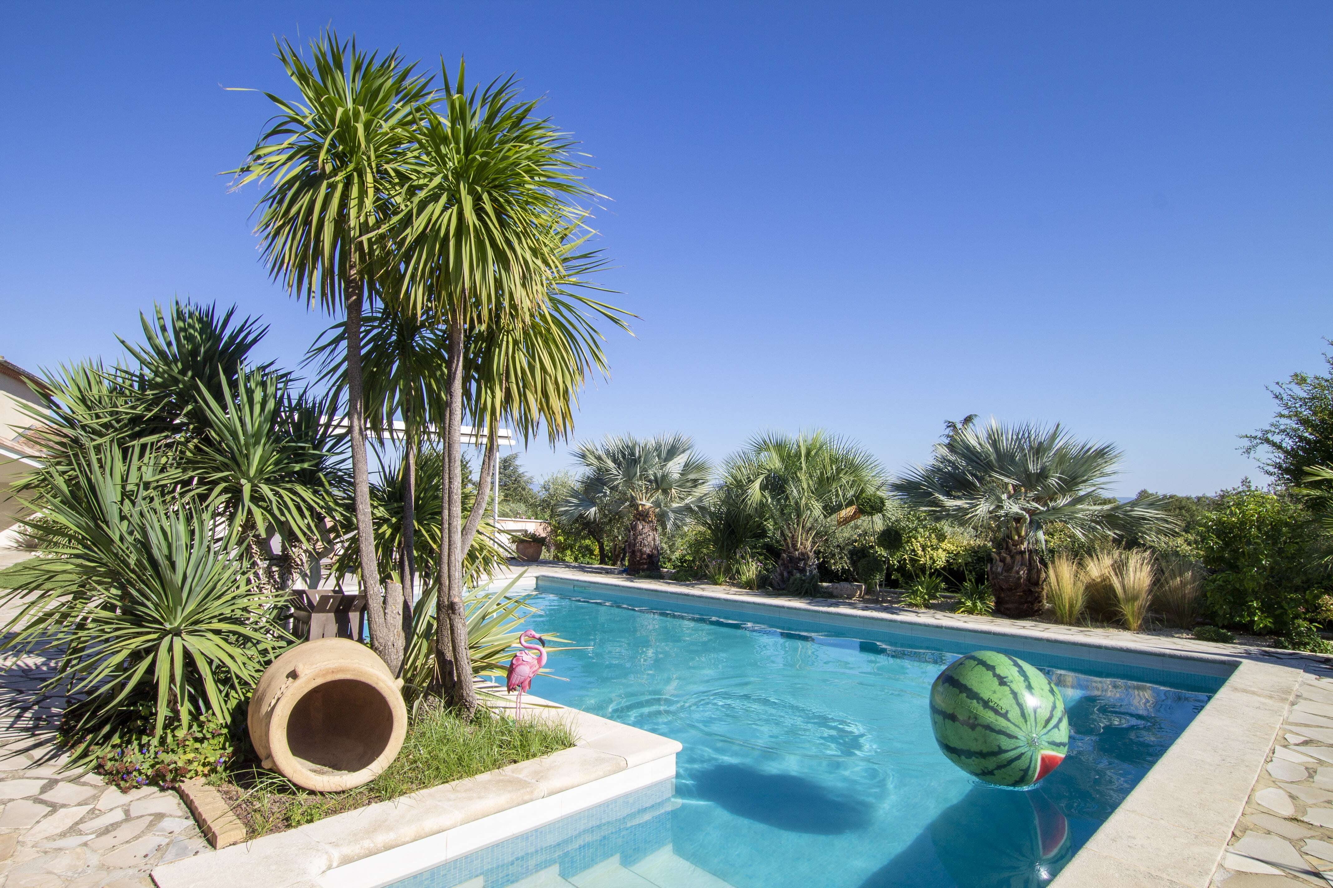 A large gate opens onto the house with its big swimming pool with Roman steps, a delightful well-tended garden with many palm trees and a well needed terrace.