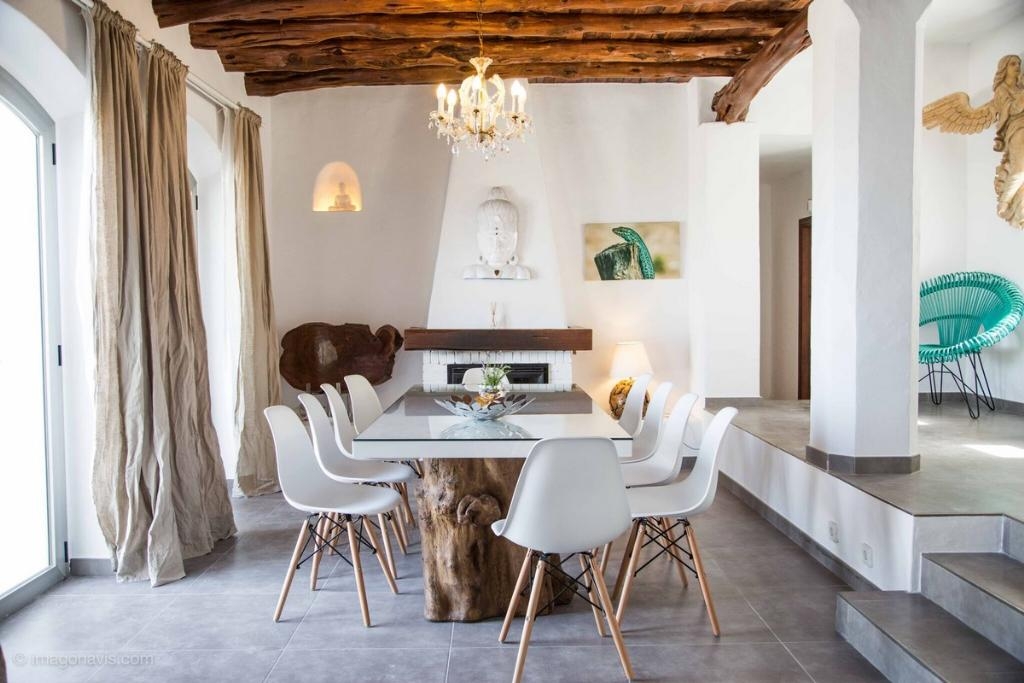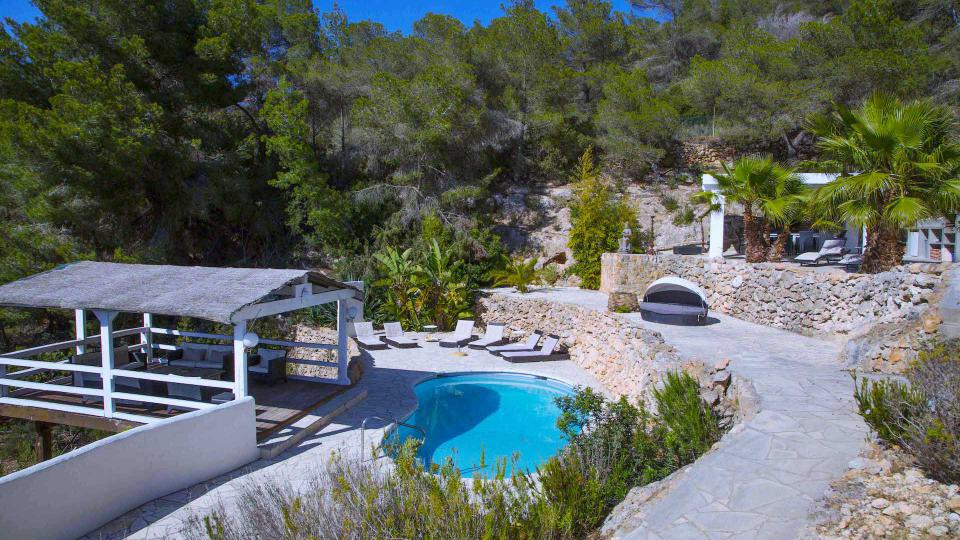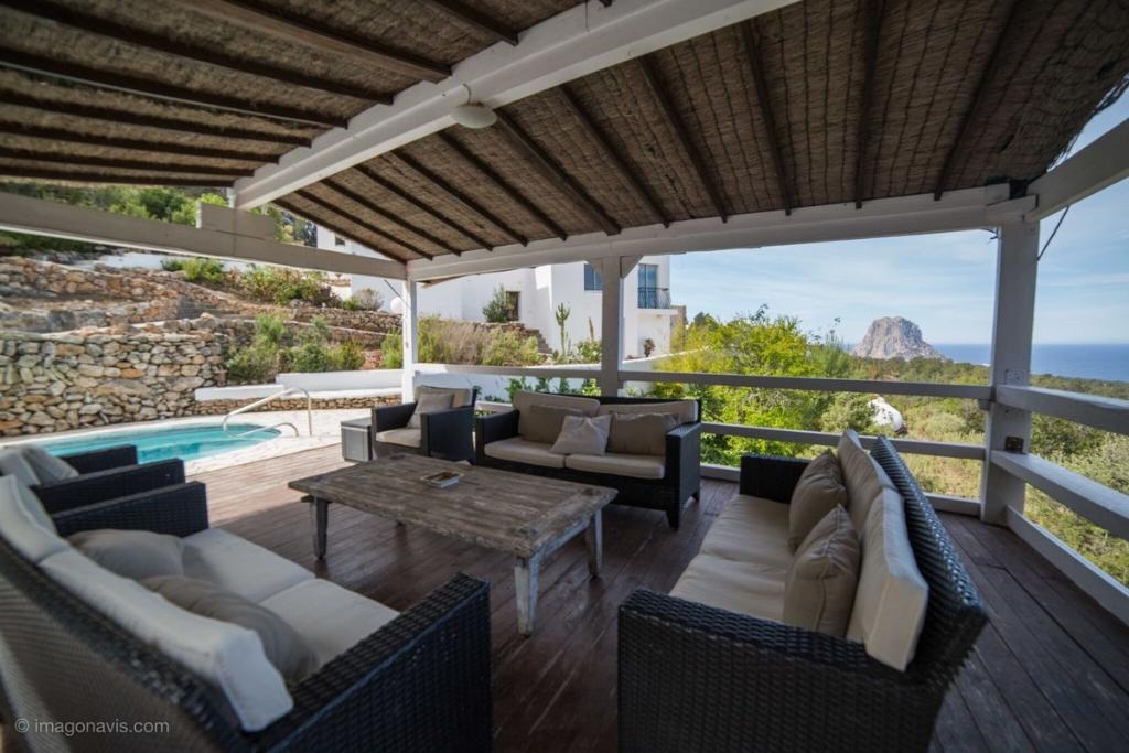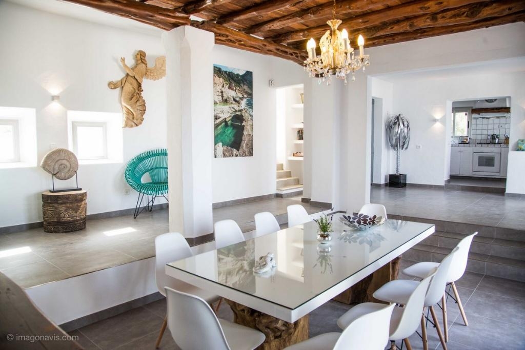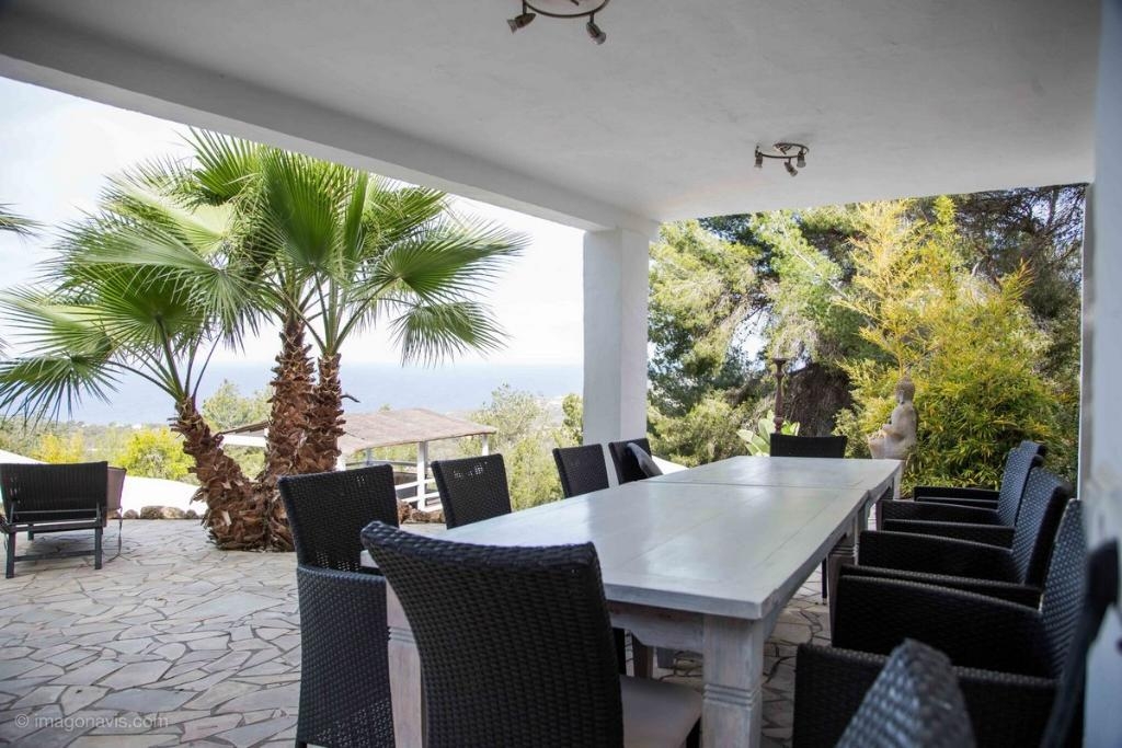Exterior The finca is set amidst the natural beauty of Ibiza, offering panoramic views of the sea, the west coast of the island, and the iconic Es Vedra. The private pool (5x9m) is surrounded by expansive terraces, furnished with ample garden furniture, allowing guests to relax while soaking in the beautiful surroundings. An outdoor shower adds extra comfort, and as the evening sets in, cozy lighting creates a warm atmosphere. The barbecue area is ideal for enjoying perfect summer nights with loved ones.