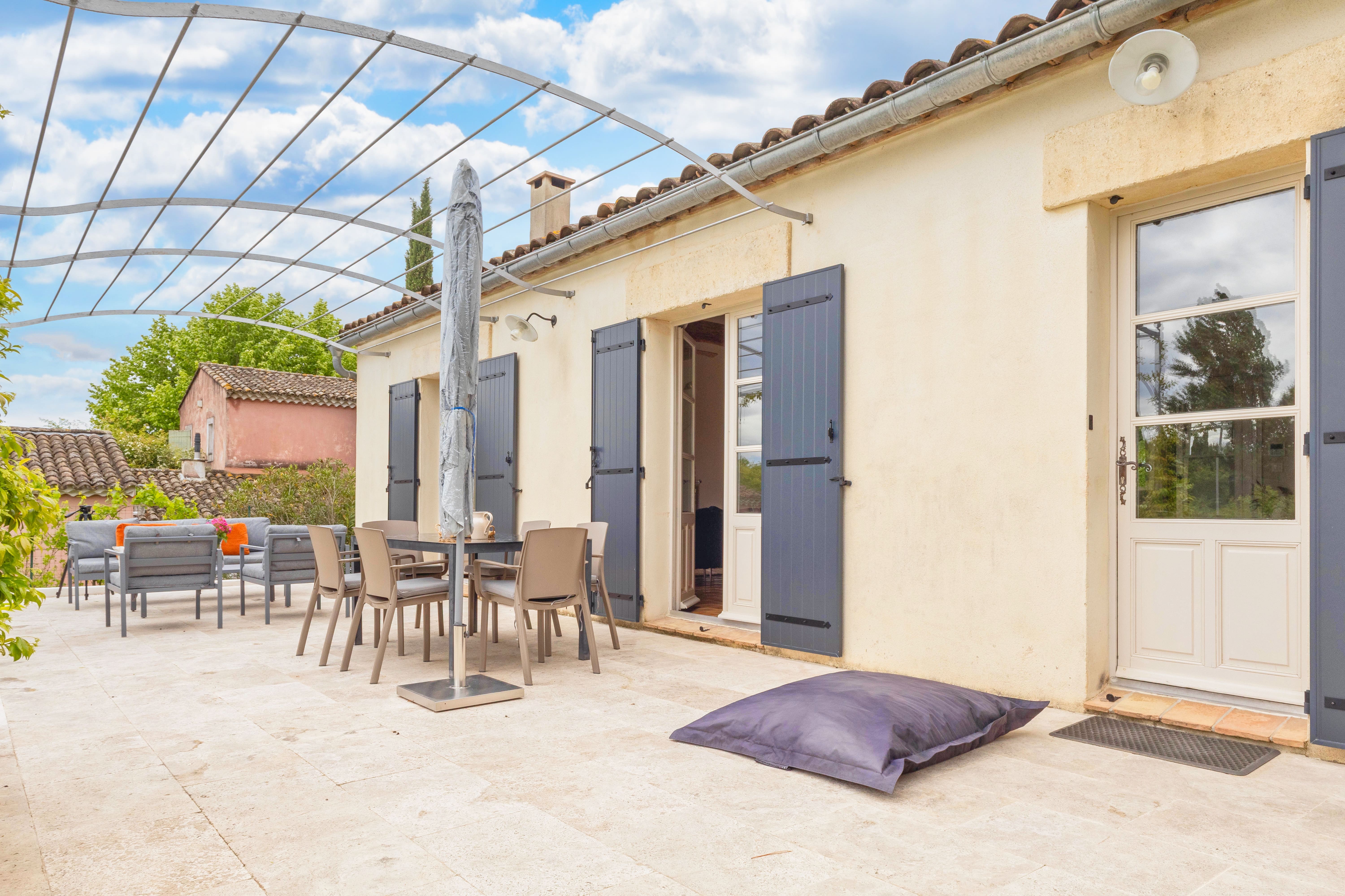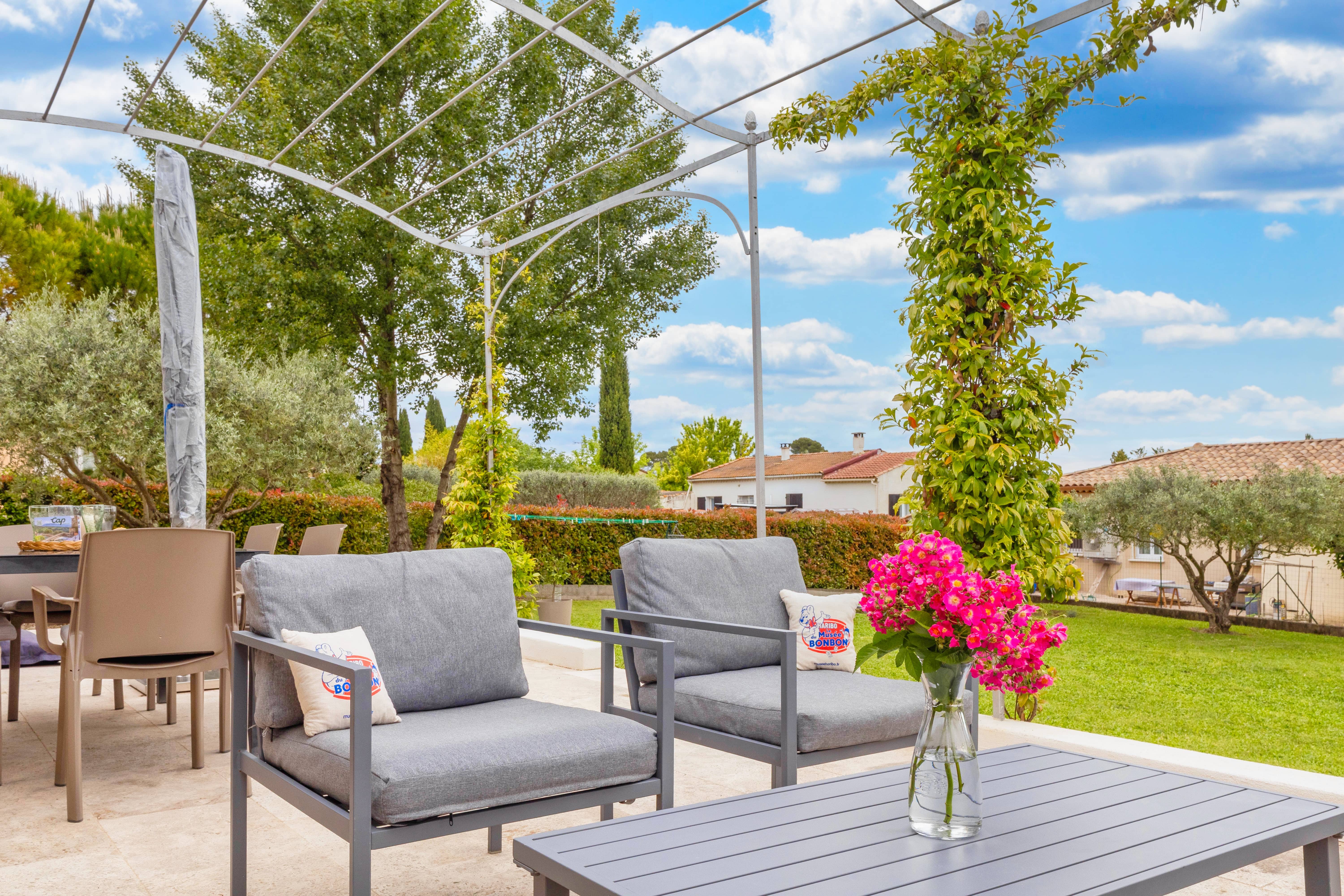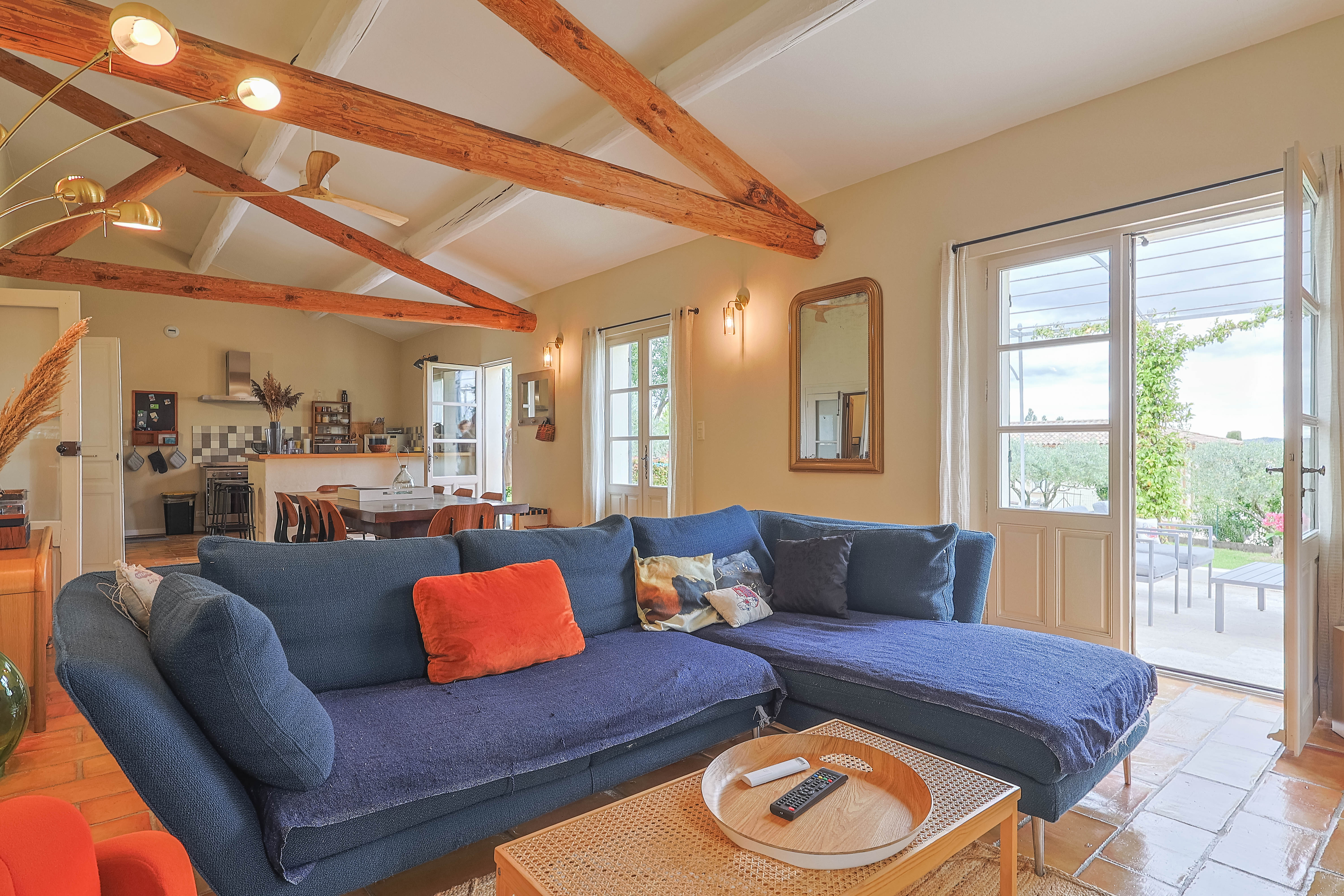 Exterieur: Natur und Entspannung Sobald Sie nach draußen treten, erwartet Sie eine großzügige, sonnige Terrasse von 40 m², ausgestattet mit bequemen Gartenmöbeln – perfekt, um sich in der Sonne oder im Schatten unter der Überdachung zu entspannen. Das 1.200 m² große Grundstück bietet eine ruhige, natürliche Umgebung, typisch für die Region. Dank des mediterranen Klimas spielt sich das Leben hier größtenteils im Freien ab. Obwohl das Haus keinen privaten Pool besitzt, befindet sich nur 200 Meter entfernt ein Hotel-Restaurant, in dem Sie Tagesliegen mieten können, um den großen Pool zu genießen.