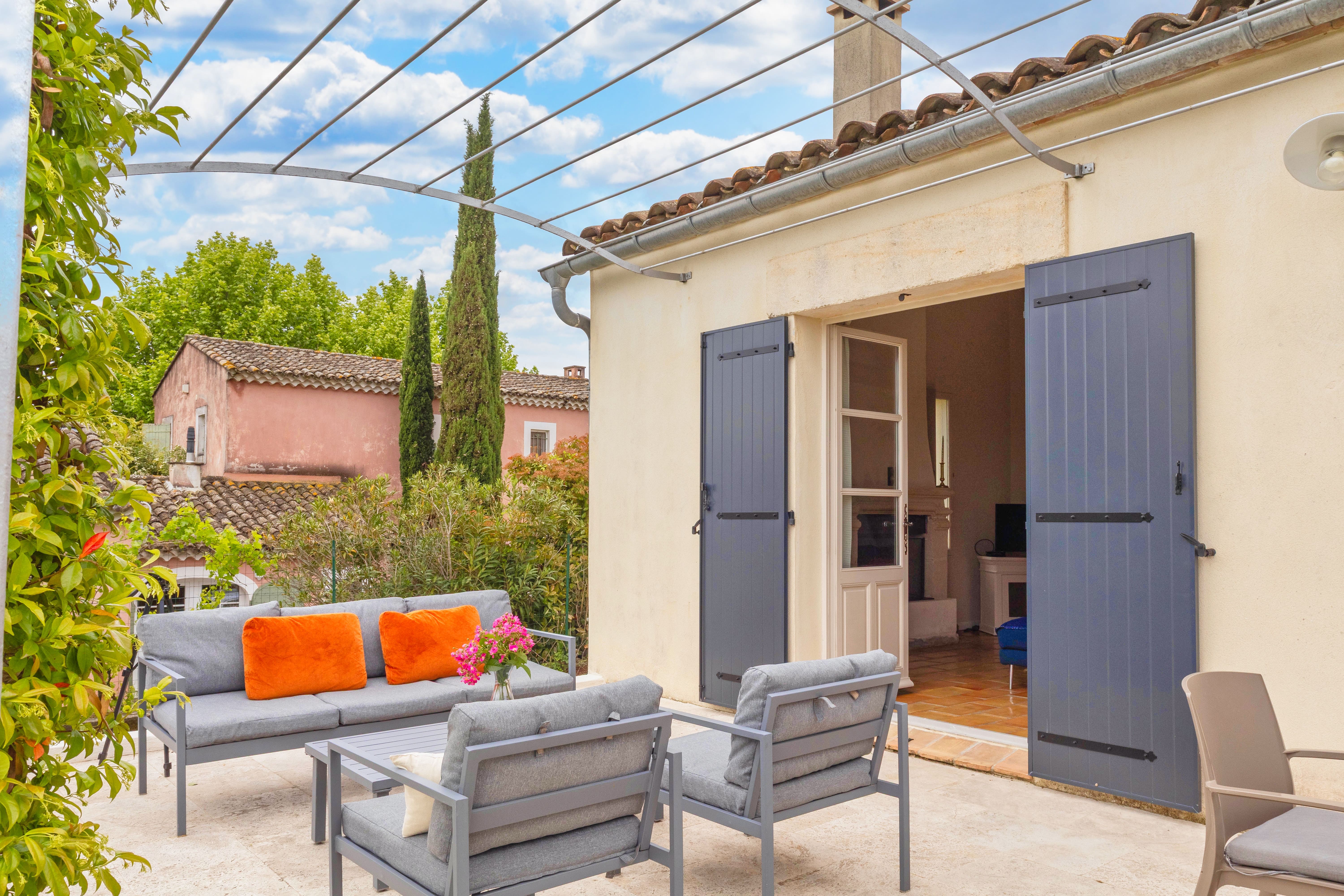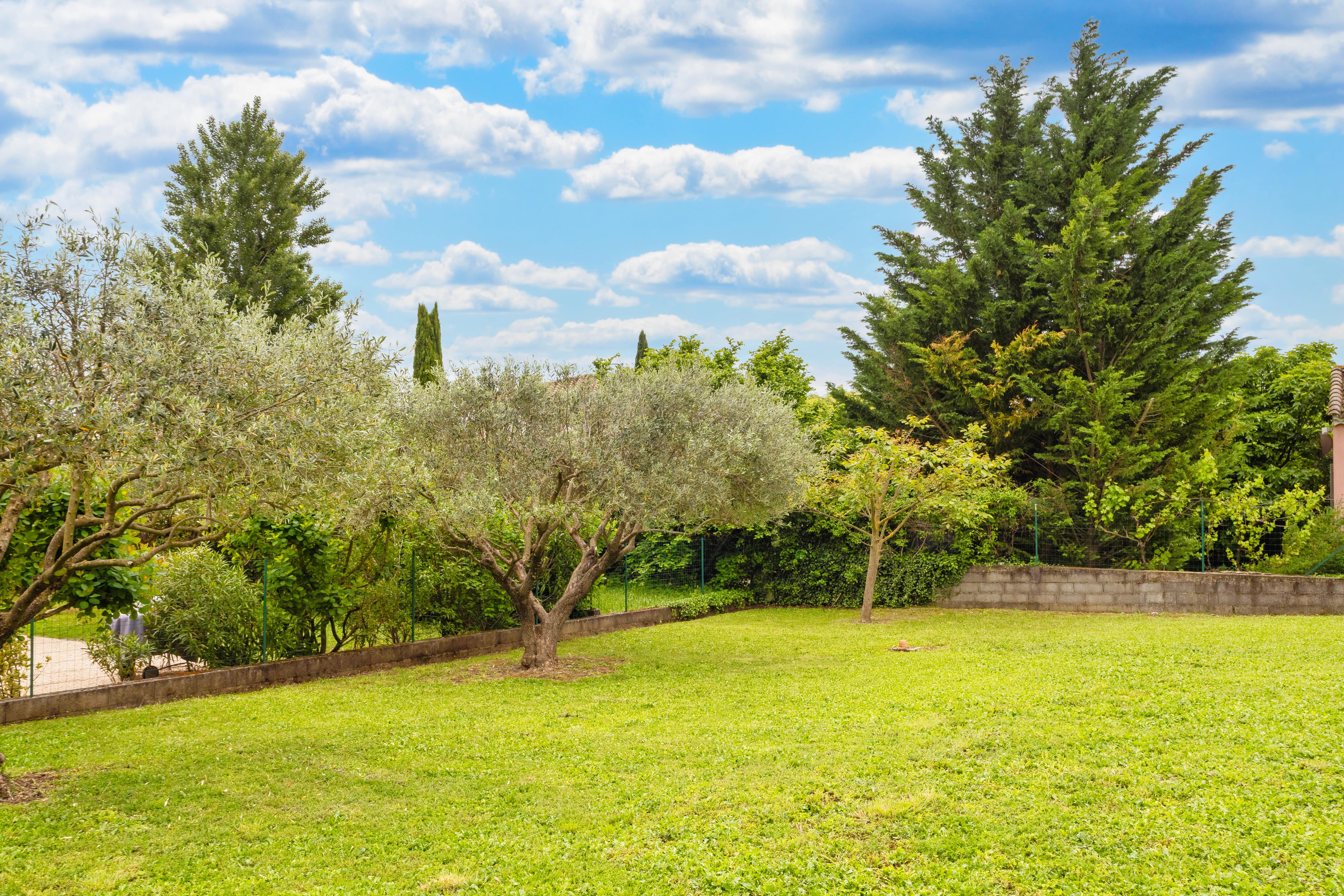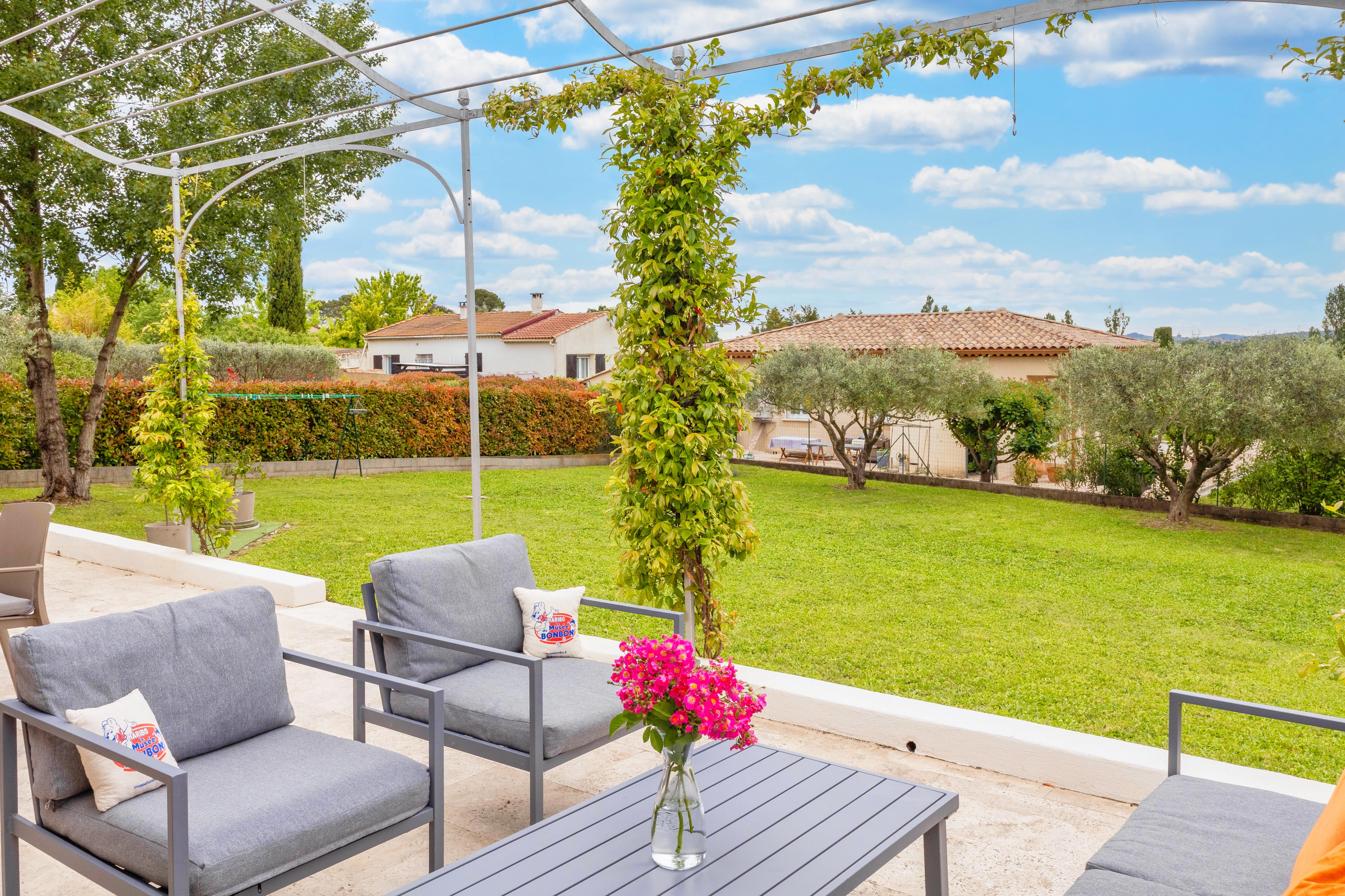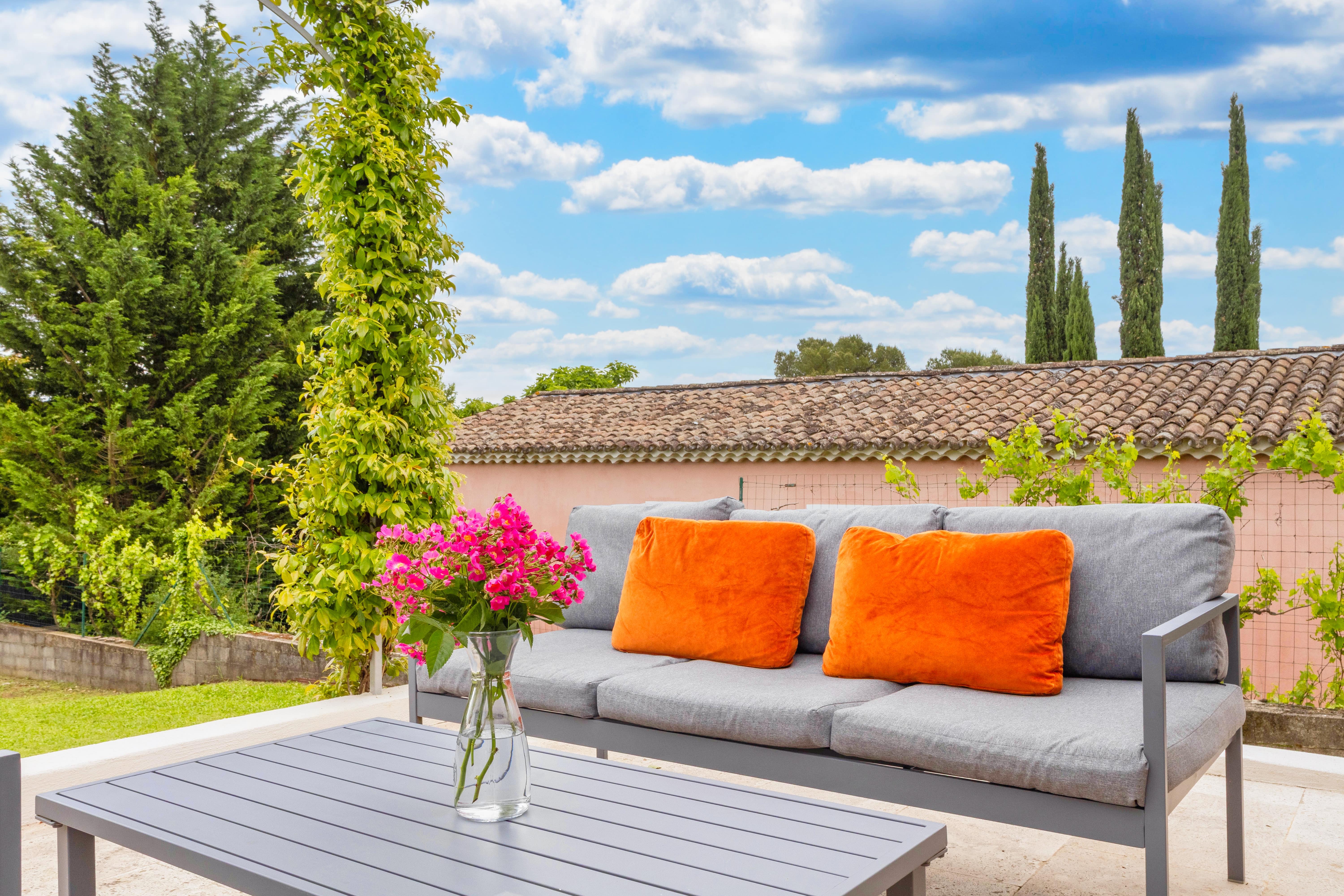 Exterieur: Natur und Entspannung Sobald Sie nach draußen treten, erwartet Sie eine großzügige, sonnige Terrasse von 40 m², ausgestattet mit bequemen Gartenmöbeln – perfekt, um sich in der Sonne oder im Schatten unter der Überdachung zu entspannen. Das 1.200 m² große Grundstück bietet eine ruhige, natürliche Umgebung, typisch für die Region. Dank des mediterranen Klimas spielt sich das Leben hier größtenteils im Freien ab. Obwohl das Haus keinen privaten Pool besitzt, befindet sich nur 200 Meter entfernt ein Hotel-Restaurant, in dem Sie Tagesliegen mieten können, um den großen Pool zu genießen.