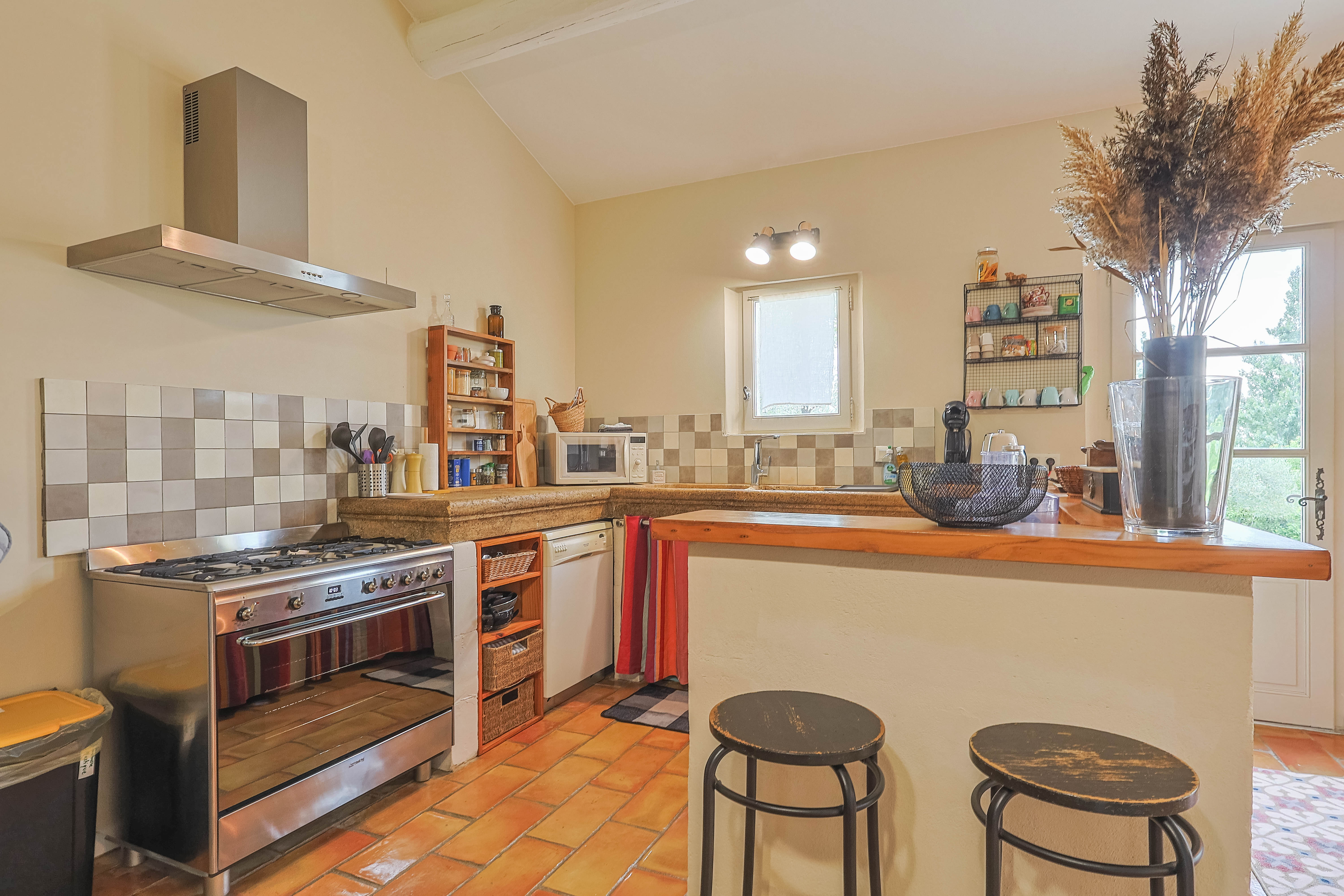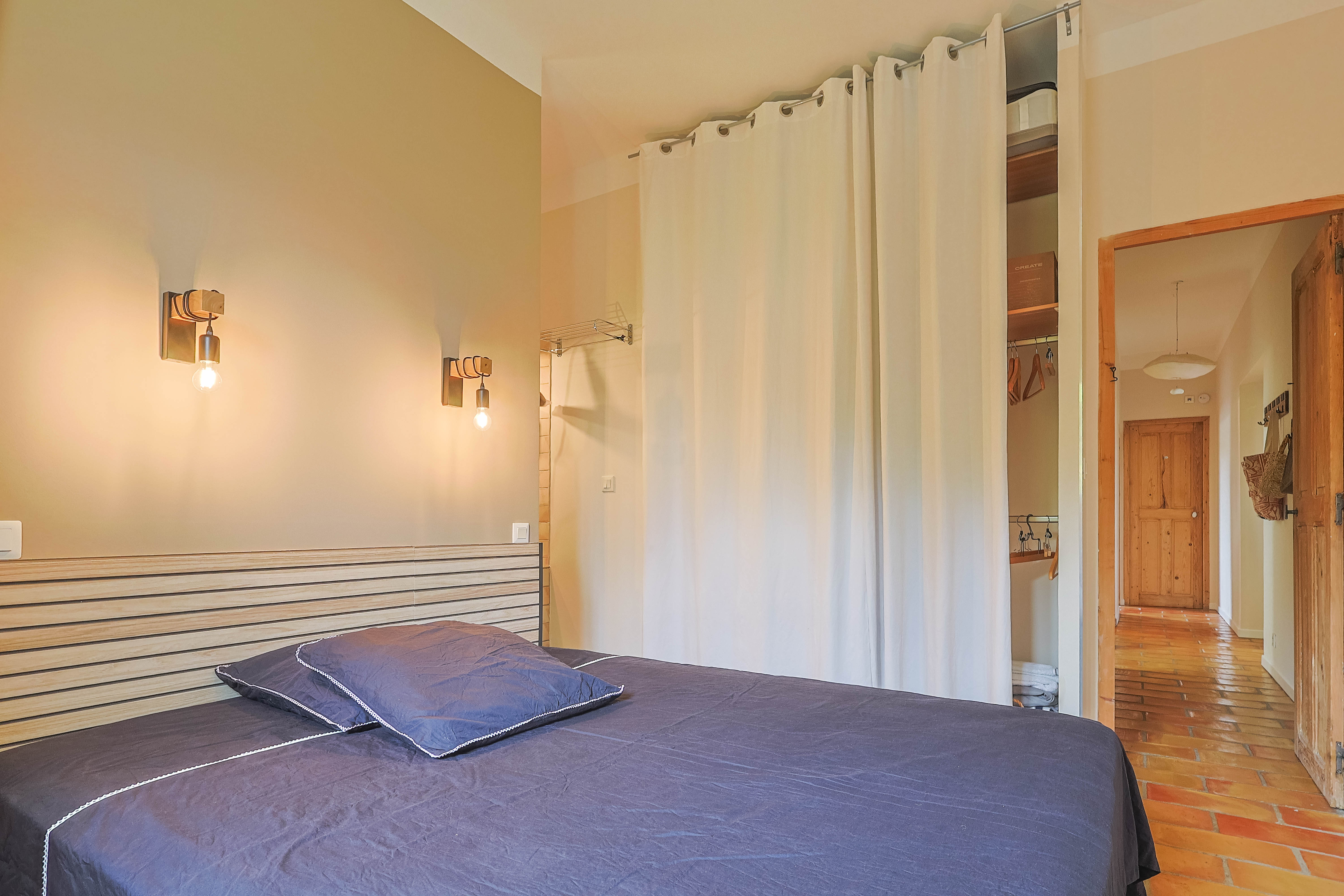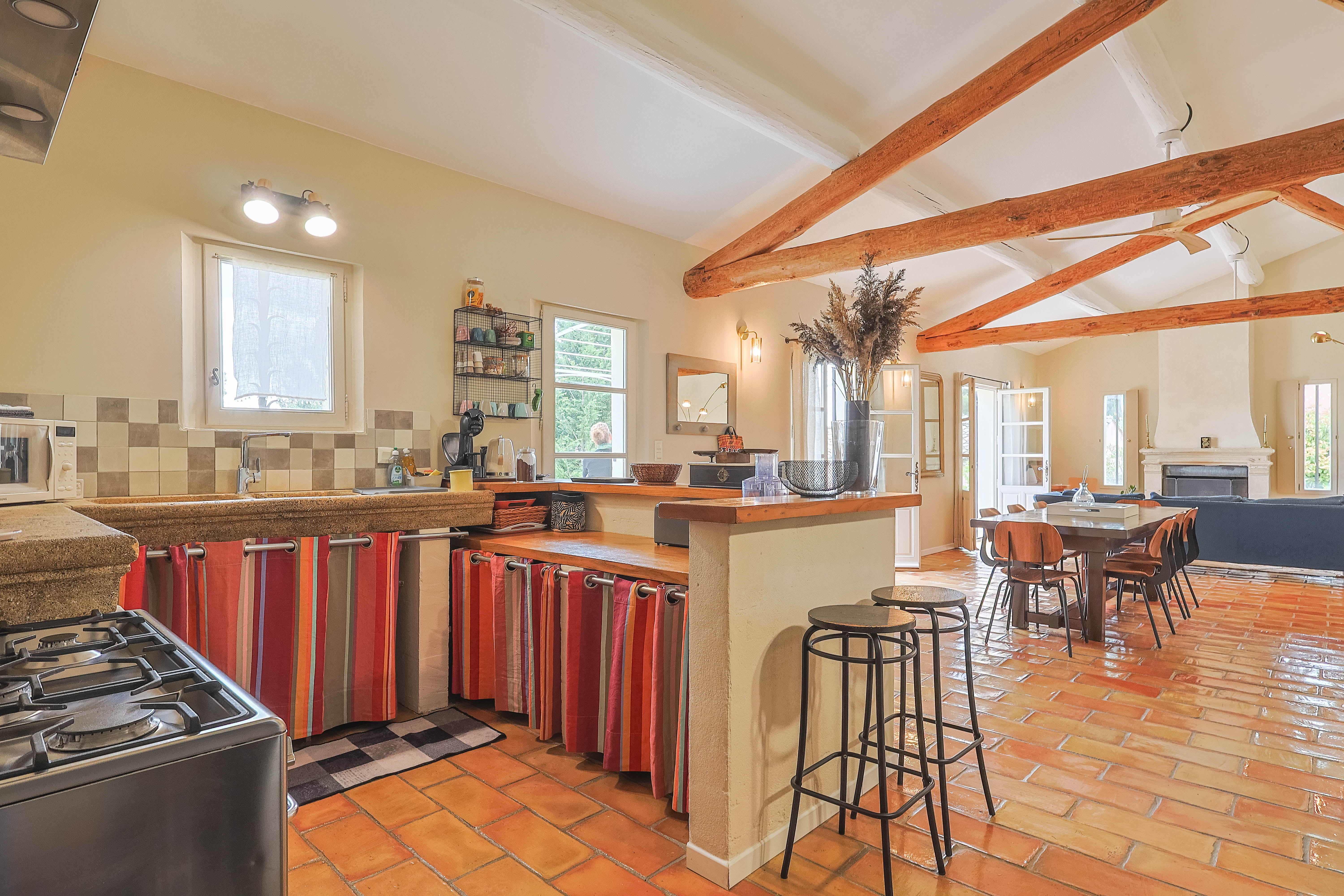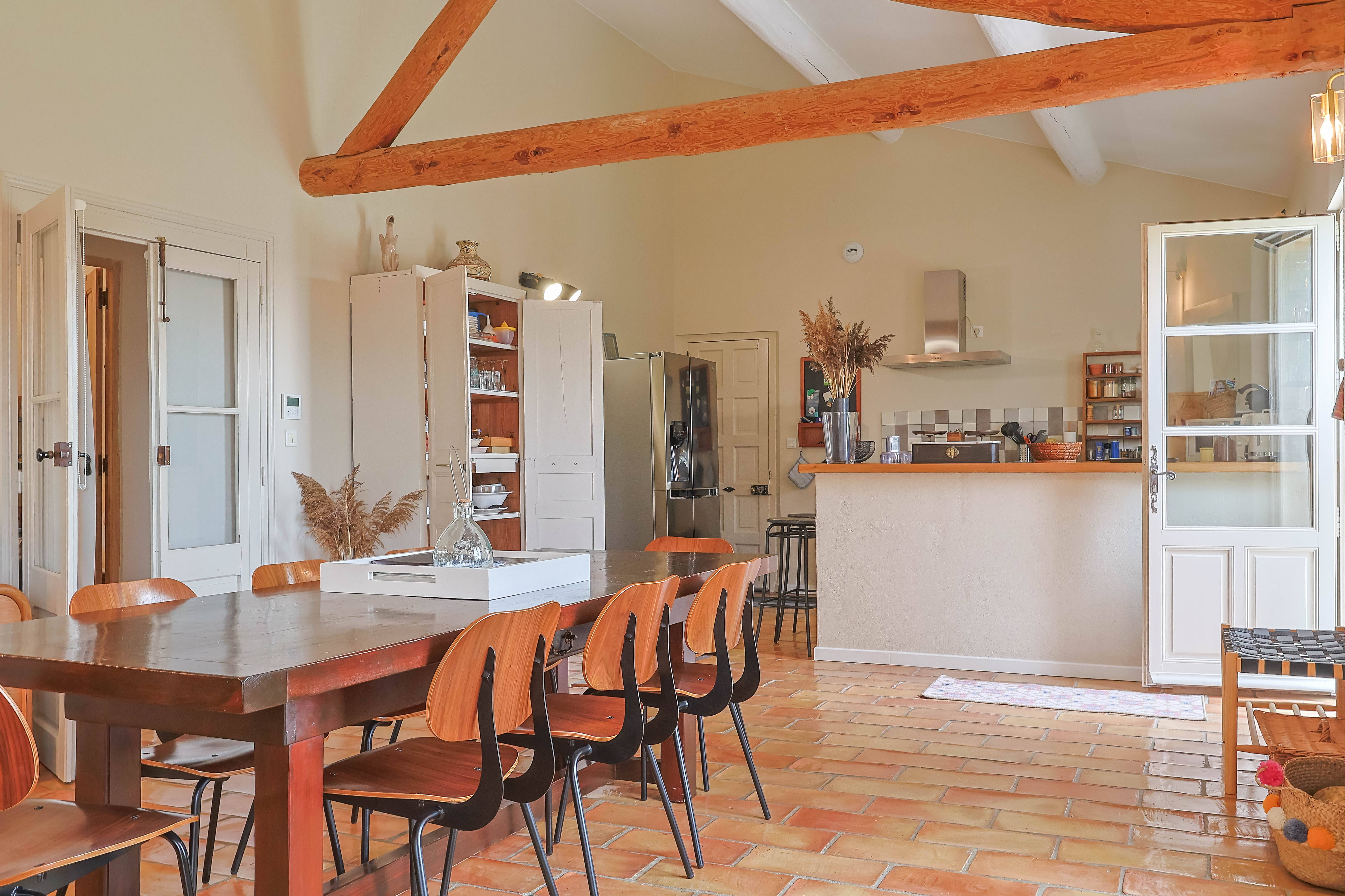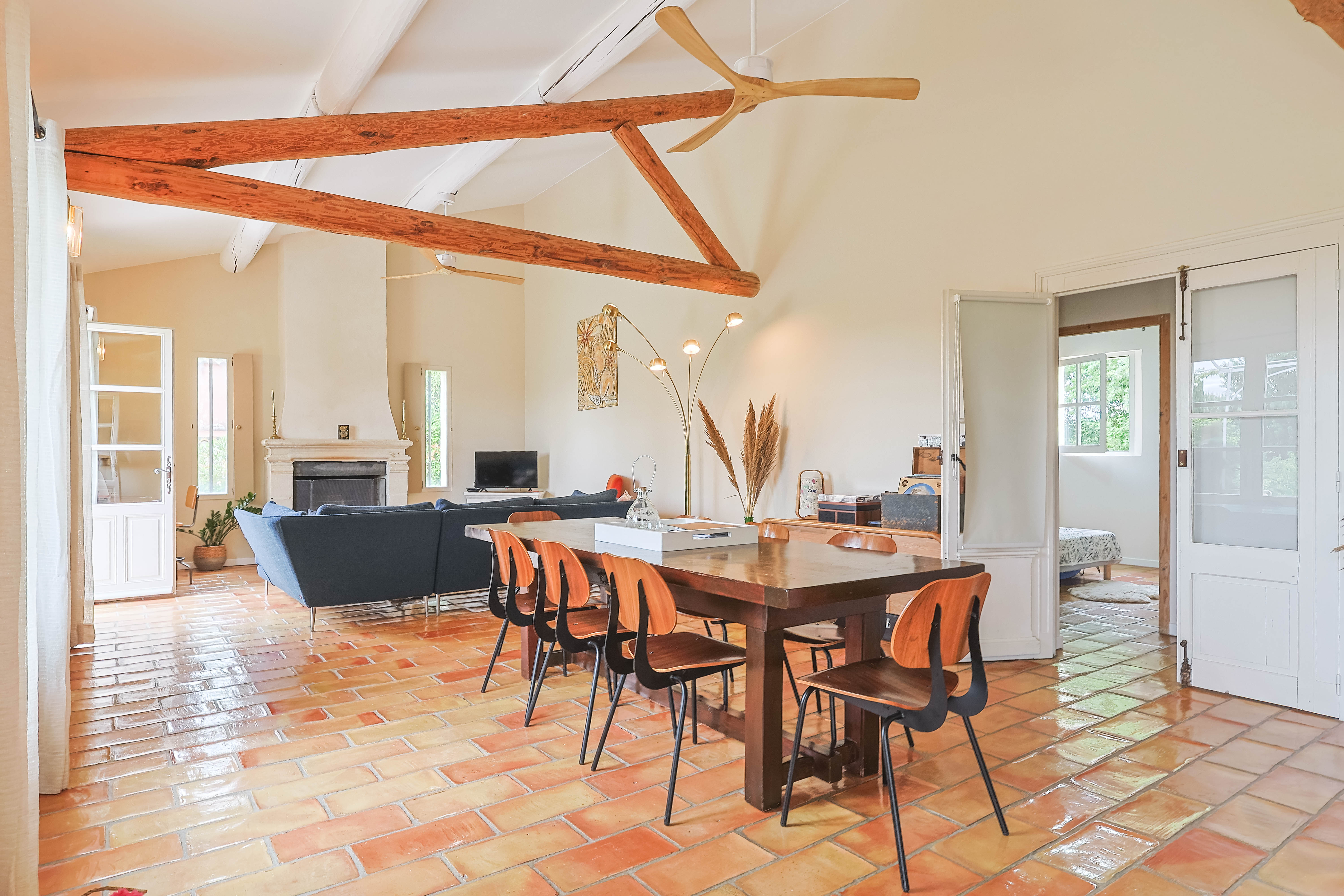 Interieur: Sehr schöner Vintage-Stil Dieses Ferienhaus im Süden Frankreichs verfügt über drei komfortable Schlafzimmer, darunter ein Master-Bedroom mit eigener Dusche. Außerdem gibt es ein zweites Badezimmer, das von den anderen beiden Schlafzimmern geteilt wird. Der Wohnbereich besteht aus einem gemütlichen Wohnzimmer, einem großen Esstisch und einer offenen, voll ausgestatteten Küche. Das Haus wurde mit authentischem Naturstein gebaut und besitzt wunderschöne Holzbalken, die für typisch provenzalischen Charme und eine warme Atmosphäre sorgen. Zudem hält der kühle Steinboden das Haus auch an heißen Sommertagen angenehm frisch.