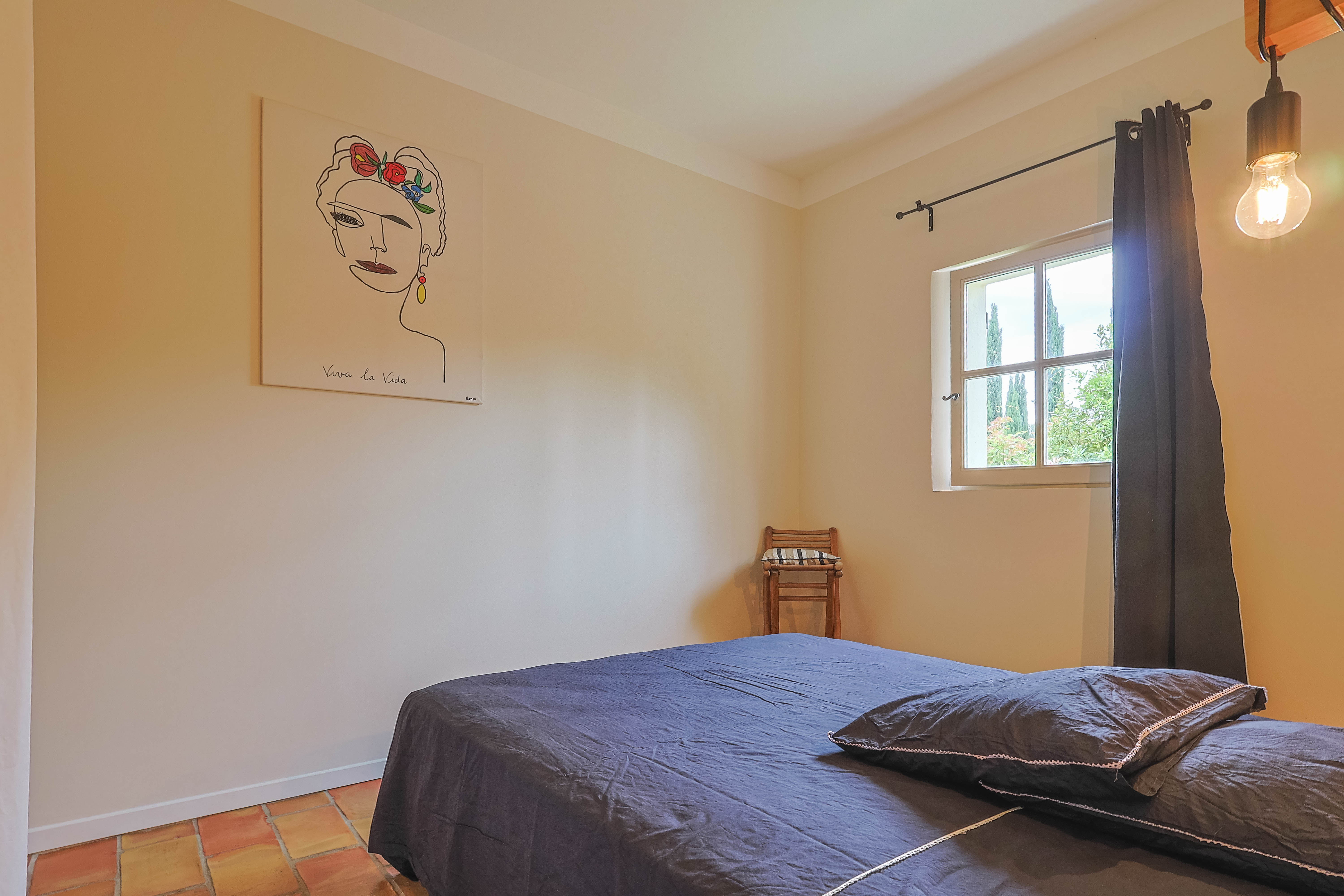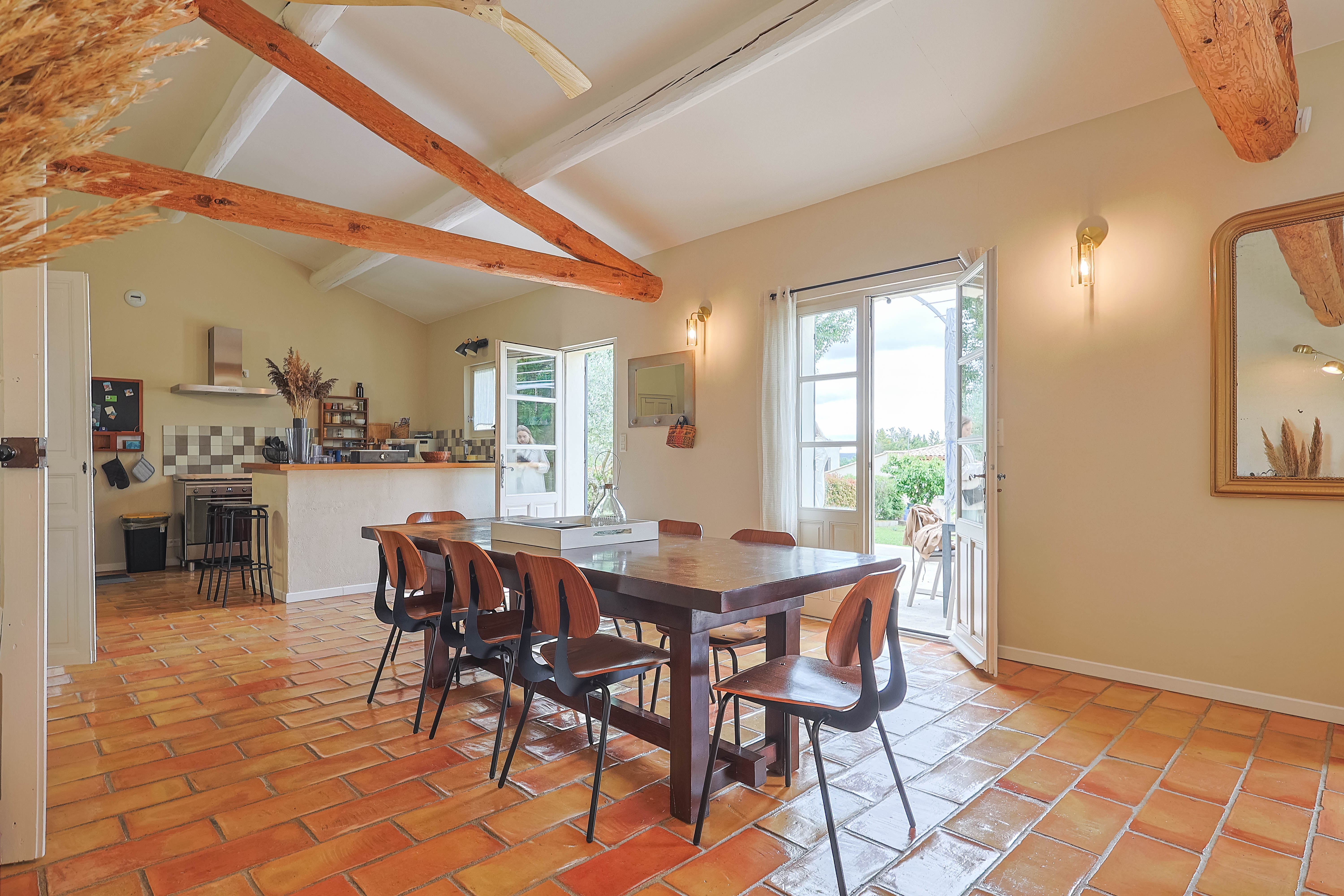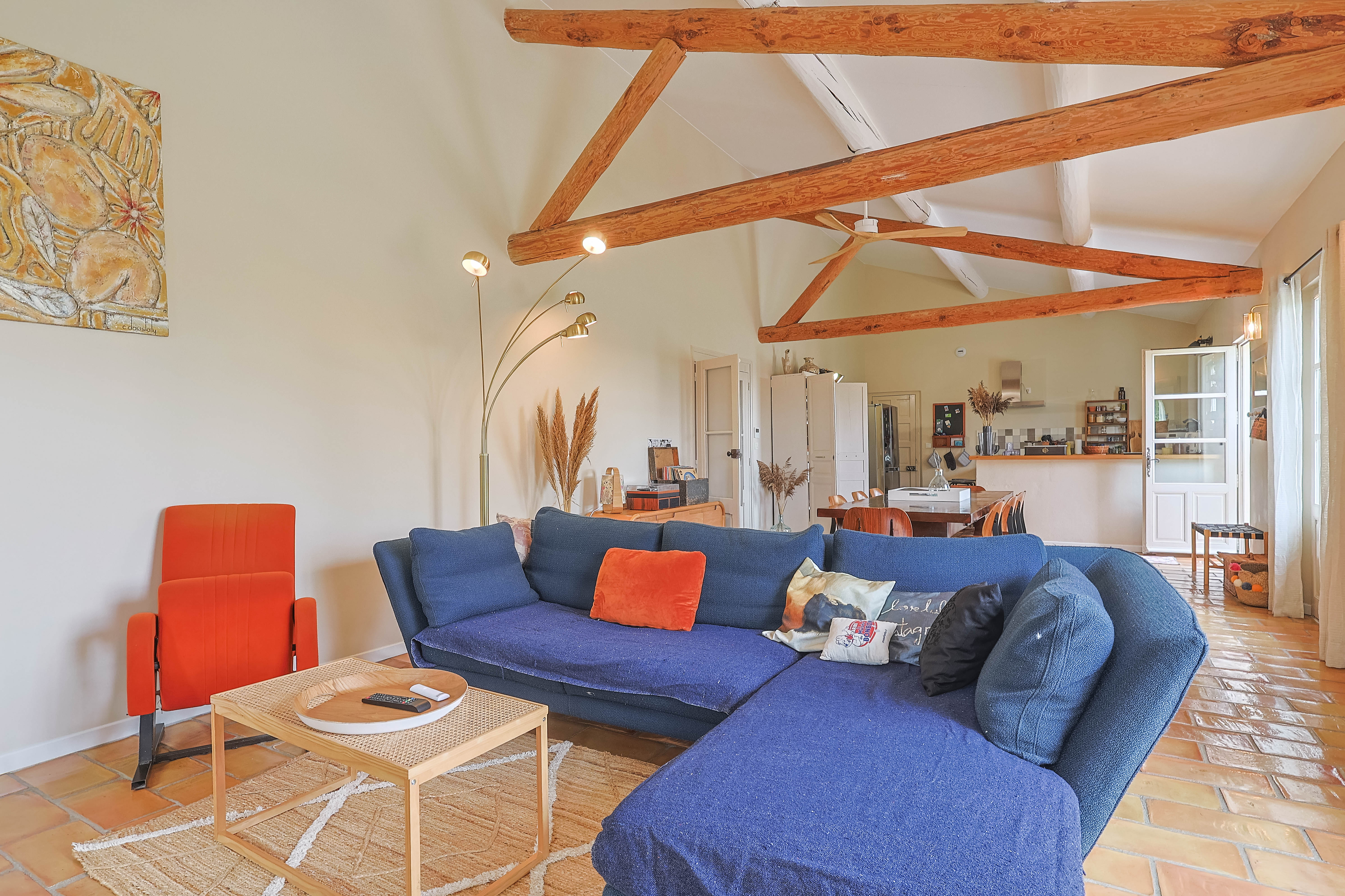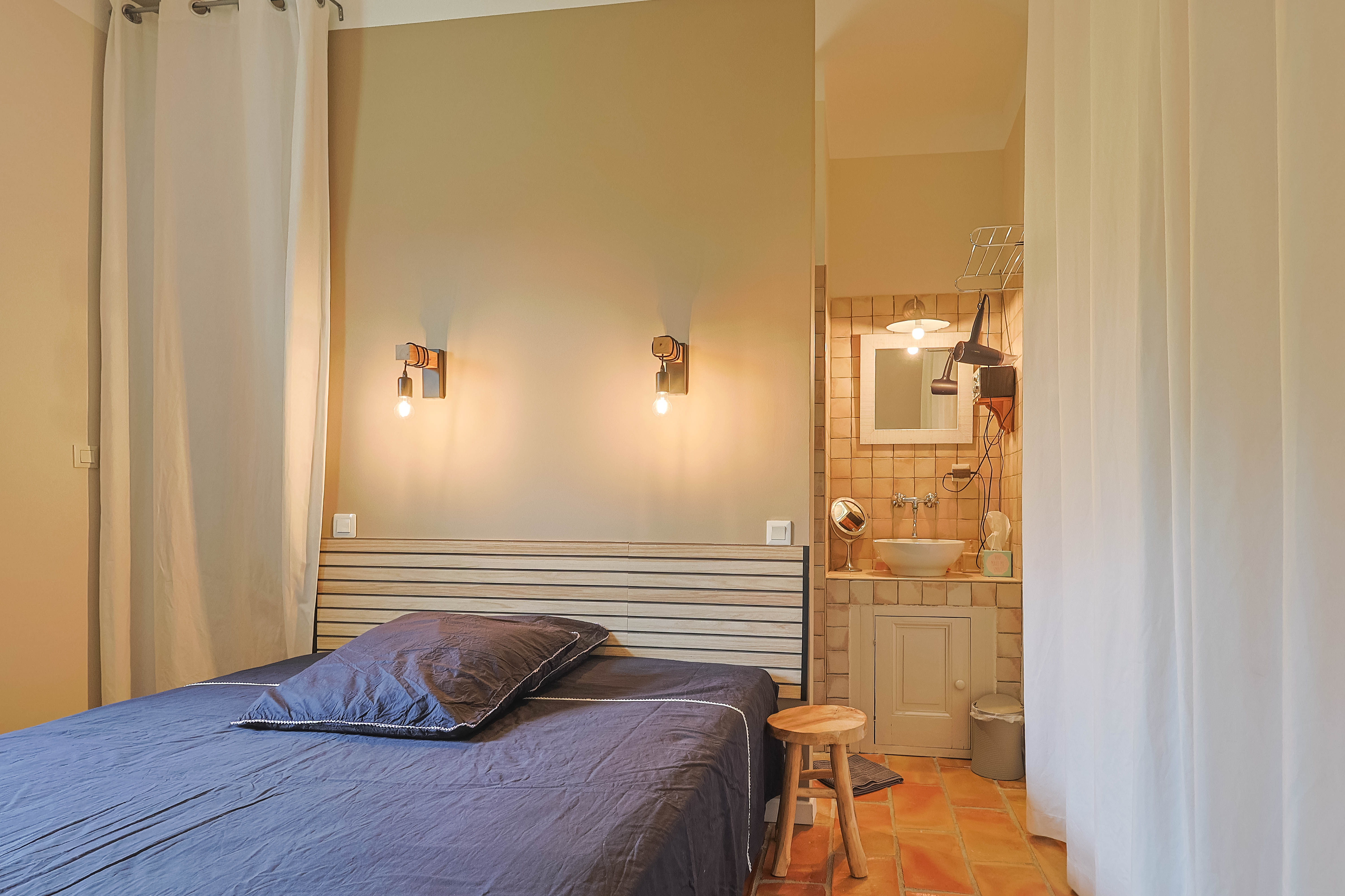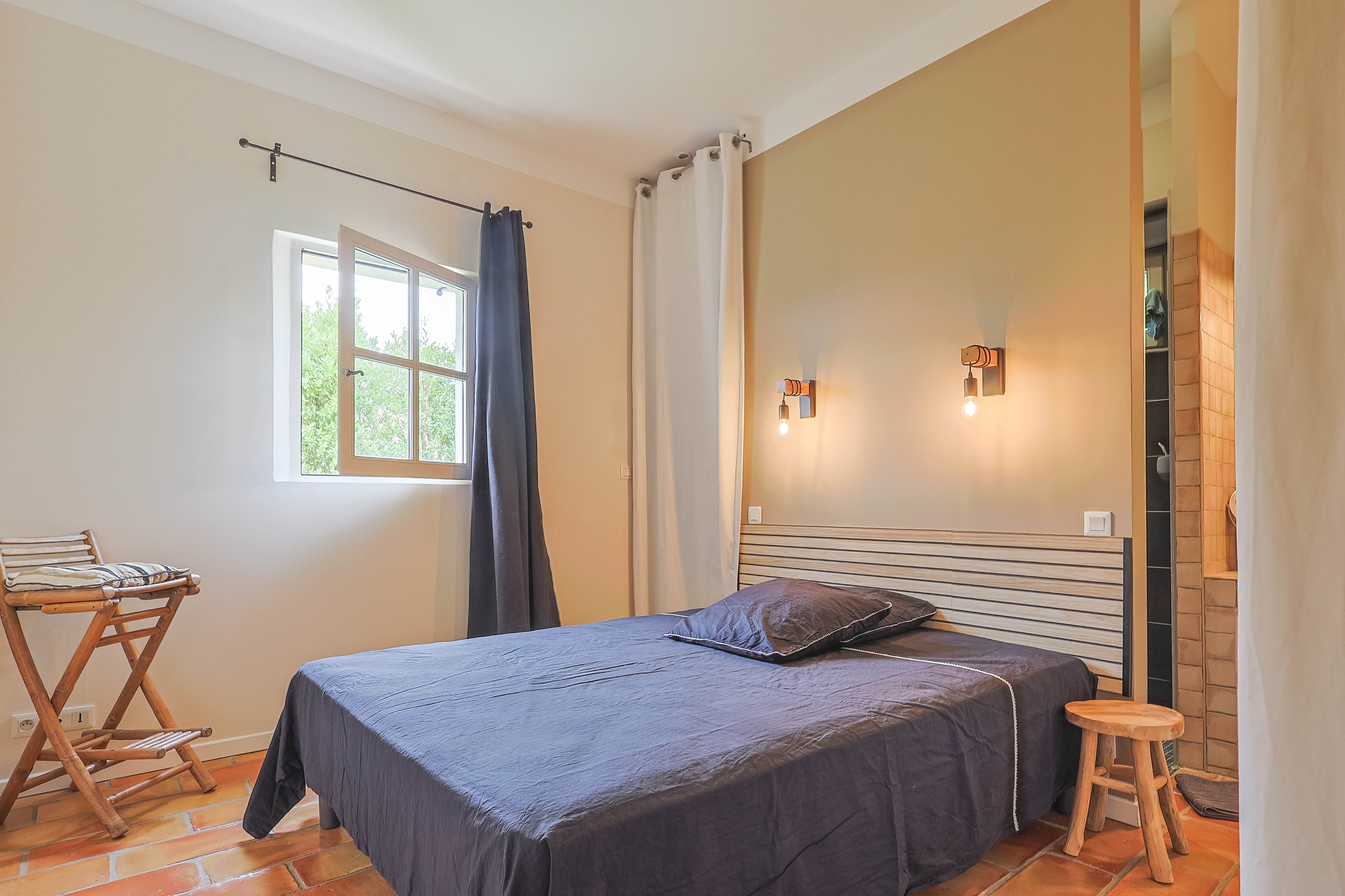 Interieur: Sehr schöner Vintage-Stil Dieses Ferienhaus im Süden Frankreichs verfügt über drei komfortable Schlafzimmer, darunter ein Master-Bedroom mit eigener Dusche. Außerdem gibt es ein zweites Badezimmer, das von den anderen beiden Schlafzimmern geteilt wird. Der Wohnbereich besteht aus einem gemütlichen Wohnzimmer, einem großen Esstisch und einer offenen, voll ausgestatteten Küche. Das Haus wurde mit authentischem Naturstein gebaut und besitzt wunderschöne Holzbalken, die für typisch provenzalischen Charme und eine warme Atmosphäre sorgen. Zudem hält der kühle Steinboden das Haus auch an heißen Sommertagen angenehm frisch.