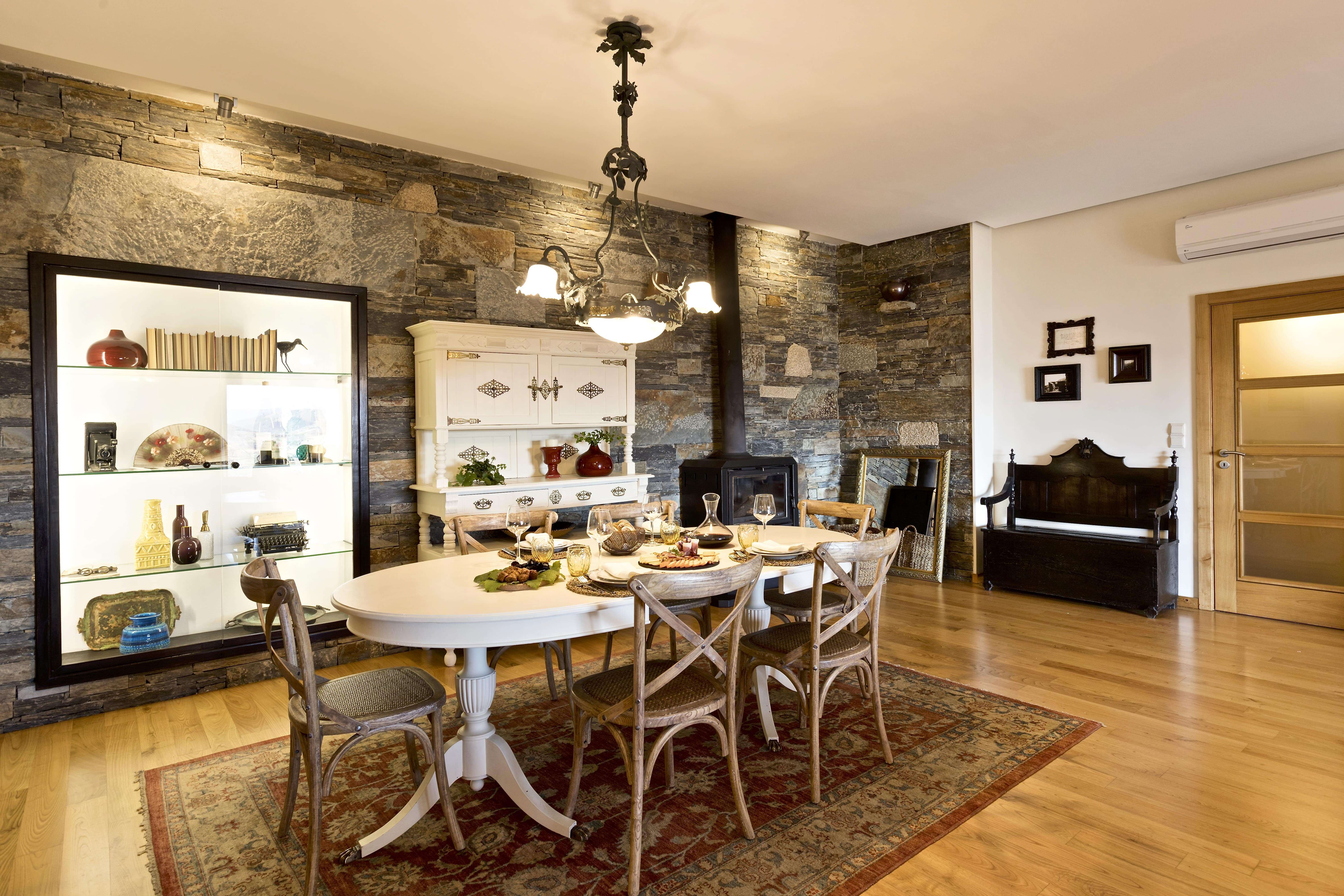 De woonkamer met airconditioning is bekleed met prachtige leisteenmuren en is een ruime, gezellige kamer met een prachtig uitzicht en antieke meubels met een formele eettafel met open haard.