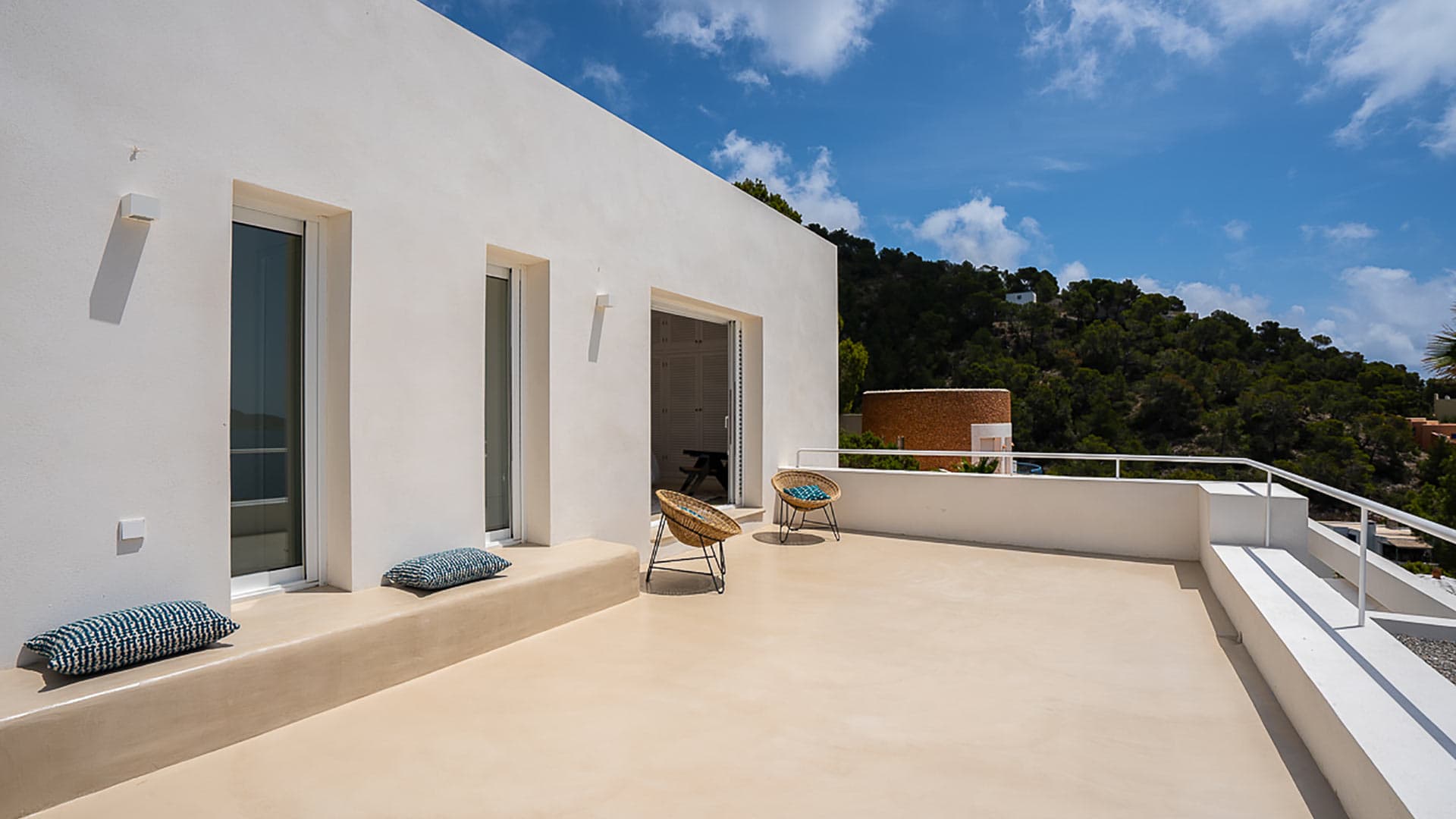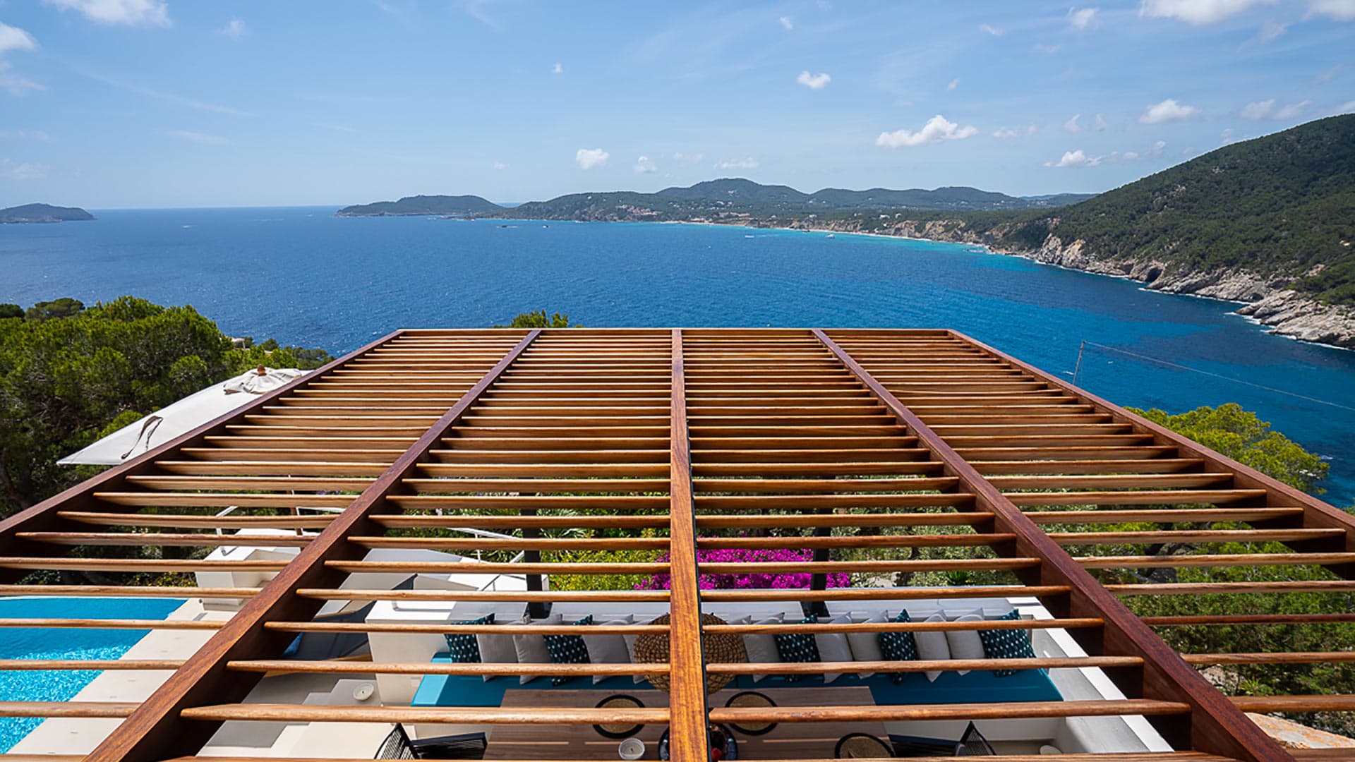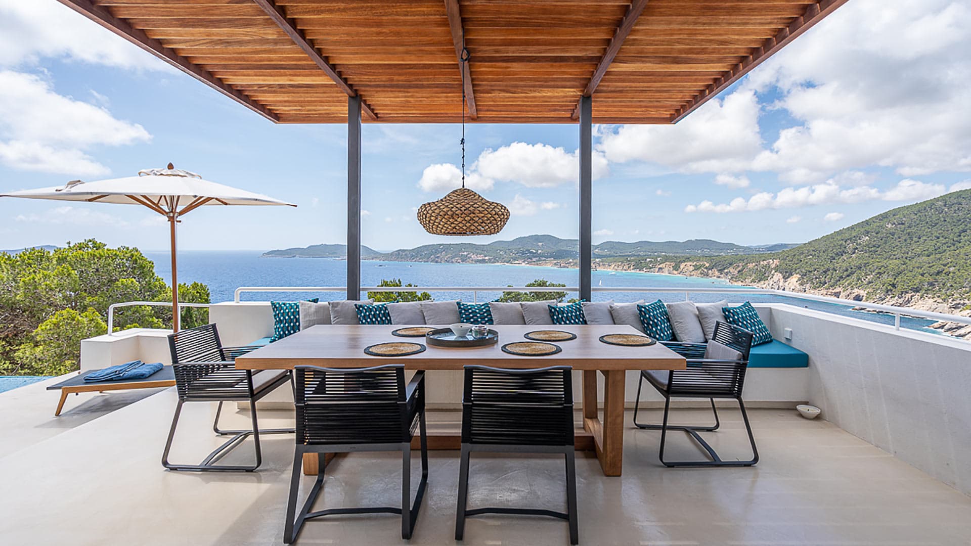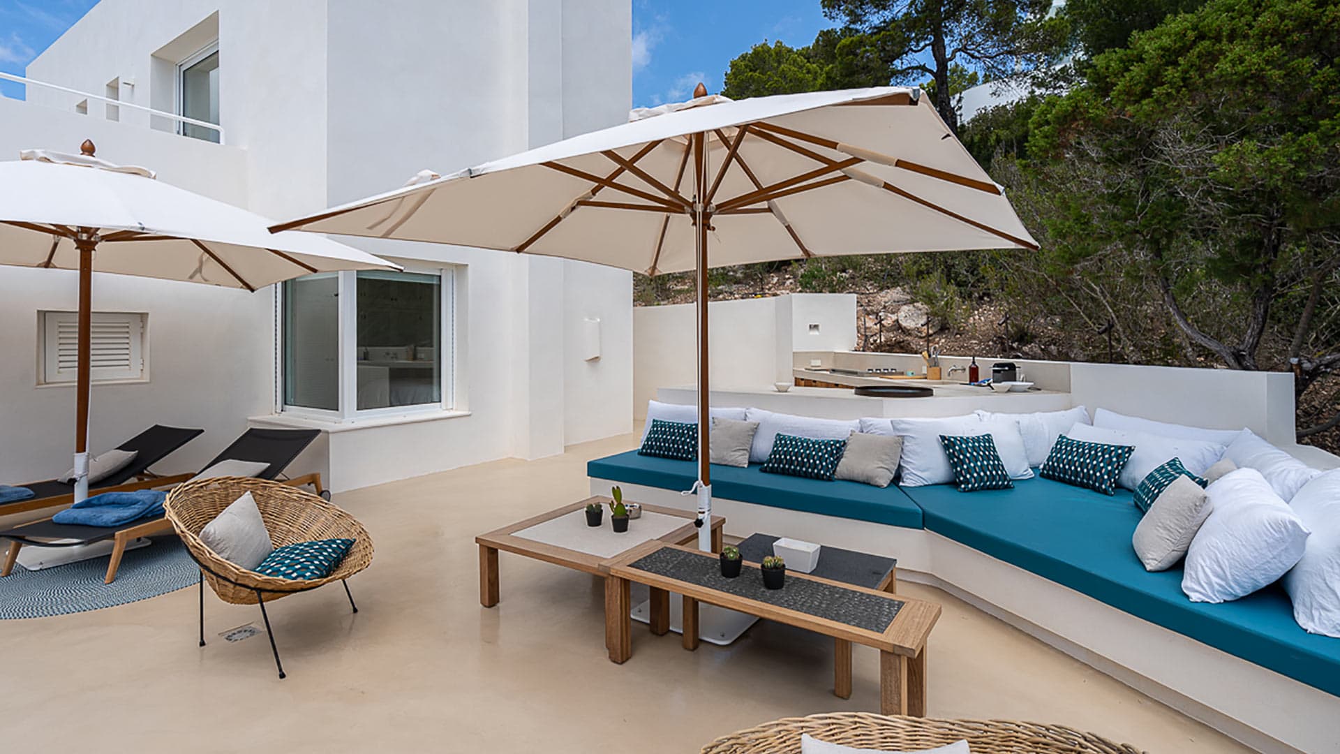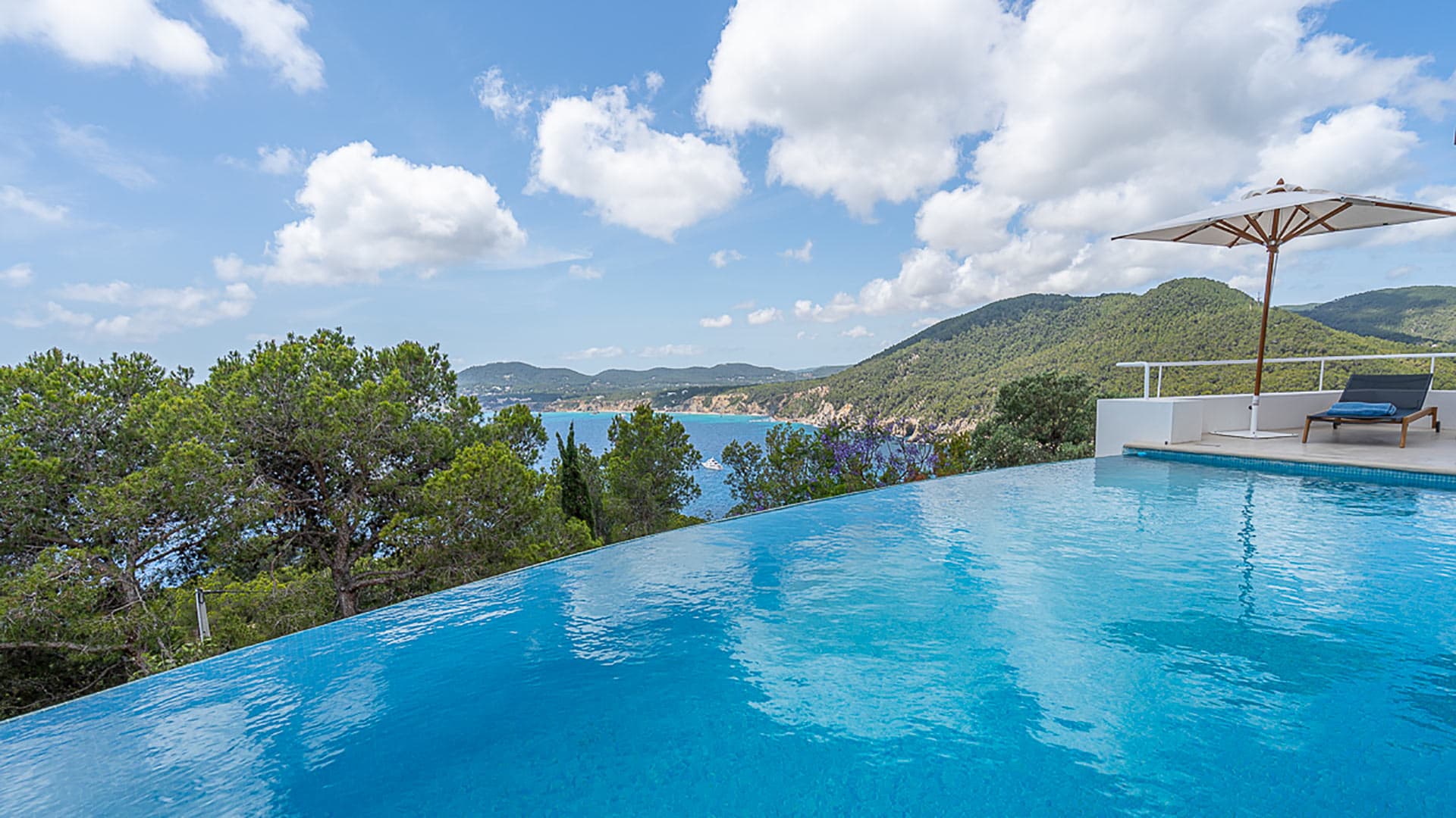 Exteriors The private swimming pool is ideal for hot summer days and offers incredible views of the northern coastline of the island. You’ll fall in love with the panoramic views over Cala San Vicente beach and its crystal-clear waters, White Water Beach, and the island of Tagomago. The expansive terraces include various lounge areas and a covered summer kitchen, perfect for outdoor living.