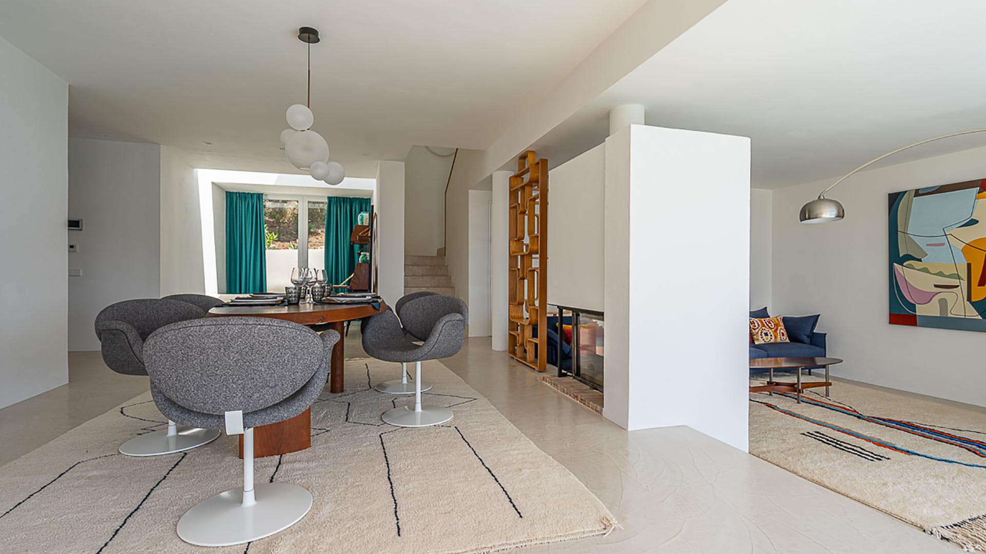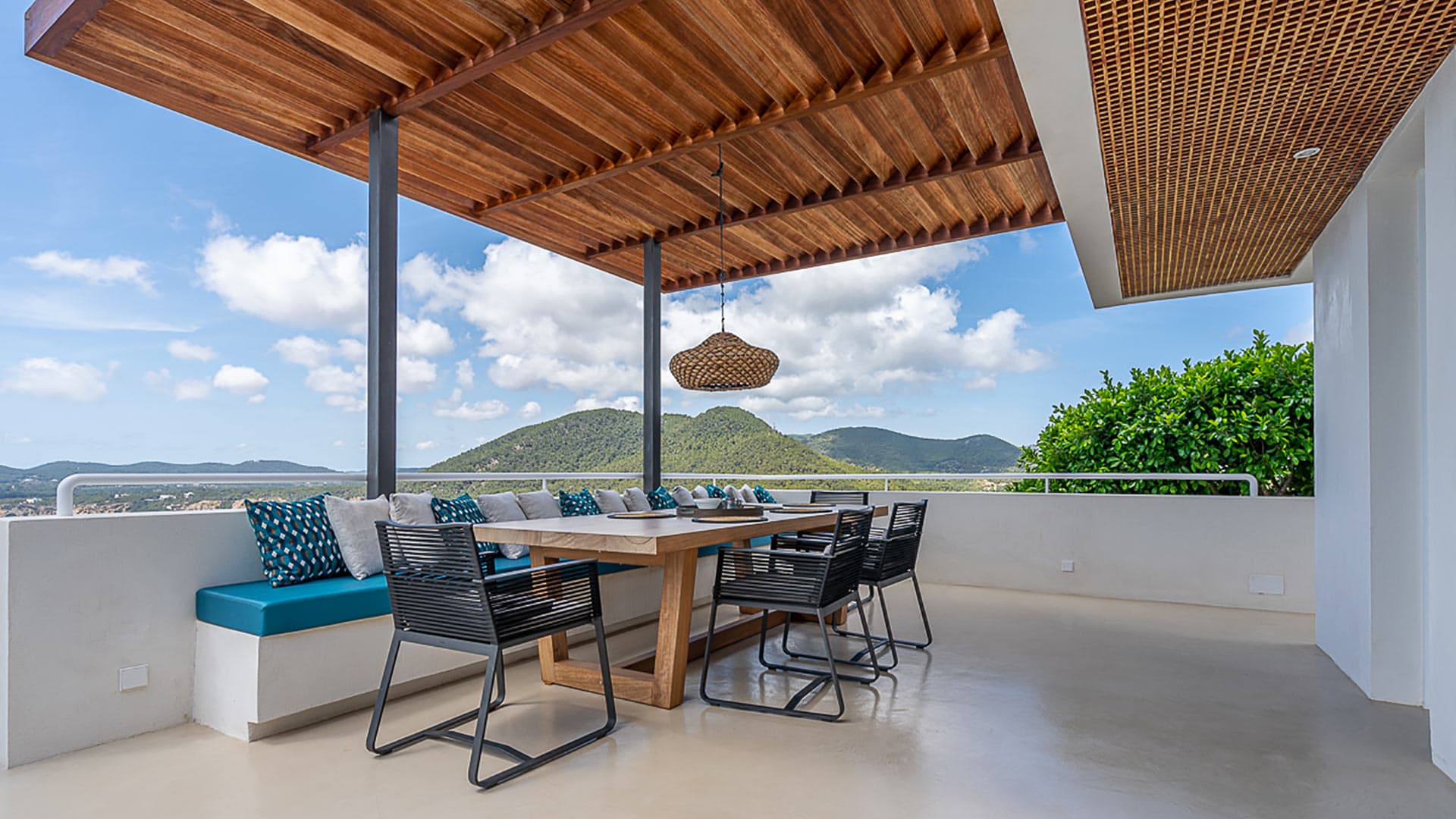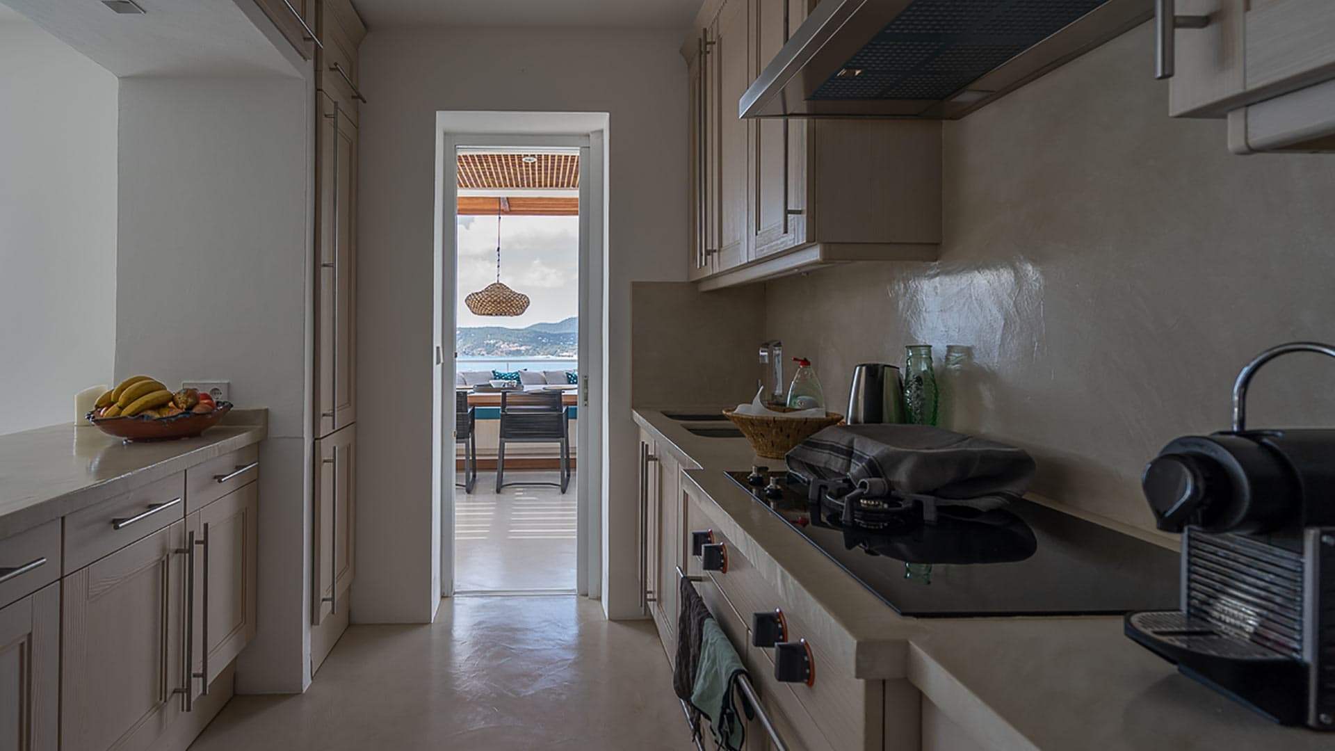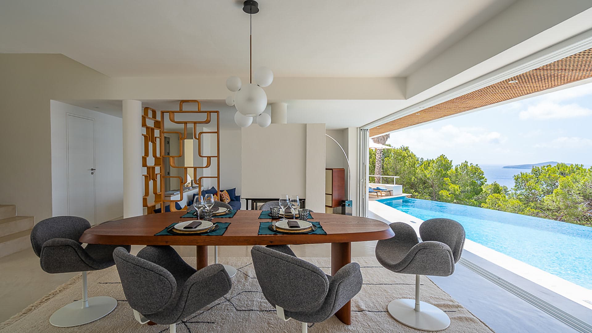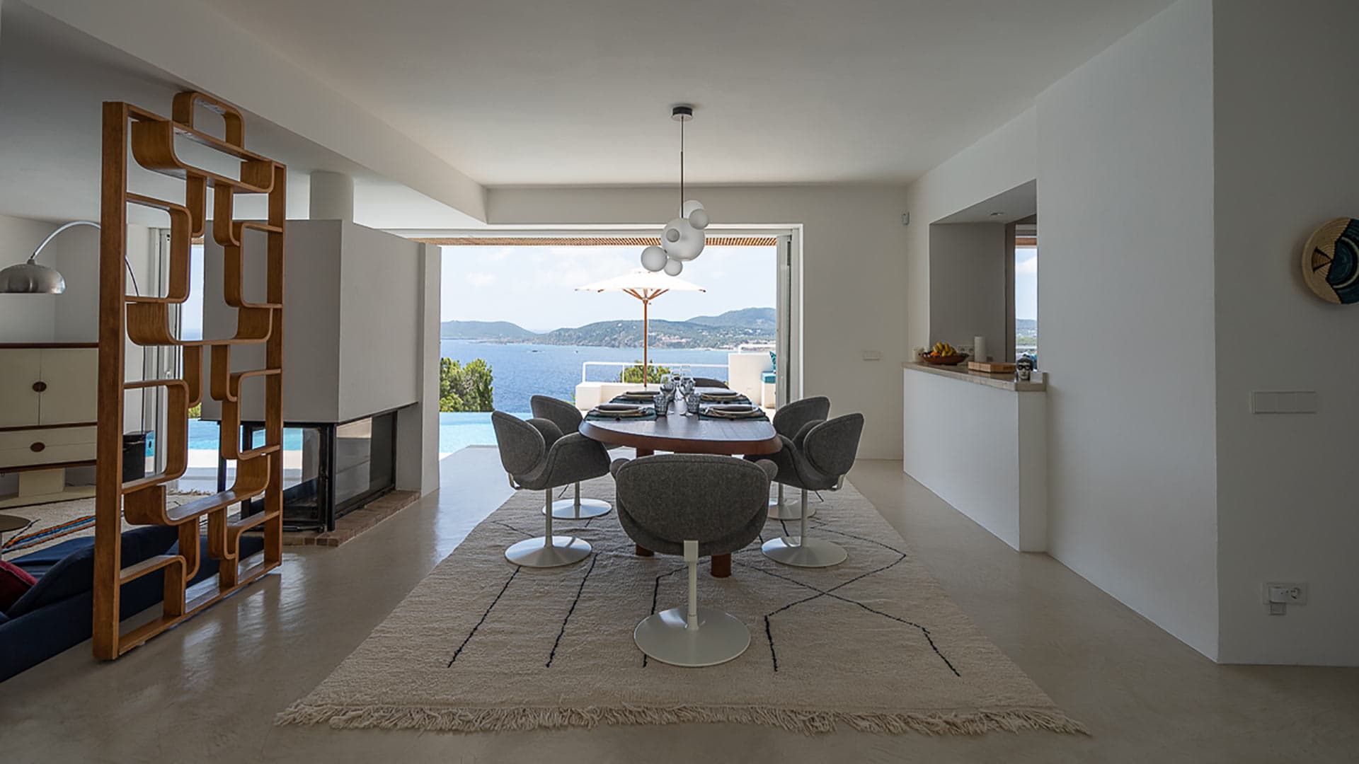 Exteriors The private swimming pool is ideal for hot summer days and offers incredible views of the northern coastline of the island. You’ll fall in love with the panoramic views over Cala San Vicente beach and its crystal-clear waters, White Water Beach, and the island of Tagomago. The expansive terraces include various lounge areas and a covered summer kitchen, perfect for outdoor living.