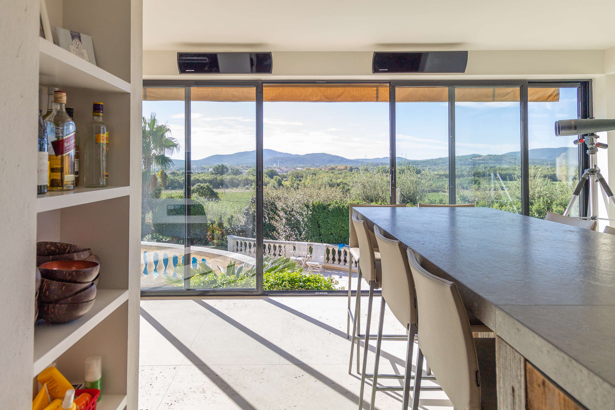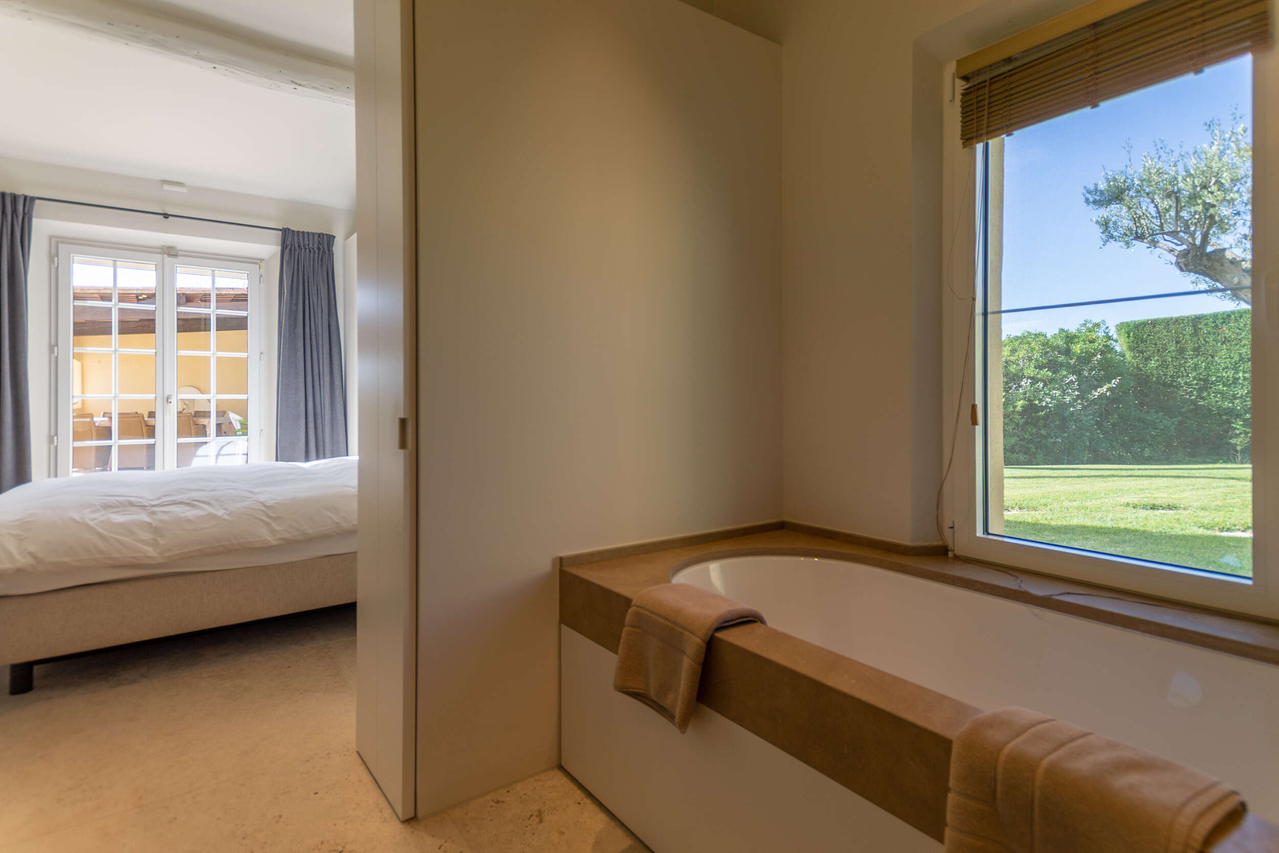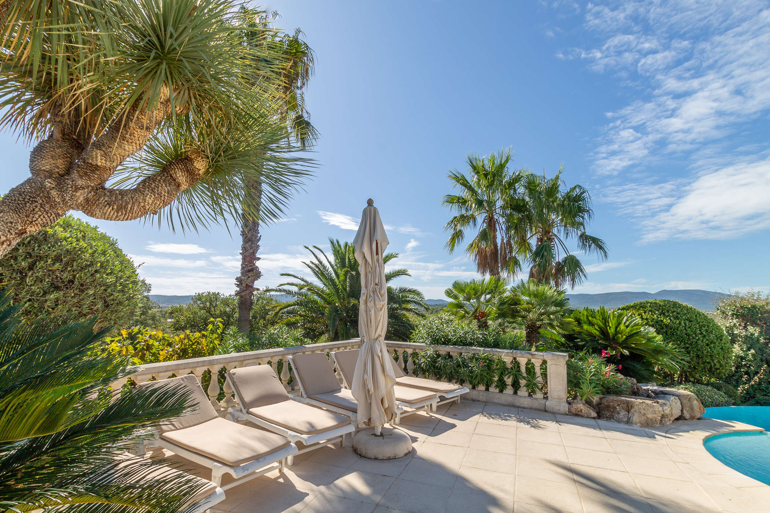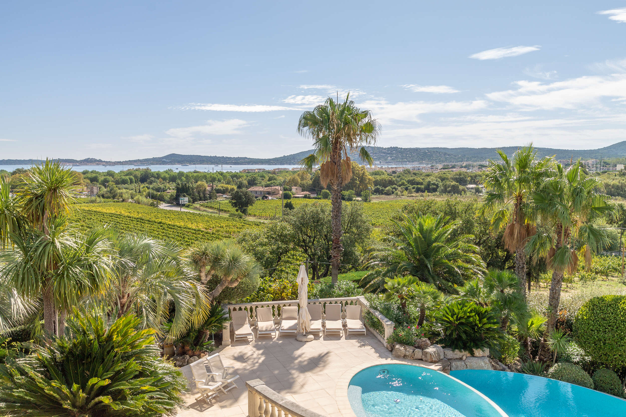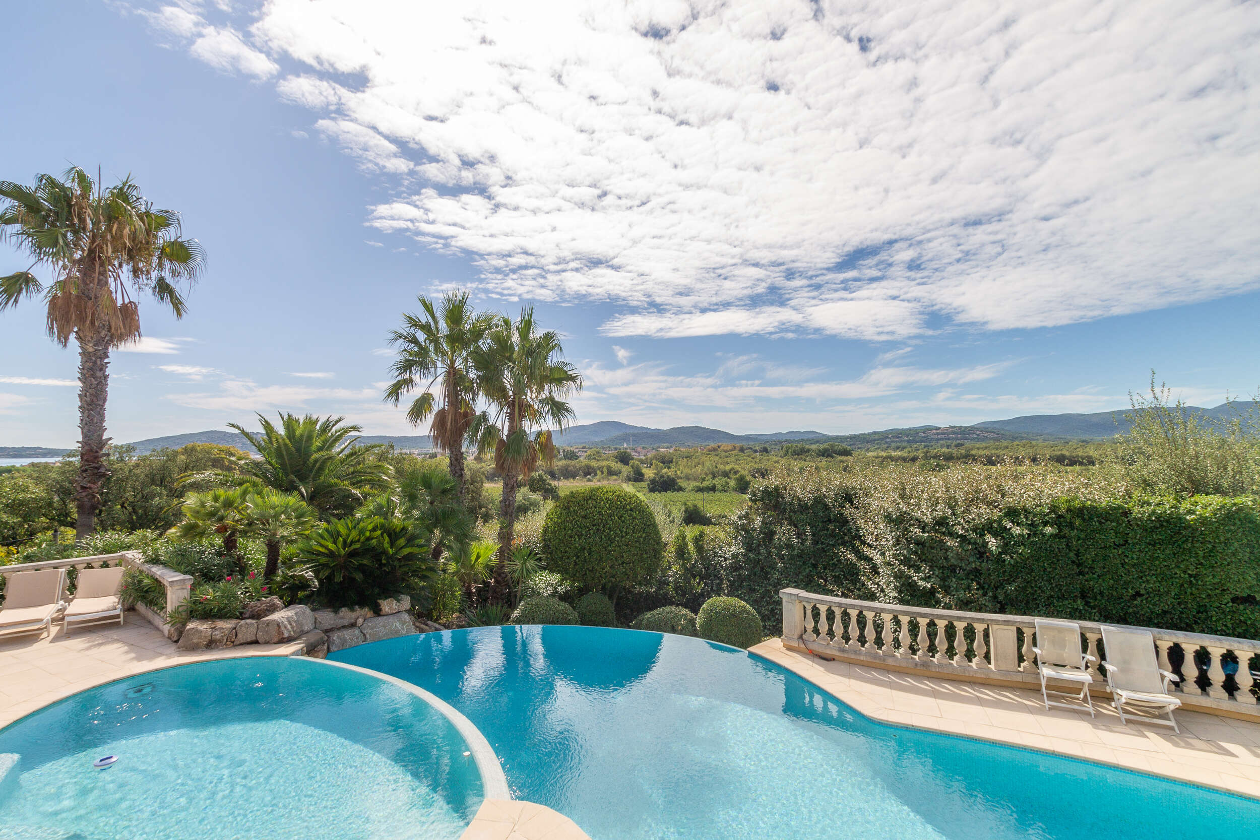 In the beautiful south-facing enclosed garden of this holiday house there are two swimming pools that overflow into each other. The infinity pool offers a view of the surrounding nature. The smallest pool has a sunbathing area with hydromassage. In total there is about 140m2 of pools, the depth goes from 0,10m to 2m. The pools are surrounded by terraces, so you can enjoy the sun every moment of the day. From the higher terrace you have a panoramic view of the sea and in the distance you can see Saint Tropez. At the swimming pool there is also a nice petanque court, great to play with friends or family with an aperitif.
