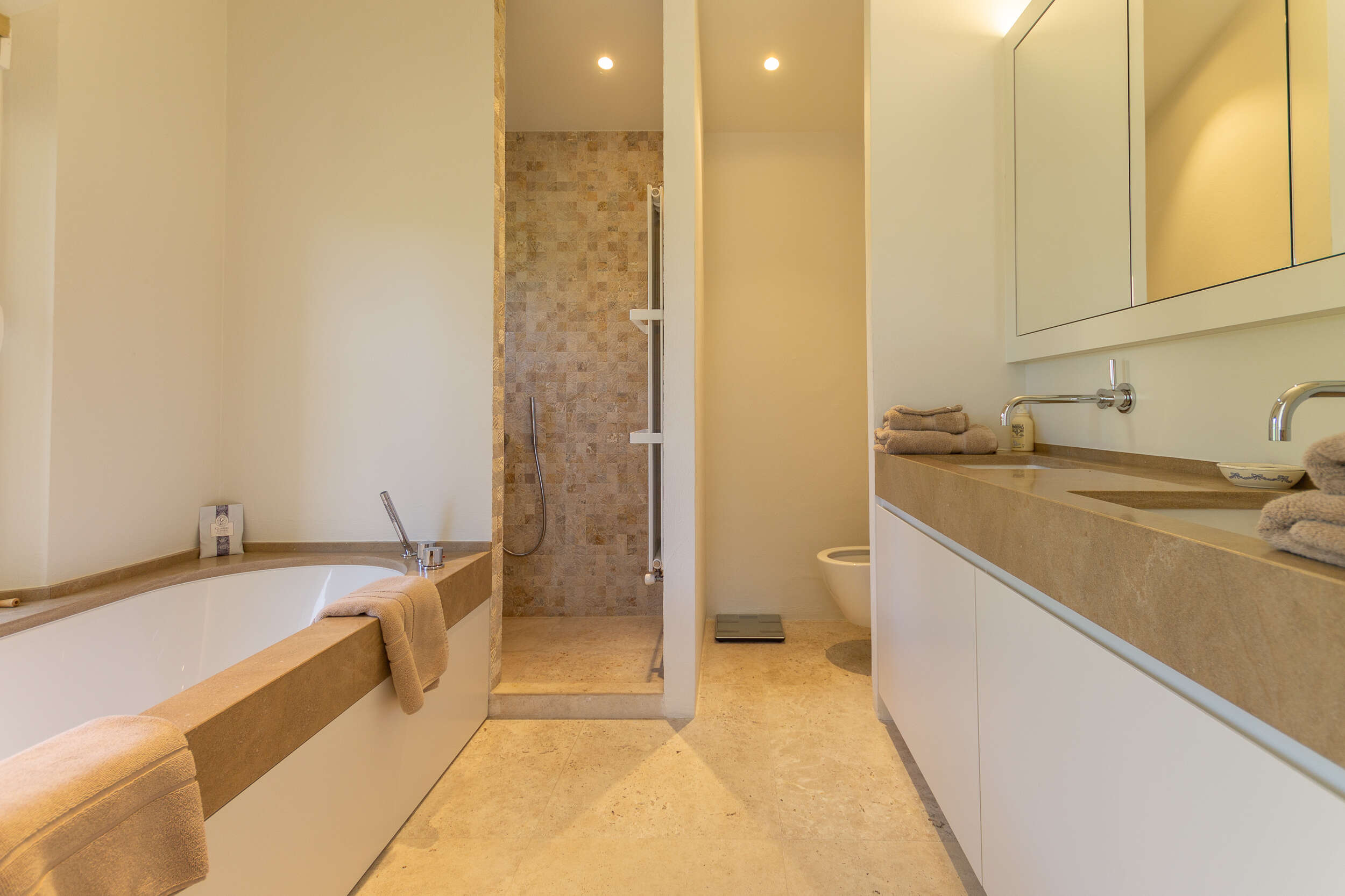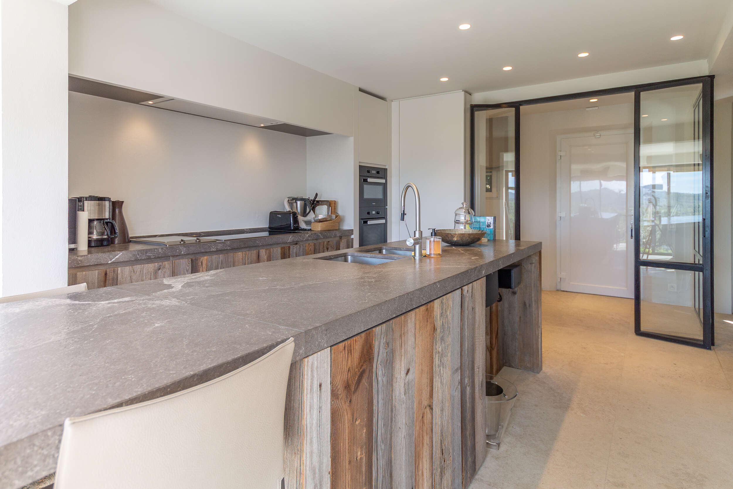 This luxurious holiday villa with panoramic sea view has recently been completely renovated. Thanks to the collaboration with a Belgian architect and interior designer, the house was finished to perfection with all the necessary facilities in a very stylish setting with luxurious, durable materials and furniture. The entire holiday home is also equipped with technical home automation such as electric awnings, sonos, alarms or lights that can be extinguished remotely. The beautiful large kitchen is surrounded by large aluminium windows, allowing you to enjoy an unimaginable view. From the living room with gas fireplace you can access the covered terraces with patio heating (if necessary) and music boxes. Each bedroom has its own bathroom.