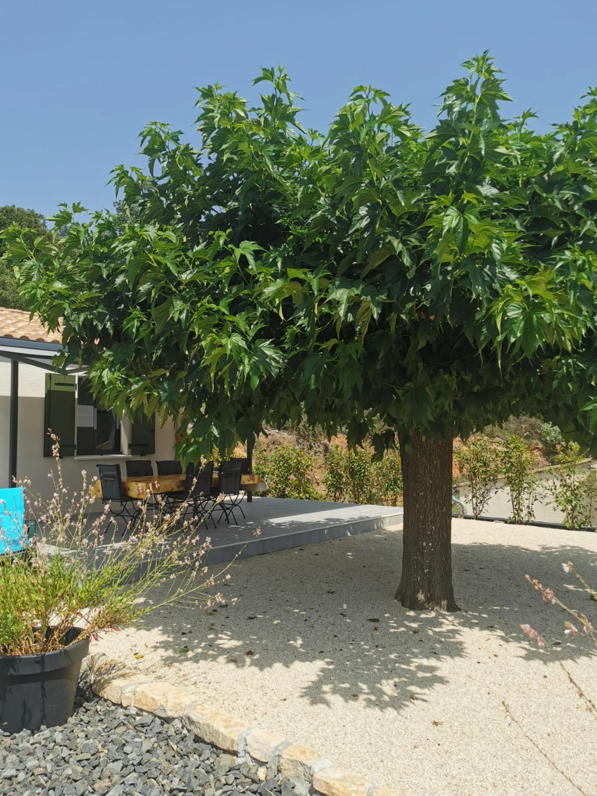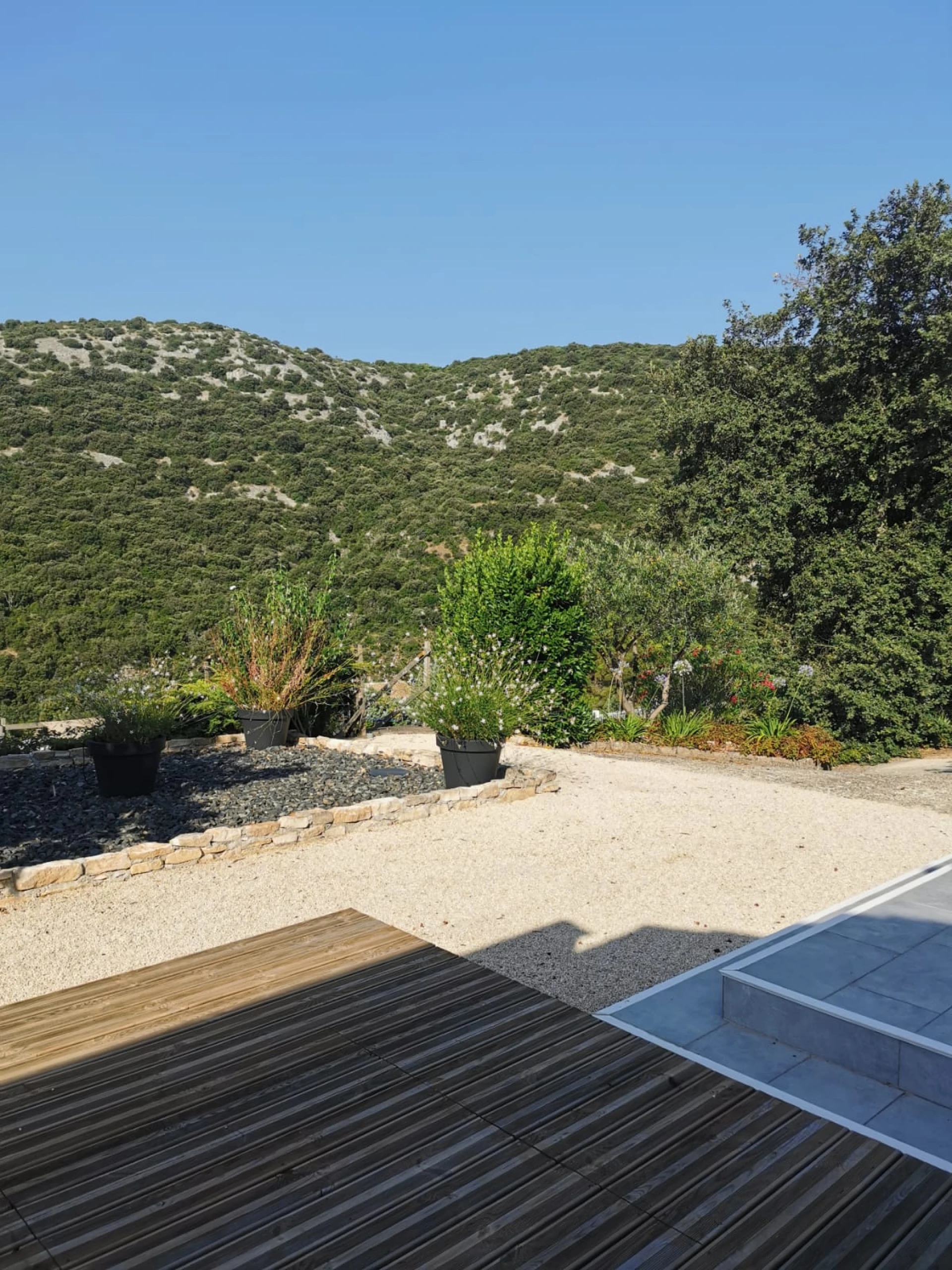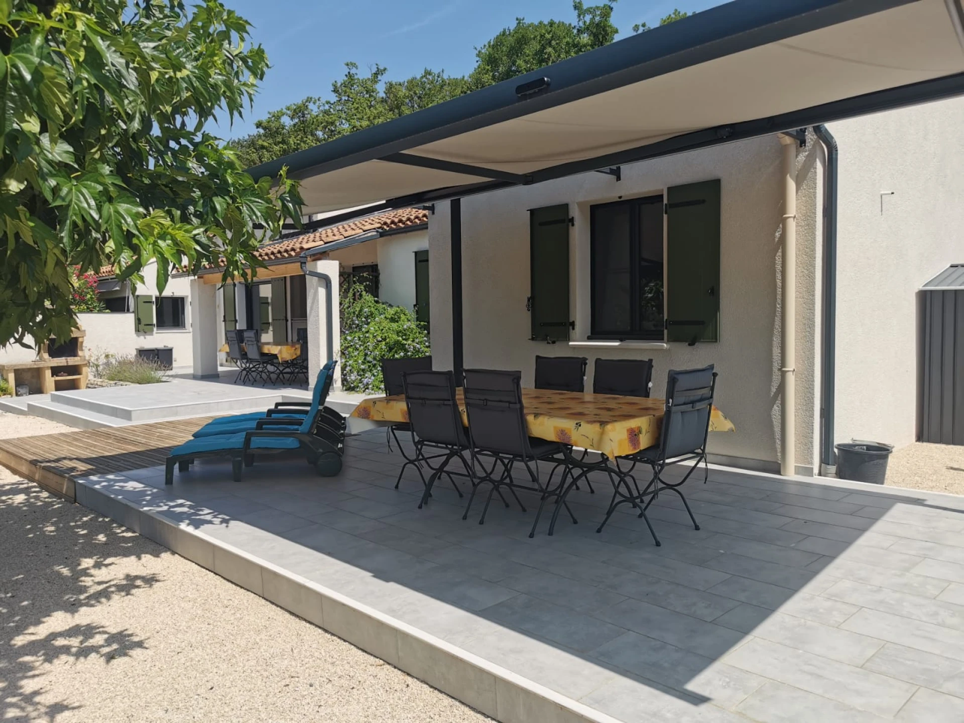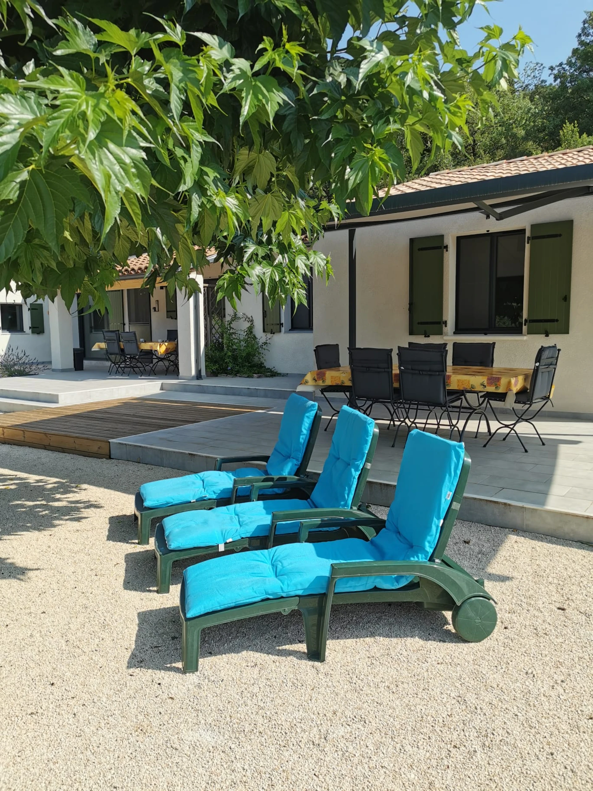 The villa's standout feature is without a doubt its panoramic view of the surrounding nature and the Ardèche River. Two 28 m² terraces let you fully enjoy the outdoors: the first can be opened or covered at your convenience thanks to an electric awning; the second is permanently covered. Below, a beautiful fenced private pool (8 x 4 m, depth from 1.2 m to 2.5 m) is available from mid-May to the end of September. On sunny days, a large shade sail near the pool provides a cool spot to relax.