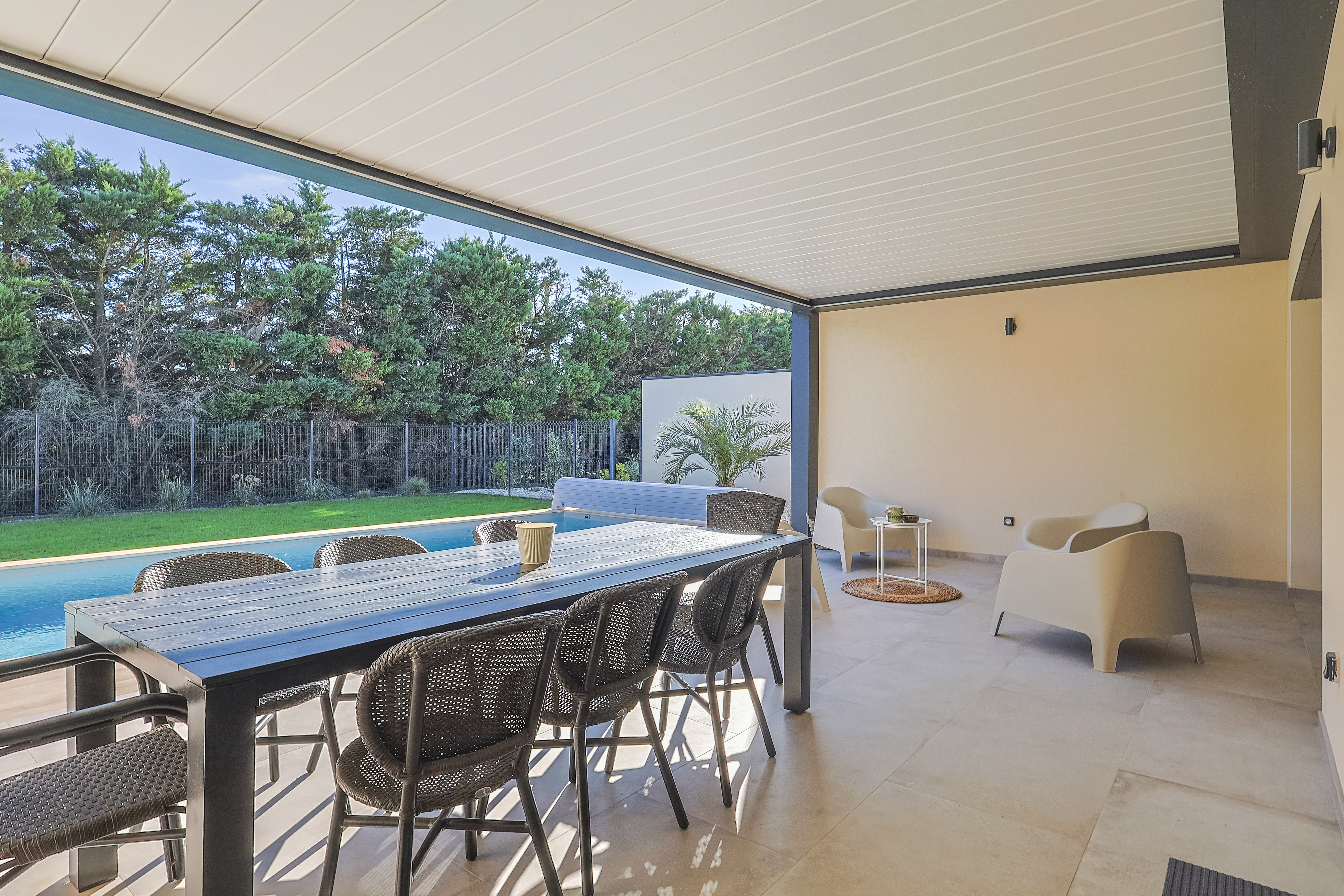 Enjoy a beautifully landscaped garden with a covered terrace by a bioclimatic pergola, ideal for al fresco dining. There is also a comfortable outdoor lounge area, perfect for relaxing in the shade with a drink. The private pool (9 x 3.5 m, depth: 1.4 m) can be heated on request (with supplement in April; May, June, September and October) and is equipped with lighting and an electric safety cover. The pool is open from the Easter holidays until the end of October. For even more fun, guests can use the gas barbecue and enjoy games on the petanque court.