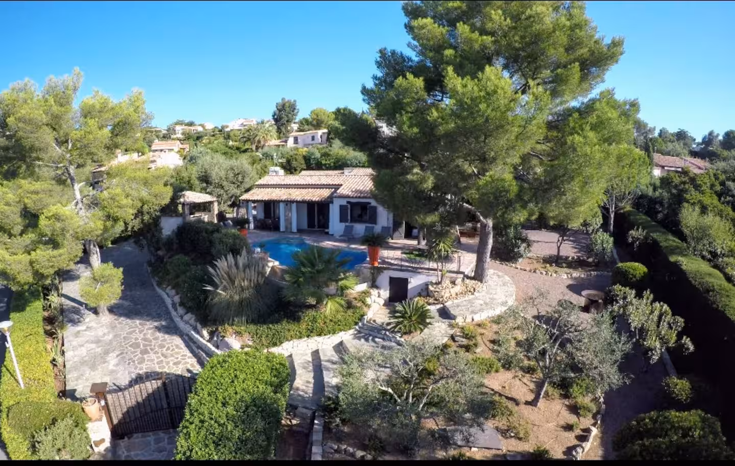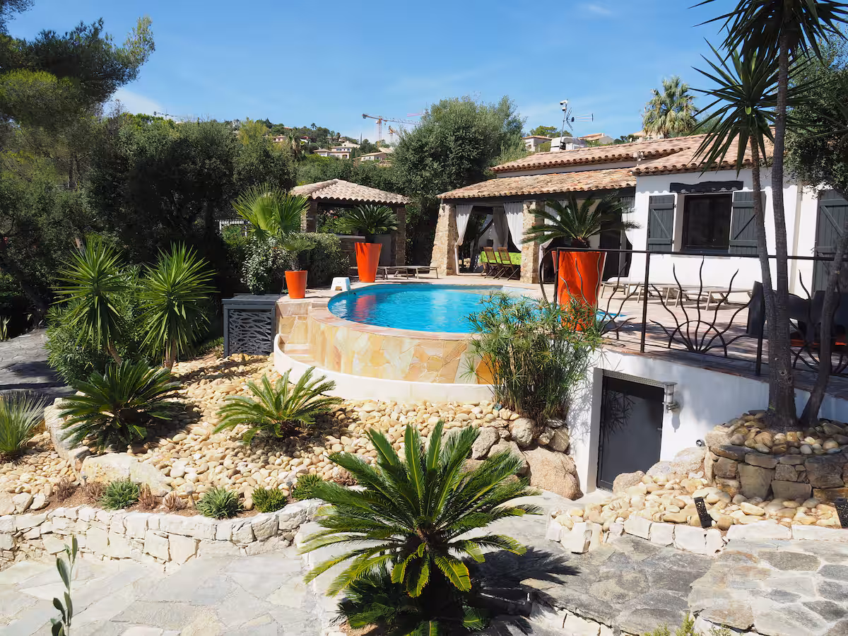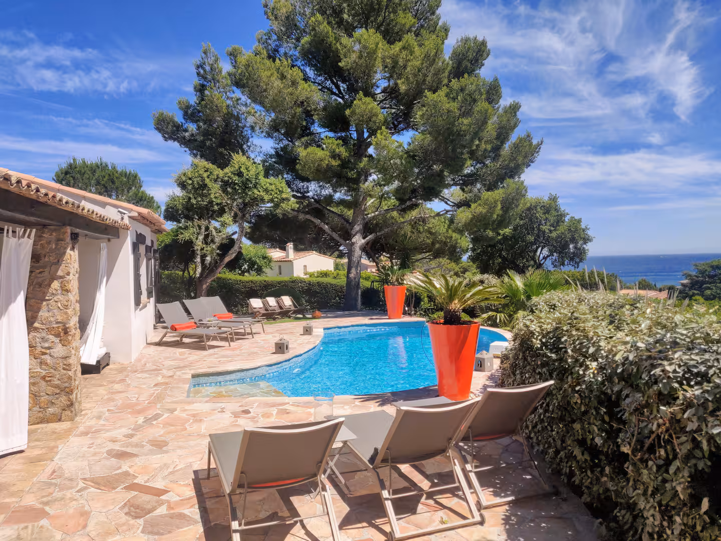 Exterior: Tranquility, nature and art de vivre The villa is set on a beautiful 2,000 m² plot surrounded by typical Mediterranean vegetation. Its standout feature is the private infinity pool (8 x 4 m, depth: 2.5 m), salt-treated, secured by an alarm, and heated on request. Shaded terraces surround the pool, perfect for relaxing or enjoying meals together. A charming pool house with a summer kitchen makes outdoor dining a pleasure. There’s also a pétanque court, and above all, a breathtaking sea view from the terraces — ideal for unforgettable moments.