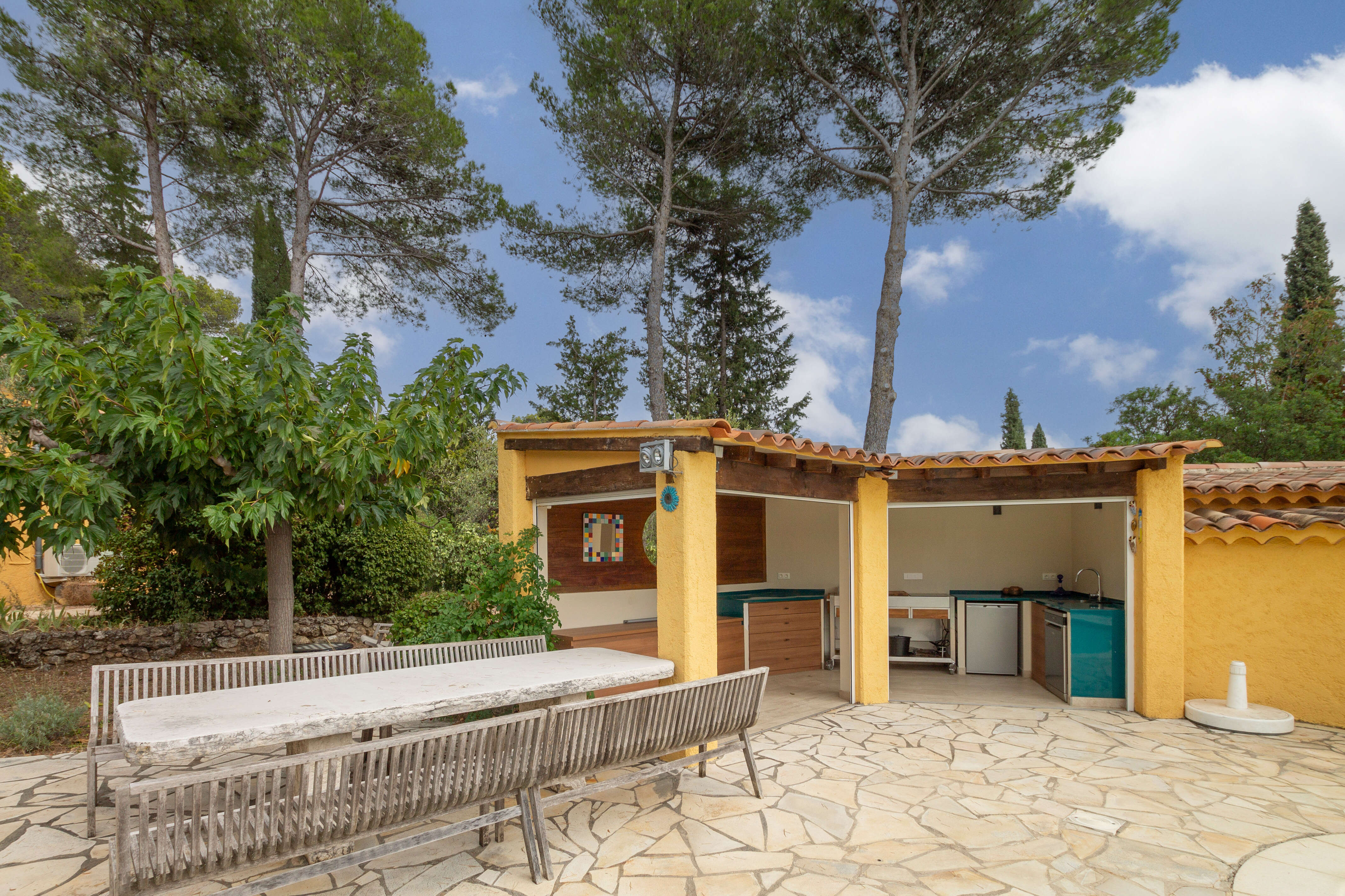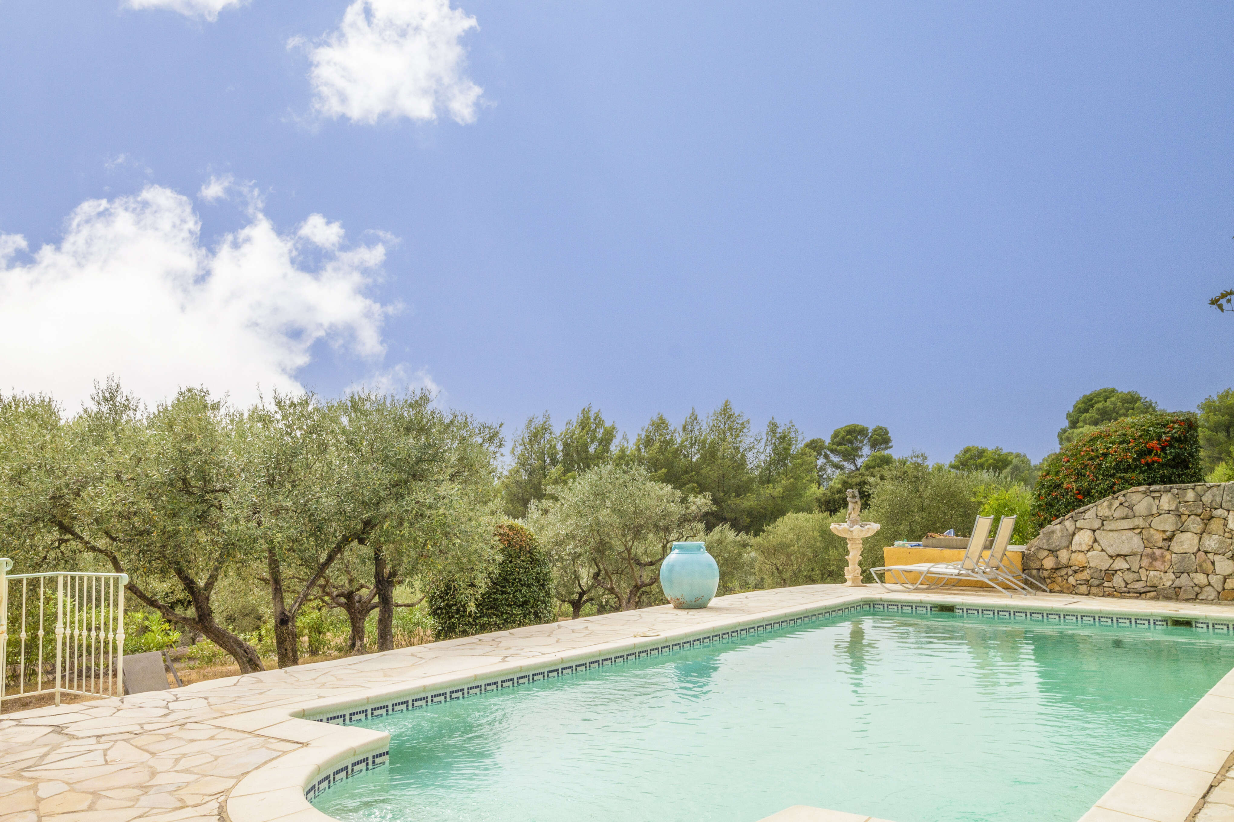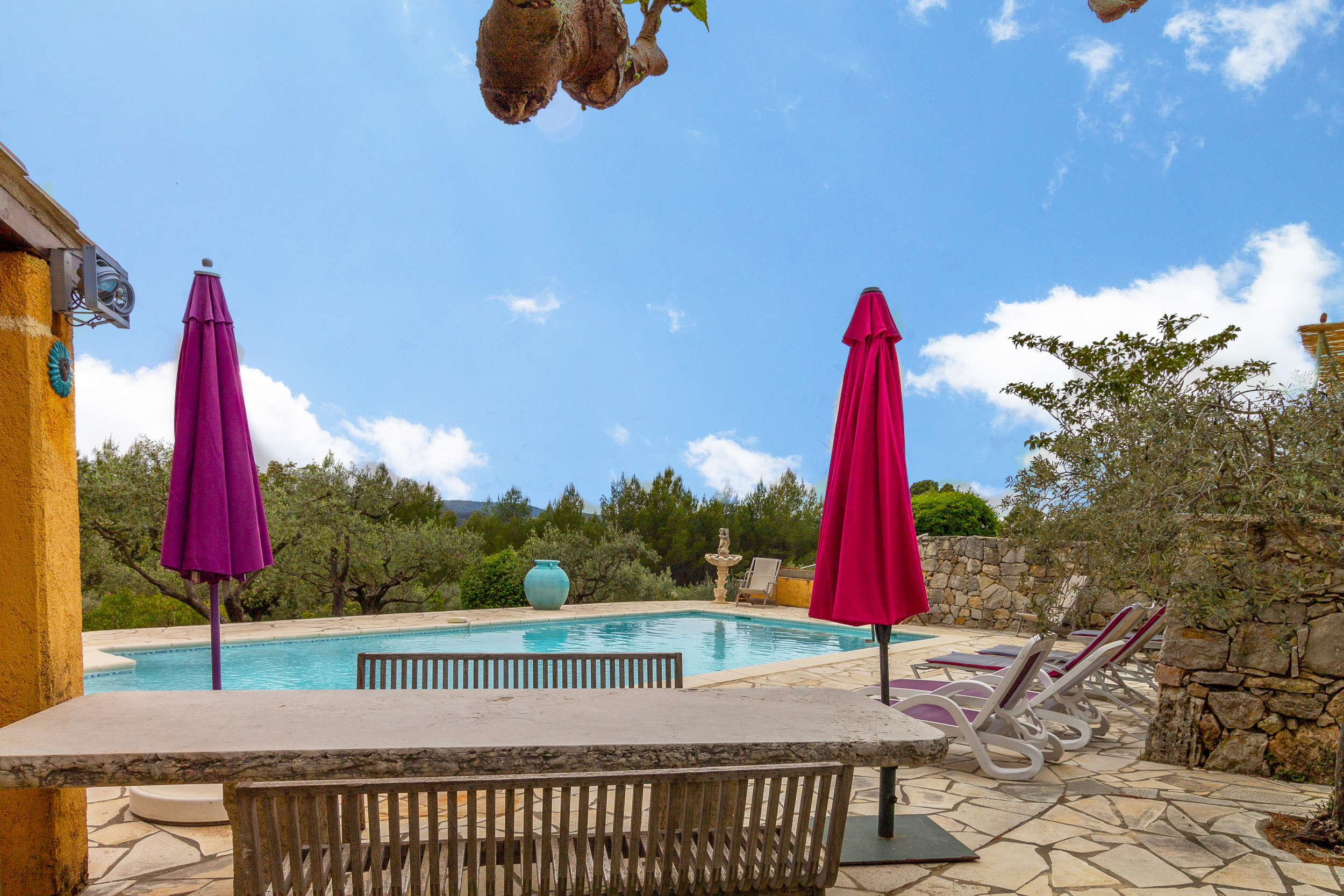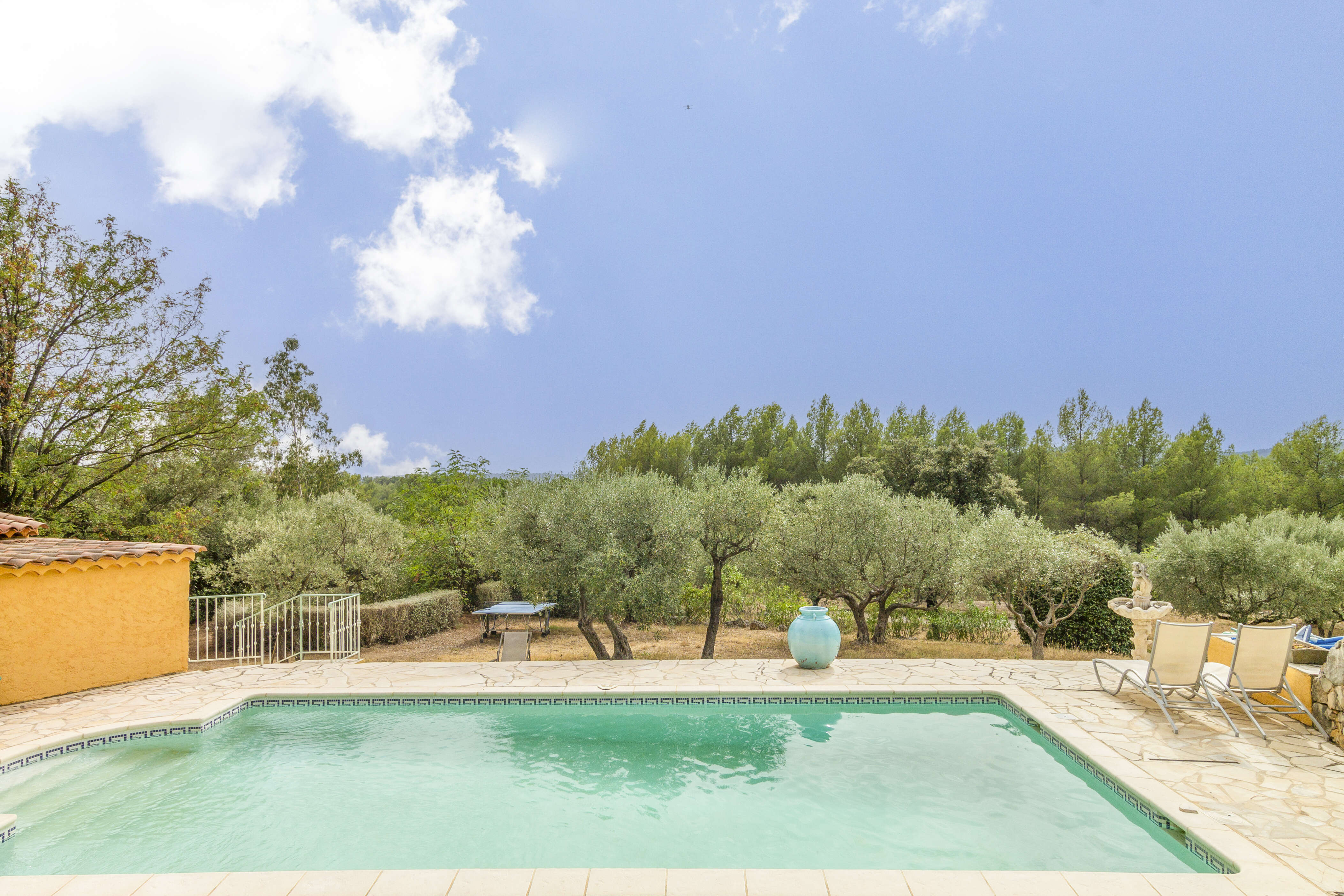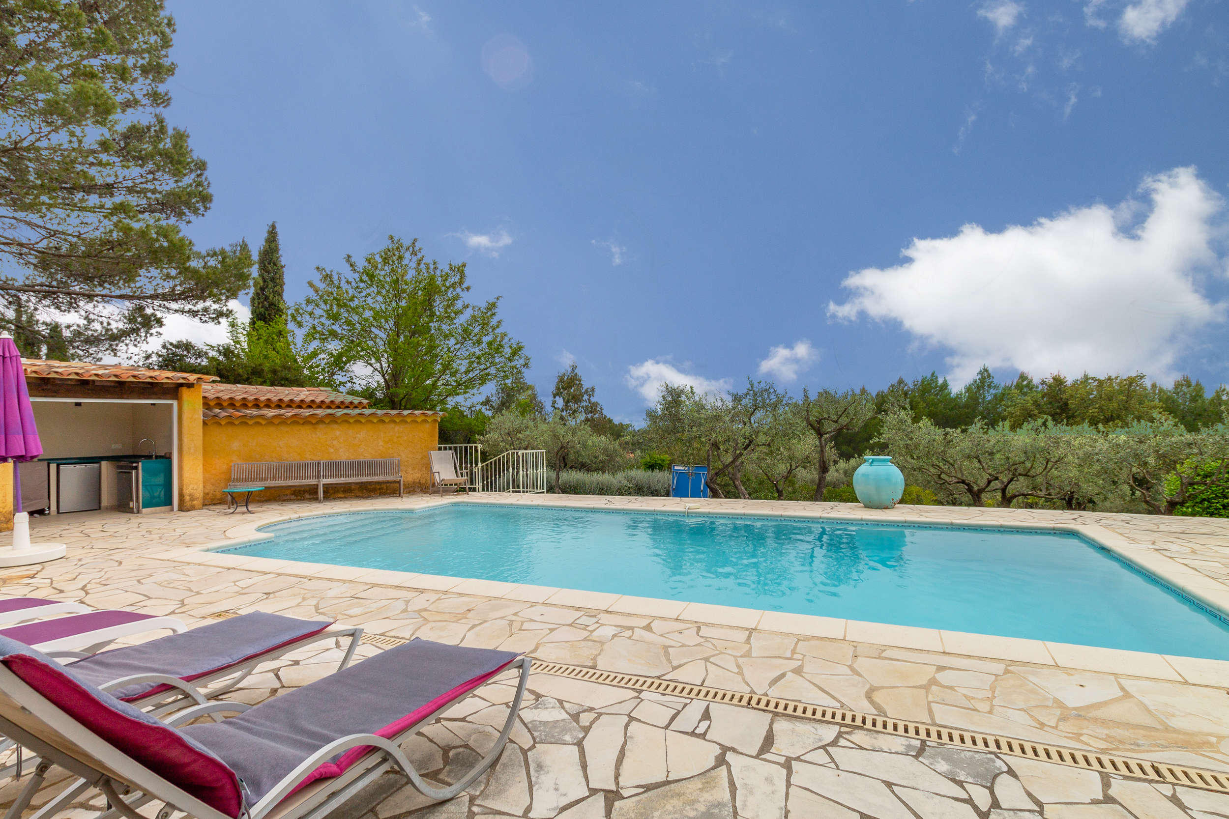 This is a delightful and luxurious villa located in the picturesque village of Flayosc. It has a marvellous 6,000m_ garden with a lot of olive trees which is entirely fenced, and a private swimming-pool (5mx10m) surrounded by spacious terraces. Pool-house with a fridge, shower and toilet, offering a fabulous view of the Provençal hills.