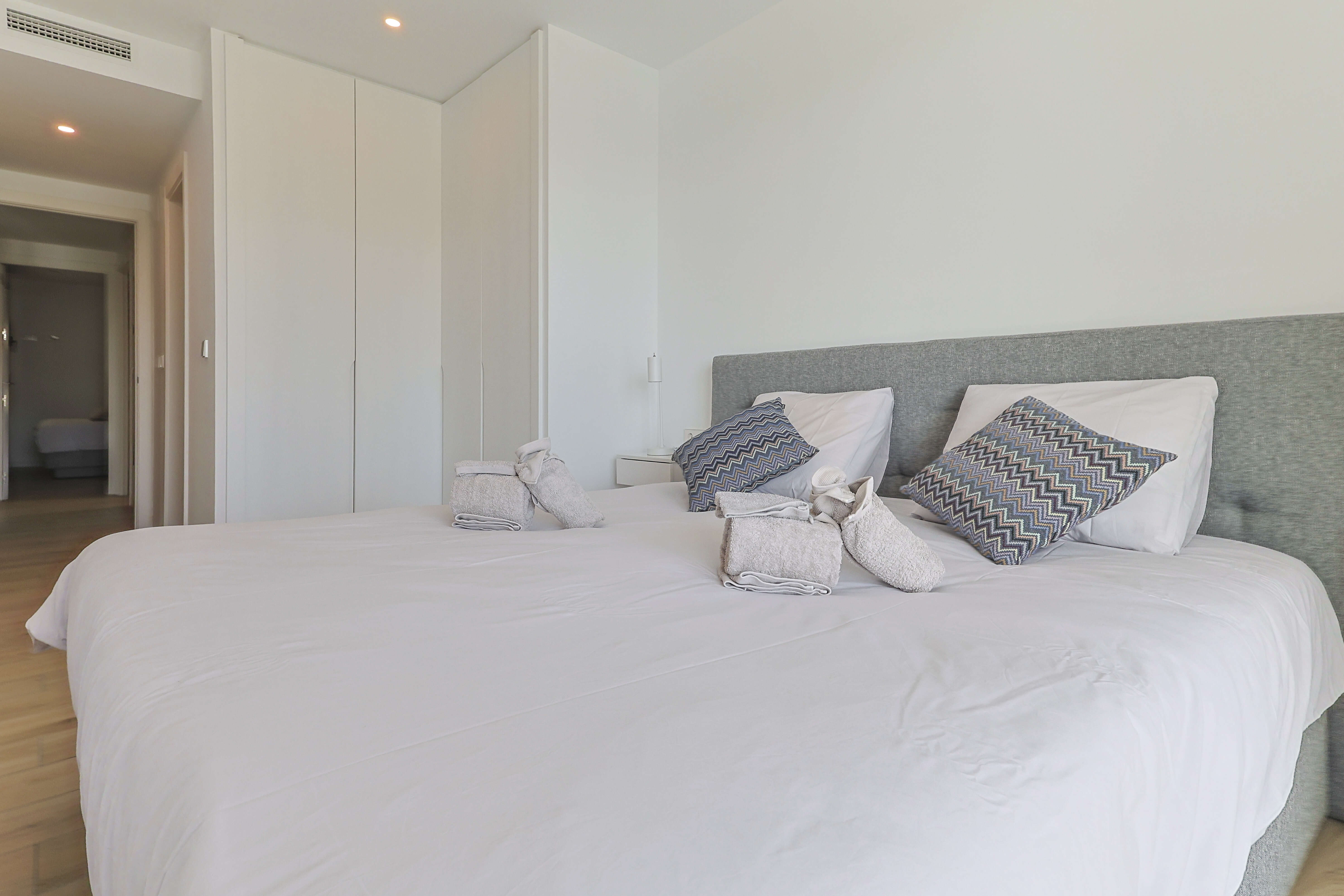 This modern apartment can accommodate up to 6 people, with a fully equipped open kitchen, a dining area, and a bright living room overlooking a covered terrace of 25m2, ideal for dining or relaxing. The flat offers a soothing view of the private pool with beautiful landscaped garden of this particular residence. The beautiful lake is barely a 3-minute walk away.