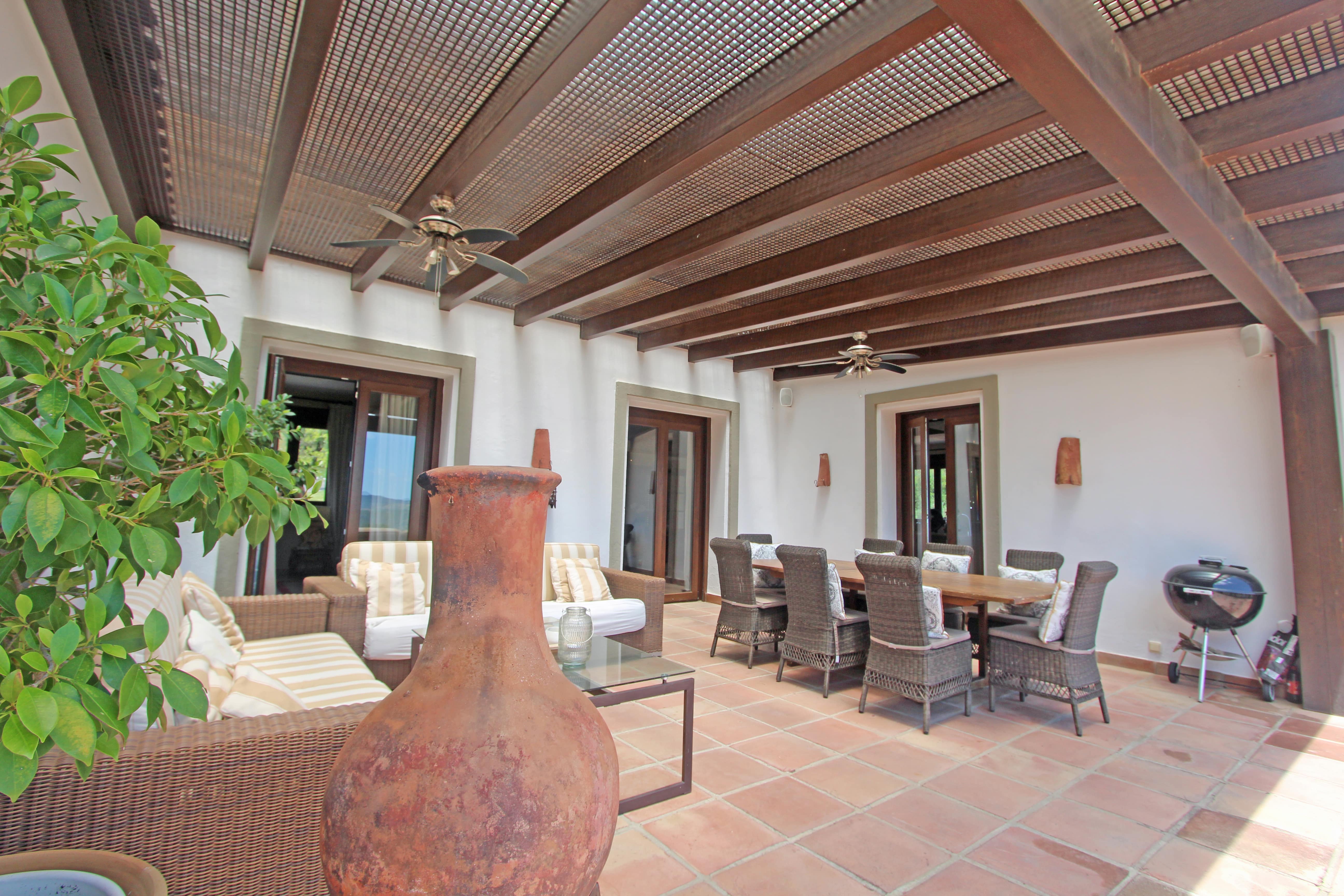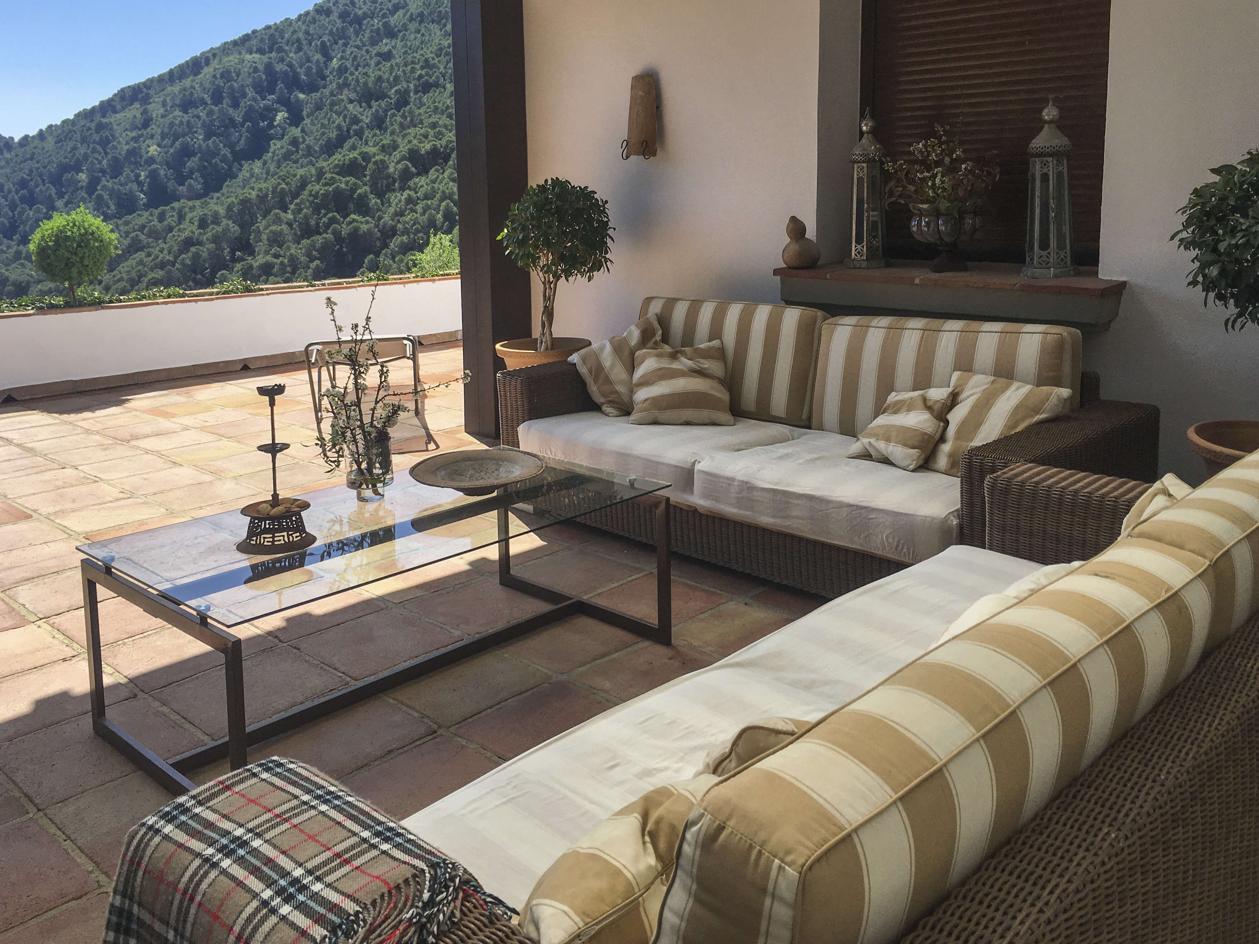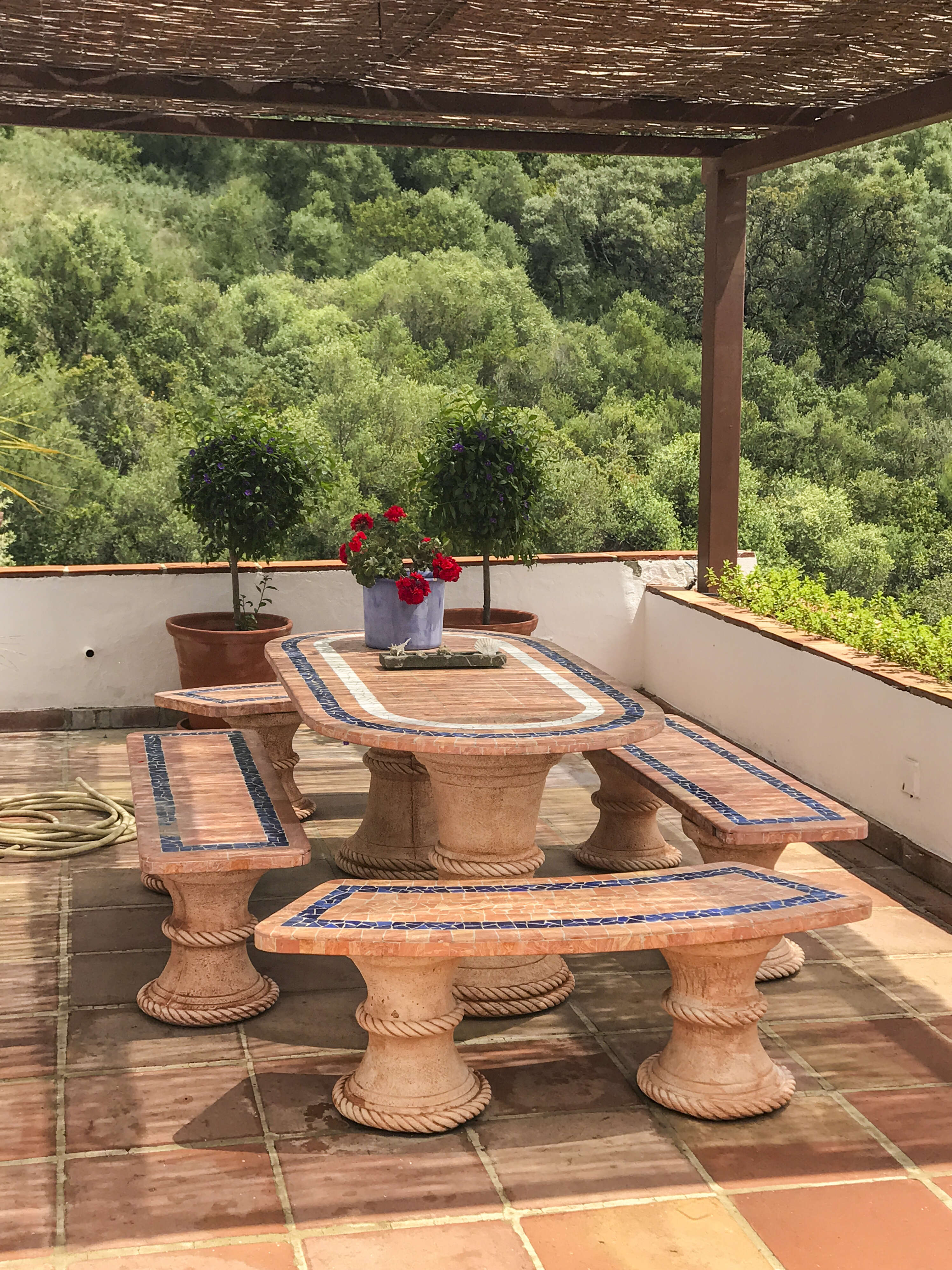 From the covered terrace with hip lounge set you have a breathtaking view of the surrounding hills and greenery of Andalusia. Undisturbed nature without another house or street in sight. If you look closely, you can sometimes see a beautiful black horse or friendly donkey grazing on the hillside who live in the valley. The terraces also give out onto the lower private pool.