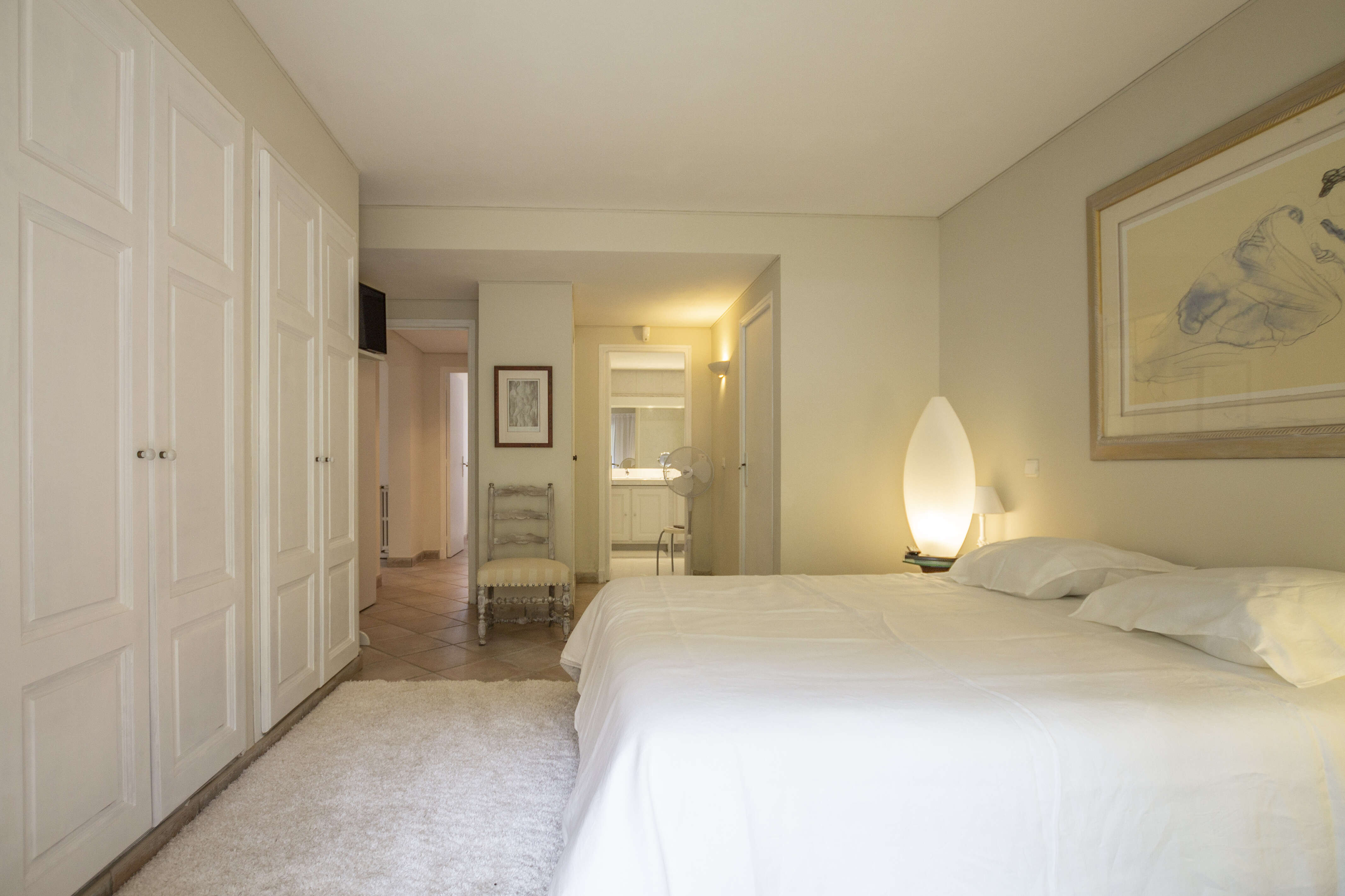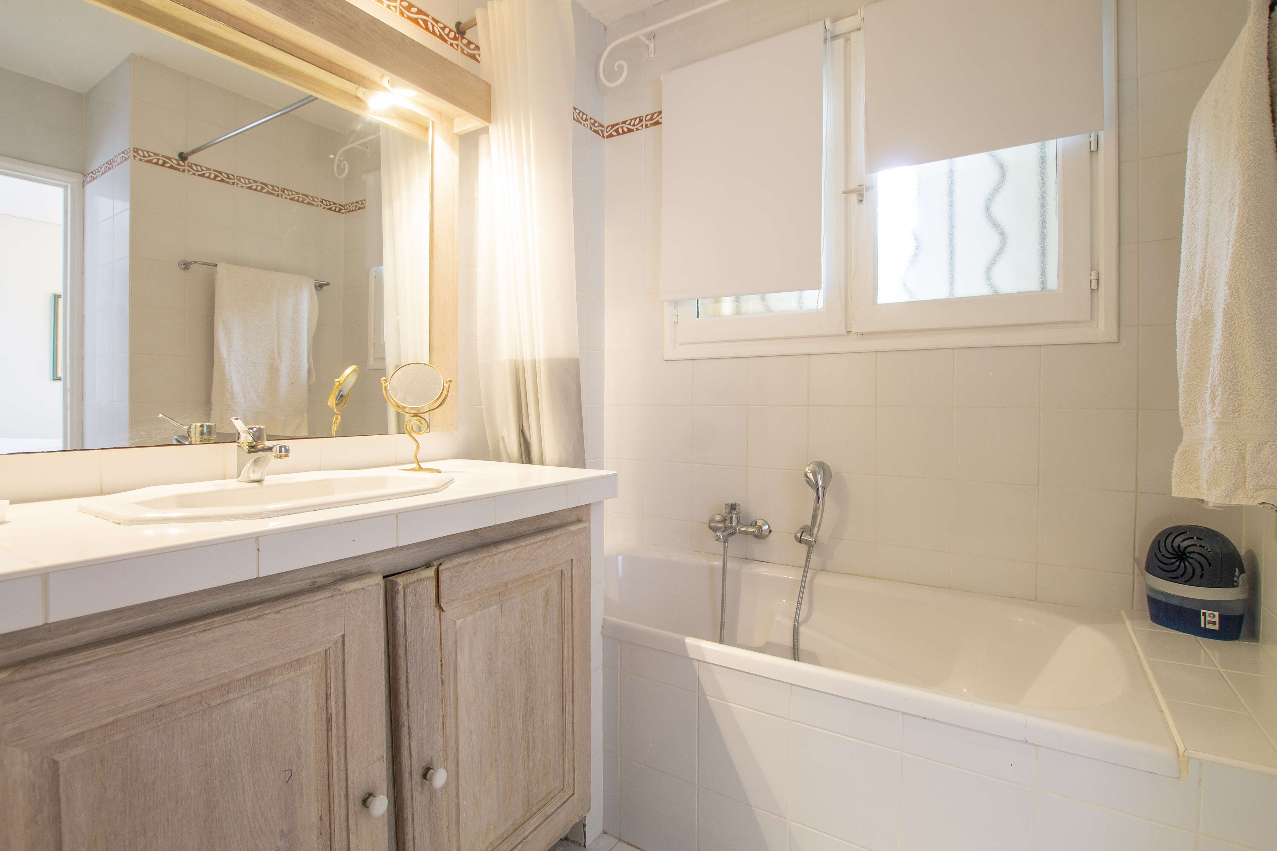 On the ground floor are the kitchen, storage room, a spacious living room with dining area and 2 bedrooms, each with its own bathroom and toilet. The master bedroom opens directly onto the terrace and garden. On the first floor is the 3rd bedroom with washbasin and separate toilet. All bedrooms have a double bed, fitted wardrobes, mosquito windows and a fan. In the bedroom under the roof, there is air conditioning.