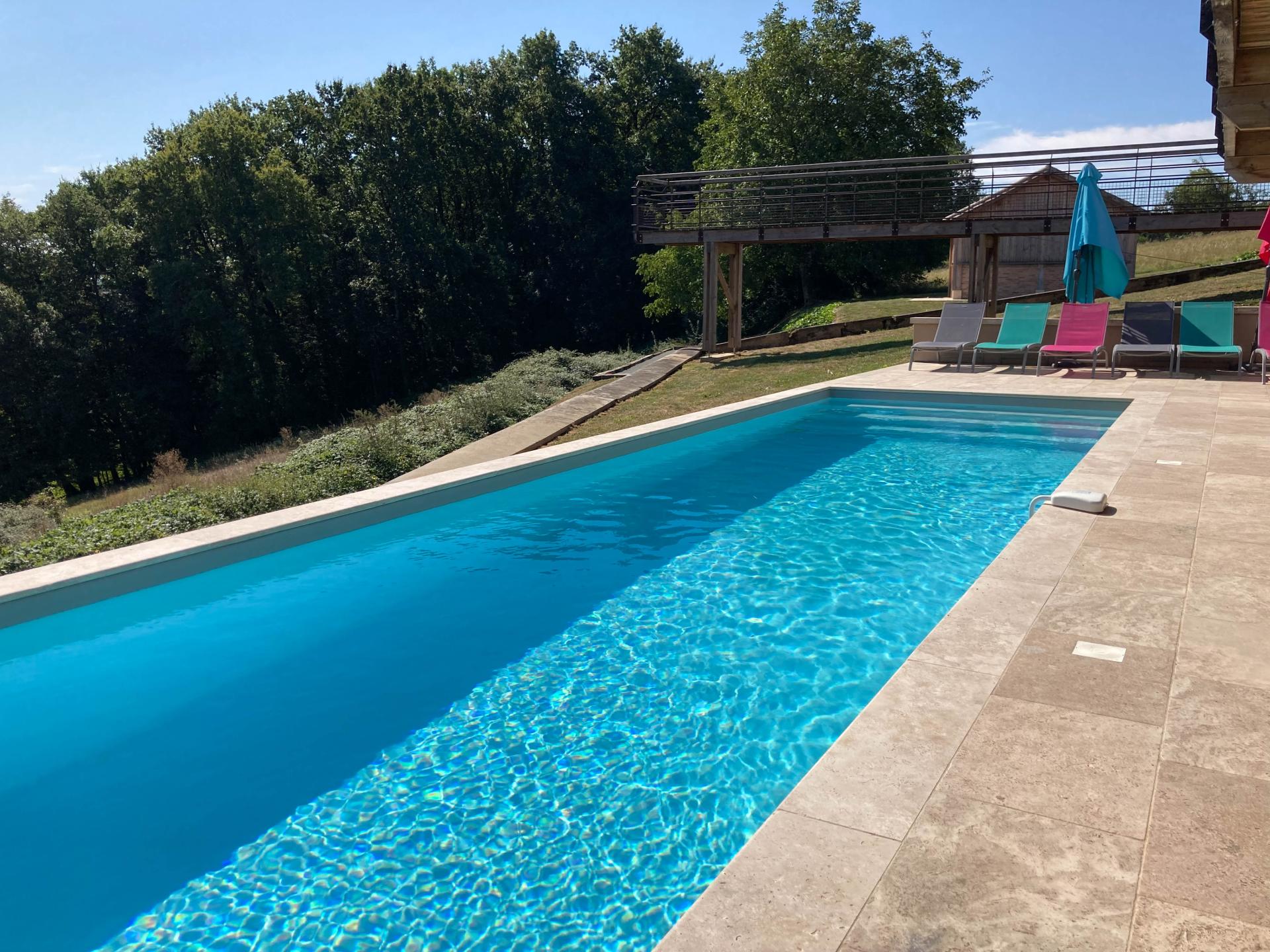 This holiday home with heated pool and jacuzzi in Fouleix is a beautiful architecturally renovated house. Via a wooden floating track, which opens onto the surrounding valley, you reach the holiday home in the middle of the woods. The holiday home itself enjoys large spaces that have a lot of light. The large open kitchen is fully equipped. From the different floors you have access to a large terrace with a panoramic view. On the ground floor there are 3 large bedrooms that open onto the spacious garden and the large heated swimming pool (water alarm, 12 x 3 m, depth: 1.5 m, open from june to Sep)