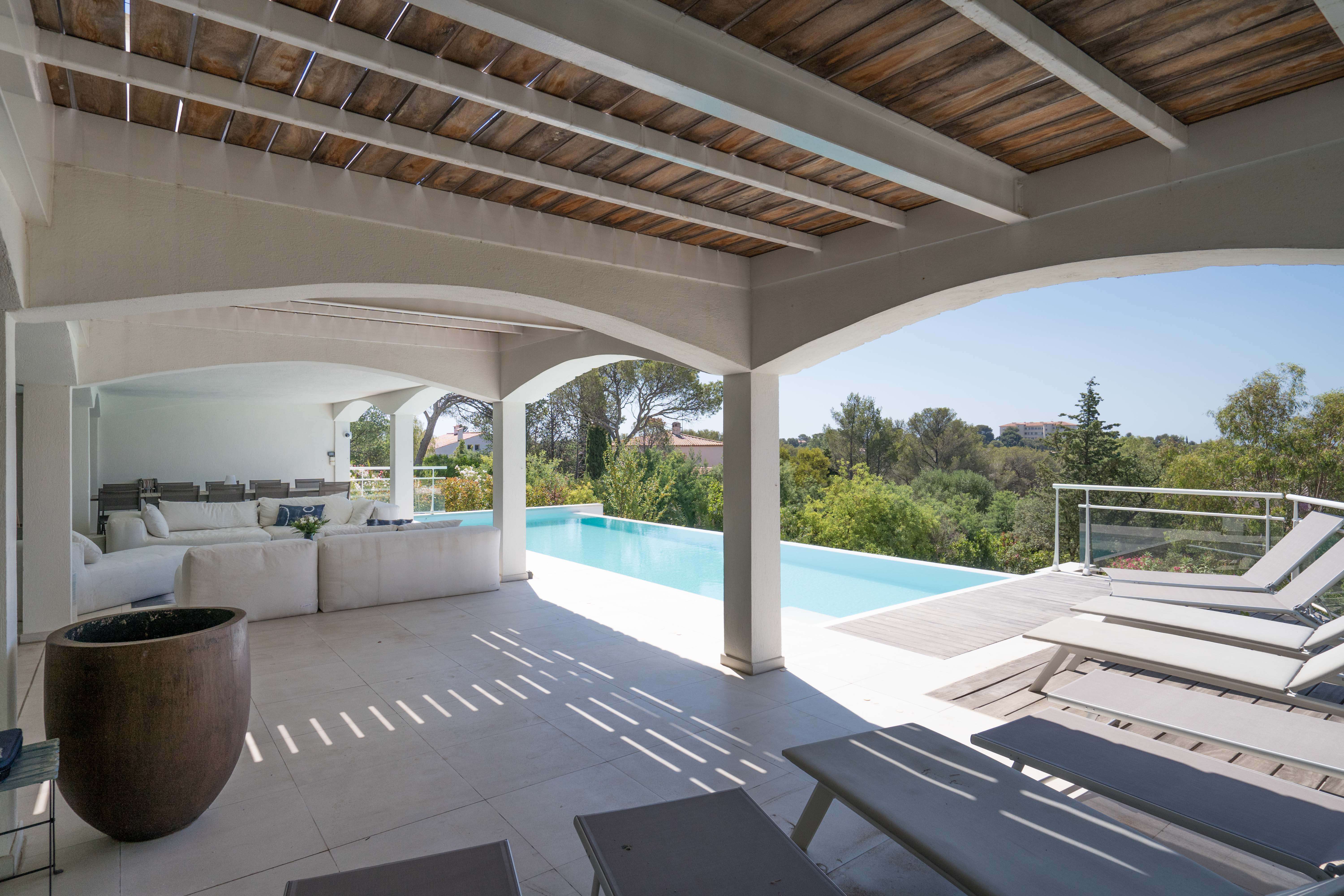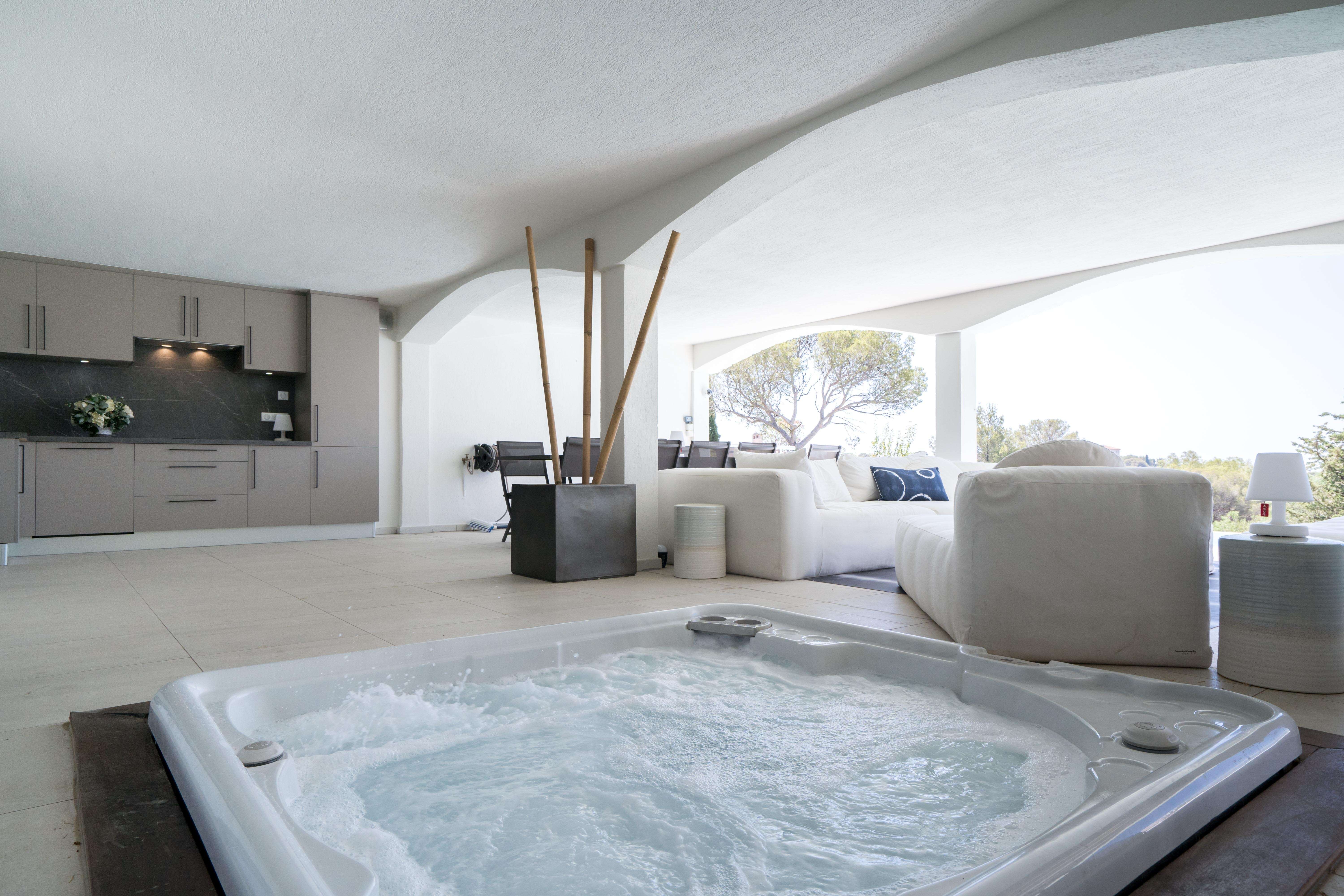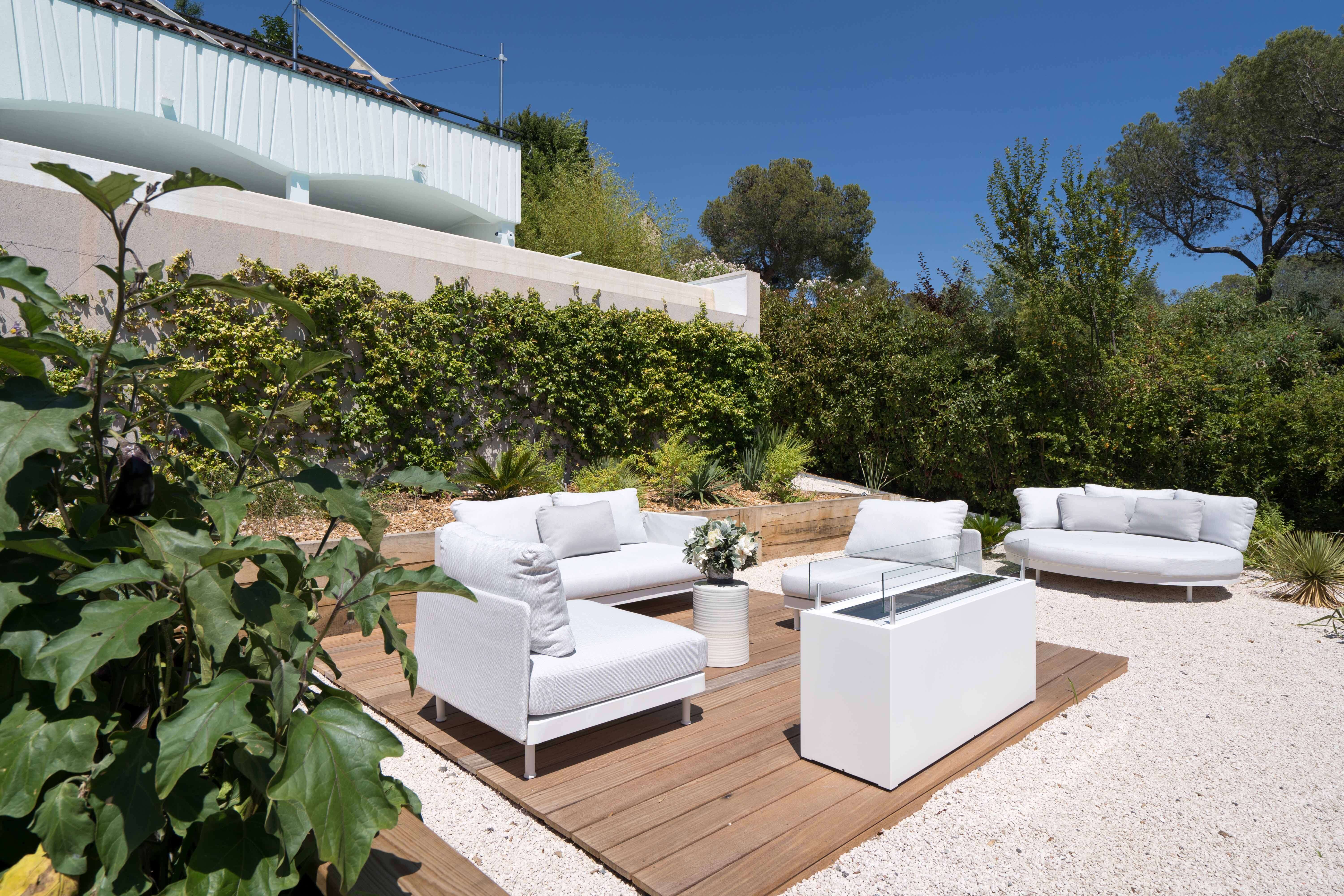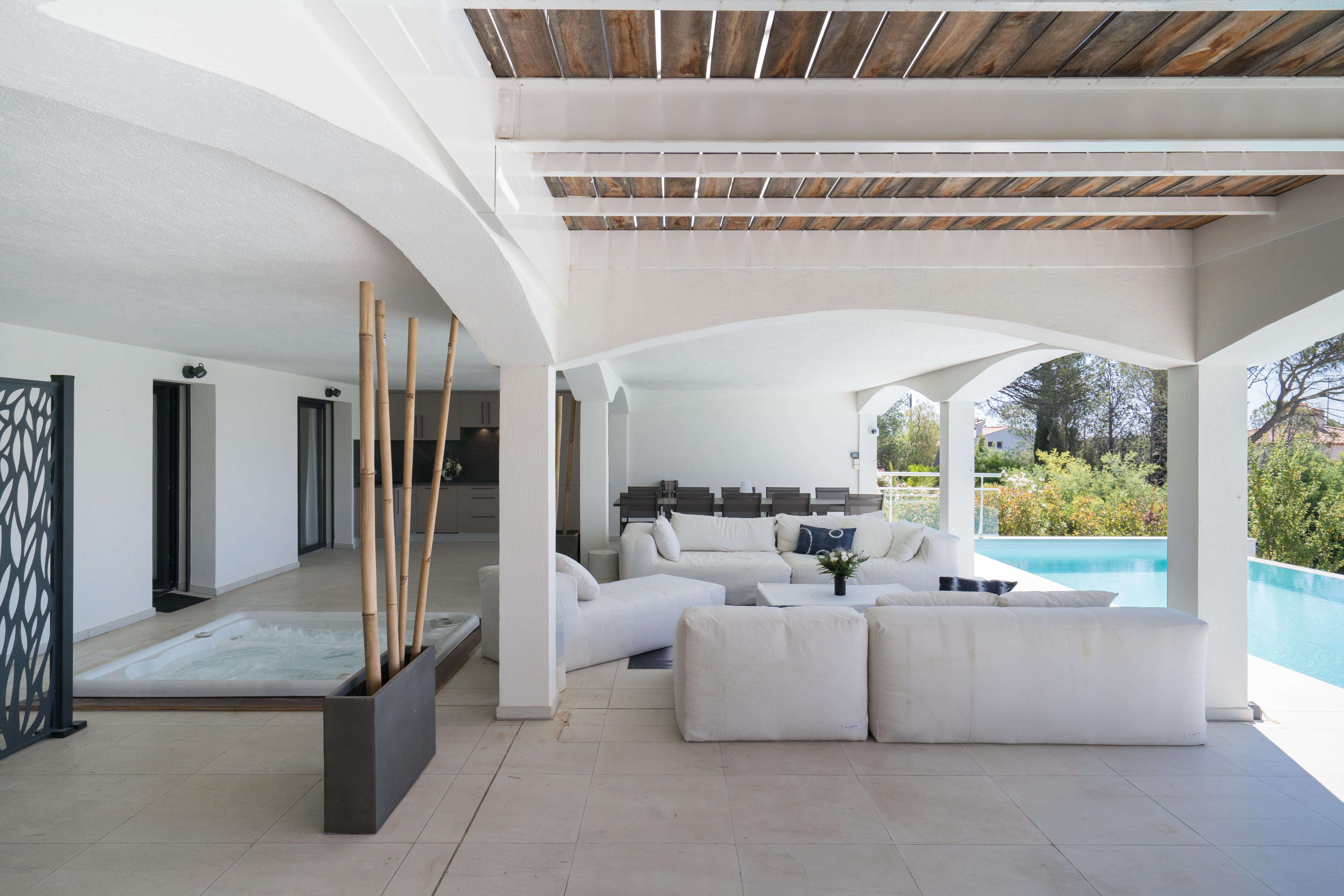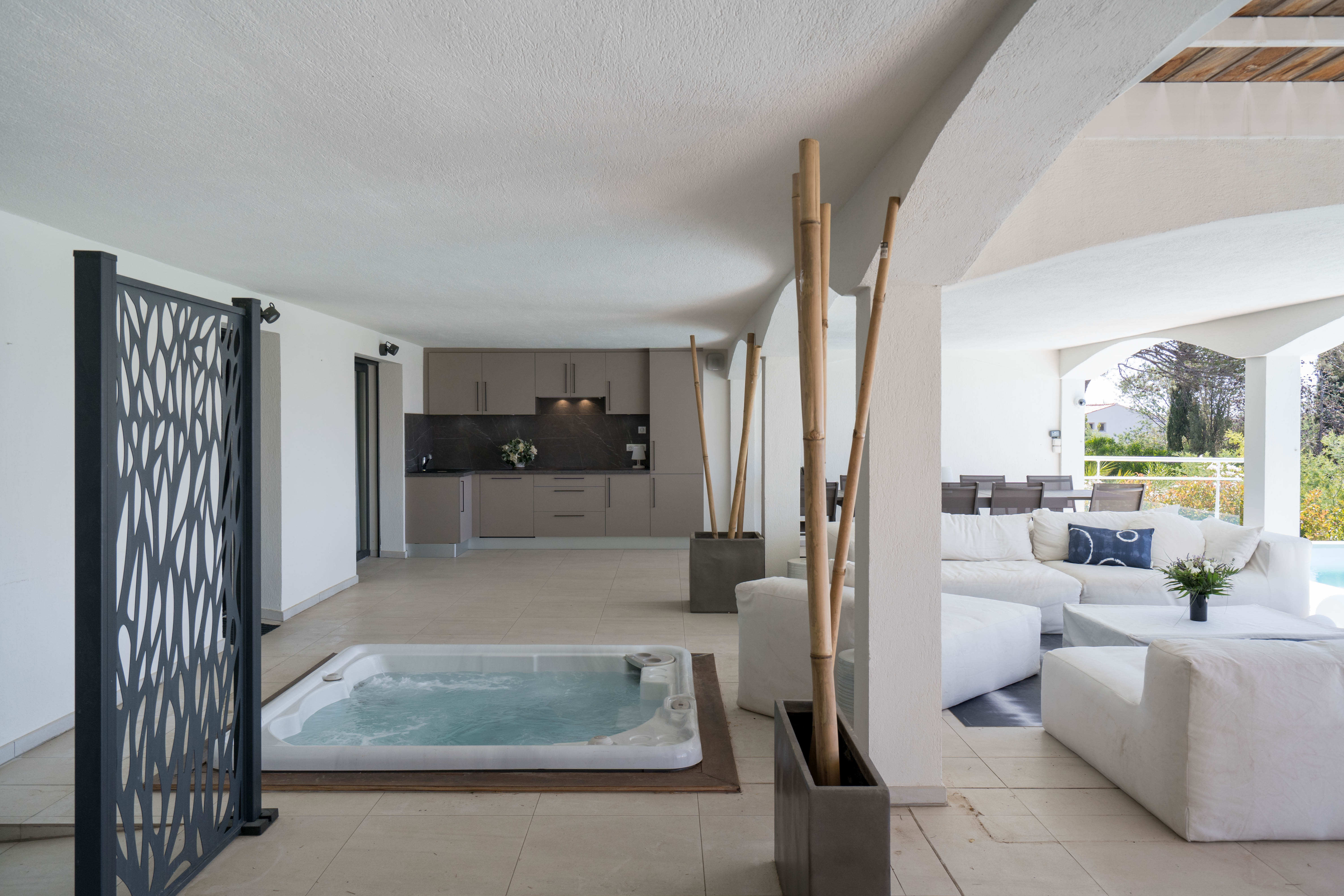 Outside, you will find all the necessary furniture to fully enjoy the beautiful high-season in the south of France. You will also find a second open kitchen and an outdoor living area that directly overlooks the jacuzzi and the private pool (5x12m, depth : 1,70m), which can be heated year-round if needed.
