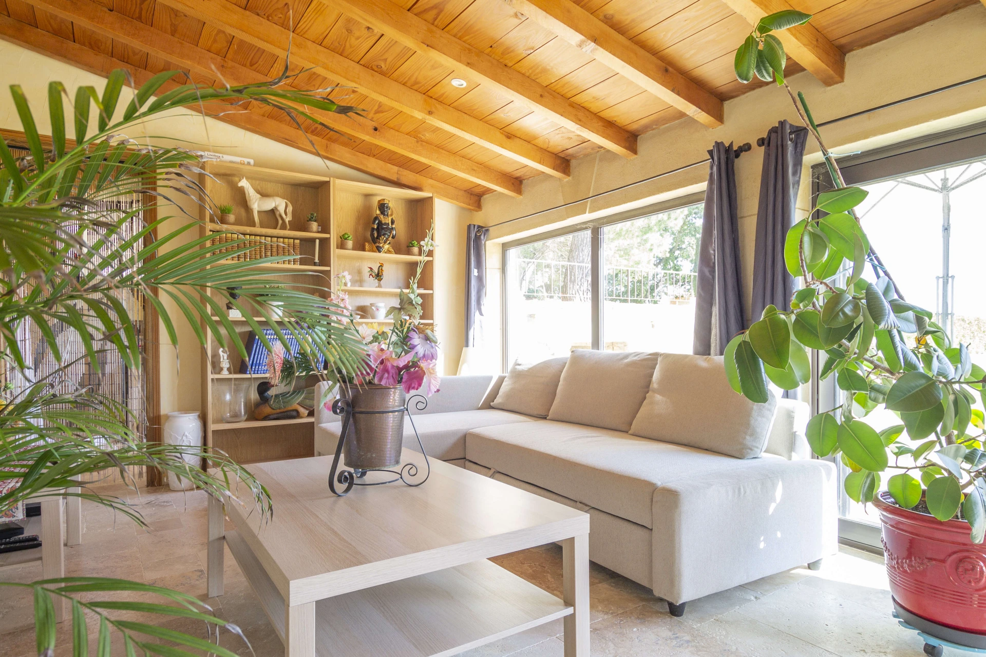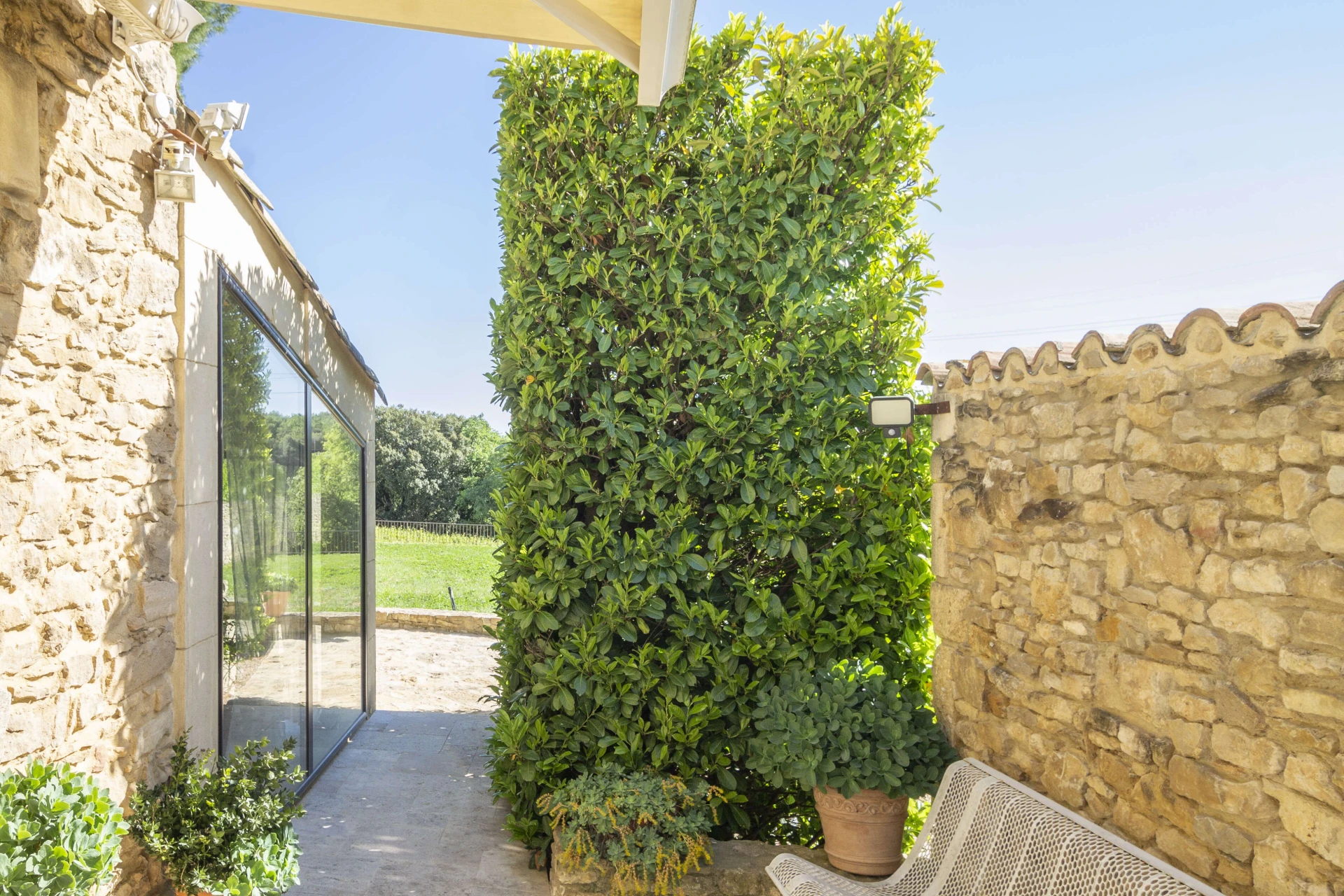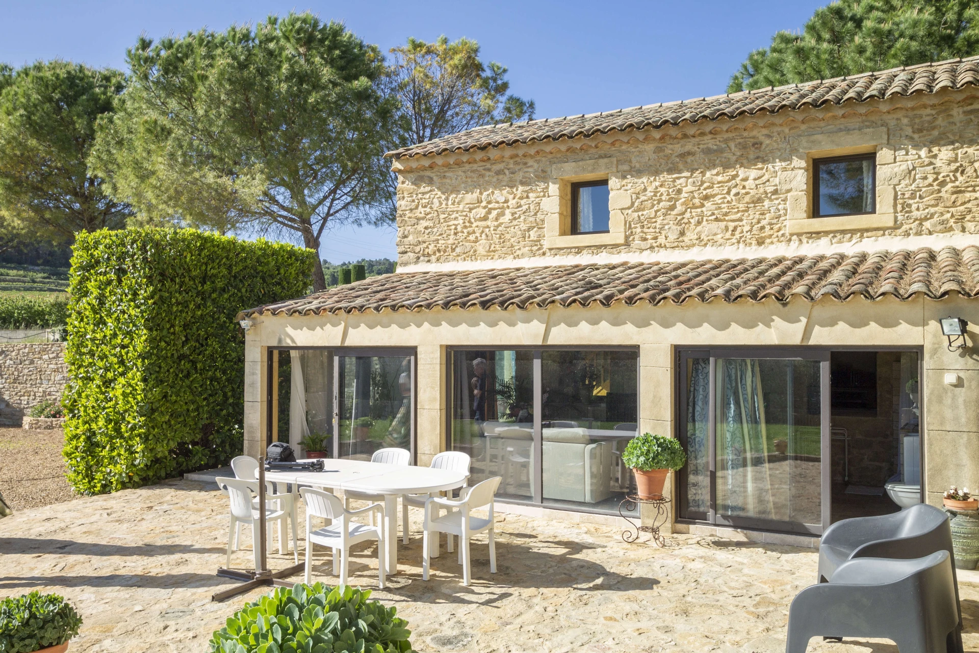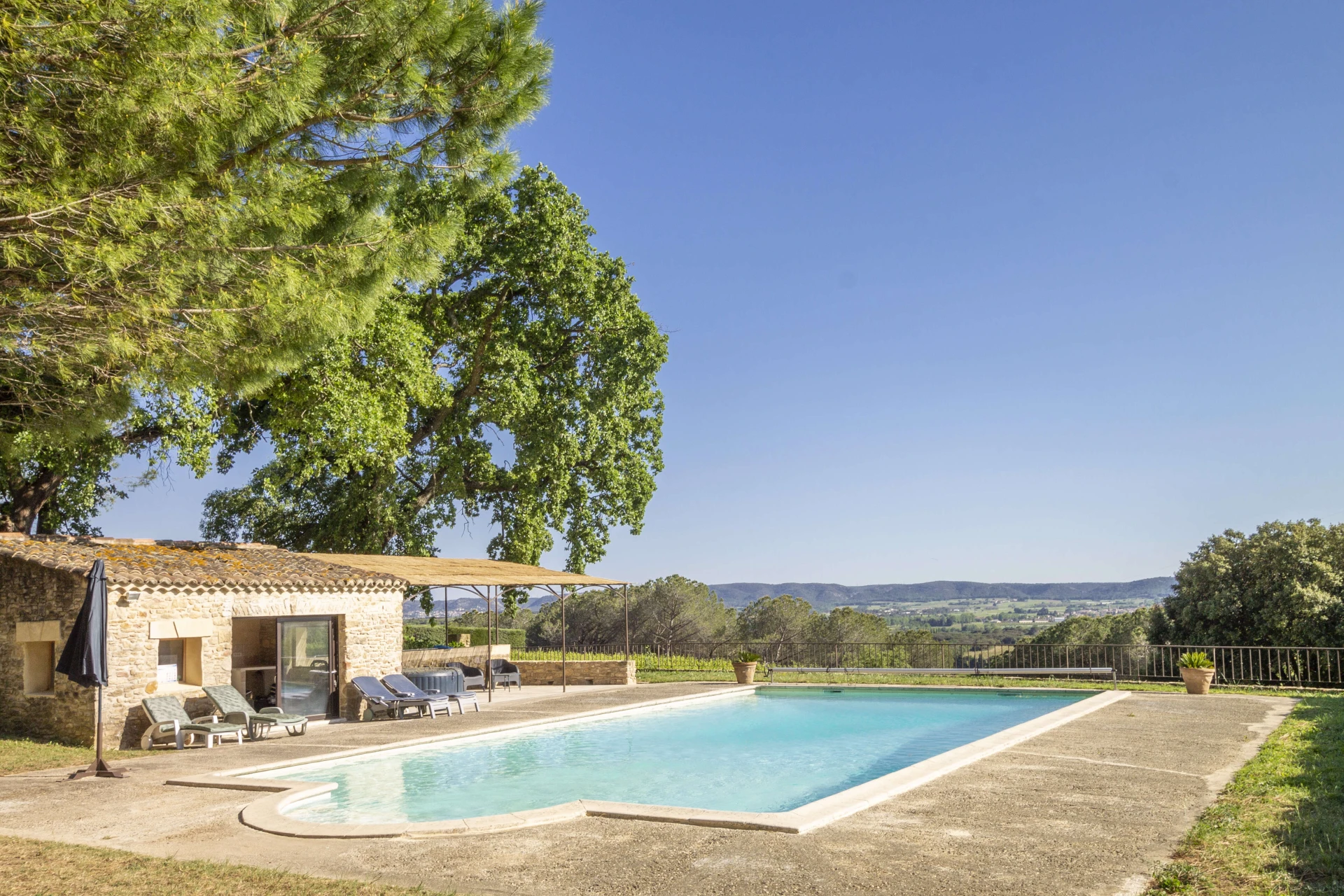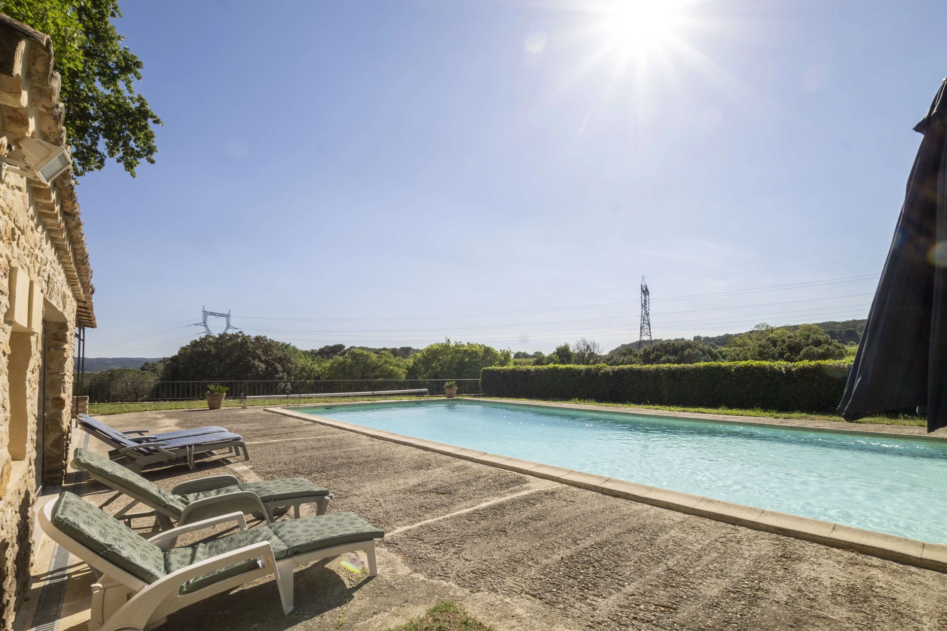 The private swimming pool (with steps, lighting, 15mx7m, depth 2.5m and hydromassage) is enclosed and suitable for children. Ideal for a refreshing splash! The owner can also use the pool, but discretion is assured. The pool house is equipped with a kitchen, dining area, shower and toilet. Enjoy a delicious barbecue from the sunny terrace or settle down in a lounger by the pool to enjoy a good book or a tasty aperitif.