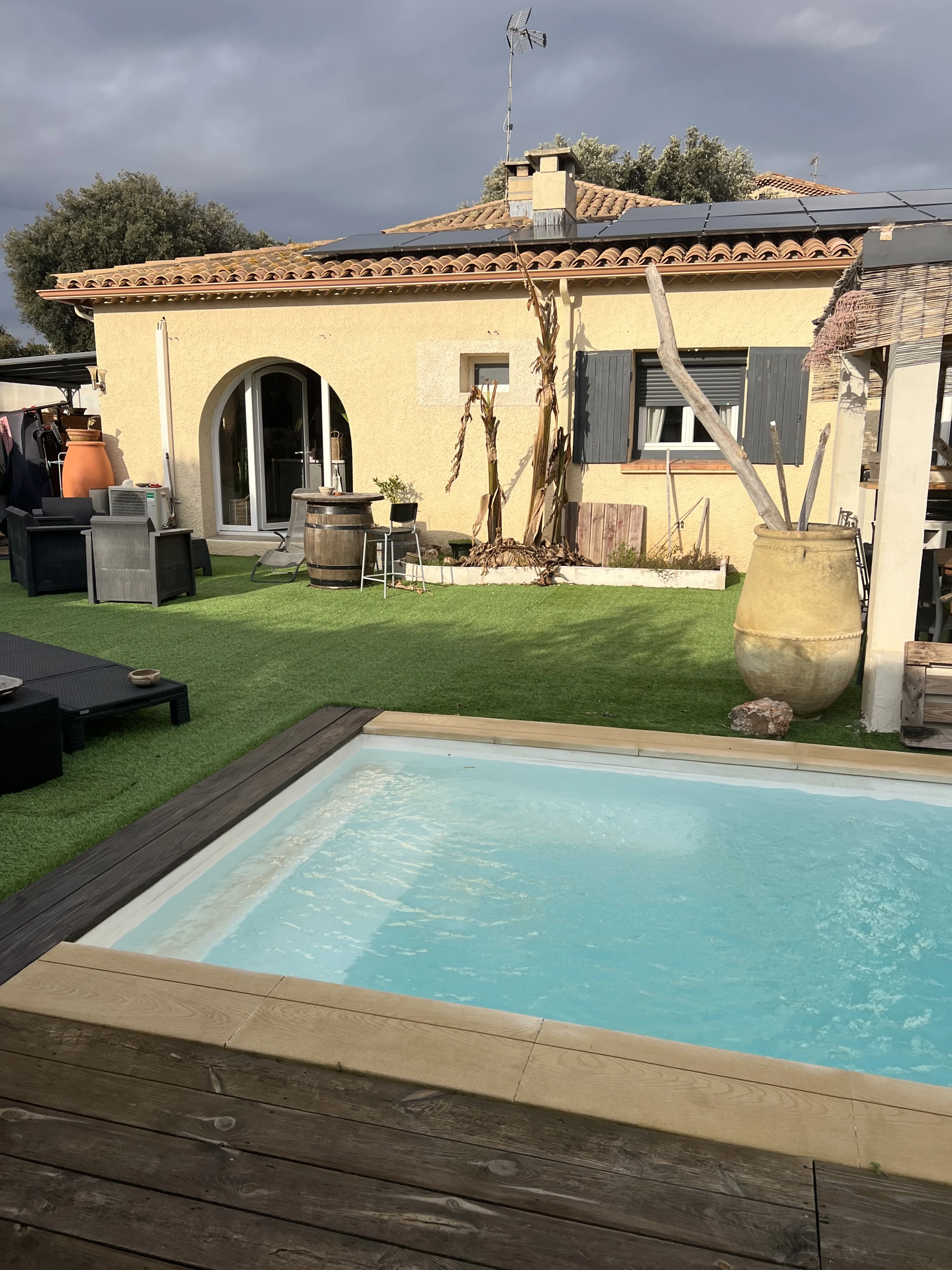 The journey continues outside, in the beautifully landscaped garden with exotic plants and banana trees. A pleasant private swimming pool (4 x 2.5 m, depth 1.50 m), treated with salt, invites you to enjoy refreshing and relaxing moments. The pool is equipped with a safety alarm and atmospheric night lighting. Garden furniture, deck chairs, a plancha grill, and a beautiful outdoor table are at your disposal to fully enjoy lunches and dinners in the open air. There is also private parking for two vehicles.