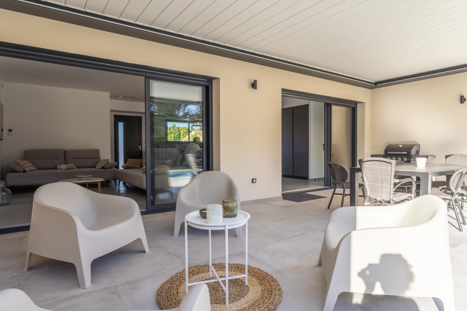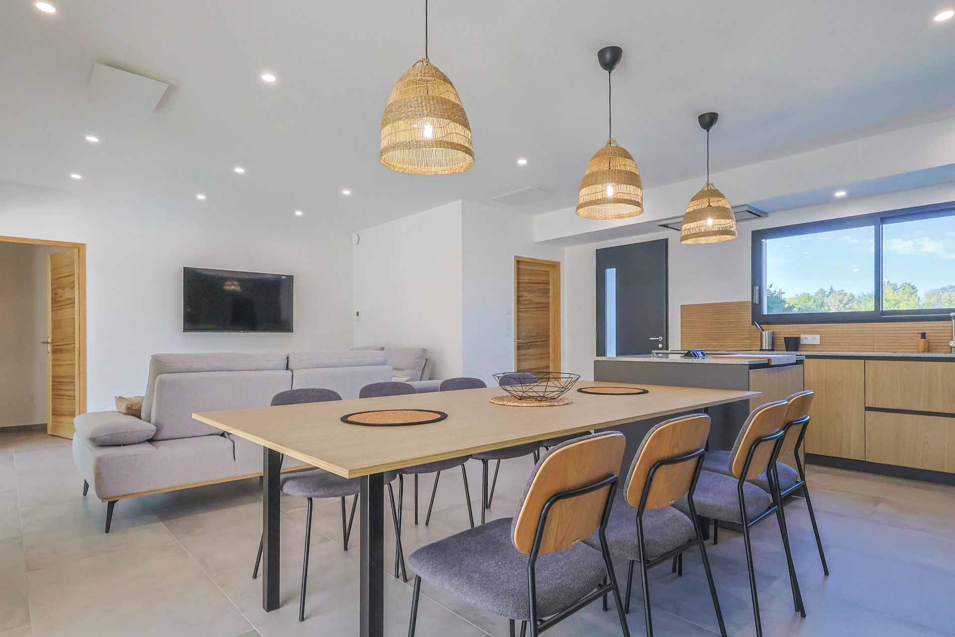 The house features 4 bright bedrooms, each with its own private bathroom, TV, and individually controlled air conditioning for an optimal comfort. The spacious living area includes a fully equipped open kitchen with a central island and a large dining table. Wide glass doors connect the living room to the covered terrace and the pool, creating a perfect indoor-outdoor flow.