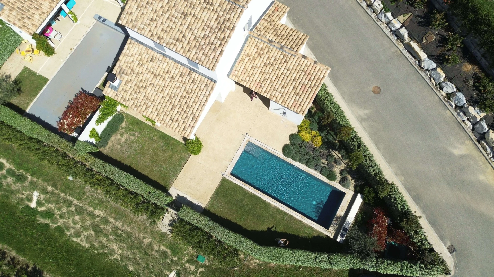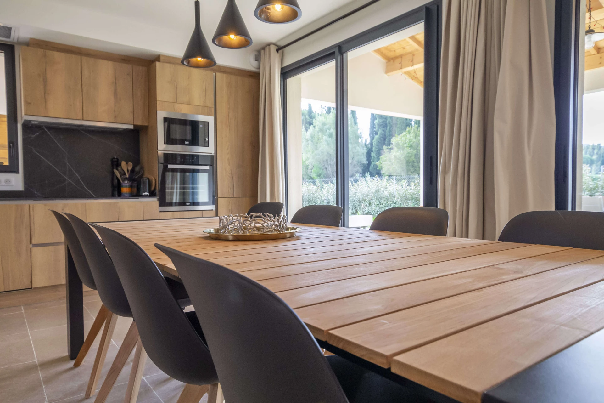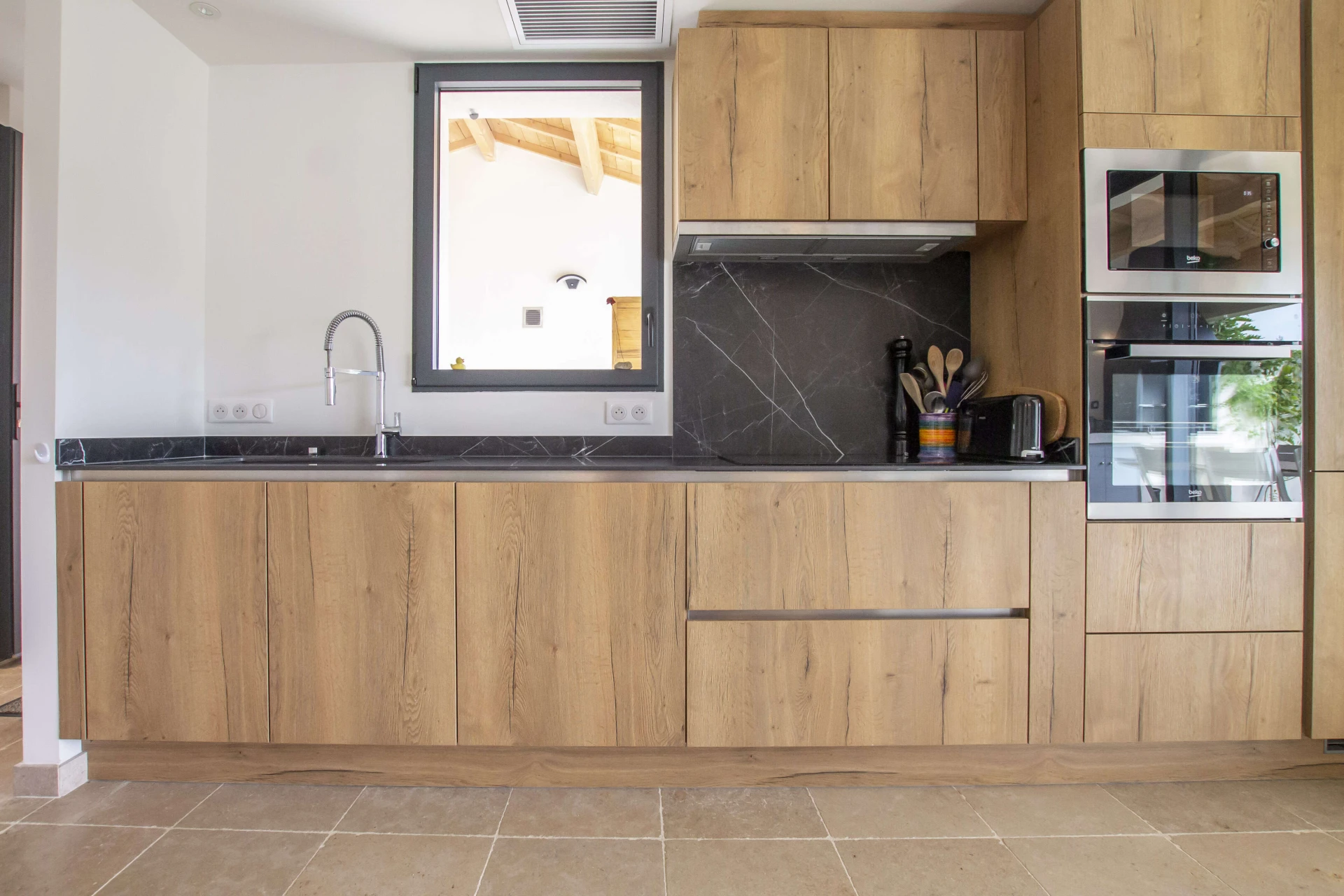 You will also like to stay here outside the high season thanks to the heating of the swimming pool. From the terraces you look out on a huge park that is immediately accessible from the garden with a gate. Here you will find several football fields, a playground and plenty of space to play or walk. The neighbors from the same neighborhood also have direct access, so it is a nice hotspot to get to know each other, but it is certainly not too busy. A paradise for children.
