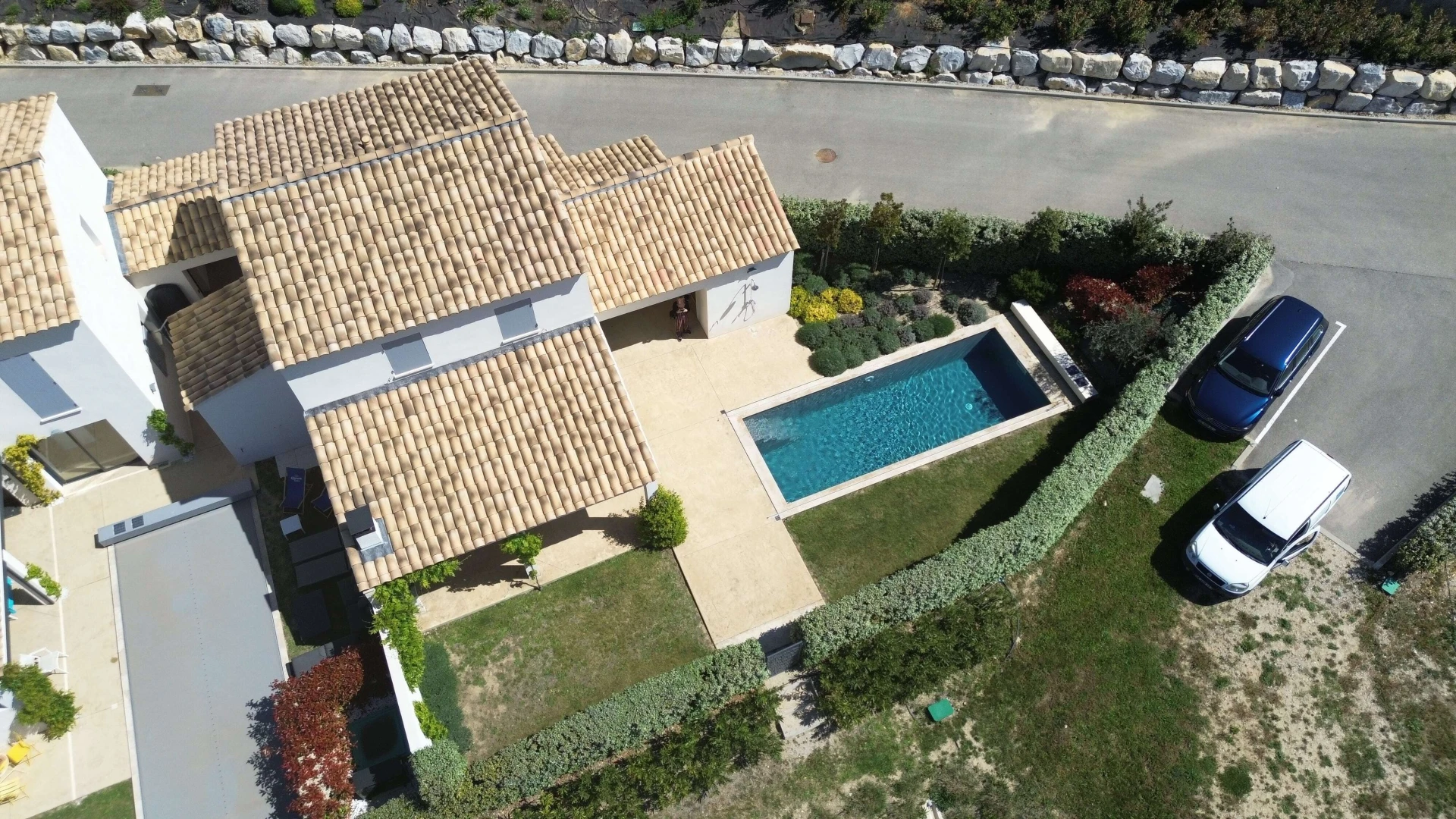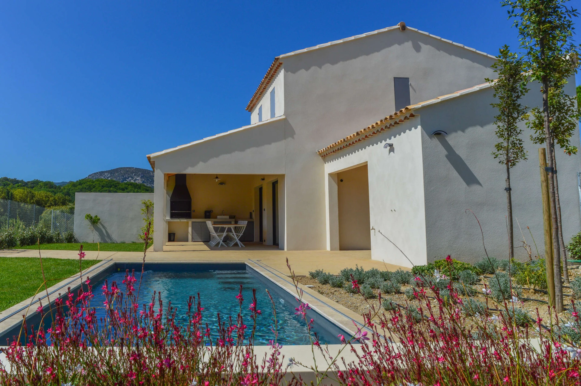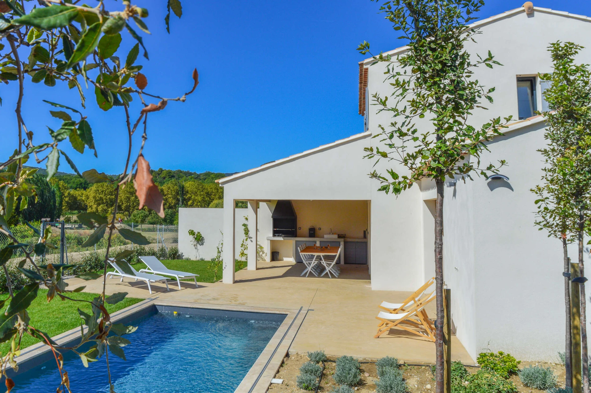 The outdoor kitchen with a large barbecue is located under the covered terrace, where you can enjoy aperitifs on the balmy summer evenings and a delicious meal with a view of the swimming pool (8x3.5m-heated). The garden lighting and poolside lighting create an extraordinary atmosphere at night.