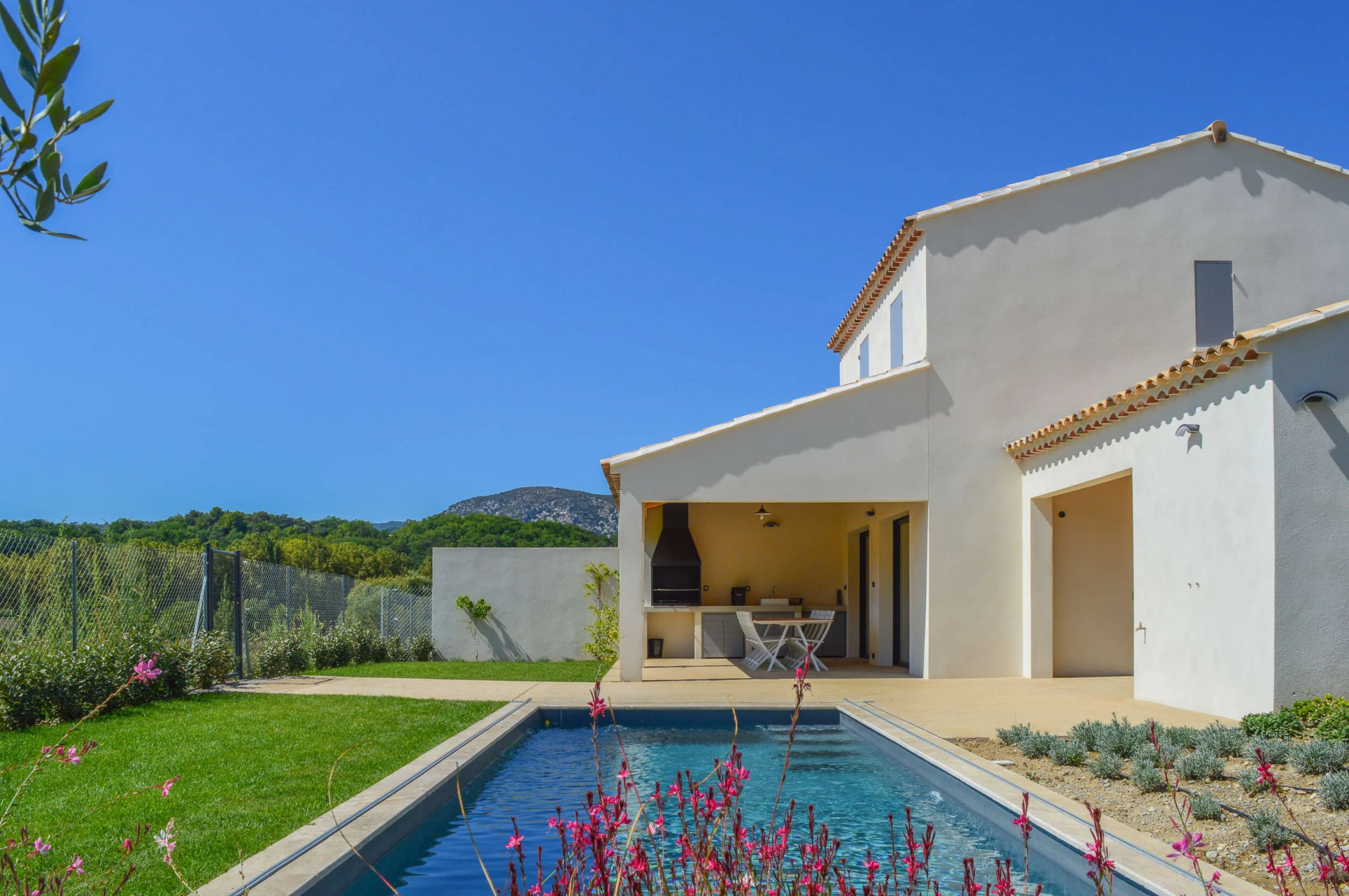 The holiday home within walking distance of the village Malaucène benefits from a modern and very comfortable interior. The beautiful living room and modern kitchen open onto the covered terrace, the garden and the private pool. The bedrooms are upstairs and all have air conditioning. The interior is very tasteful with beautiful, durable materials.
