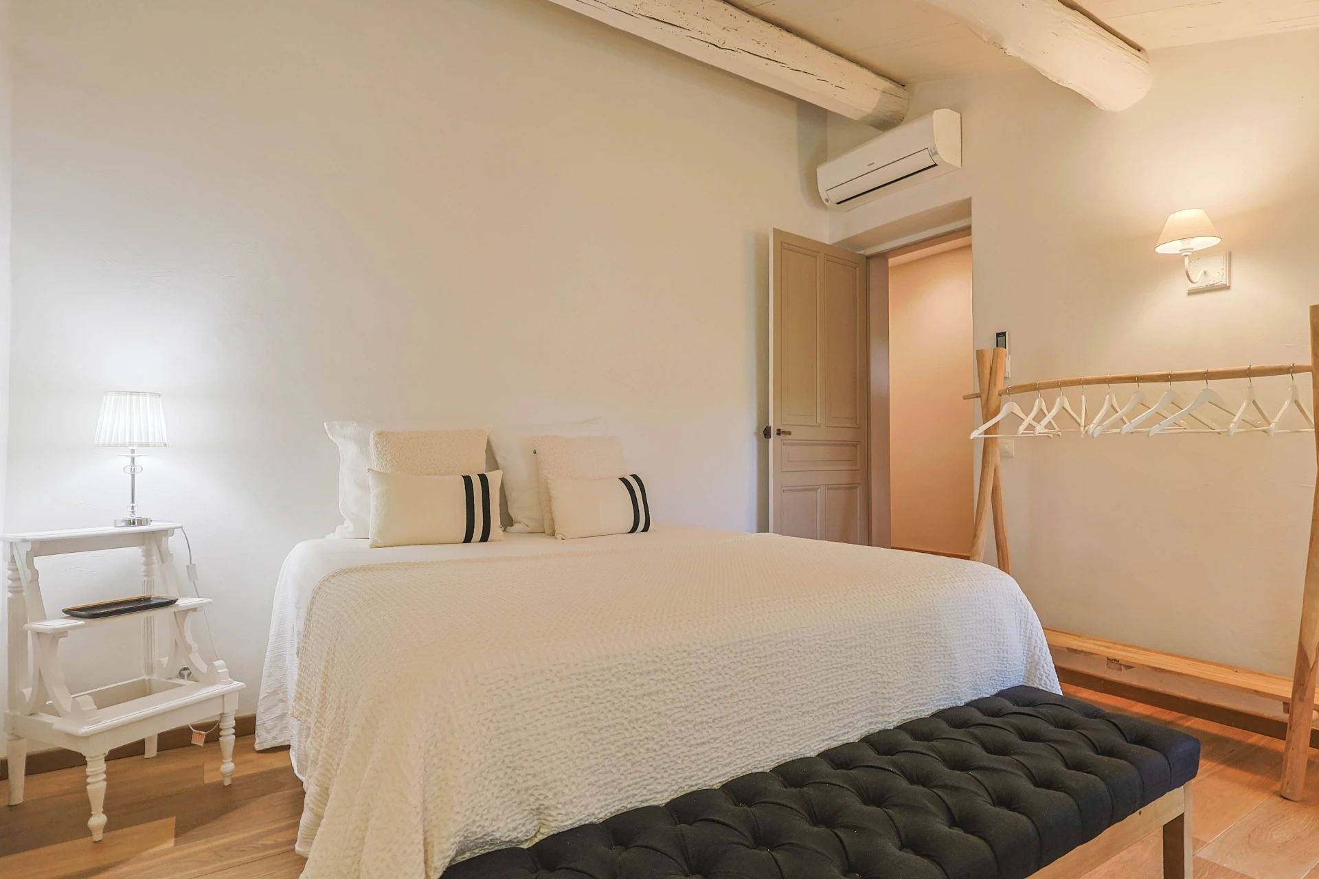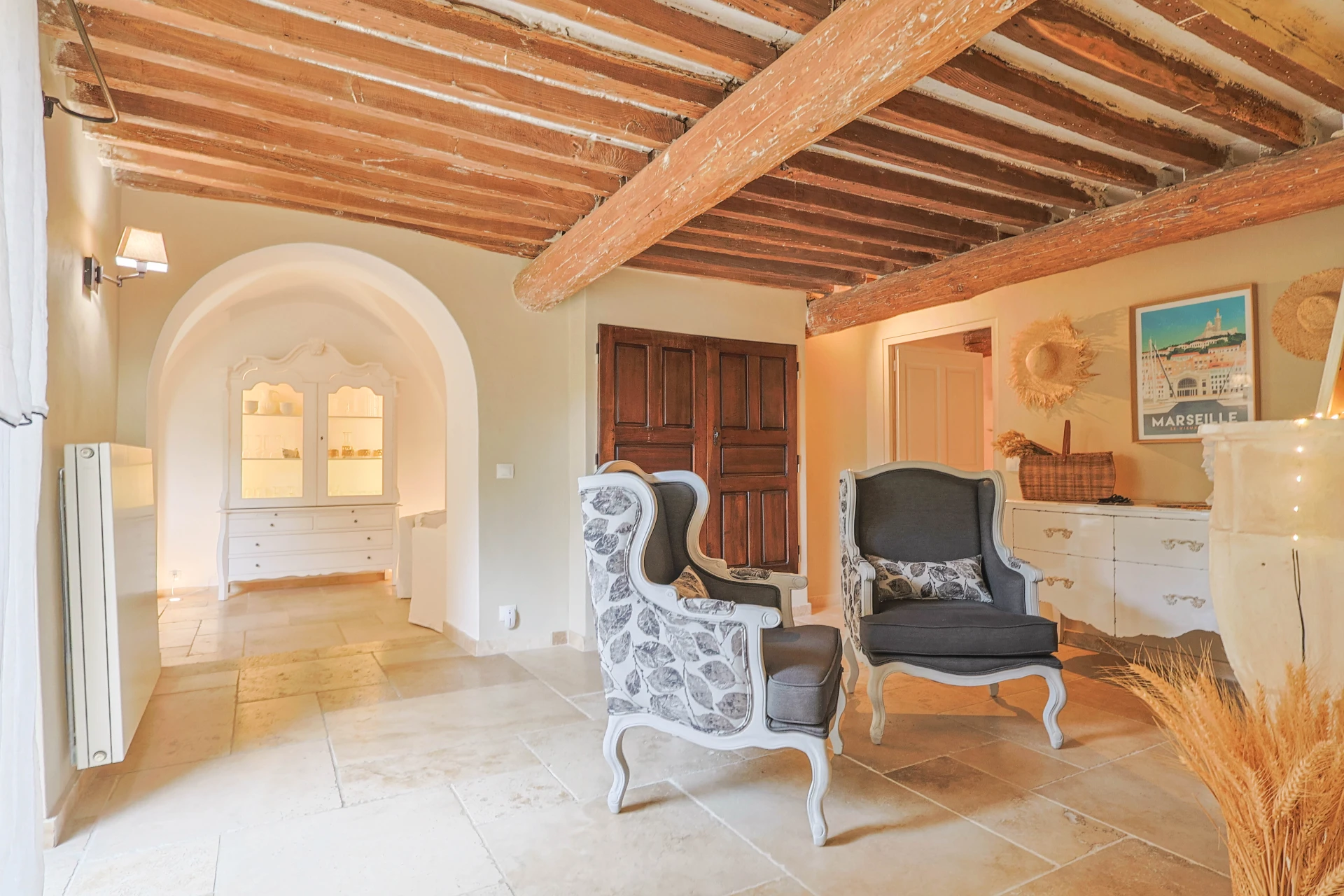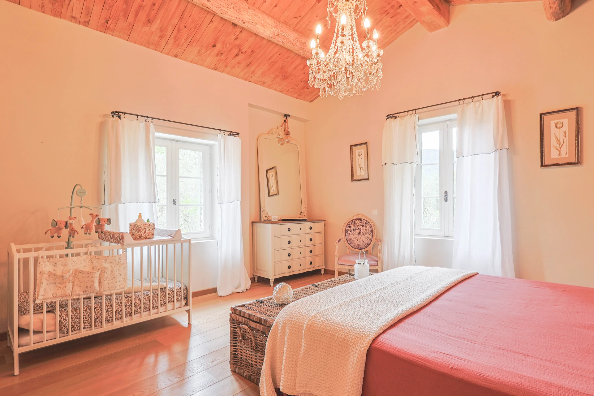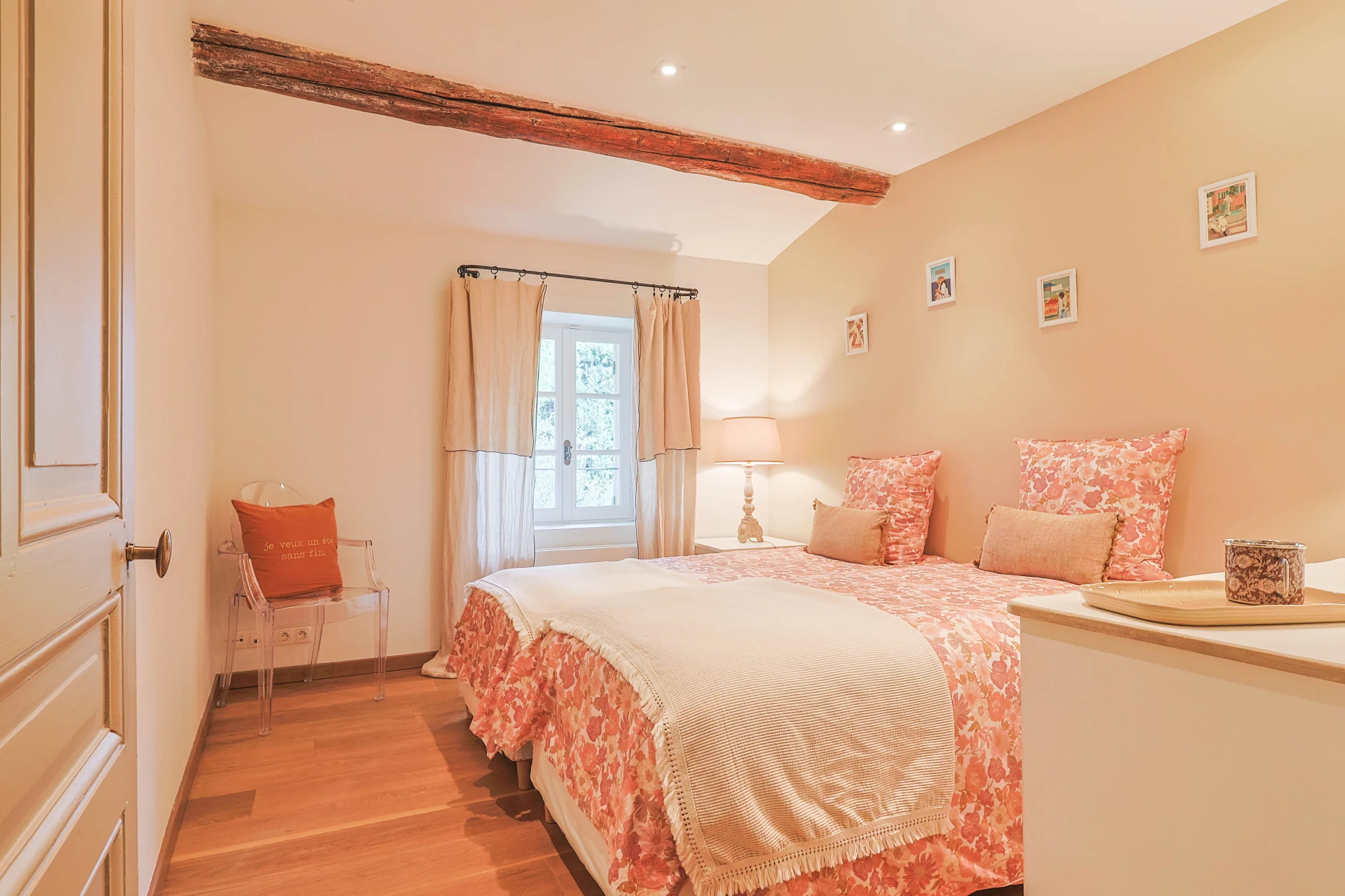 This cosy house has five bedrooms, decorated in soothing neutral tones. The wooden furniture, with its clean, modern design, adds a touch of sophistication. The ground floor has elegant tiled floors, while the first floor has solid parquet for a cosy atmosphere. The property is fully fenced, including a pool alarm. The villa is within walking distance of the village.