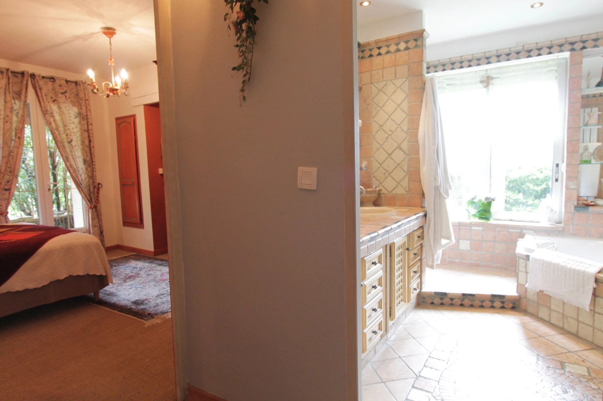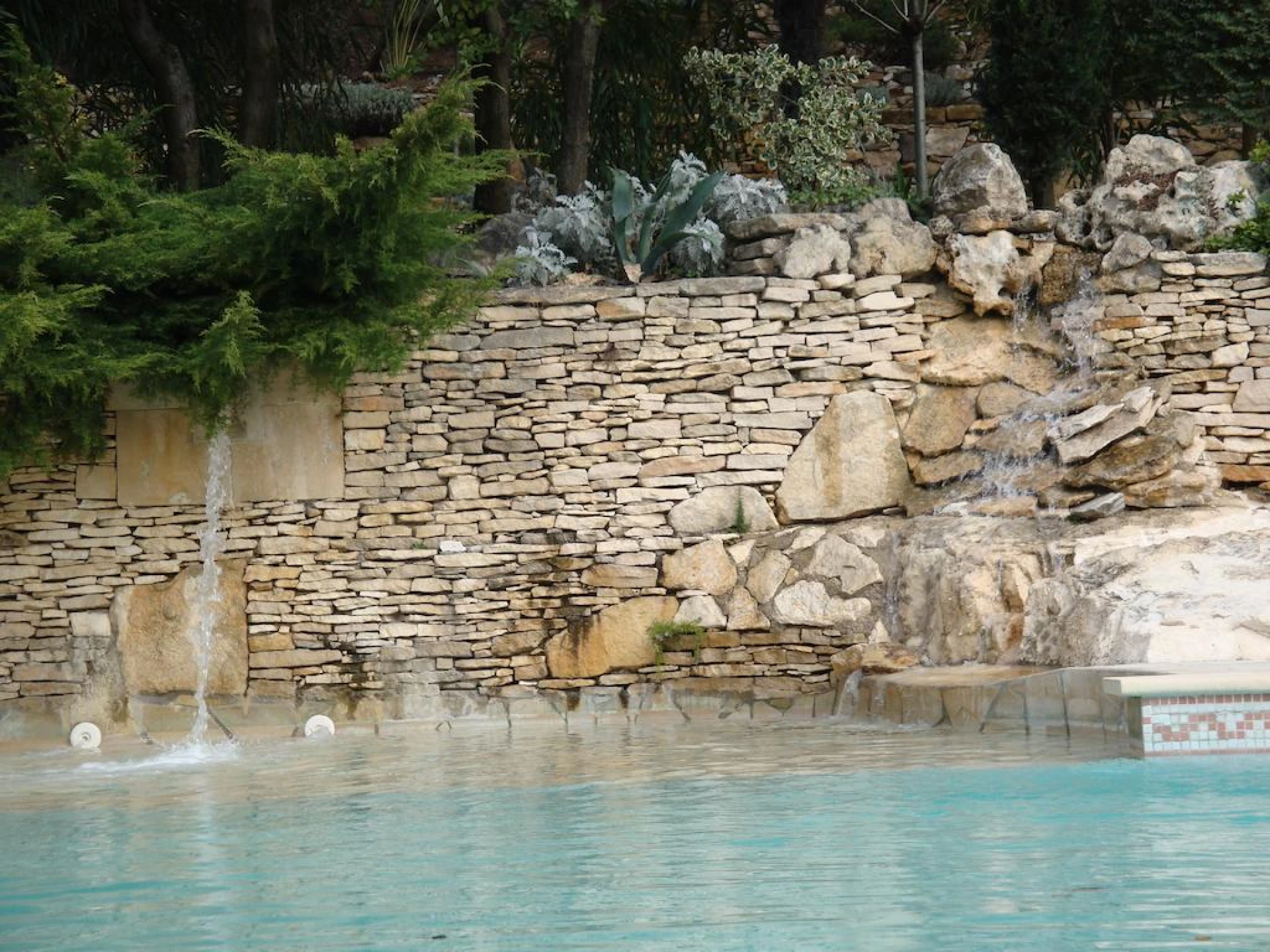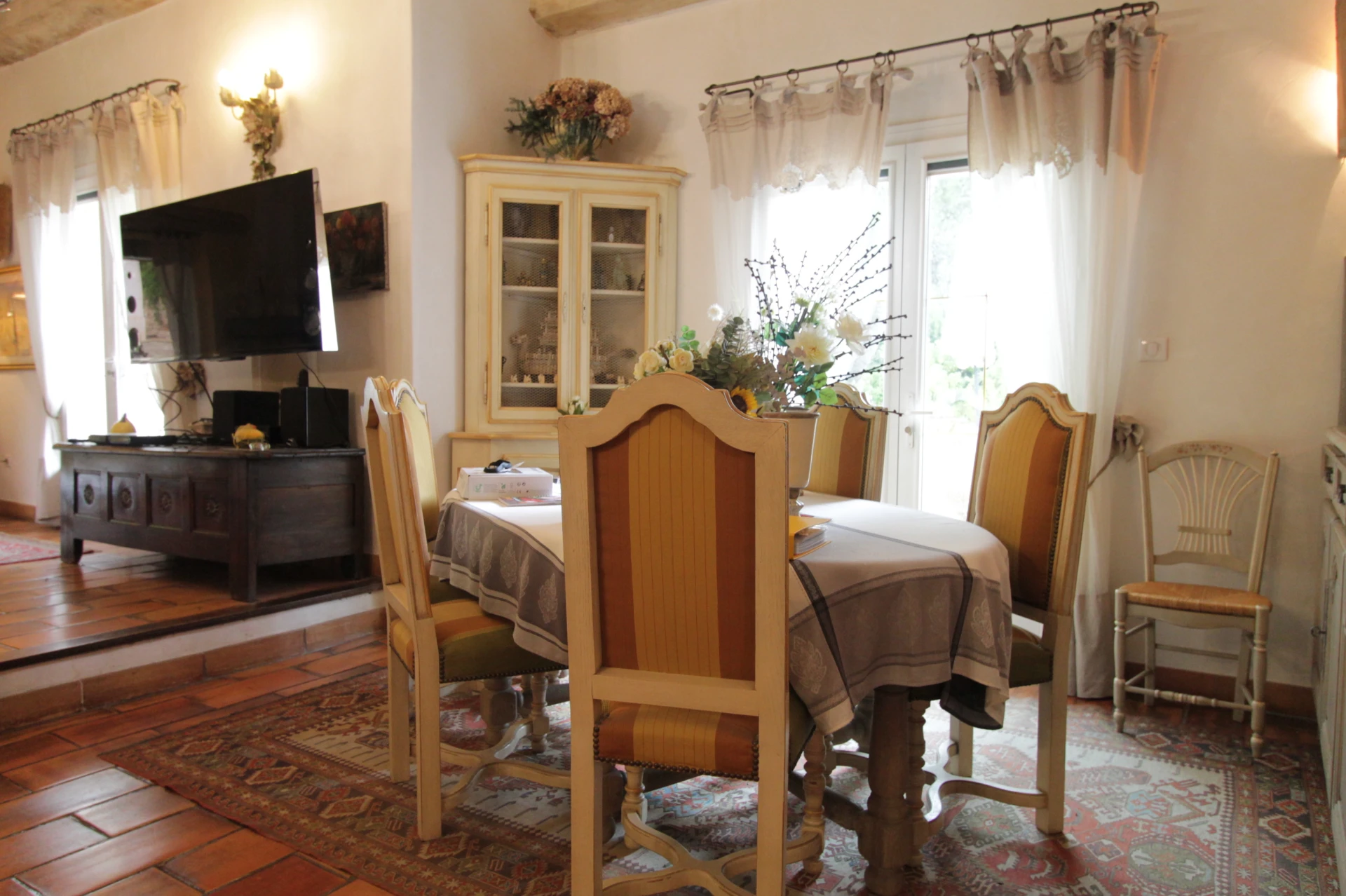 This holiday home in Provence with swimming pool is very charmingly decorated, combining both modern and authentic furniture. The kitchen is spacious with a large beautiful cooking island and teppaniaki, induction and stove present. The kitchen appliances are of superior quality. The two doors in the kitchen open onto a nice terrace. Some other nice advantages are the presence of 3 different kinds of coffee machines, a beer tab (you have to buy the beer yourself), and several spices and basic necessities are available for the tenants. From the living room you have a nice view of the infinity pool. There is a very large television with built-in speakers. There is also a bedroom en suite of 100m2 which is also luxuriously furnished.