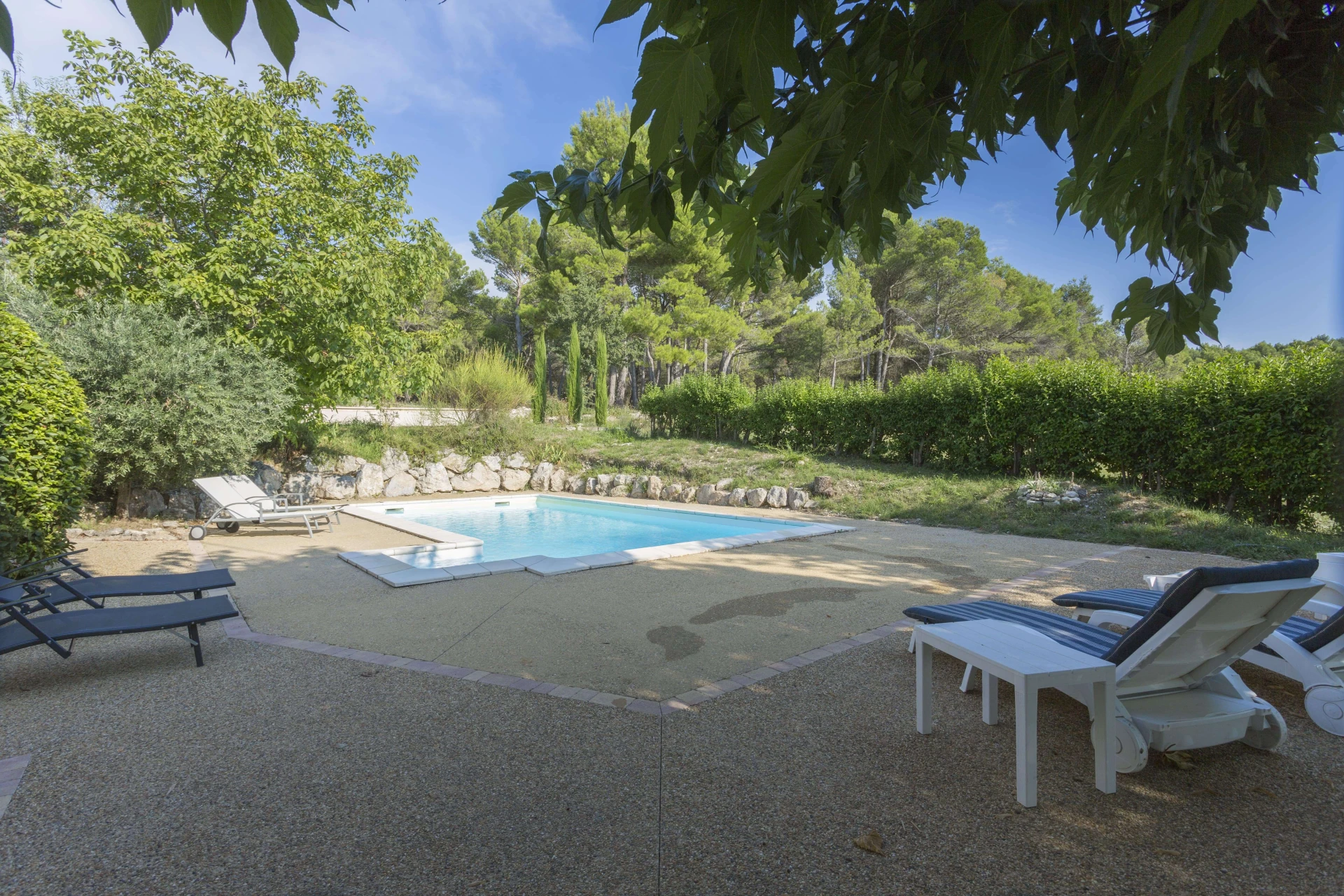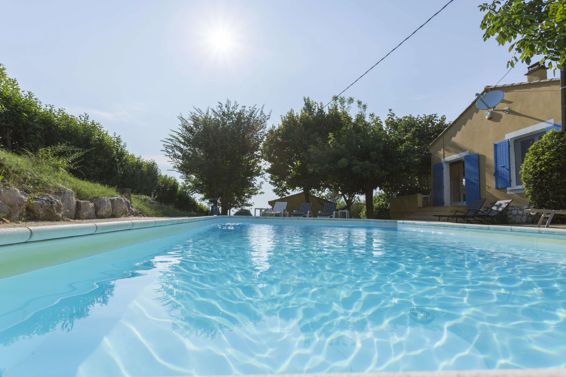 There is a huge garden with a beautiful private swimming pool (9x4.5m 1.6m deep with stairs in the swimming pool, open from 1 May to 30 Sept, illuminated terrace.). The holiday home is on the side of a hill with a view of Châteauneuf de Gadagne at 20 km. From the three terraces you can enjoy the sun at different times, such as a delicious breakfast by the pool, In the afternoon, you can relax by the pool and spend the evening on the terrace of the house or on the terrace of the studio overlooking the vineyards, where you can admire the superb sunset. If you prefer the shade, you can sit under the canisses or in the shade of the trees.
