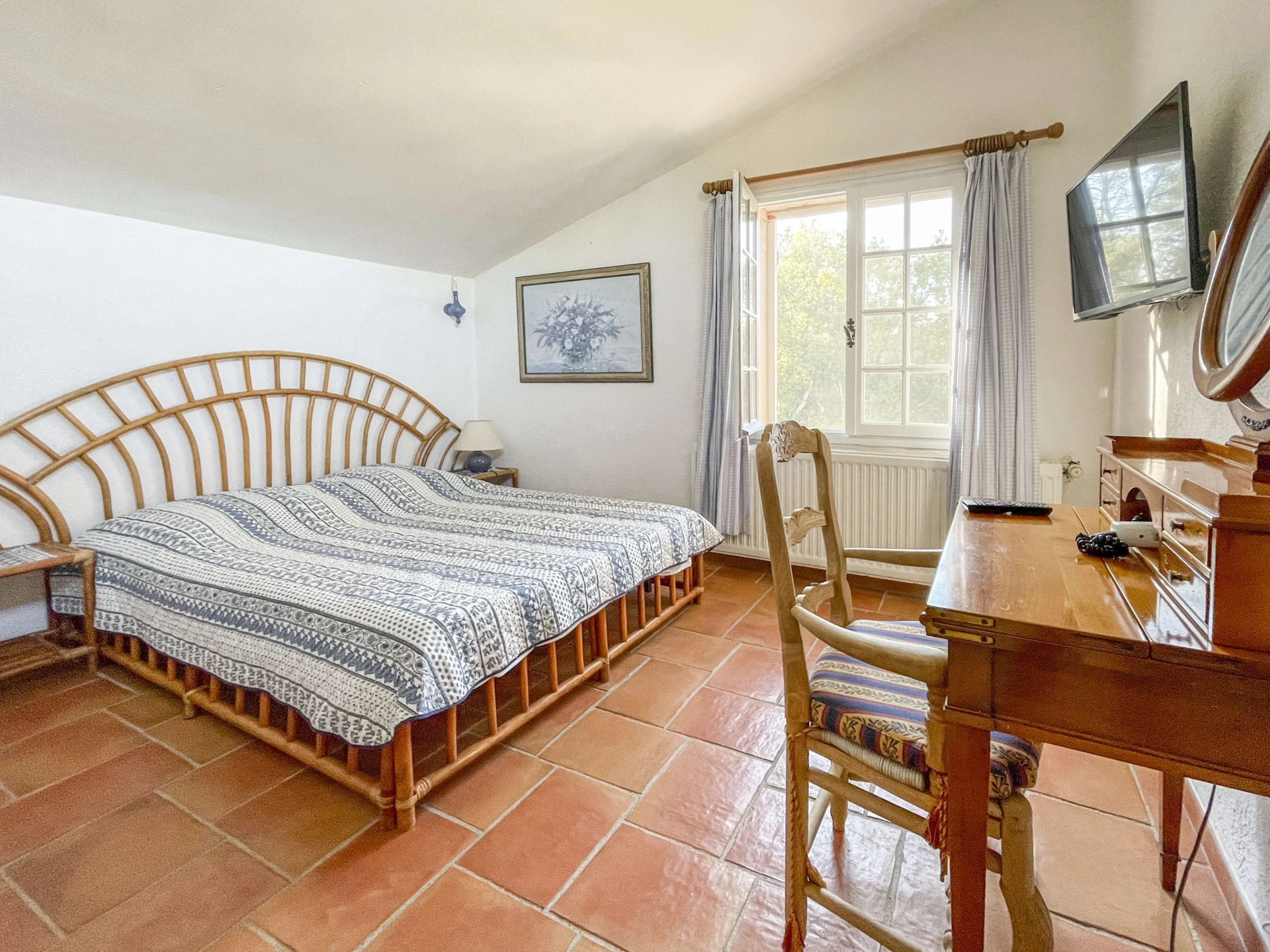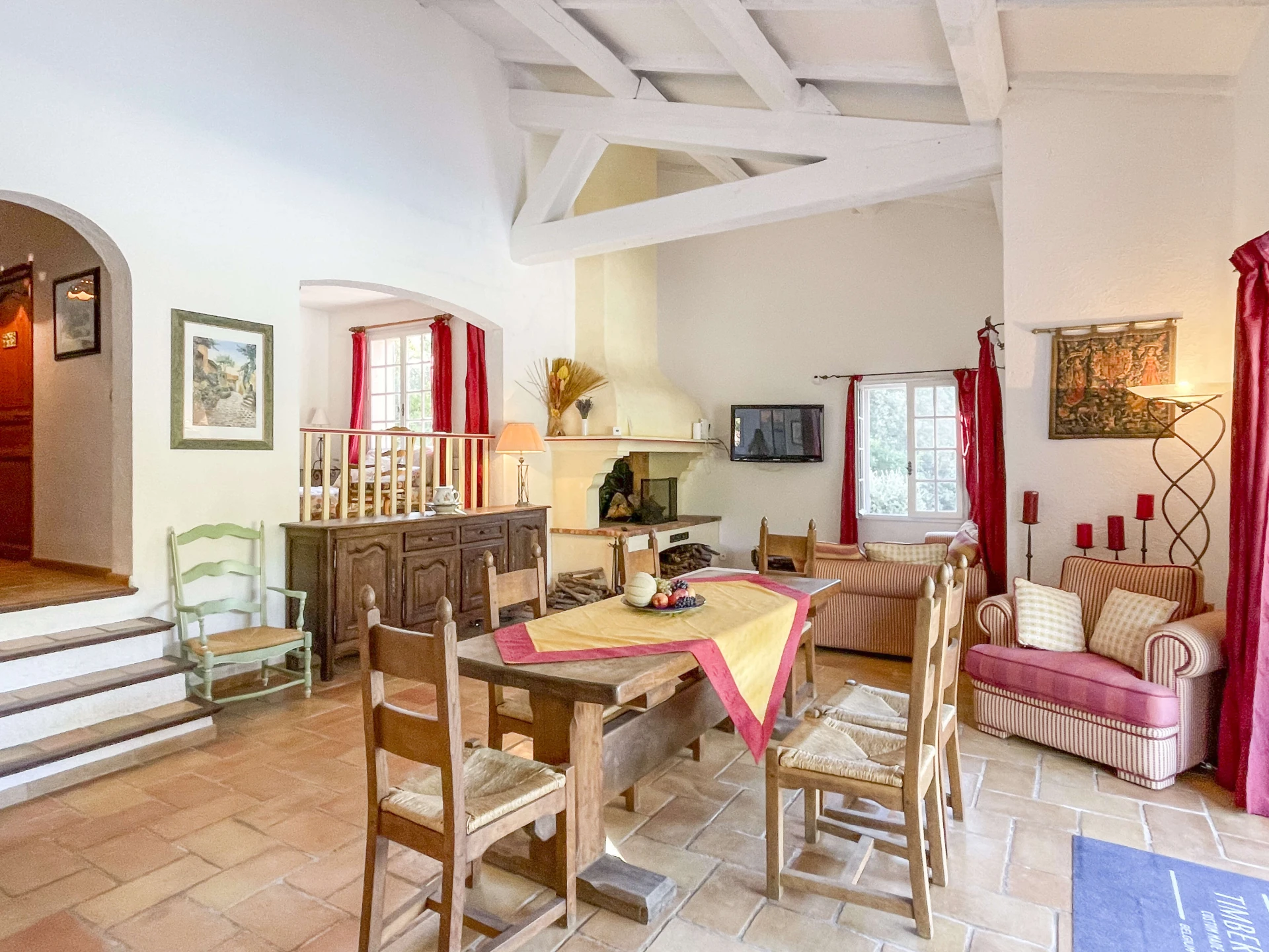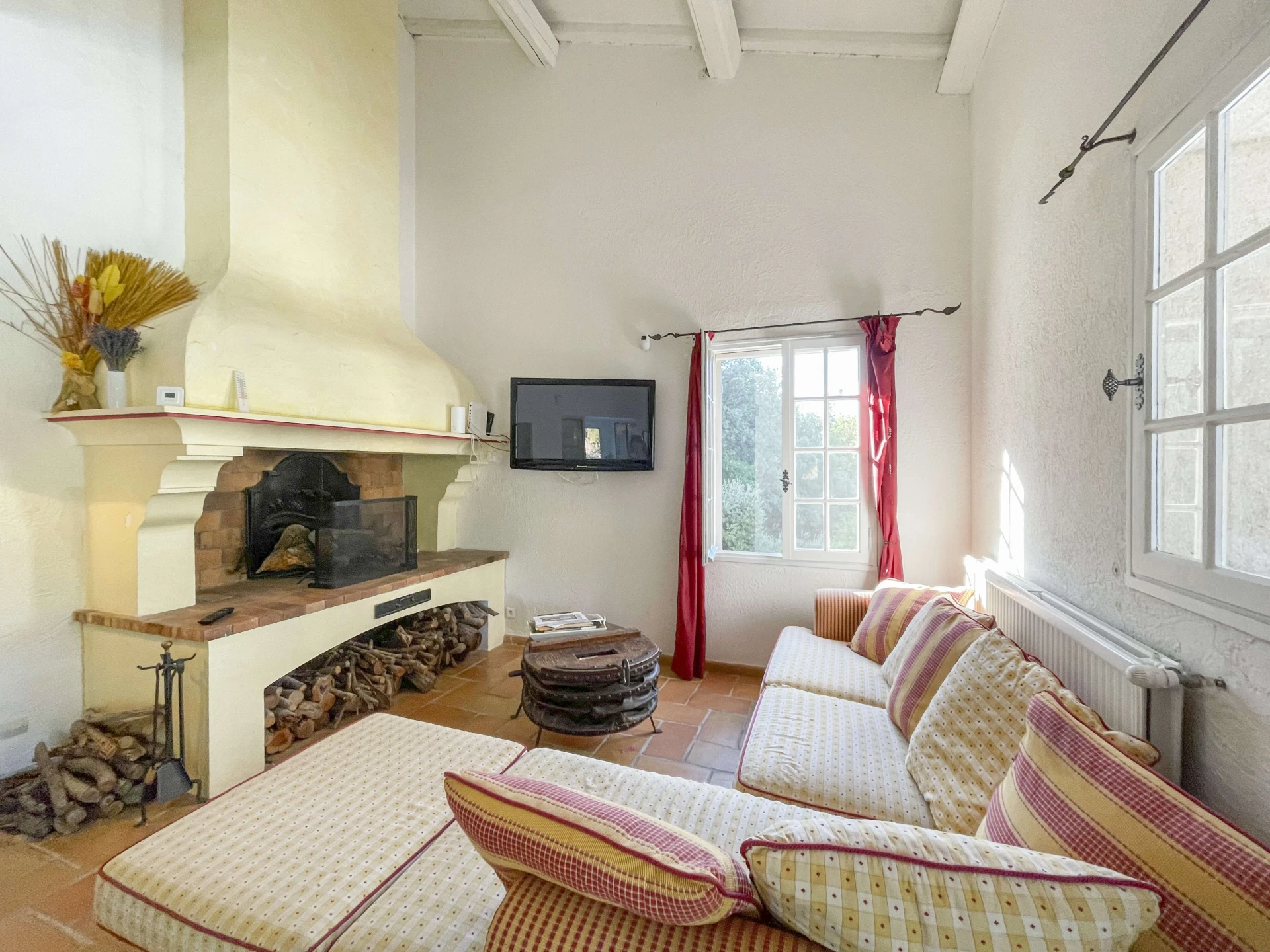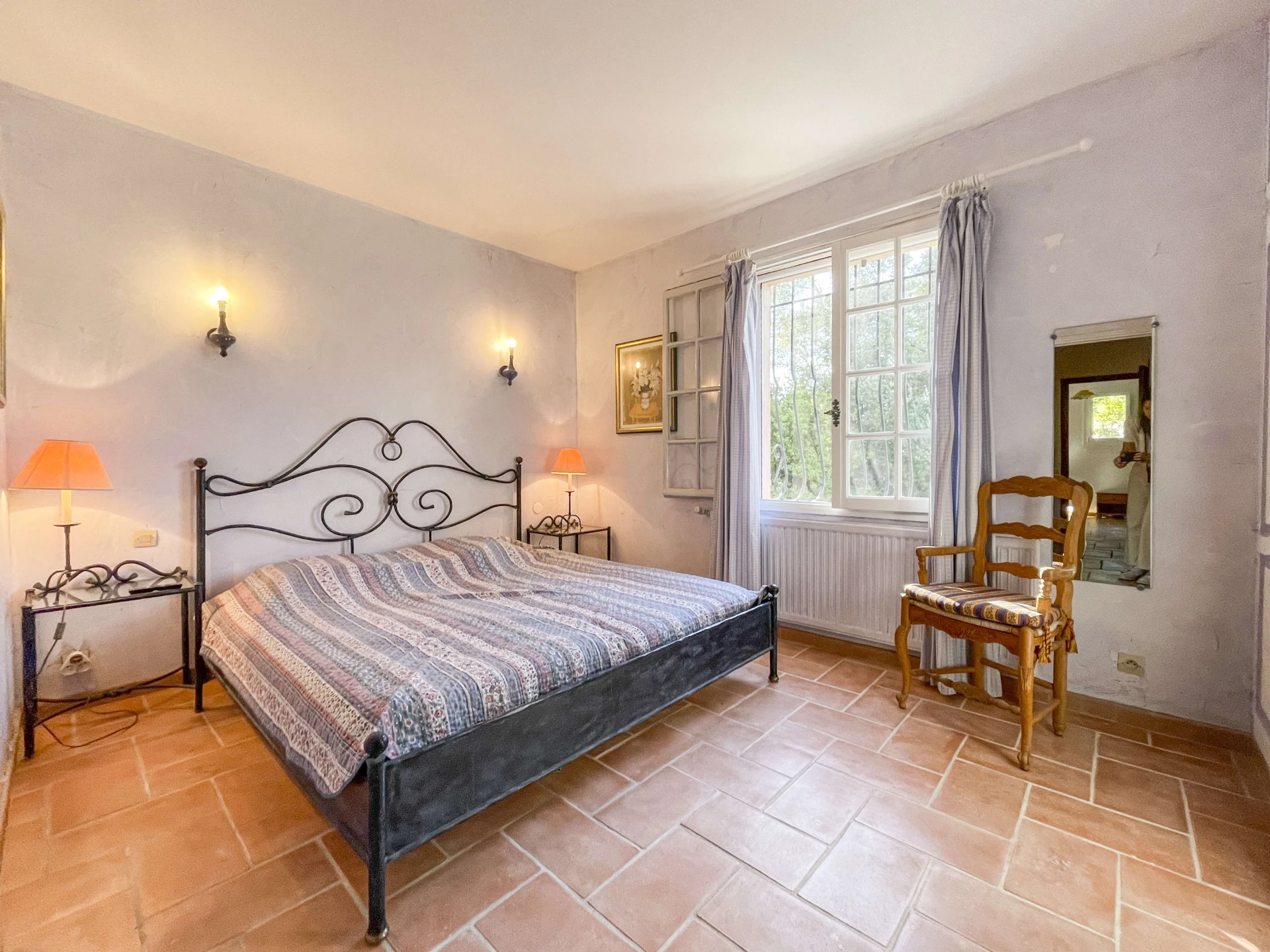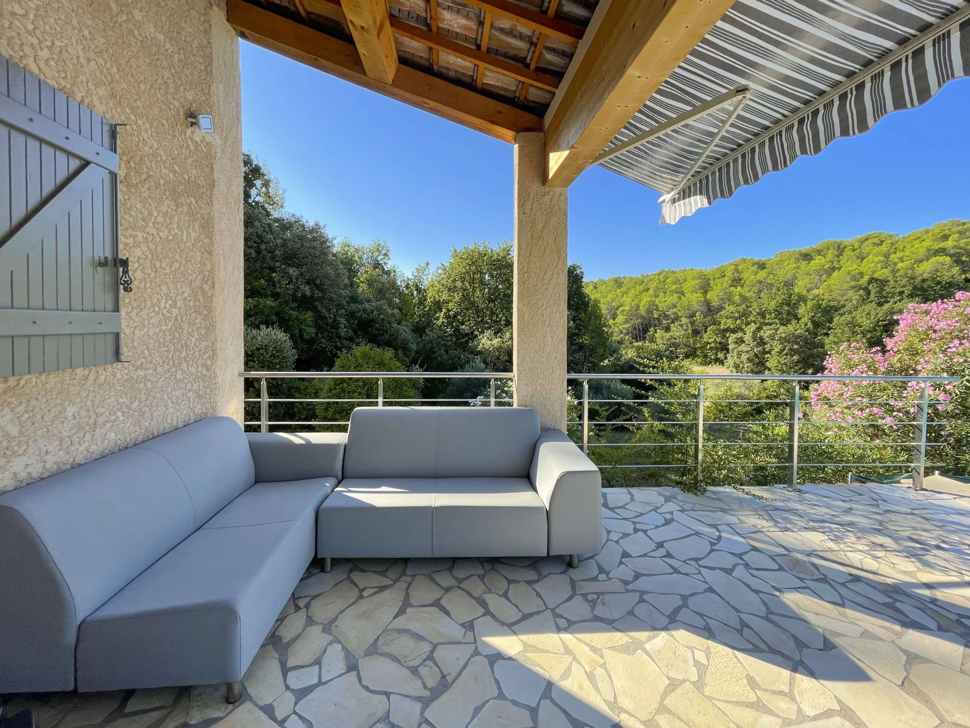 The interior of Villa Louvadiou is authentic and charming, with beautiful high ceilings in the living room (up to 6 metres), providing natural ventilation. This holiday home is furnished with high-quality materials. The living room and dining room give direct access to the terraces around the pool. One of the bedrooms has a private balcony with stunning views of the pool and the green surroundings of Lorgues. This villa is ideal for 8 people + 2 children (up to 12 years old) or 6 adults + 4 children.
