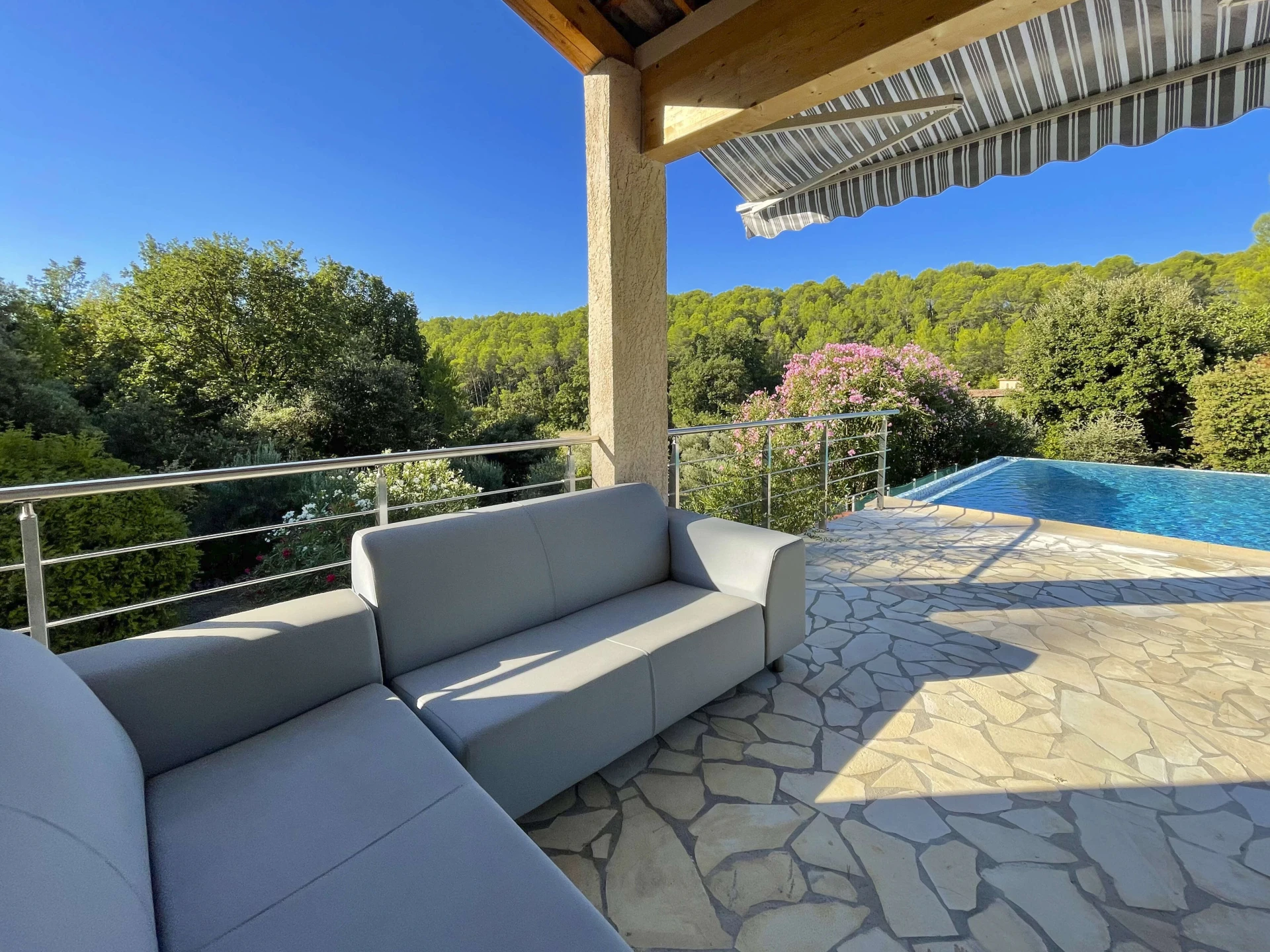 This holiday home with private infinity pool offers panoramic views of beautiful nature, ideal for total relaxation. Large terraces of over 200 m² (50 m² of which are shaded) are equipped with all the necessary outdoor furniture: sun beds, loungers and a lounge set. These terraces surround the large private 100,000-litre infinity pool (12x5m, heated to a maximum of 26°). Lower down in the garden is a petanque court and barbecue area. During your stay, visit some of Provence's nicest villages, but don't forget these unmissable sights. From the best markets to cycling routes, you can read it all in our blogs.