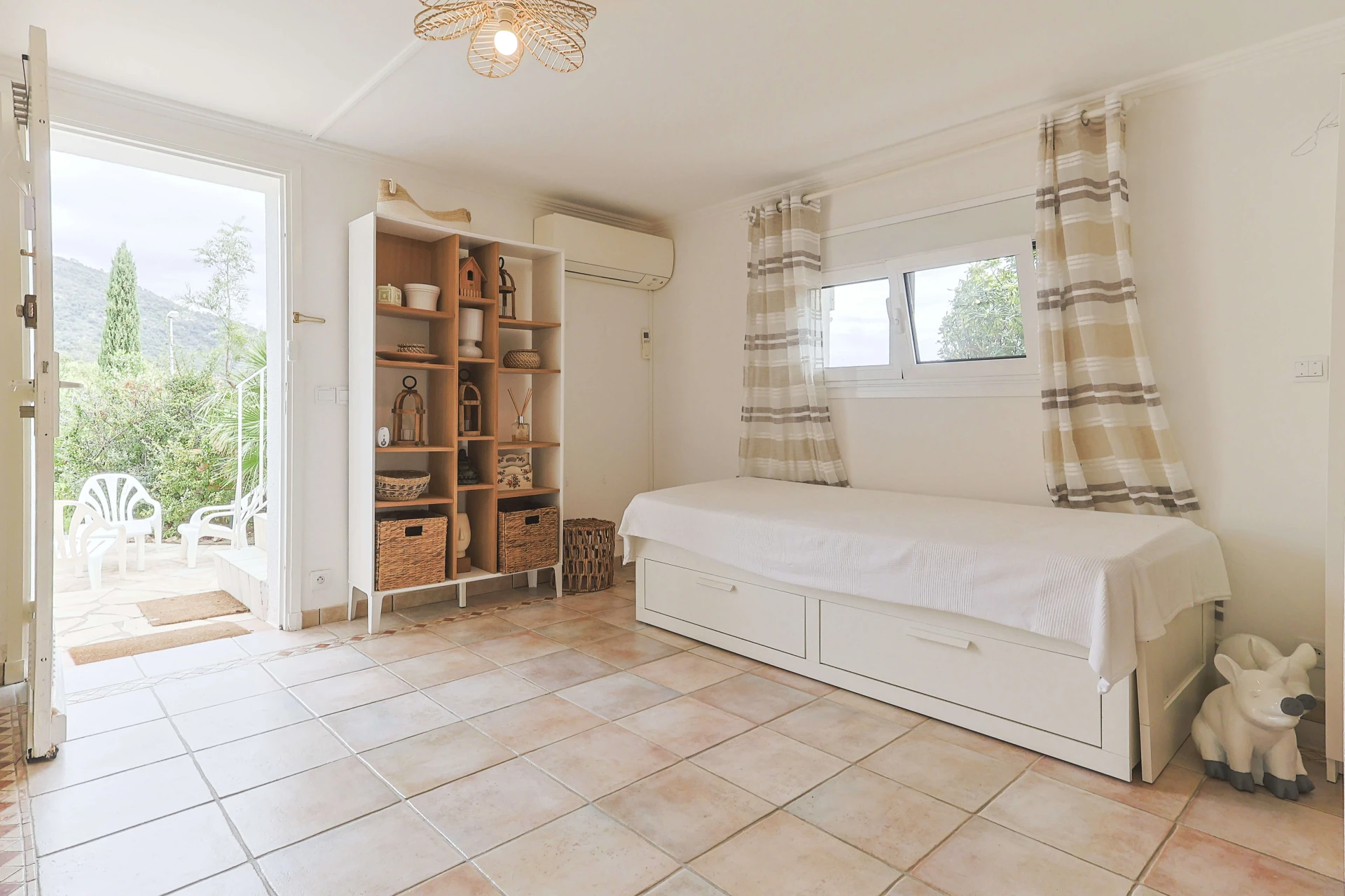 L'intérieur est également très charmant et décoré avec une grande attention aux détails. La maison est entièrement équipée avec divers appareils haut de gamme et la climatisation est présente dans toutes les pièces à vivre, y compris dans les 3 chambres à coucher. La 3ème chambre au rez-de-jardin est spacieuse et accessible par une porte extérieure donnant directement sur la piscine.