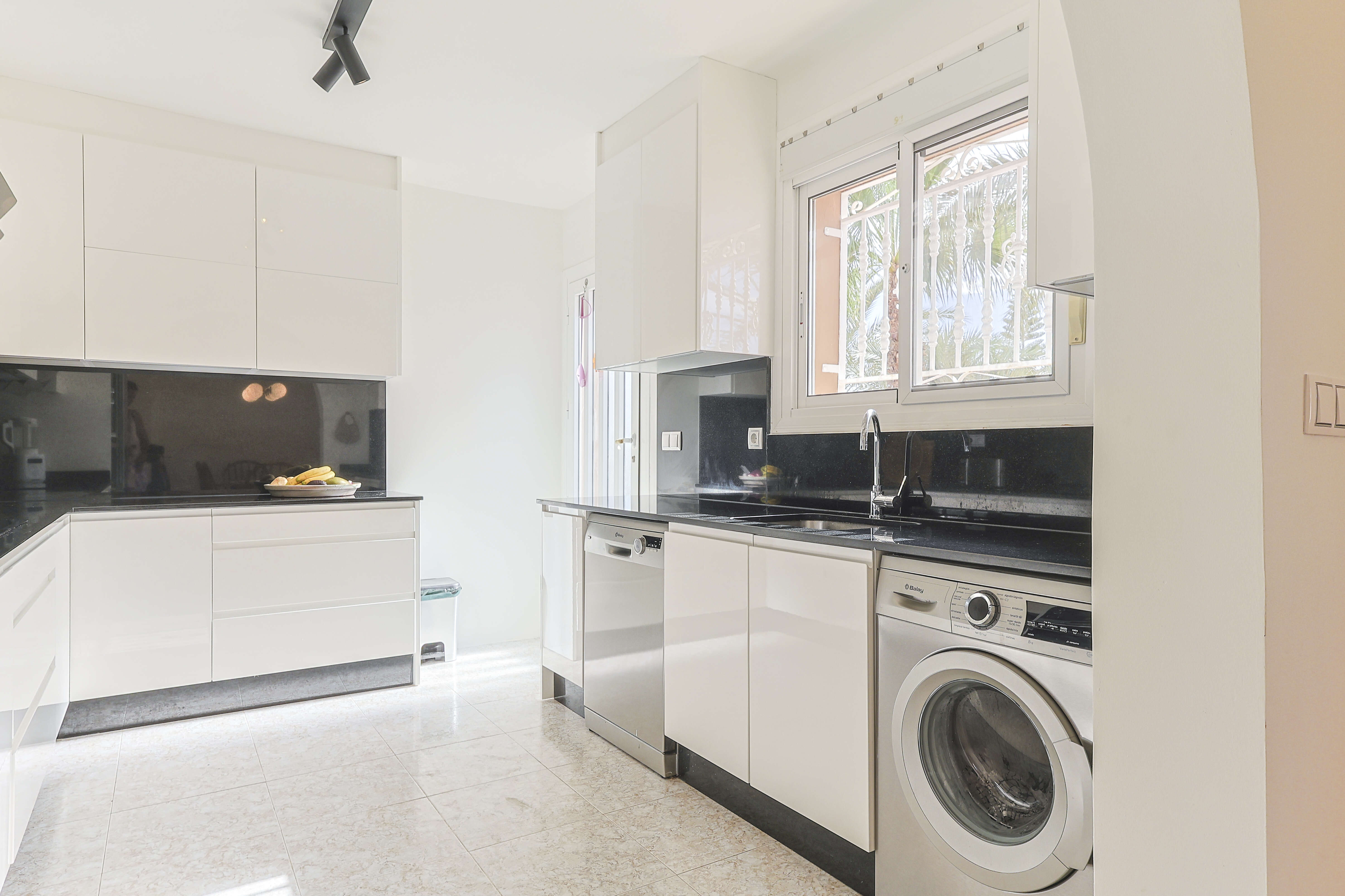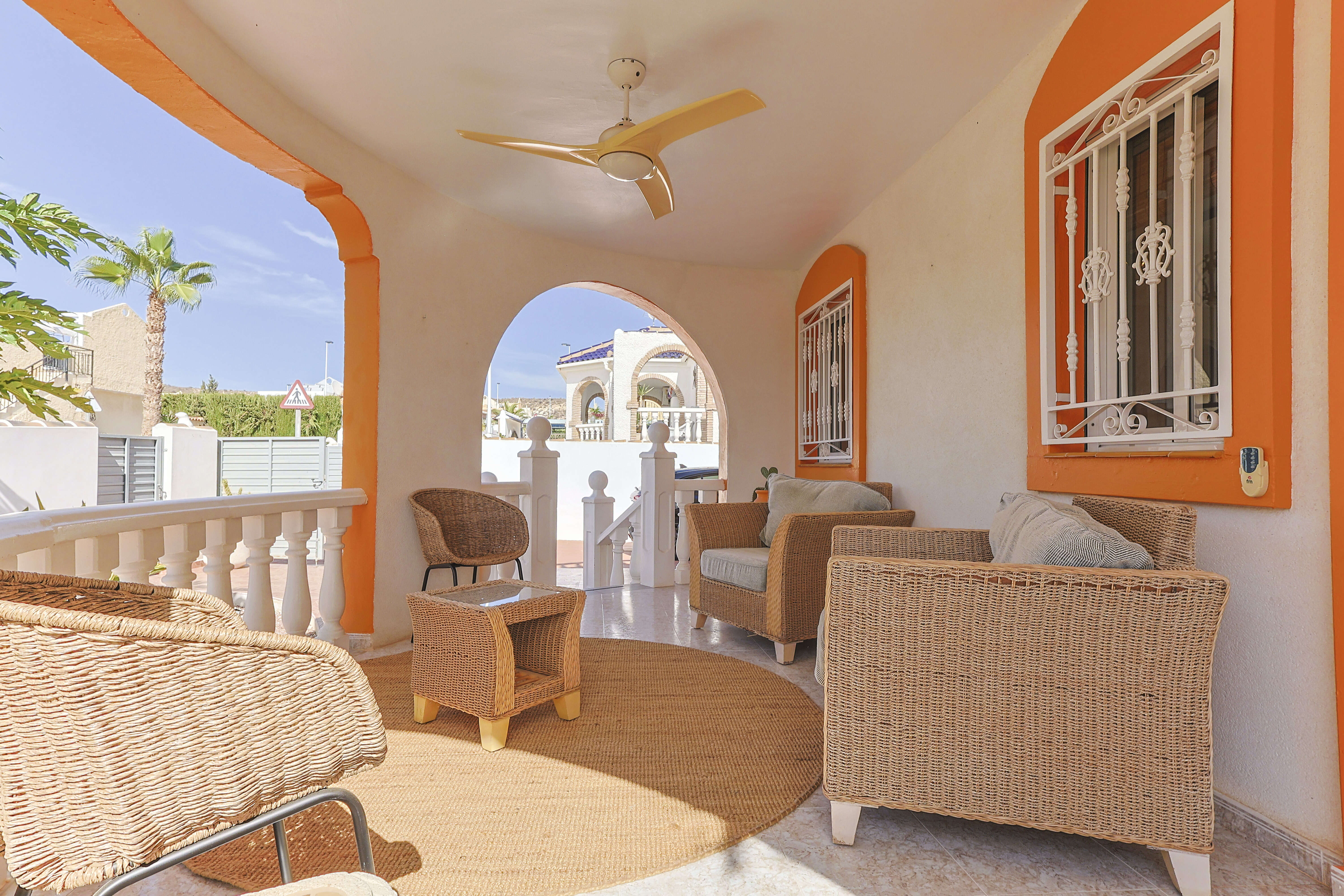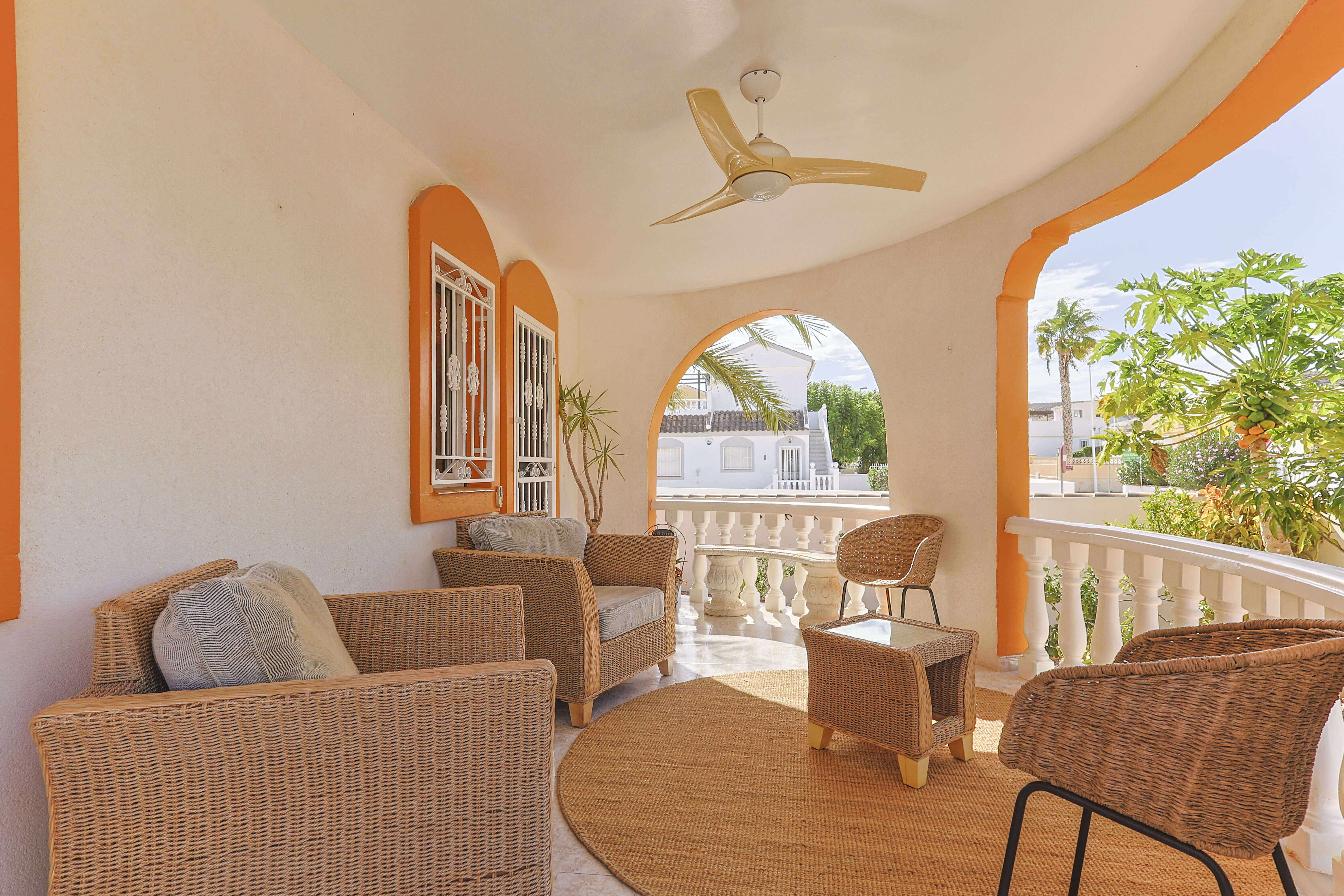 Le beau jardin bien entretenu, avec irrigation automatique et de magnifiques palmiers, offre une oasis de tranquillité et de verdure. De plus, la maison dispose d’un portail avec un parking privé pour deux grandes voitures.