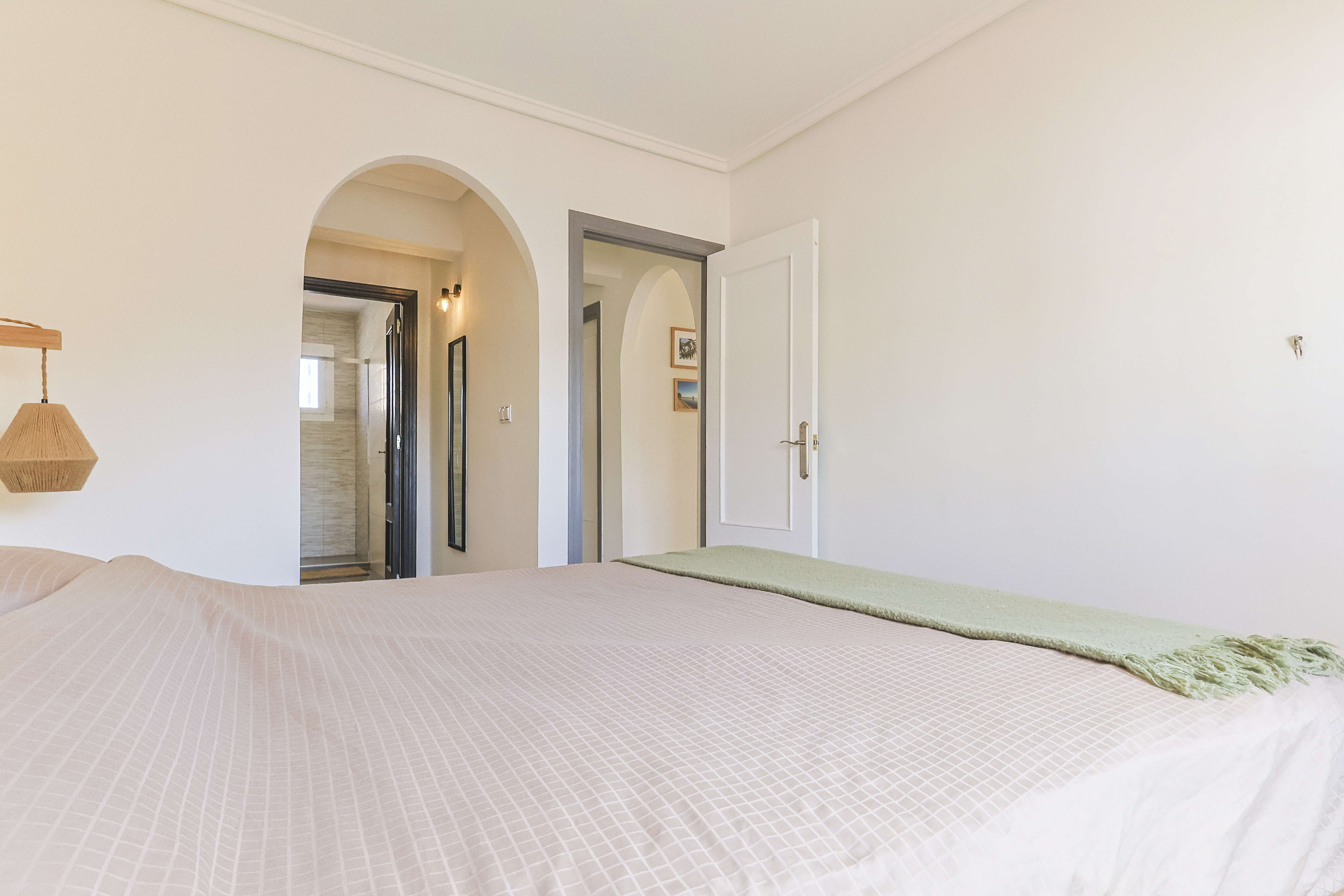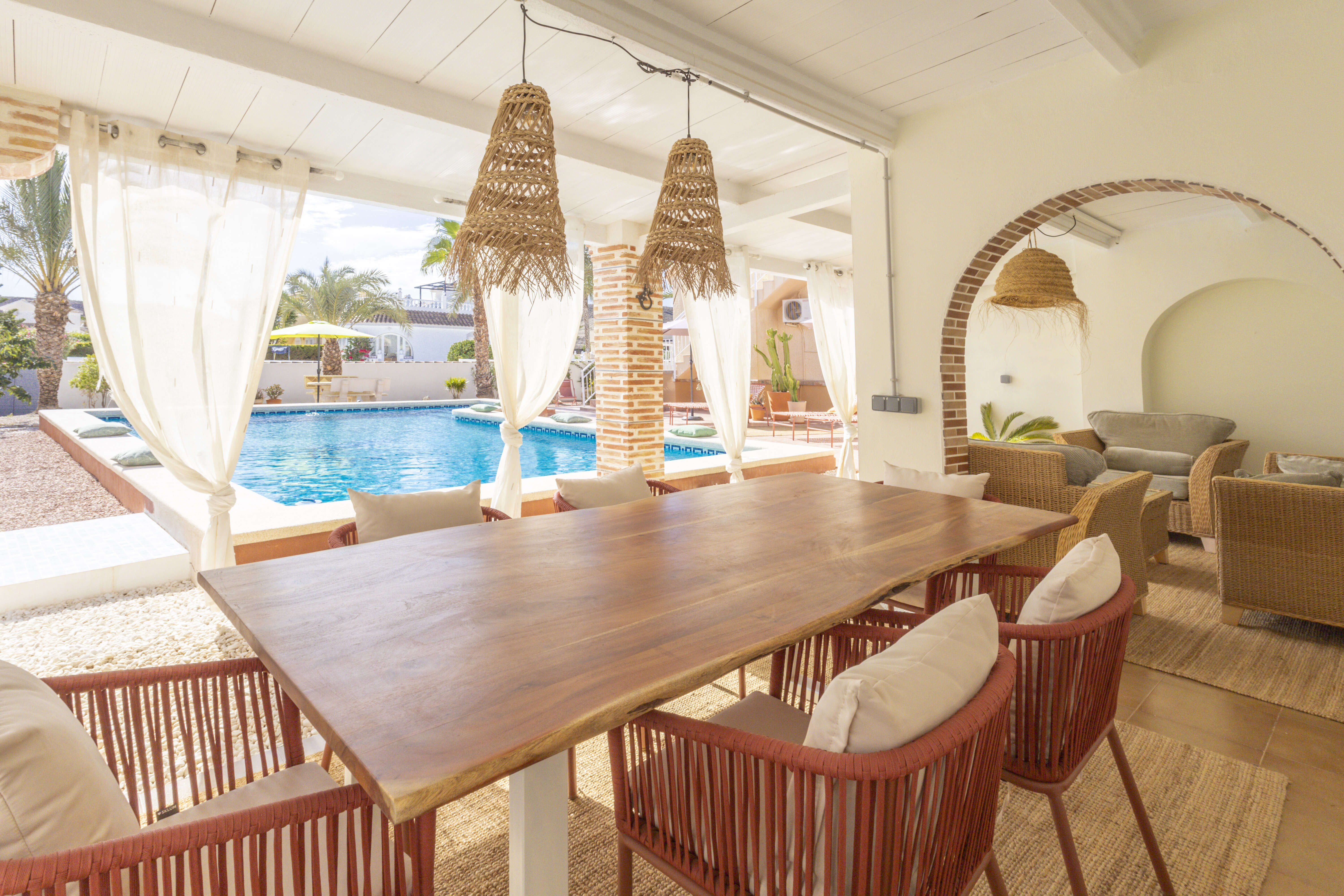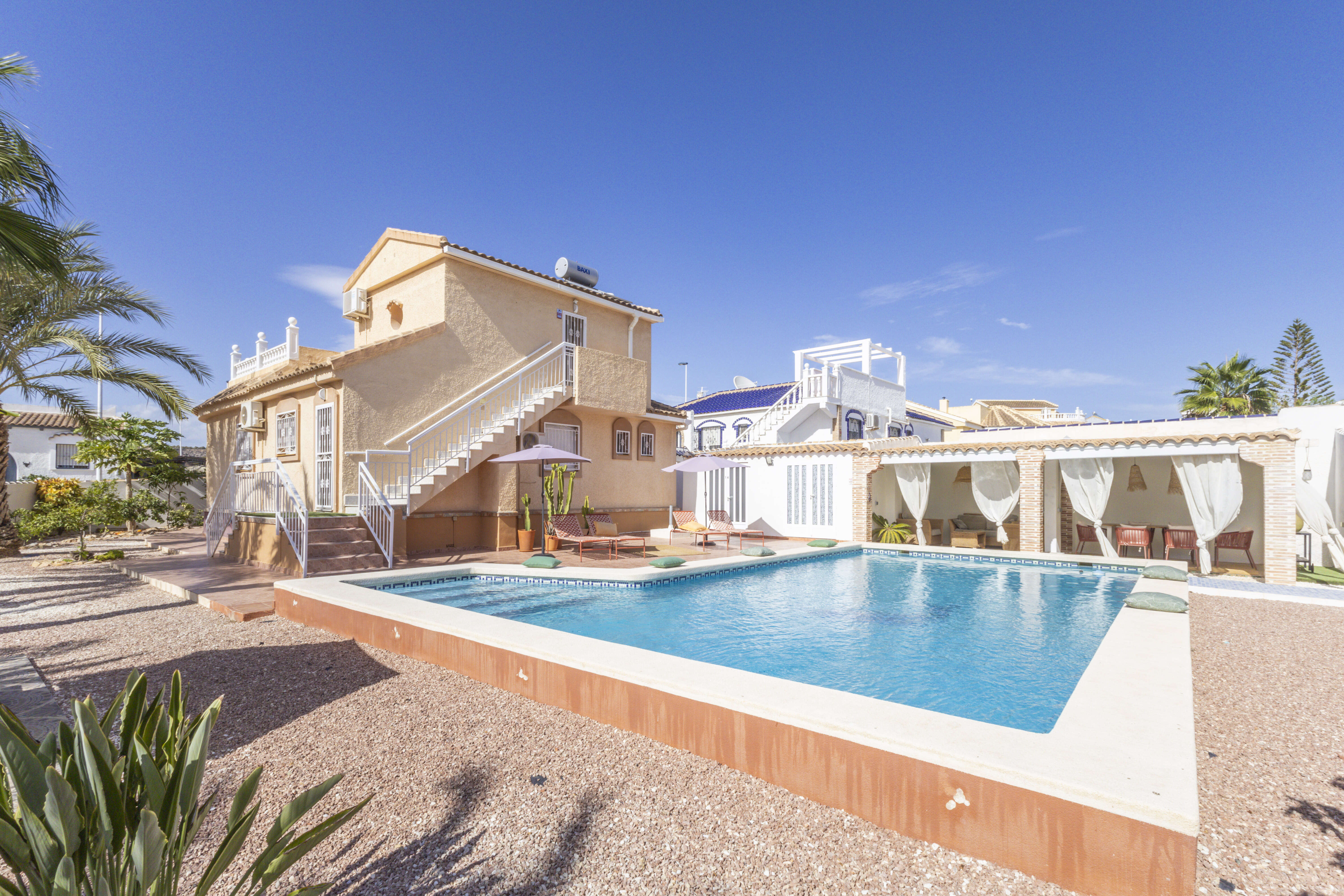 À l'extérieur, vous profiterez d'une grande piscine privée éclairée (10x5m), entourée d'un vaste coin salon et d'une terrasse couverte avec des sièges confortables et un coin repas. Très convivial et idéal pour se détendre. Une douche extérieure est disponible à côté de la piscine. Une grande terrasse sur le toit attenante à la 3ème chambre est idéale pour profiter d'avantage du soleil espagnol ! Ici, vous profitez aussi d’un coucher de soleil fantastique. A l'avant se trouve un coin apéro pour profiter du soleil couchant.